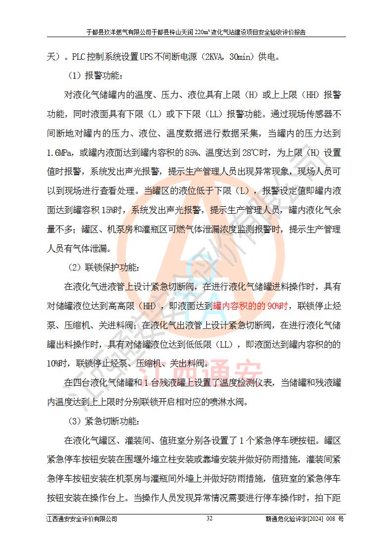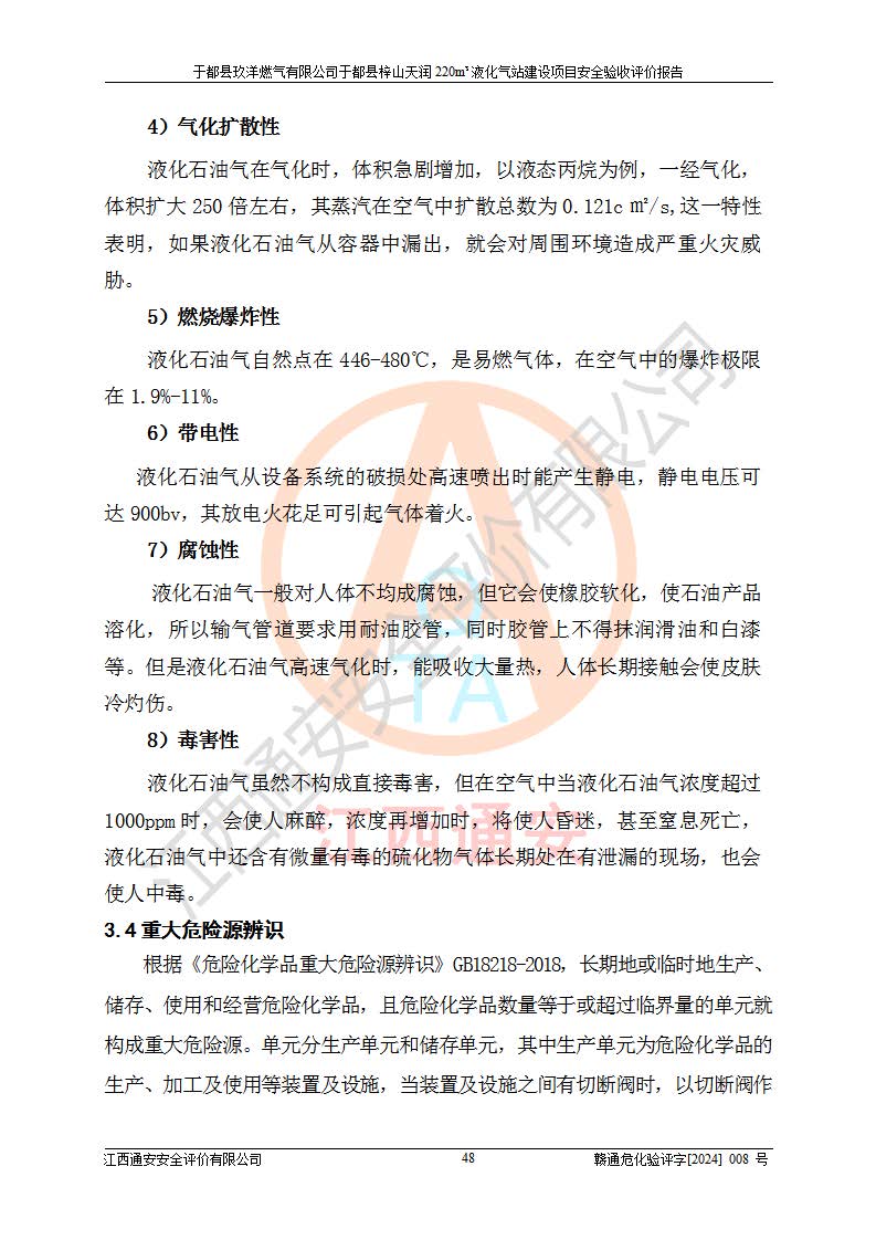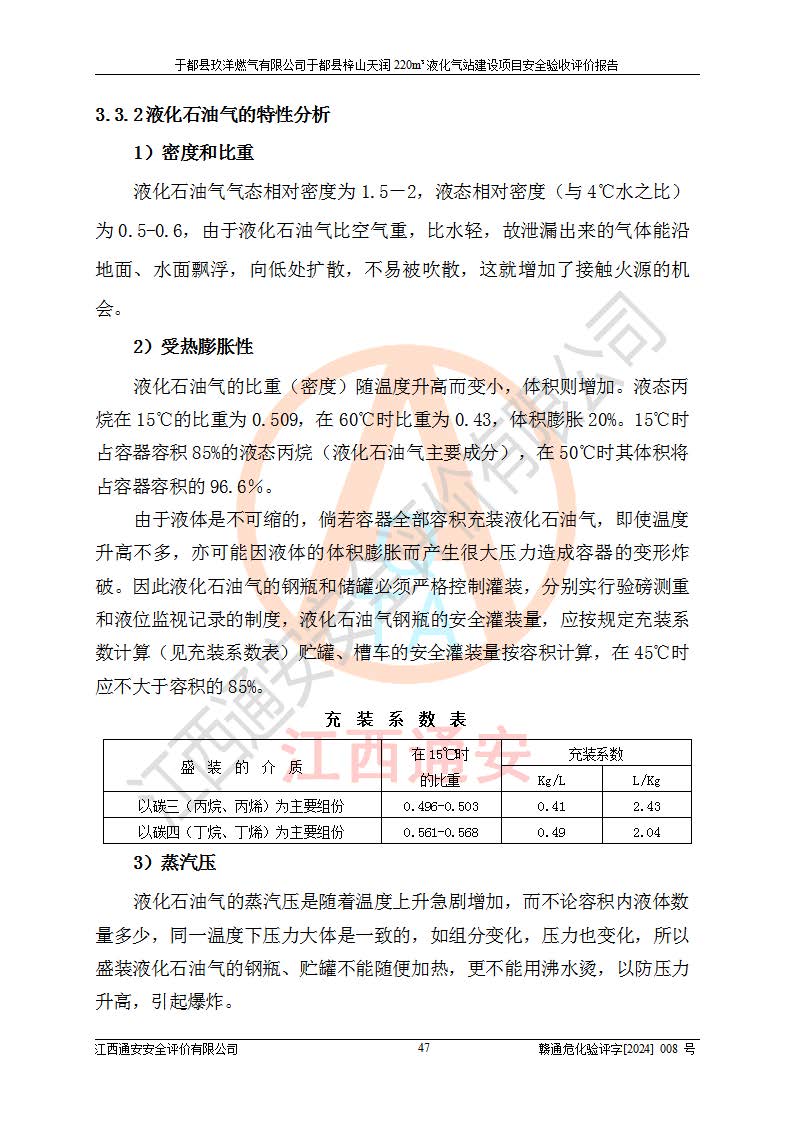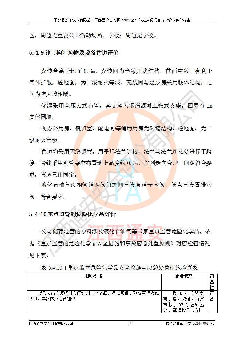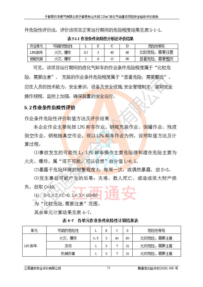 其它 | 根據(jù)**有關(guān)城市燃?xì)夤芾矸煞ㄒ?guī)、規(guī)章、標(biāo)準(zhǔn)、規(guī)范及于都縣玖洋燃?xì)庥邢薰咎峁┑挠嘘P(guān)資料,通過對(duì)該液化氣站的現(xiàn)場(chǎng)勘察,對(duì)液化氣站的主要危險(xiǎn)危害因素的分析,采用危險(xiǎn)度評(píng)價(jià)法、作業(yè)條件危險(xiǎn)性分析法等評(píng)價(jià)方法,對(duì)該液化氣站進(jìn)行安全驗(yàn)收評(píng)價(jià),總結(jié)如下: ⑴于都縣梓山天潤(rùn)220m3液化氣站周邊100m范圍內(nèi)無公共設(shè)施、學(xué)校、醫(yī)院及文物保護(hù)單位。該液化氣站選址和平面布置經(jīng)實(shí)測(cè)對(duì)照《液化石油氣供應(yīng)工程設(shè)計(jì)規(guī)范》(GB51142-2015)的要求,符合**和行業(yè)相關(guān)標(biāo)準(zhǔn)。 ⑵該液化氣站的主要危險(xiǎn)、有害因素是火災(zāi)、爆炸,容器爆炸,其次是觸電、機(jī)械傷害、物體打擊、高處墜落、**傷害、凍傷、中毒等。 ⑶該液化氣站儲(chǔ)存的LPG構(gòu)成了重大危險(xiǎn)源。LPG是易燃易爆的甲類氣體。制定的應(yīng)急救援預(yù)案應(yīng)加強(qiáng)演練,不斷完善應(yīng)急救援預(yù)案內(nèi)容。 ⑷危險(xiǎn)度評(píng)價(jià)中液化氣儲(chǔ)罐區(qū)為“I”級(jí),屬**危險(xiǎn);作業(yè)條件危險(xiǎn)性評(píng)價(jià)中LPG卸料單元為“比較危險(xiǎn),需要注意”、鋼瓶充裝單元為“比較危險(xiǎn),需要注意”;現(xiàn)場(chǎng)檢查表中,有應(yīng)急救援預(yù)案, 有應(yīng)急演練圖片記錄,符合《液化石油氣供應(yīng)工程設(shè)計(jì)規(guī)范》(GB51142-2015)的安全要求。 ⑸該液化氣站對(duì)儲(chǔ)罐、管道等設(shè)備等設(shè)施都進(jìn)行了檢驗(yàn)檢測(cè);消防、安全設(shè)施已完善,進(jìn)一步提高了設(shè)備和設(shè)施的完好性、可靠性。 ⑹該液化氣站有比較健全的安全管理制度、安全操作規(guī)程;有關(guān)人員經(jīng)過有關(guān)**主管部門培訓(xùn),設(shè)立了專職安全負(fù)責(zé)人,從組織機(jī)構(gòu)、安全生產(chǎn)管理上**了安全措施的基本落實(shí)。 綜上所述,本評(píng)價(jià)認(rèn)為于都縣玖洋燃?xì)庥邢薰居诙伎h梓山天潤(rùn)220m3液化氣站符合**有關(guān)城市燃?xì)夤芾矸煞ㄒ?guī)、規(guī)章、標(biāo)準(zhǔn)、規(guī)范的安全要求,滿足安全生產(chǎn)的需要。 該公司針對(duì)主要危險(xiǎn)、危害因素在設(shè)計(jì)和實(shí)施過程中采取了相應(yīng)的安全設(shè)施和技術(shù)措施,并做到了與主體工程同時(shí)設(shè)計(jì)、同時(shí)建設(shè)、同時(shí)投入使用。項(xiàng)目建立了安全生產(chǎn)管理體系以及各項(xiàng)安全生產(chǎn)管理制度,安全設(shè)施齊備并**,安全生產(chǎn)狀況良好,現(xiàn)場(chǎng)與設(shè)計(jì)圖紙一致,人員配置符合要求,特種作業(yè)人員持證上崗,隱患排查治理及時(shí),未發(fā)生人員傷亡及設(shè)備事故。該項(xiàng)目安全條件符合相關(guān)的安全法律、法規(guī)和標(biāo)準(zhǔn)規(guī)范的要求,滿足安全生產(chǎn)條件,符合安全經(jīng)營(yíng)要求。 | ||||