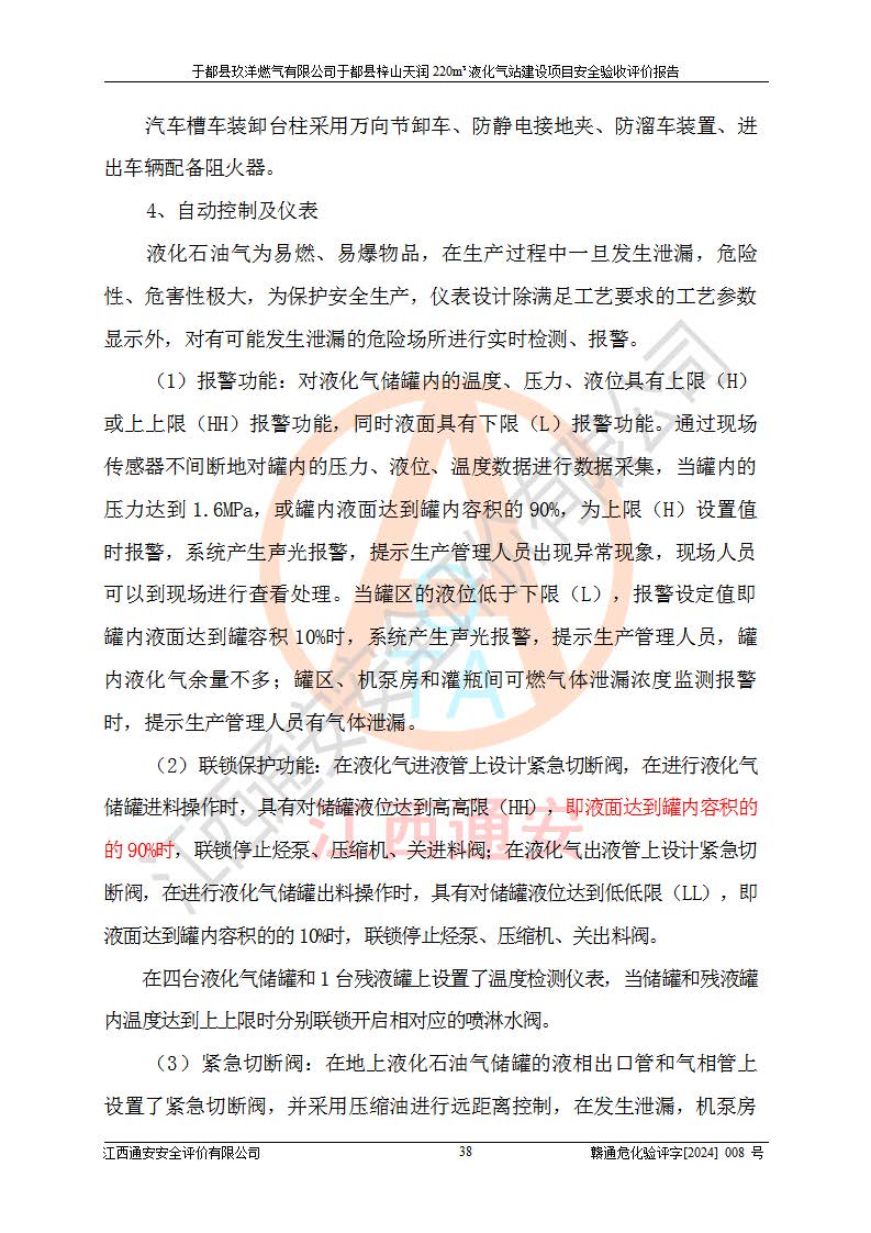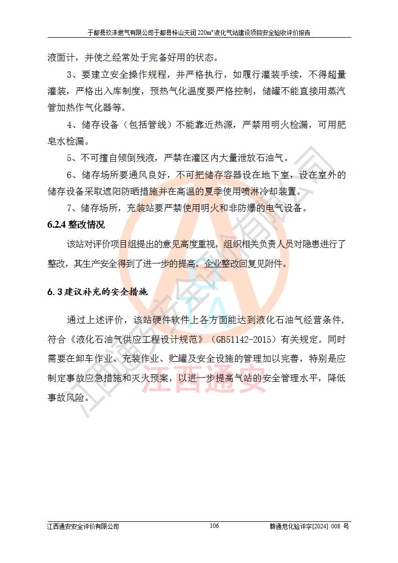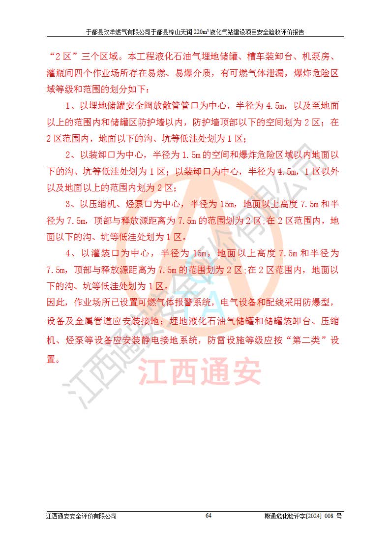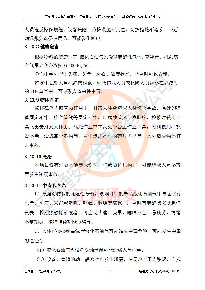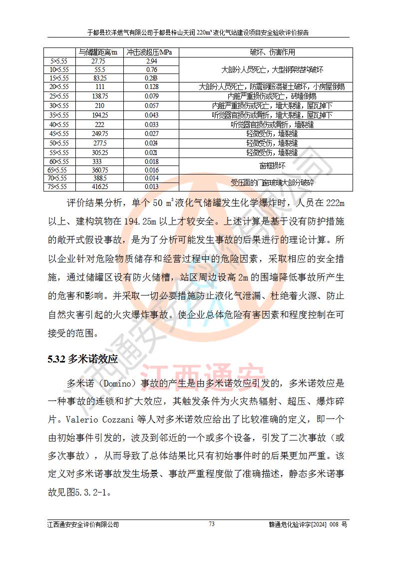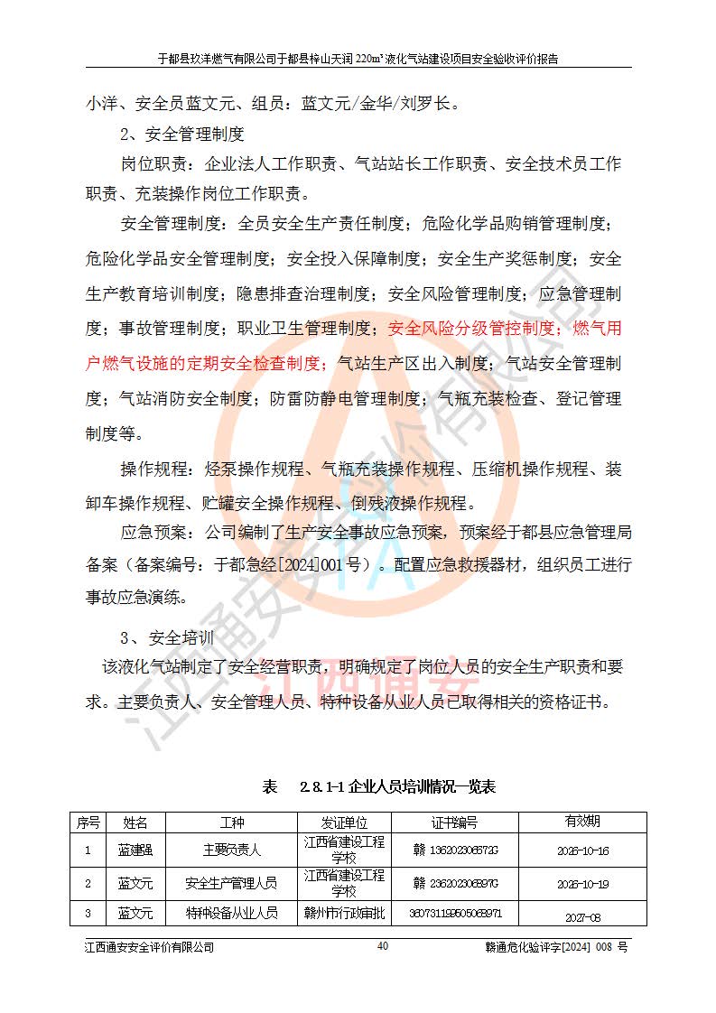 其它 | 根據(jù)**有關(guān)城市燃?xì)夤芾矸煞ㄒ?guī)、規(guī)章、標(biāo)準(zhǔn)、規(guī)范及于都縣玖洋燃?xì)庥邢薰咎峁┑挠嘘P(guān)資料,通過對(duì)該液化氣站的現(xiàn)場(chǎng)勘察,對(duì)液化氣站的主要危險(xiǎn)危害因素的分析,采用危險(xiǎn)度評(píng)價(jià)法、作業(yè)條件危險(xiǎn)性分析法等評(píng)價(jià)方法,對(duì)該液化氣站進(jìn)行安全驗(yàn)收評(píng)價(jià),總結(jié)如下: ⑴于都縣梓山天潤(rùn)220m3液化氣站周邊100m范圍內(nèi)無公共設(shè)施、學(xué)校、醫(yī)院及文物保護(hù)單位。該液化氣站選址和平面布置經(jīng)實(shí)測(cè)對(duì)照《液化石油氣供應(yīng)工程設(shè)計(jì)規(guī)范》(GB51142-2015)的要求,符合**和行業(yè)相關(guān)標(biāo)準(zhǔn)。 ⑵該液化氣站的主要危險(xiǎn)、有害因素是火災(zāi)、爆炸,容器爆炸,其次是觸電、機(jī)械傷害、物體打擊、高處墜落、**傷害、凍傷、中毒等。 ⑶該液化氣站儲(chǔ)存的LPG構(gòu)成了重大危險(xiǎn)源。LPG是易燃易爆的甲類氣體。制定的應(yīng)急救援預(yù)案應(yīng)加強(qiáng)演練,不斷完善應(yīng)急救援預(yù)案內(nèi)容。 ⑷危險(xiǎn)度評(píng)價(jià)中液化氣儲(chǔ)罐區(qū)為“I”級(jí),屬**危險(xiǎn);作業(yè)條件危險(xiǎn)性評(píng)價(jià)中LPG卸料單元為“比較危險(xiǎn),需要注意”、鋼瓶充裝單元為“比較危險(xiǎn),需要注意”;現(xiàn)場(chǎng)檢查表中,有應(yīng)急救援預(yù)案, 有應(yīng)急演練圖片記錄,符合《液化石油氣供應(yīng)工程設(shè)計(jì)規(guī)范》(GB51142-2015)的安全要求。 ⑸該液化氣站對(duì)儲(chǔ)罐、管道等設(shè)備等設(shè)施都進(jìn)行了檢驗(yàn)檢測(cè);消防、安全設(shè)施已完善,進(jìn)一步提高了設(shè)備和設(shè)施的完好性、可靠性。 ⑹該液化氣站有比較健全的安全管理制度、安全操作規(guī)程;有關(guān)人員經(jīng)過有關(guān)**主管部門培訓(xùn),設(shè)立了專職安全負(fù)責(zé)人,從組織機(jī)構(gòu)、安全生產(chǎn)管理上**了安全措施的基本落實(shí)。 綜上所述,本評(píng)價(jià)認(rèn)為于都縣玖洋燃?xì)庥邢薰居诙伎h梓山天潤(rùn)220m3液化氣站符合**有關(guān)城市燃?xì)夤芾矸煞ㄒ?guī)、規(guī)章、標(biāo)準(zhǔn)、規(guī)范的安全要求,滿足安全生產(chǎn)的需要。 該公司針對(duì)主要危險(xiǎn)、危害因素在設(shè)計(jì)和實(shí)施過程中采取了相應(yīng)的安全設(shè)施和技術(shù)措施,并做到了與主體工程同時(shí)設(shè)計(jì)、同時(shí)建設(shè)、同時(shí)投入使用。項(xiàng)目建立了安全生產(chǎn)管理體系以及各項(xiàng)安全生產(chǎn)管理制度,安全設(shè)施齊備并**,安全生產(chǎn)狀況良好,現(xiàn)場(chǎng)與設(shè)計(jì)圖紙一致,人員配置符合要求,特種作業(yè)人員持證上崗,隱患排查治理及時(shí),未發(fā)生人員傷亡及設(shè)備事故。該項(xiàng)目安全條件符合相關(guān)的安全法律、法規(guī)和標(biāo)準(zhǔn)規(guī)范的要求,滿足安全生產(chǎn)條件,符合安全經(jīng)營(yíng)要求。 | ||||