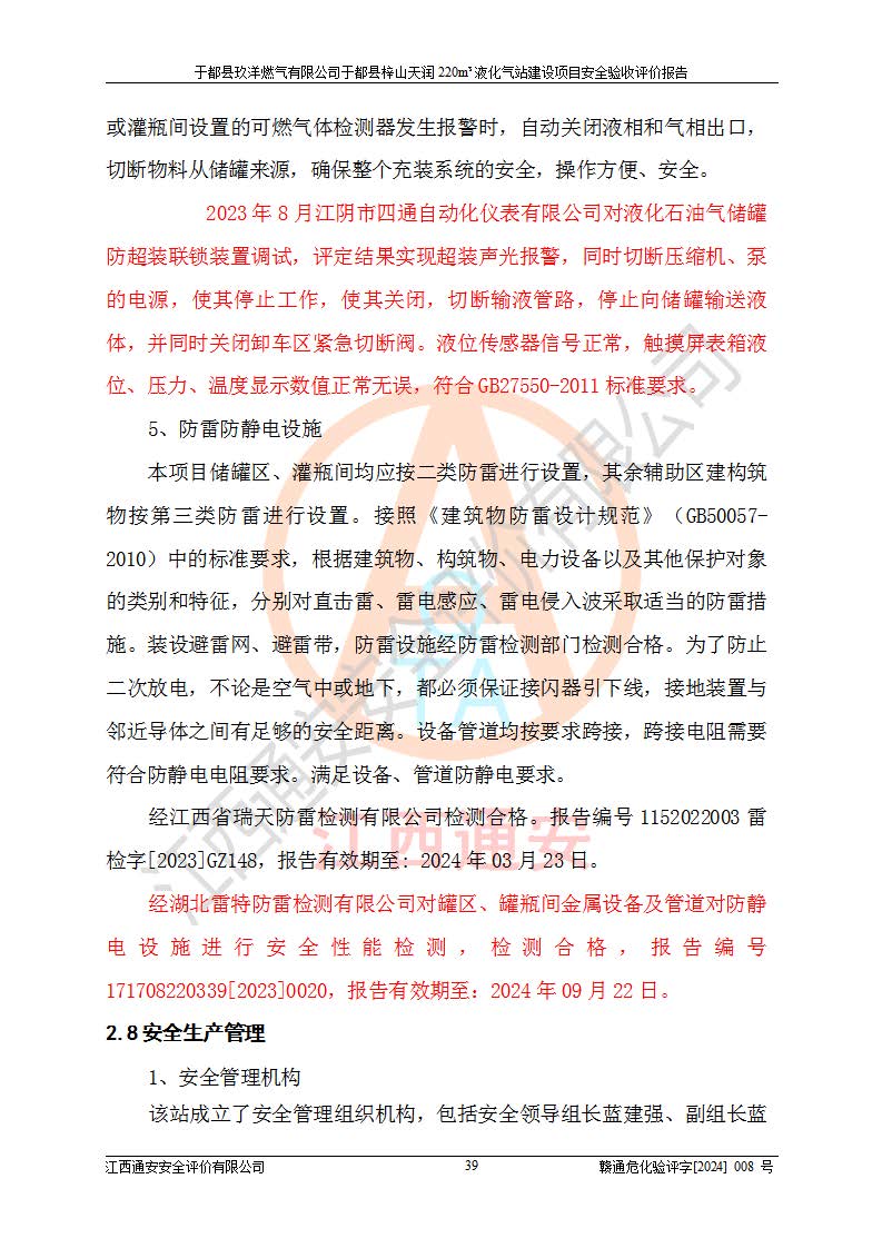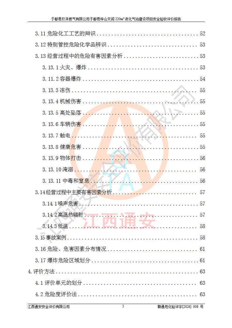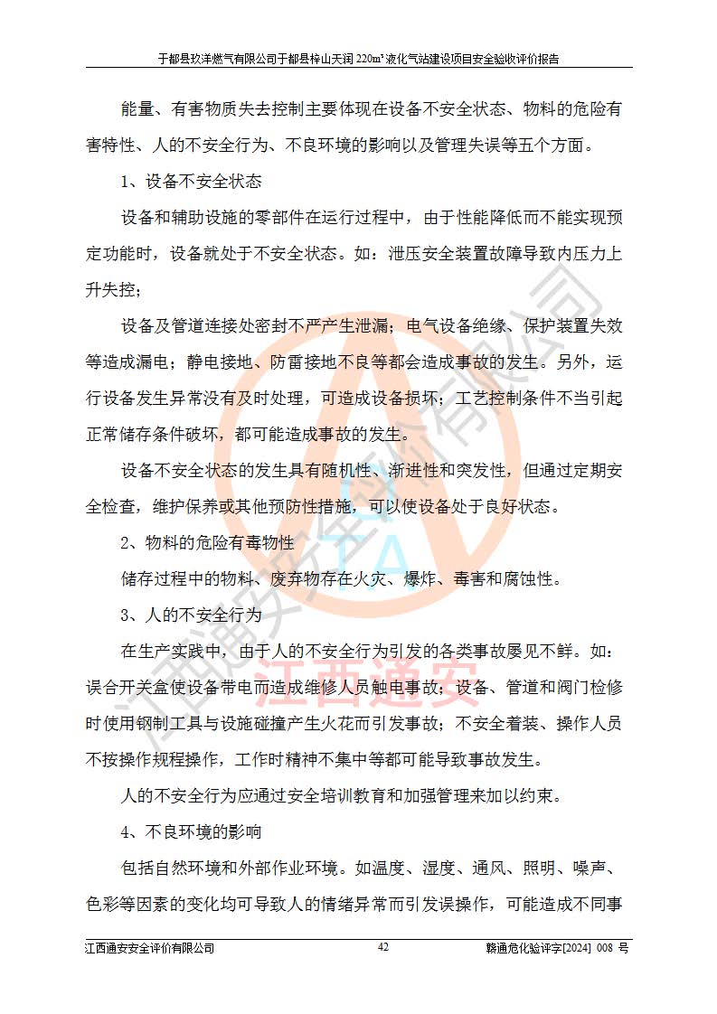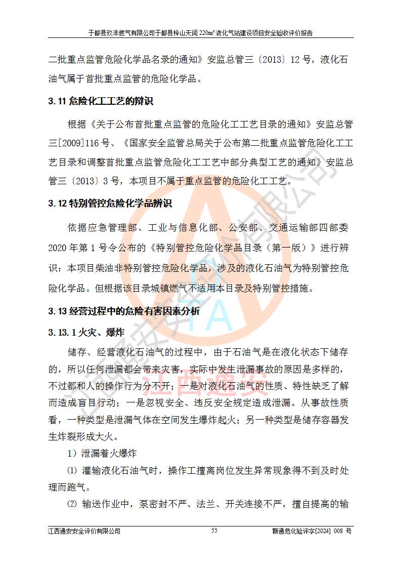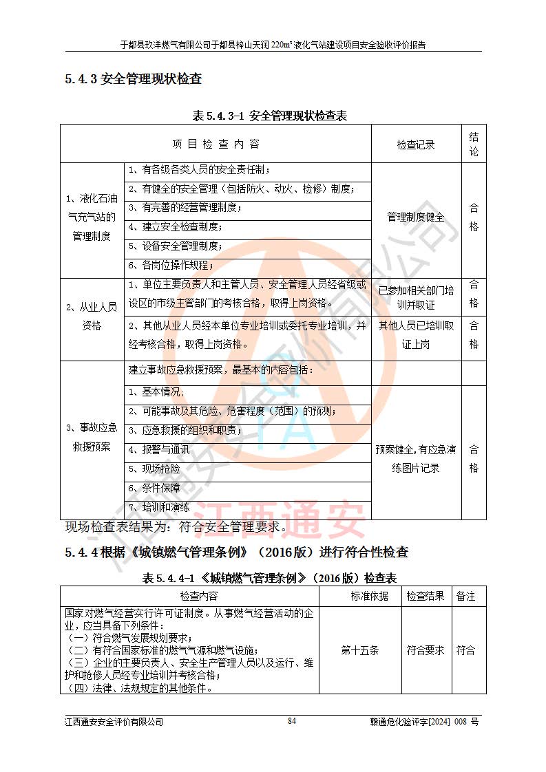 其它 | 根據(jù)**有關(guān)城市燃?xì)夤芾矸煞ㄒ?guī)、規(guī)章、標(biāo)準(zhǔn)、規(guī)范及于都縣玖洋燃?xì)庥邢薰咎峁┑挠嘘P(guān)資料,通過對(duì)該液化氣站的現(xiàn)場(chǎng)勘察,對(duì)液化氣站的主要危險(xiǎn)危害因素的分析,采用危險(xiǎn)度評(píng)價(jià)法、作業(yè)條件危險(xiǎn)性分析法等評(píng)價(jià)方法,對(duì)該液化氣站進(jìn)行安全驗(yàn)收評(píng)價(jià),總結(jié)如下: ⑴于都縣梓山天潤(rùn)220m3液化氣站周邊100m范圍內(nèi)無公共設(shè)施、學(xué)校、醫(yī)院及文物保護(hù)單位。該液化氣站選址和平面布置經(jīng)實(shí)測(cè)對(duì)照《液化石油氣供應(yīng)工程設(shè)計(jì)規(guī)范》(GB51142-2015)的要求,符合**和行業(yè)相關(guān)標(biāo)準(zhǔn)。 ⑵該液化氣站的主要危險(xiǎn)、有害因素是火災(zāi)、爆炸,容器爆炸,其次是觸電、機(jī)械傷害、物體打擊、高處墜落、**傷害、凍傷、中毒等。 ⑶該液化氣站儲(chǔ)存的LPG構(gòu)成了重大危險(xiǎn)源。LPG是易燃易爆的甲類氣體。制定的應(yīng)急救援預(yù)案應(yīng)加強(qiáng)演練,不斷完善應(yīng)急救援預(yù)案內(nèi)容。 ⑷危險(xiǎn)度評(píng)價(jià)中液化氣儲(chǔ)罐區(qū)為“I”級(jí),屬**危險(xiǎn);作業(yè)條件危險(xiǎn)性評(píng)價(jià)中LPG卸料單元為“比較危險(xiǎn),需要注意”、鋼瓶充裝單元為“比較危險(xiǎn),需要注意”;現(xiàn)場(chǎng)檢查表中,有應(yīng)急救援預(yù)案, 有應(yīng)急演練圖片記錄,符合《液化石油氣供應(yīng)工程設(shè)計(jì)規(guī)范》(GB51142-2015)的安全要求。 ⑸該液化氣站對(duì)儲(chǔ)罐、管道等設(shè)備等設(shè)施都進(jìn)行了檢驗(yàn)檢測(cè);消防、安全設(shè)施已完善,進(jìn)一步提高了設(shè)備和設(shè)施的完好性、可靠性。 ⑹該液化氣站有比較健全的安全管理制度、安全操作規(guī)程;有關(guān)人員經(jīng)過有關(guān)**主管部門培訓(xùn),設(shè)立了專職安全負(fù)責(zé)人,從組織機(jī)構(gòu)、安全生產(chǎn)管理上**了安全措施的基本落實(shí)。 綜上所述,本評(píng)價(jià)認(rèn)為于都縣玖洋燃?xì)庥邢薰居诙伎h梓山天潤(rùn)220m3液化氣站符合**有關(guān)城市燃?xì)夤芾矸煞ㄒ?guī)、規(guī)章、標(biāo)準(zhǔn)、規(guī)范的安全要求,滿足安全生產(chǎn)的需要。 該公司針對(duì)主要危險(xiǎn)、危害因素在設(shè)計(jì)和實(shí)施過程中采取了相應(yīng)的安全設(shè)施和技術(shù)措施,并做到了與主體工程同時(shí)設(shè)計(jì)、同時(shí)建設(shè)、同時(shí)投入使用。項(xiàng)目建立了安全生產(chǎn)管理體系以及各項(xiàng)安全生產(chǎn)管理制度,安全設(shè)施齊備并**,安全生產(chǎn)狀況良好,現(xiàn)場(chǎng)與設(shè)計(jì)圖紙一致,人員配置符合要求,特種作業(yè)人員持證上崗,隱患排查治理及時(shí),未發(fā)生人員傷亡及設(shè)備事故。該項(xiàng)目安全條件符合相關(guān)的安全法律、法規(guī)和標(biāo)準(zhǔn)規(guī)范的要求,滿足安全生產(chǎn)條件,符合安全經(jīng)營(yíng)要求。 | ||||