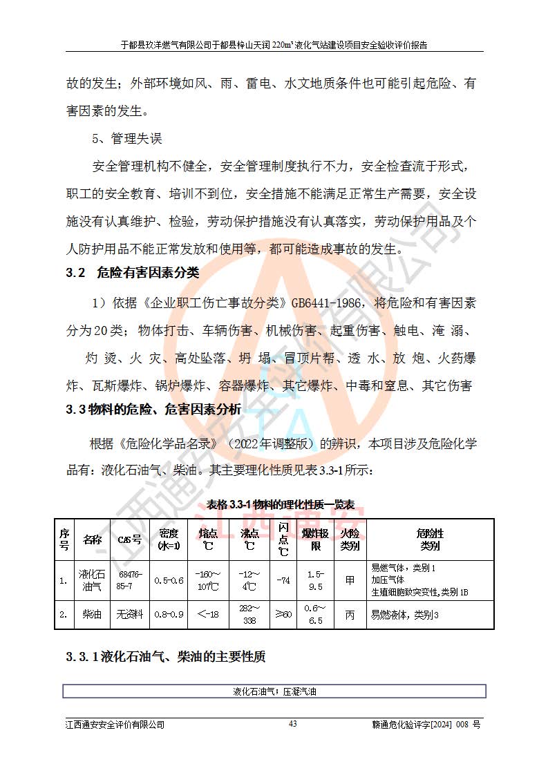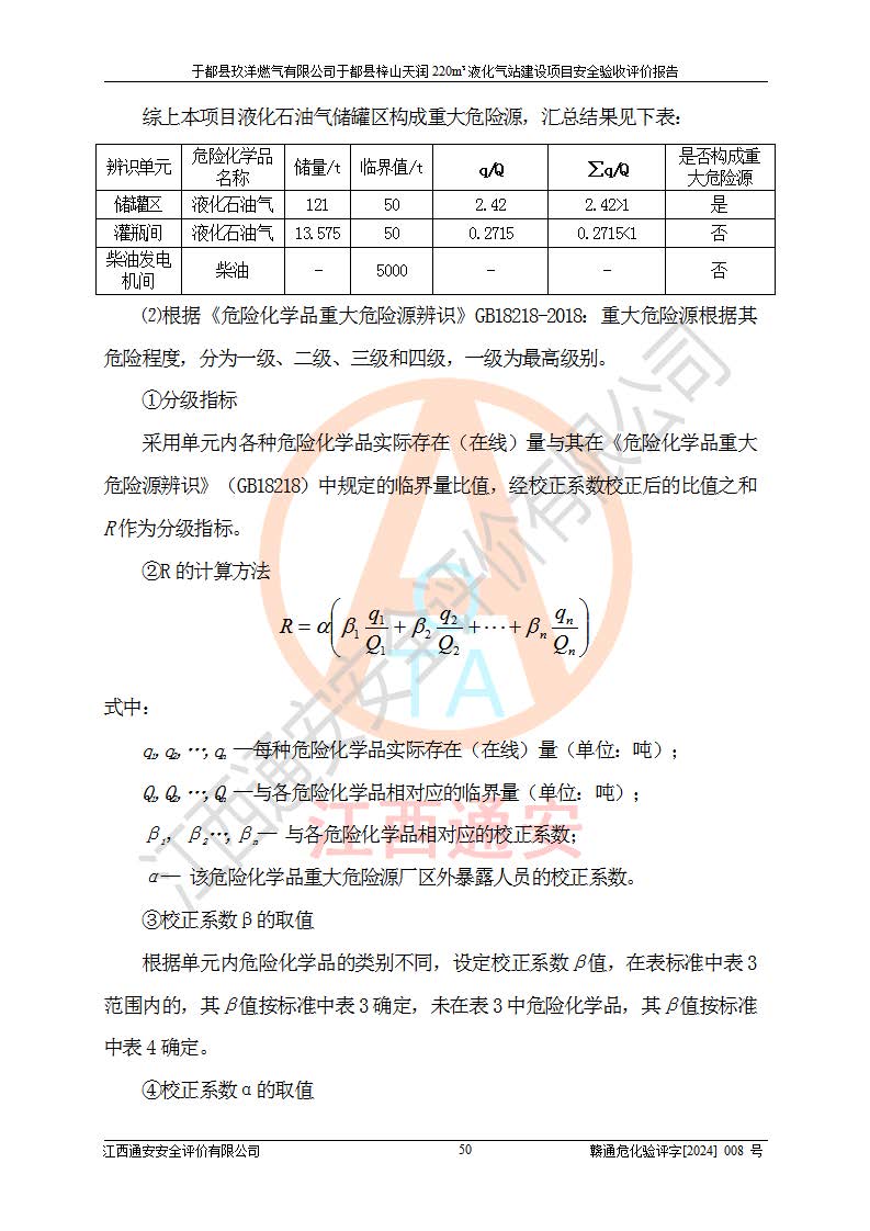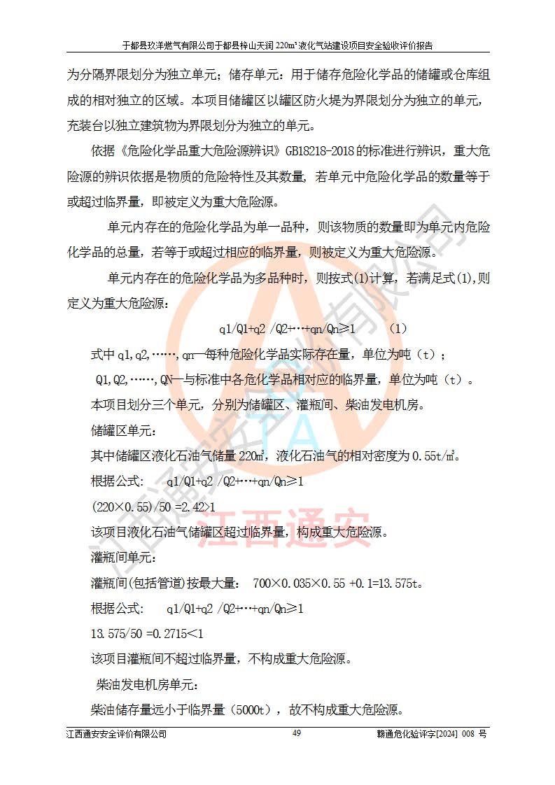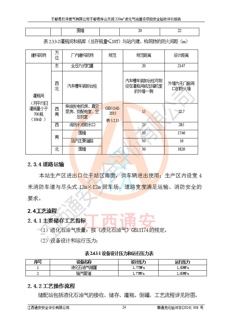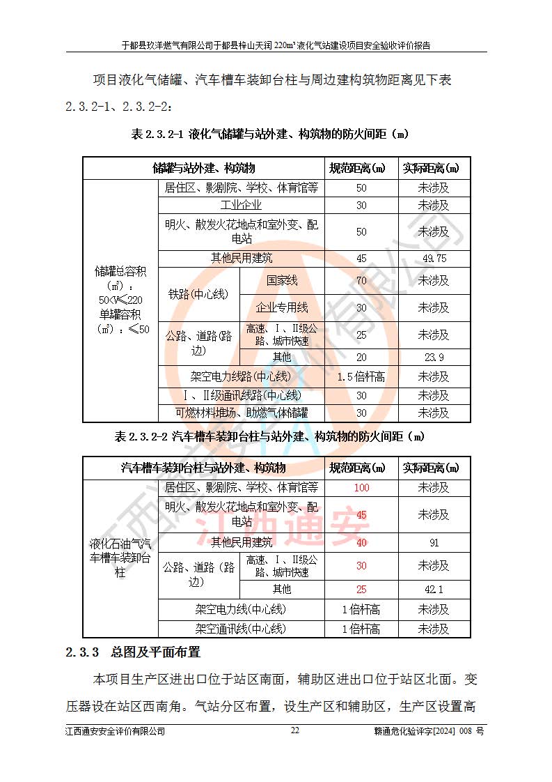 項(xiàng)目簡(jiǎn)介 | 于都縣玖洋燃?xì)庥邢薰臼浅闪⒂?/span>2022年03月04日,是從事燃?xì)饨?jīng)營(yíng)(憑**燃?xì)饨?jīng)營(yíng)許可證經(jīng)營(yíng))、燃?xì)馄骶呒芭浼N售的自然人獨(dú)資的有限責(zé)任公司。于都縣玖洋燃?xì)庥邢薰居诙伎h梓山天潤(rùn)220m3液化氣站位于江西省贛州市于都縣梓山鎮(zhèn)永豐村王屋組。用地面積為6884.2㎡(項(xiàng)目用地面積紅線面積5737.44㎡,租賃用地面積1148.78㎡,租賃用地只用于輔助工程建設(shè),不用于燃?xì)獾膬?chǔ)存及充裝相關(guān)建(構(gòu))筑物建設(shè))。該站設(shè)有4個(gè)50m3地上液化石油氣儲(chǔ)罐及1個(gè)20m3臥式殘液罐,總?cè)萘?/span>220m3,根據(jù)《液化石油氣供應(yīng)工程設(shè)計(jì)規(guī)范》GB51142-2015表 3.0.12對(duì)液化石油氣供應(yīng)站等級(jí)的劃分,該站為六級(jí)液化石油氣供應(yīng)站。主要經(jīng)營(yíng)的鋼瓶液化氣供應(yīng)于都縣附近居民,月平均日灌瓶量小于700瓶(10t/d)。 于都縣玖洋燃?xì)庥邢薰居诙伎h梓山天潤(rùn)220m3液化氣站位于江西省贛州市于都縣梓山鎮(zhèn)永豐村王屋組,法人**為藍(lán)建強(qiáng),注冊(cè)資本貳**元整,成立時(shí)間2022年03月04日,許可項(xiàng)目:燃?xì)饨?jīng)營(yíng),于2022年08月30日已取得贛州市行政審批局出具的《關(guān)于核準(zhǔn)于都縣梓山天潤(rùn)220m3液化氣站建設(shè)項(xiàng)目的批復(fù)》(項(xiàng)目代碼為:2208-360700-04-01-805994)。項(xiàng)目于2023年7月已委托江西省化學(xué)工業(yè)設(shè)計(jì)院出具的《安全設(shè)施設(shè)計(jì)》,于2023年9月8 日完成土建施工以及設(shè)備安裝,《氣瓶充裝許可證》已與2024年01月16日取得,由江西省市場(chǎng)監(jiān)督管理局發(fā)證。編號(hào)為TS4236291-2028,《燃?xì)饨?jīng)營(yíng)許可證》待驗(yàn)收達(dá)標(biāo)后方可辦理。 根據(jù)《中華人民共和國(guó)安全生產(chǎn)法》(中華人民共和國(guó)主席令第13號(hào),第88號(hào)修改[2021修訂])、《城鎮(zhèn)燃?xì)夤芾項(xiàng)l例》(***令第583號(hào))、《江西省城鎮(zhèn)燃?xì)饨?jīng)營(yíng)許可證管理辦法》( 2003年8月31日江西省人民**令第123號(hào)公布 2014年1月30日江西省人民**令第210號(hào)**次修正 2019年11月27日江西省人民**令第242號(hào)第二次修正)及《建設(shè)項(xiàng)目安全設(shè)施“三同時(shí)”監(jiān)督管理辦法》(**安監(jiān)總局令第36號(hào),77號(hào)令修訂)的要求,新建、改建、遷建、擴(kuò)建的城鎮(zhèn)燃?xì)饨ㄔO(shè)項(xiàng)目應(yīng)當(dāng)進(jìn)行進(jìn)行安全評(píng)價(jià)。 受于都縣玖洋燃?xì)庥邢薰镜奈?/span>, 江西通安安全評(píng)價(jià)有限公司承擔(dān)于都縣玖洋燃?xì)庥邢薰居诙伎h梓山天潤(rùn)220m3液化氣站建設(shè)項(xiàng)目的安全驗(yàn)收評(píng)價(jià)工作,于2023年11月13日,組成評(píng)價(jià)小組到于都縣梓山天潤(rùn)220m3液化氣站進(jìn)行了現(xiàn)場(chǎng)檢查。本次安全評(píng)價(jià),主要針對(duì)相關(guān)液化氣儲(chǔ)存、充裝項(xiàng)目進(jìn)行了類比調(diào)研后,依據(jù)**法律法規(guī)、標(biāo)準(zhǔn)規(guī)范及相關(guān)文件進(jìn)行安全驗(yàn)收評(píng)價(jià)。依據(jù)《安全評(píng)價(jià)通則》(AQ8001-2007)和《安全驗(yàn)收評(píng)價(jià)導(dǎo)則》(AQ8003-2007)編制本《安全驗(yàn)收評(píng)價(jià)報(bào)告》,并于形成評(píng)價(jià)報(bào)告,供建設(shè)單位、**部門參考。 | ||||