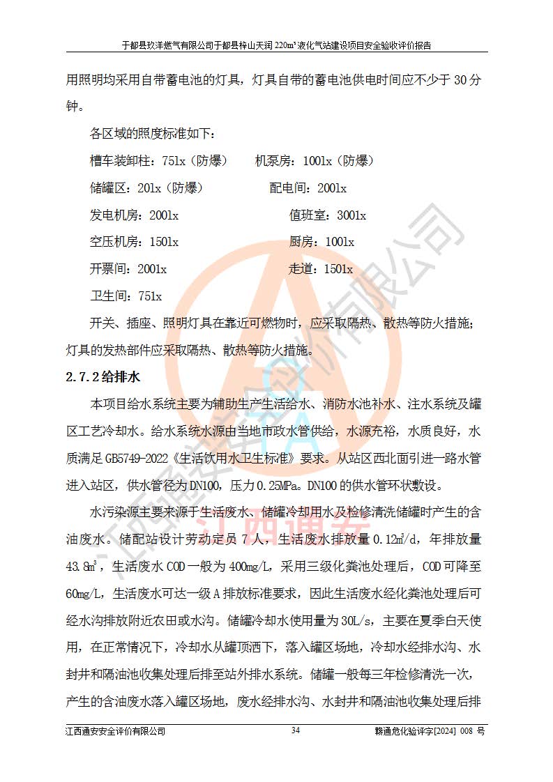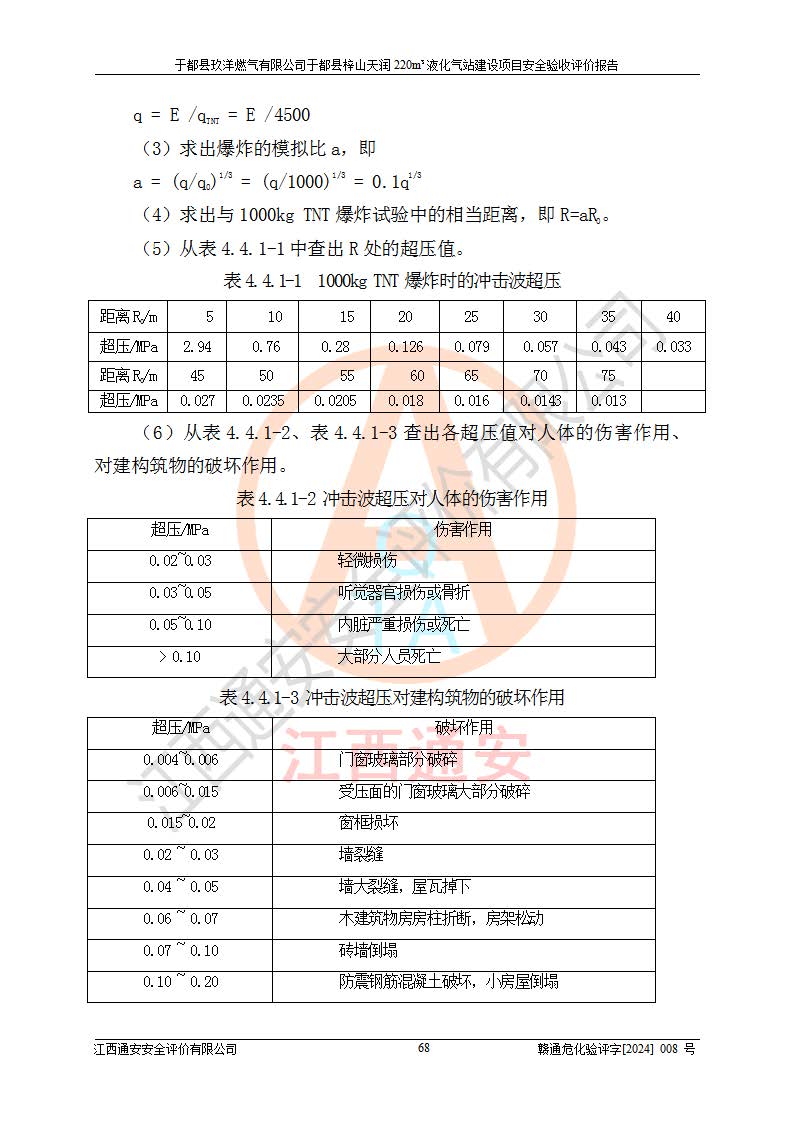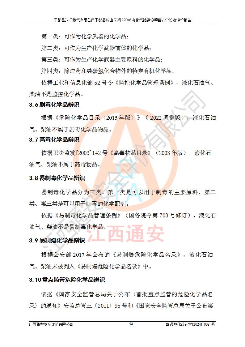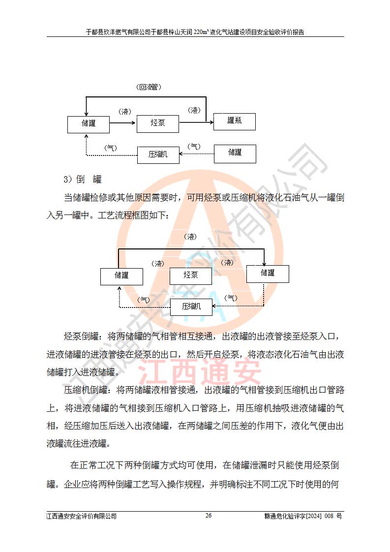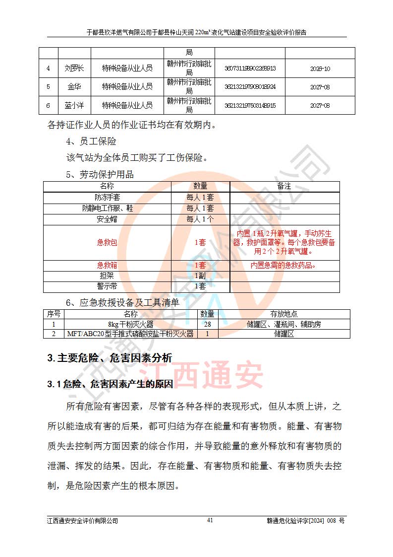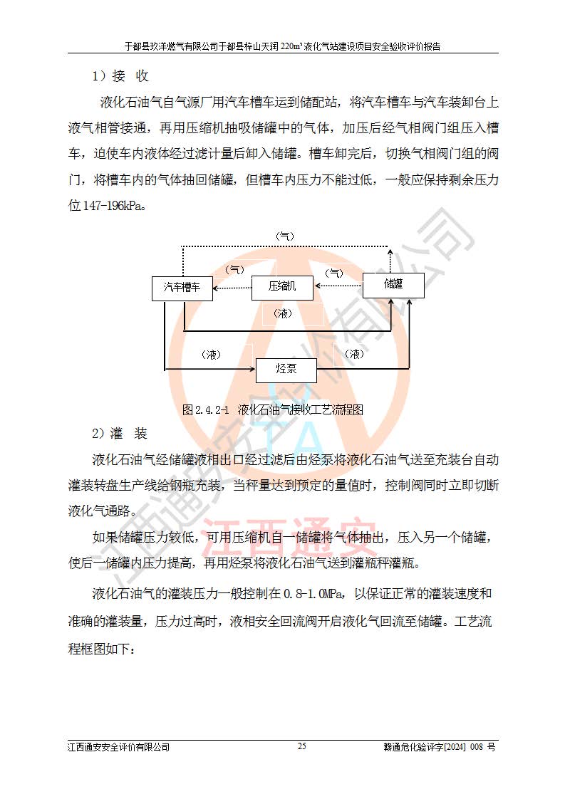 項(xiàng)目簡(jiǎn)介 | 于都縣玖洋燃?xì)庥邢薰臼浅闪⒂?/span>2022年03月04日,是從事燃?xì)饨?jīng)營(yíng)(憑**燃?xì)饨?jīng)營(yíng)許可證經(jīng)營(yíng))、燃?xì)馄骶呒芭浼N售的自然人獨(dú)資的有限責(zé)任公司。于都縣玖洋燃?xì)庥邢薰居诙伎h梓山天潤(rùn)220m3液化氣站位于江西省贛州市于都縣梓山鎮(zhèn)永豐村王屋組。用地面積為6884.2㎡(項(xiàng)目用地面積紅線面積5737.44㎡,租賃用地面積1148.78㎡,租賃用地只用于輔助工程建設(shè),不用于燃?xì)獾膬?chǔ)存及充裝相關(guān)建(構(gòu))筑物建設(shè))。該站設(shè)有4個(gè)50m3地上液化石油氣儲(chǔ)罐及1個(gè)20m3臥式殘液罐,總?cè)萘?/span>220m3,根據(jù)《液化石油氣供應(yīng)工程設(shè)計(jì)規(guī)范》GB51142-2015表 3.0.12對(duì)液化石油氣供應(yīng)站等級(jí)的劃分,該站為六級(jí)液化石油氣供應(yīng)站。主要經(jīng)營(yíng)的鋼瓶液化氣供應(yīng)于都縣附近居民,月平均日灌瓶量小于700瓶(10t/d)。 于都縣玖洋燃?xì)庥邢薰居诙伎h梓山天潤(rùn)220m3液化氣站位于江西省贛州市于都縣梓山鎮(zhèn)永豐村王屋組,法人**為藍(lán)建強(qiáng),注冊(cè)資本貳**元整,成立時(shí)間2022年03月04日,許可項(xiàng)目:燃?xì)饨?jīng)營(yíng),于2022年08月30日已取得贛州市行政審批局出具的《關(guān)于核準(zhǔn)于都縣梓山天潤(rùn)220m3液化氣站建設(shè)項(xiàng)目的批復(fù)》(項(xiàng)目代碼為:2208-360700-04-01-805994)。項(xiàng)目于2023年7月已委托江西省化學(xué)工業(yè)設(shè)計(jì)院出具的《安全設(shè)施設(shè)計(jì)》,于2023年9月8 日完成土建施工以及設(shè)備安裝,《氣瓶充裝許可證》已與2024年01月16日取得,由江西省市場(chǎng)監(jiān)督管理局發(fā)證。編號(hào)為TS4236291-2028,《燃?xì)饨?jīng)營(yíng)許可證》待驗(yàn)收達(dá)標(biāo)后方可辦理。 根據(jù)《中華人民共和國(guó)安全生產(chǎn)法》(中華人民共和國(guó)主席令第13號(hào),第88號(hào)修改[2021修訂])、《城鎮(zhèn)燃?xì)夤芾項(xiàng)l例》(***令第583號(hào))、《江西省城鎮(zhèn)燃?xì)饨?jīng)營(yíng)許可證管理辦法》( 2003年8月31日江西省人民**令第123號(hào)公布 2014年1月30日江西省人民**令第210號(hào)**次修正 2019年11月27日江西省人民**令第242號(hào)第二次修正)及《建設(shè)項(xiàng)目安全設(shè)施“三同時(shí)”監(jiān)督管理辦法》(**安監(jiān)總局令第36號(hào),77號(hào)令修訂)的要求,新建、改建、遷建、擴(kuò)建的城鎮(zhèn)燃?xì)饨ㄔO(shè)項(xiàng)目應(yīng)當(dāng)進(jìn)行進(jìn)行安全評(píng)價(jià)。 受于都縣玖洋燃?xì)庥邢薰镜奈?/span>, 江西通安安全評(píng)價(jià)有限公司承擔(dān)于都縣玖洋燃?xì)庥邢薰居诙伎h梓山天潤(rùn)220m3液化氣站建設(shè)項(xiàng)目的安全驗(yàn)收評(píng)價(jià)工作,于2023年11月13日,組成評(píng)價(jià)小組到于都縣梓山天潤(rùn)220m3液化氣站進(jìn)行了現(xiàn)場(chǎng)檢查。本次安全評(píng)價(jià),主要針對(duì)相關(guān)液化氣儲(chǔ)存、充裝項(xiàng)目進(jìn)行了類比調(diào)研后,依據(jù)**法律法規(guī)、標(biāo)準(zhǔn)規(guī)范及相關(guān)文件進(jìn)行安全驗(yàn)收評(píng)價(jià)。依據(jù)《安全評(píng)價(jià)通則》(AQ8001-2007)和《安全驗(yàn)收評(píng)價(jià)導(dǎo)則》(AQ8003-2007)編制本《安全驗(yàn)收評(píng)價(jià)報(bào)告》,并于形成評(píng)價(jià)報(bào)告,供建設(shè)單位、**部門參考。 | ||||