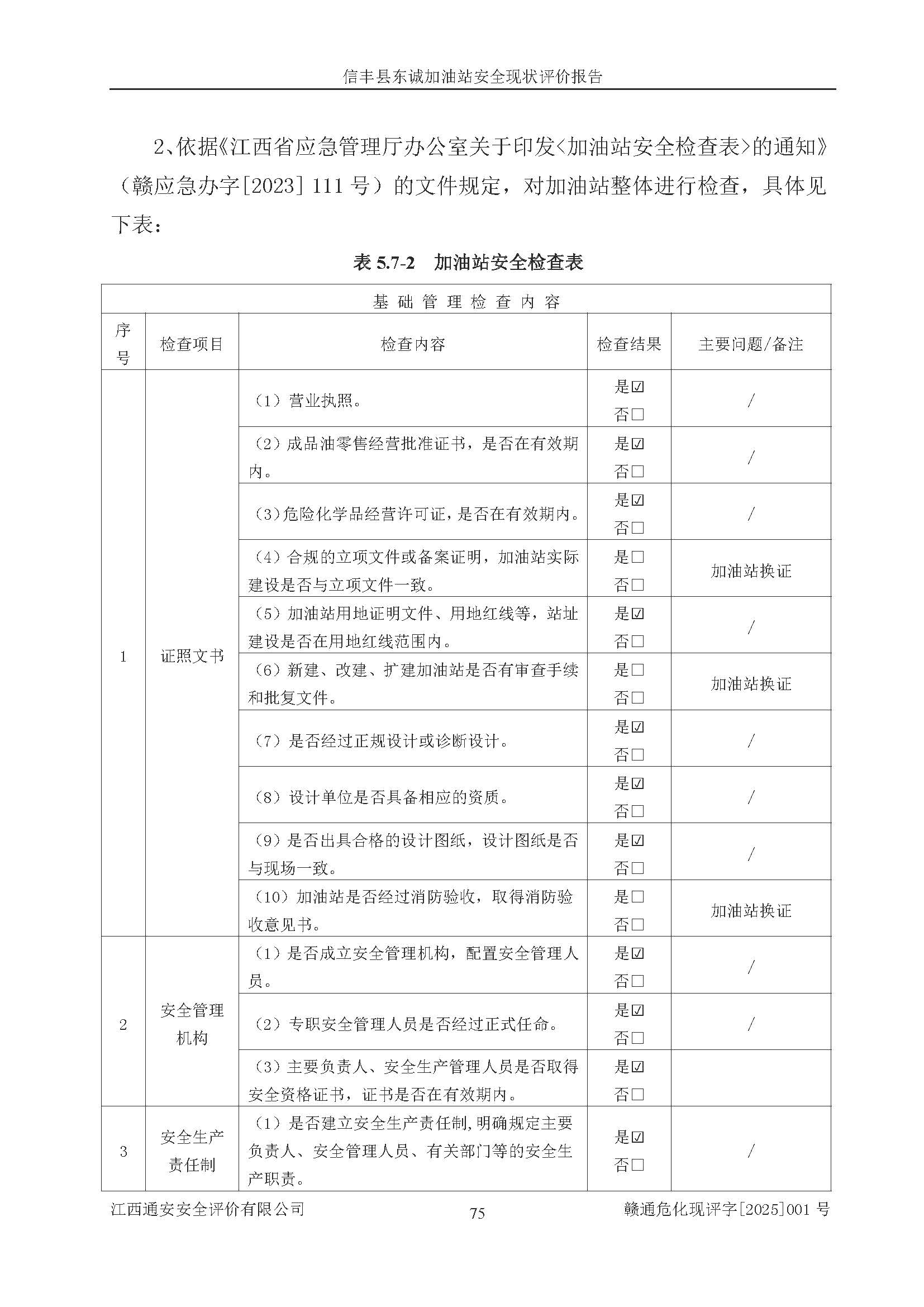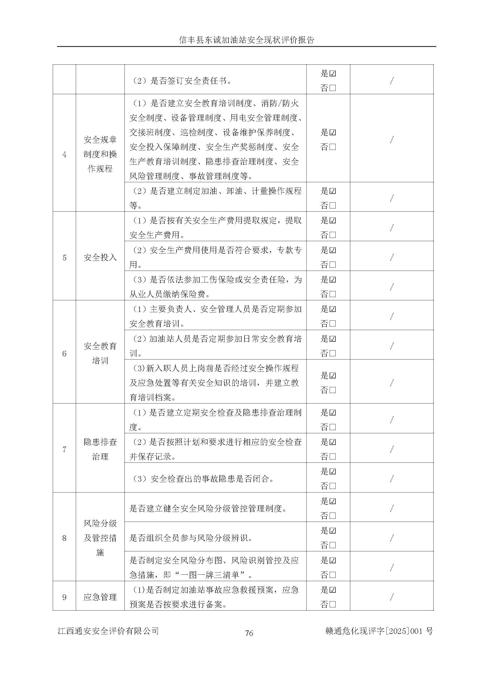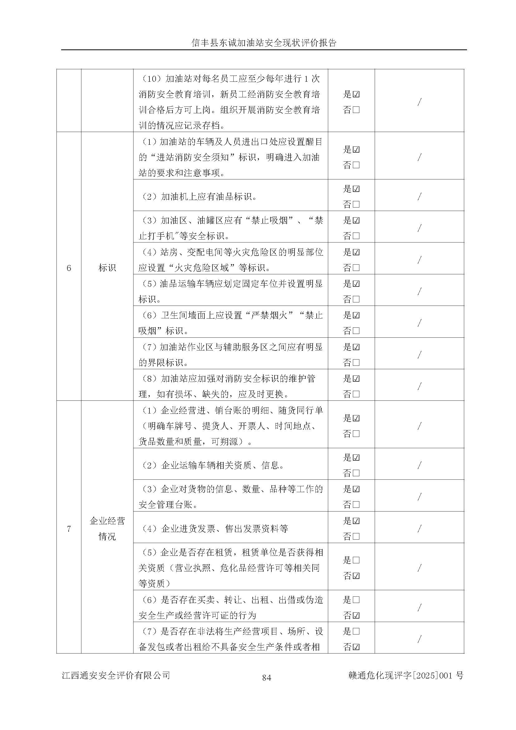 評價結論 | 信豐縣東誠加油站安全現(xiàn)狀符合危險化學品經(jīng)營安全條件。 | |||