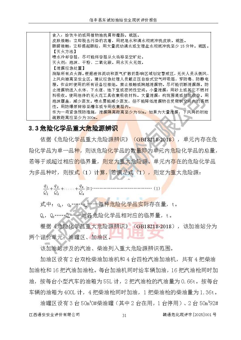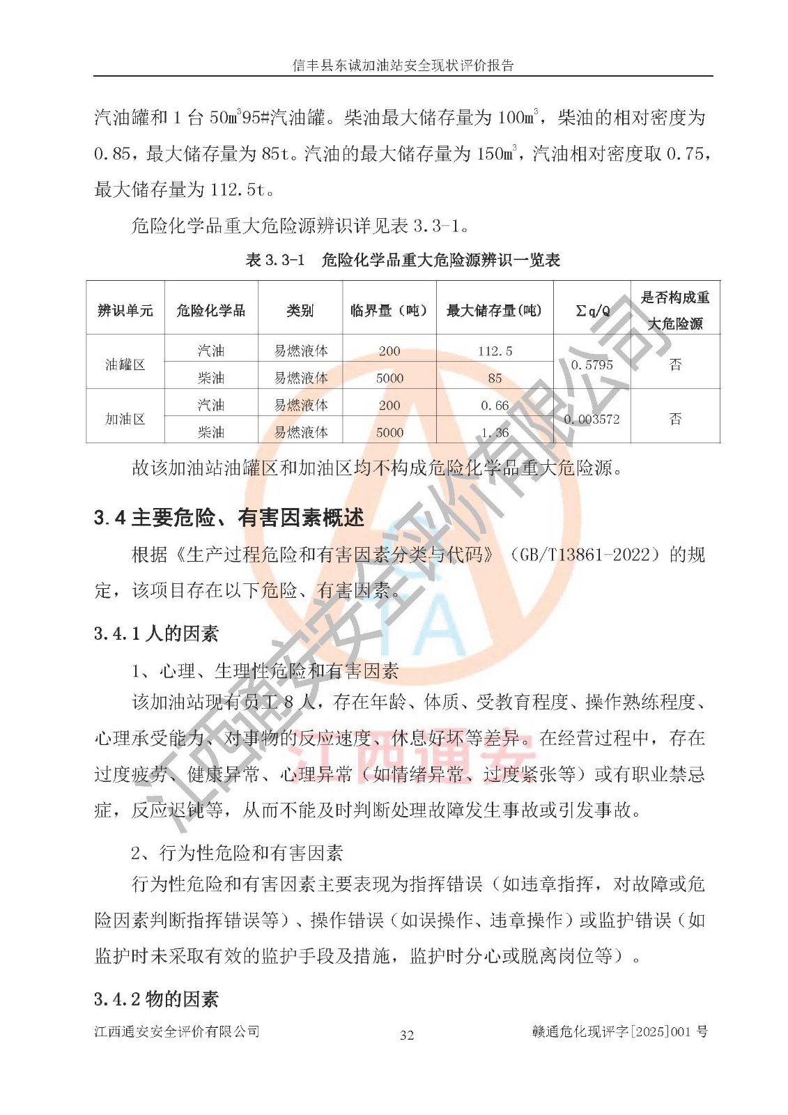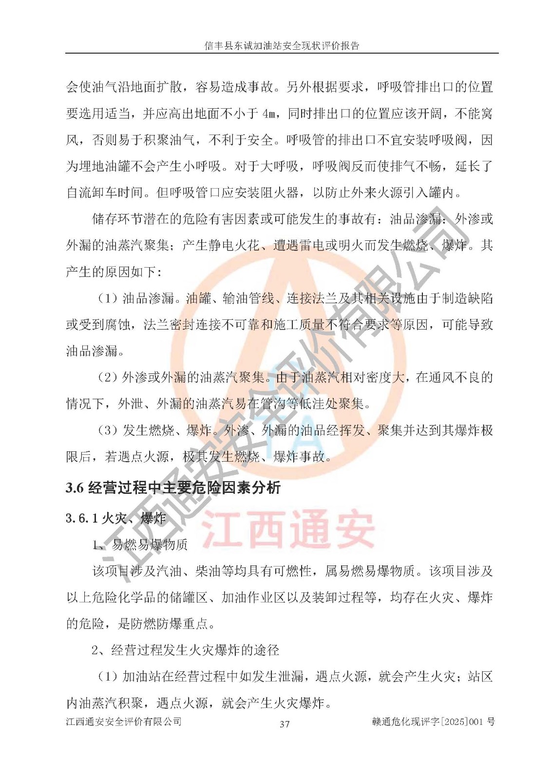 項目簡介 | 信豐縣東誠加油站位于贛州市信豐縣嘉定鎮(zhèn)黃家坑村,企業(yè)法定**人為李敏暉,現(xiàn)有員工8人,其中安全管理人員2人。該加油站2022年03月04日取得了危險化學品經(jīng)營許可證,登記編號為(贛)信行審危許字[2022]006號,經(jīng)營方式為零售(帶有儲存設施經(jīng)營),許可范圍為汽油、柴油,**期限為2022年03月04日至2025年03月03日。該加油站2020年8月17日取得了成品油零售經(jīng)營批準證書,編號為油零售證書第虔0038號,**期限為2020年06月23日至2025年06月22日。加油站設有6臺埋地油罐,其中停用1臺油罐,使用的油罐分別為2臺50m30#柴油臥式儲罐、2臺50m392#汽油臥式儲罐和1臺50m395#汽油臥式儲罐,總儲存能力為200m3(柴油折半),為一級加油站。加油區(qū)設有4臺四槍加油機和2臺雙槍加油站。該加油站目前運行正常。 | |||