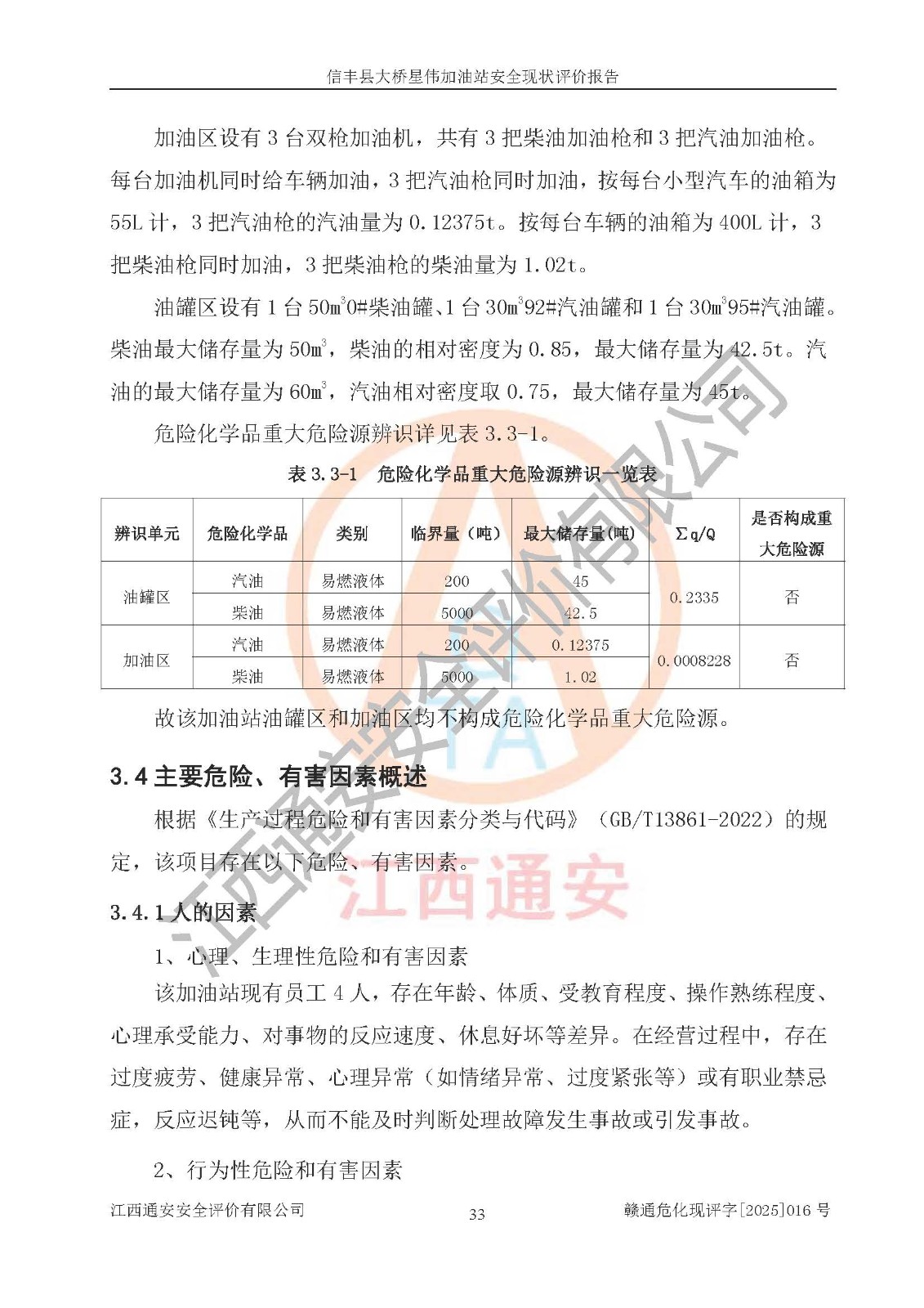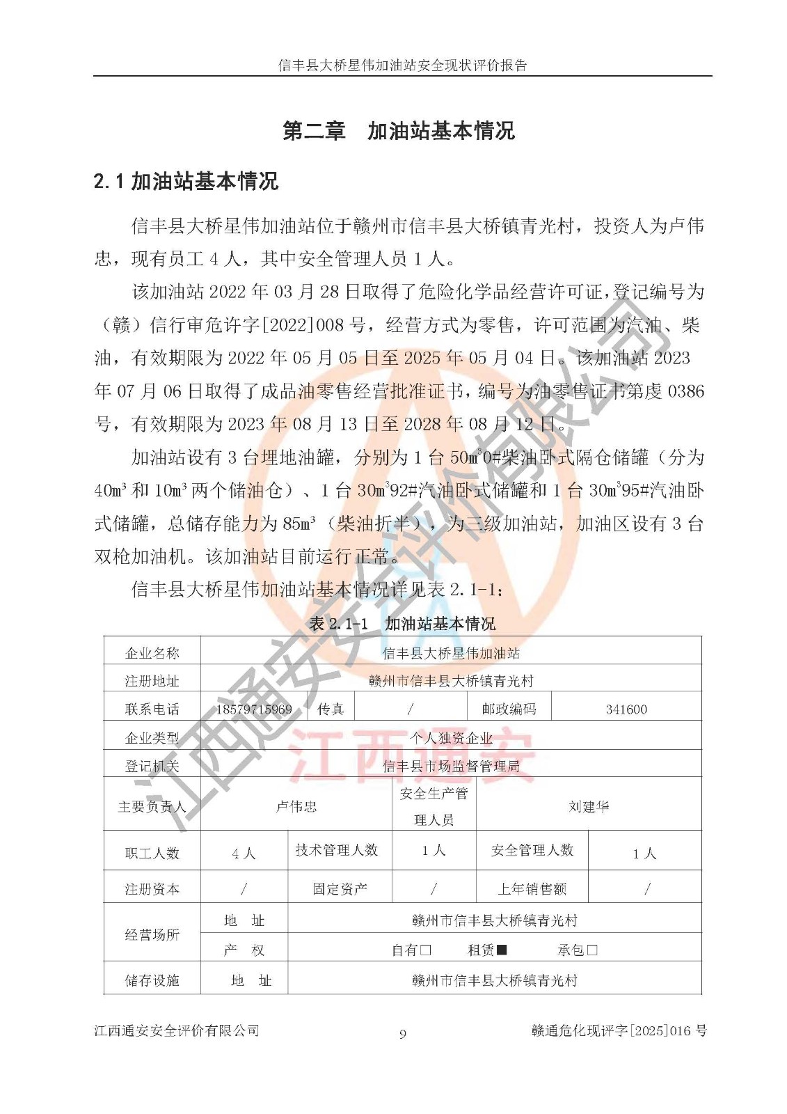 項目簡介 | 信豐縣大橋星偉加油站位于贛州市信豐縣大橋鎮(zhèn)青光村,投資人為盧偉忠,現(xiàn)有員工4人,其中安全管理人員1人。該加油站2022年03月28日取得了危險化學(xué)品經(jīng)營許可證,登記編號為(贛)信行審危許字[2022]008號,經(jīng)營方式為零售,許可范圍為汽油、柴油,**期限為2022年05月05日至2025年05月04日。該加油站2023年07月06日取得了成品油零售經(jīng)營批準(zhǔn)證書,編號為油零售證書第虔0386號,**期限為2023年08月13日至2028年08月12日。加油站設(shè)有3臺埋地油罐,分別為1臺50m30#柴油臥式隔倉儲罐(分為40m3和10m3兩個儲油倉)、1臺30m392#汽油臥式油罐和1臺30m395#汽油臥式油罐,總儲存能力為85m3(柴油折半),為三級加油站。加油區(qū)設(shè)有3臺雙槍加油機。該加油站目前運行正常。 | |||
