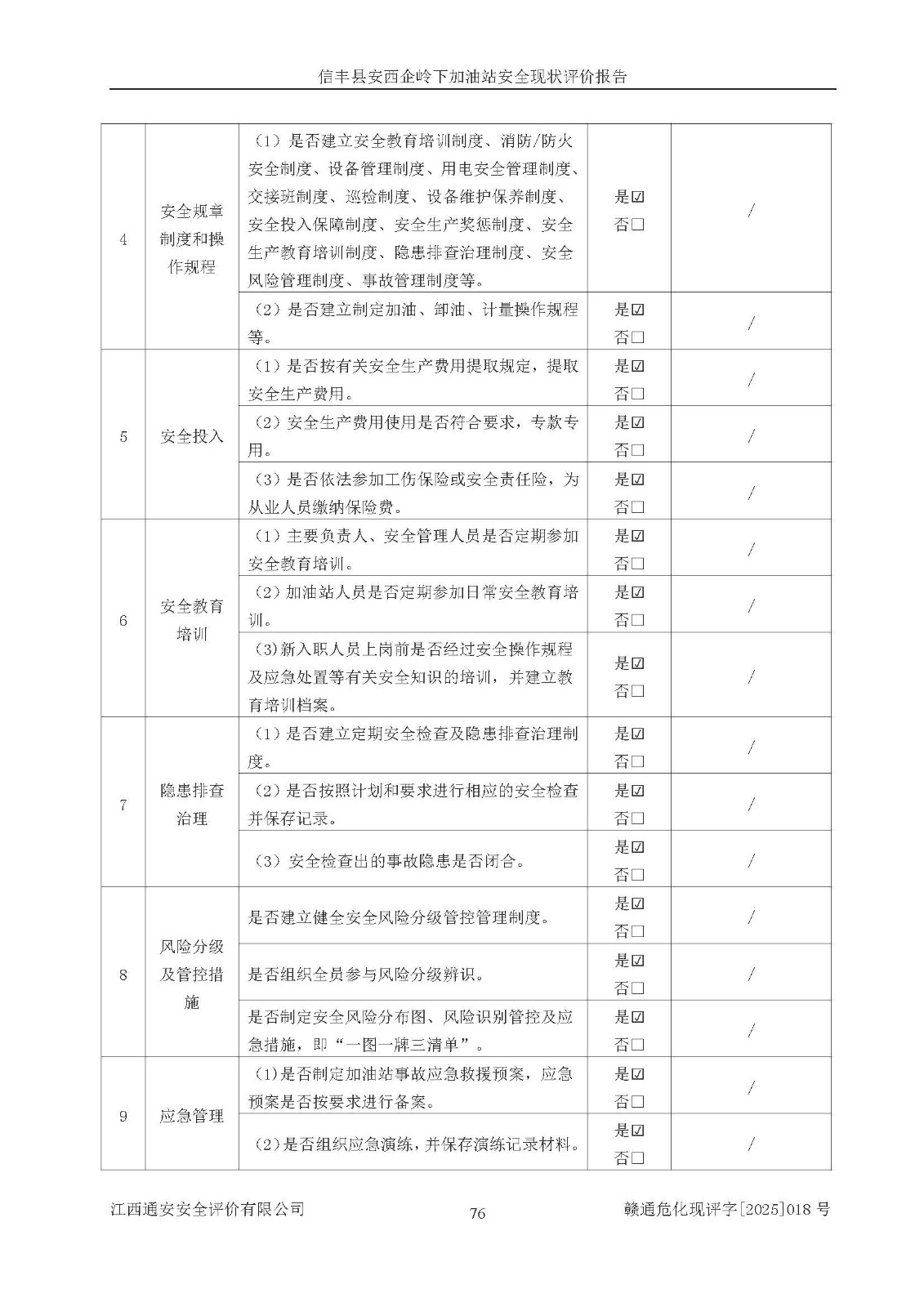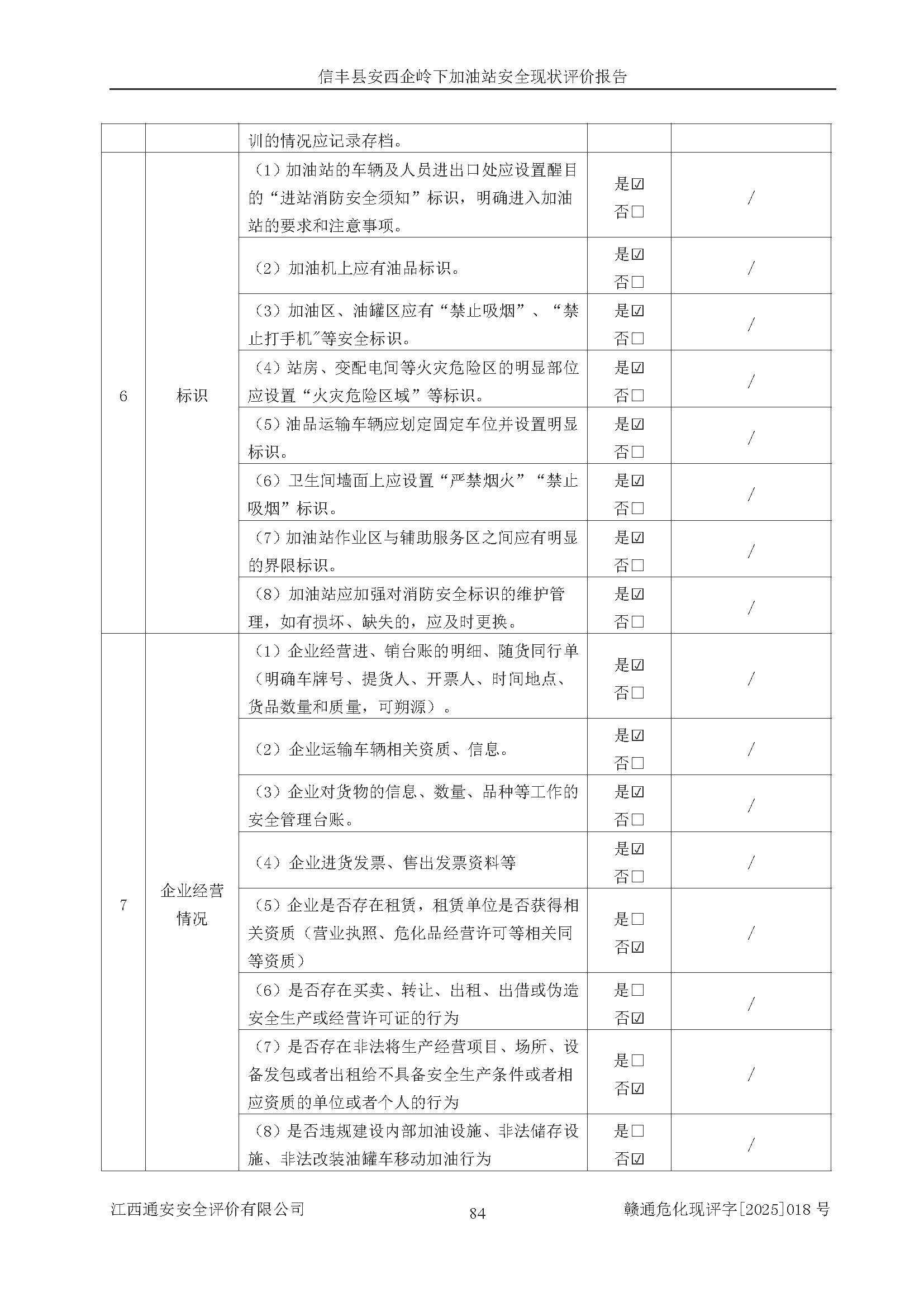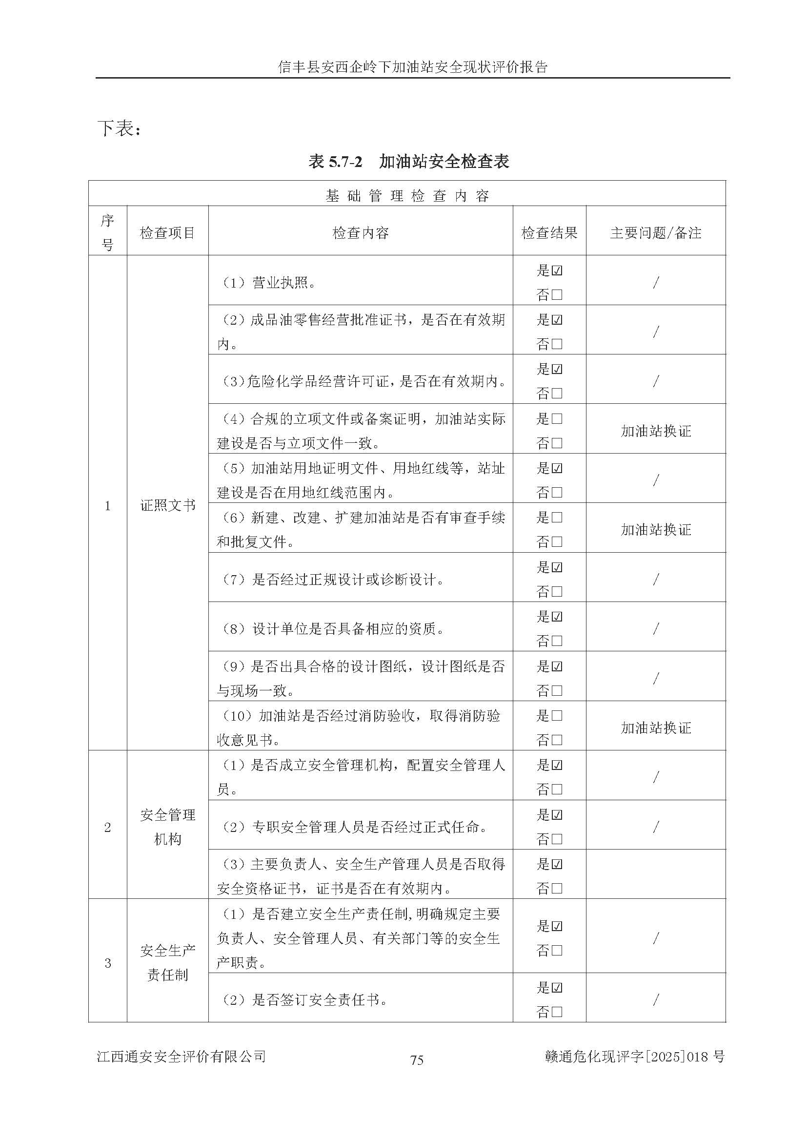 評價結(jié)論 | 信豐縣安西企嶺下加油站安全現(xiàn)狀符合危險化學(xué)品經(jīng)營安全條件。 | |||