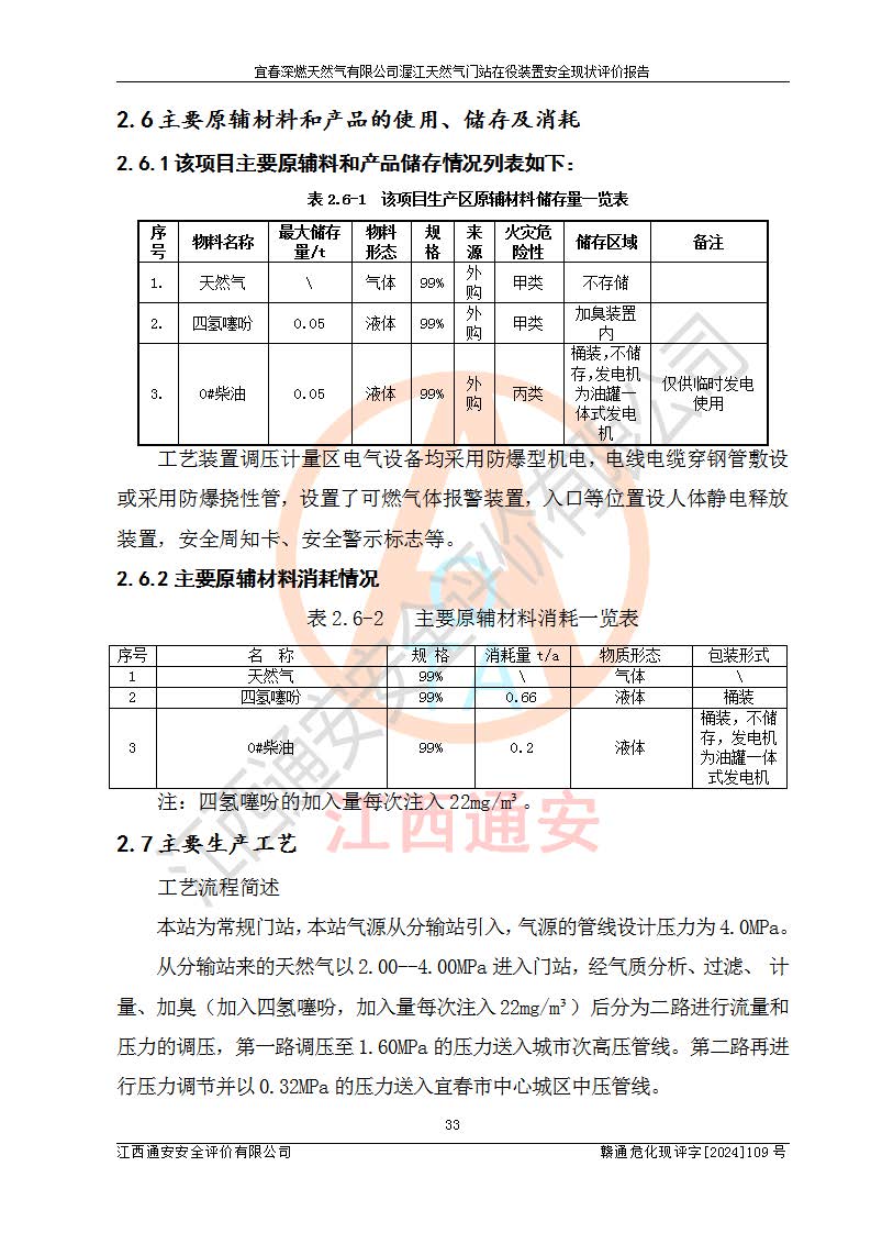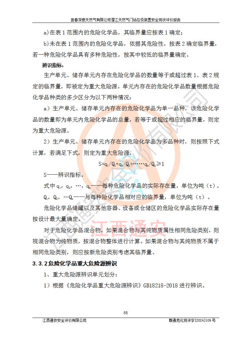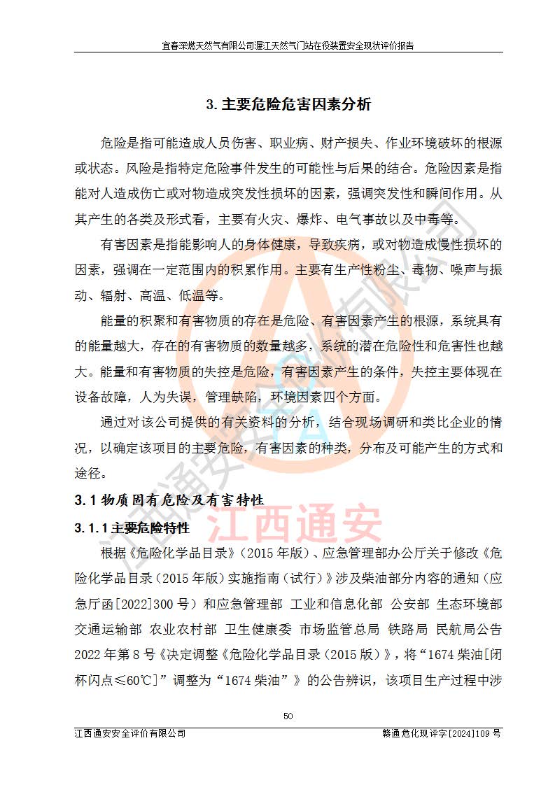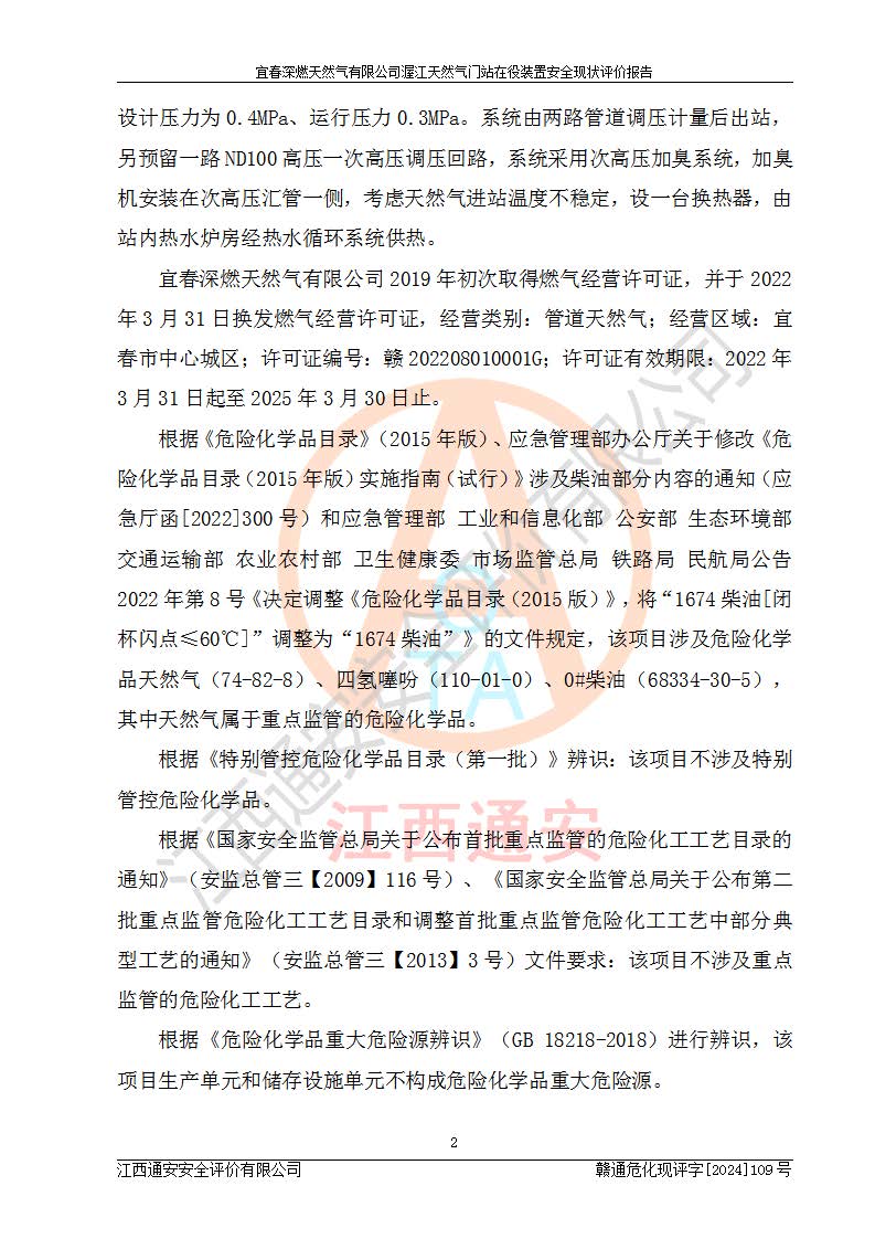 項(xiàng)目簡介 | 宜春深燃天然氣有限公司在江西省宜春市袁州區(qū)渥江路與滬昆高速公路交叉以西建有宜春天然氣接收門站(渥江門站)項(xiàng)目,該門站與江西省投資有限公司天然氣接收站及中石油西氣東輸二線宜春分輸站毗鄰,總占地面積6006***,現(xiàn)有工藝裝置區(qū)(包括配管區(qū)、進(jìn)出站總切斷閥區(qū)、安全放散區(qū))及輔助生產(chǎn)區(qū)等,供氣能力4.8×105Nm3/d,進(jìn)站管道設(shè)計(jì)壓力為4.0MPa、來氣壓力2.5MPa,設(shè)計(jì)接收*大小時(shí)流量20000Nm3/h,出站管道設(shè)計(jì)壓力為0.4MPa、運(yùn)行壓力0.3MPa。系統(tǒng)由兩路管道調(diào)壓計(jì)量后出站,另預(yù)留一路ND100高壓一次高壓調(diào)壓回路,系統(tǒng)采用次高壓加臭系統(tǒng),加臭機(jī)安裝在次高壓匯管一側(cè),考慮天然氣進(jìn)站溫度不穩(wěn)定,設(shè)一臺換熱器,由站內(nèi)熱水爐房經(jīng)熱水循環(huán)系統(tǒng)供熱。 宜春深燃天然氣有限公司2019年初次取得燃?xì)饨?jīng)營許可證,并于2022年3月31日換發(fā)燃?xì)饨?jīng)營許可證,經(jīng)營類別:管道天然氣;經(jīng)營區(qū)域:宜春市中心城區(qū);許可證編號:贛202208010001G;許可證**期限:2022年3月31日起至2025年3月30日止。 根據(jù)《危險(xiǎn)化學(xué)品目錄》(2015年版)、應(yīng)急管理部辦公廳關(guān)于修改《危險(xiǎn)化學(xué)品目錄(2015年版)實(shí)施指南(試行)》涉及柴油部分內(nèi)容的通知(應(yīng)急廳函[2022]300號)和應(yīng)急管理部 工業(yè)和信息化部 公安部 生態(tài)環(huán)境部 交通運(yùn)輸部 農(nóng)業(yè)農(nóng)村部 衛(wèi)生健康委 市場監(jiān)管總局 鐵路局 民航局公告2022年第8號《決定調(diào)整《危險(xiǎn)化學(xué)品目錄(2015版)》,將“1674柴油[閉杯閃點(diǎn)≤60℃]”調(diào)整為“1674柴油”》的文件規(guī)定,該項(xiàng)目涉及危險(xiǎn)化學(xué)品天然氣(74-82-8)、四氫噻吩(110-01-0)、0#柴油(68334-30-5),其中天然氣屬于重點(diǎn)監(jiān)管的危險(xiǎn)化學(xué)品。 根據(jù)《特別管控危險(xiǎn)化學(xué)品目錄(**批)》辨識:該項(xiàng)目不涉及特別管控危險(xiǎn)化學(xué)品。 根據(jù)《**安全監(jiān)管總局關(guān)于公布首批重點(diǎn)監(jiān)管的危險(xiǎn)化工工藝目錄的通知》(安監(jiān)總管三【2009】116號)、《**安全監(jiān)管總局關(guān)于公布第二批重點(diǎn)監(jiān)管危險(xiǎn)化工工藝目錄和調(diào)整首批重點(diǎn)監(jiān)管危險(xiǎn)化工工藝中部分典型工藝的通知》(安監(jiān)總管三【2013】3號)文件要求:該項(xiàng)目不涉及重點(diǎn)監(jiān)管的危險(xiǎn)化工工藝。 根據(jù)《危險(xiǎn)化學(xué)品重大危險(xiǎn)源辨識》(GB 18218-2018)進(jìn)行辨識,該項(xiàng)目生產(chǎn)單元和儲存設(shè)施單元不構(gòu)成危險(xiǎn)化學(xué)品重大危險(xiǎn)源。