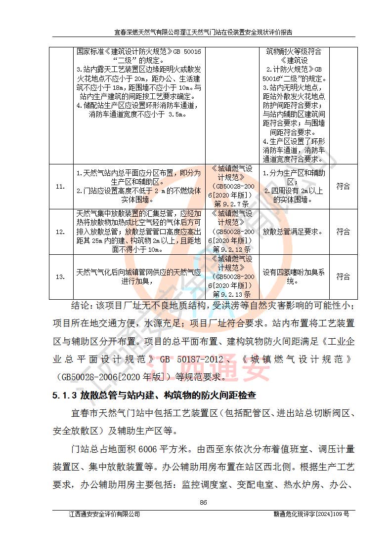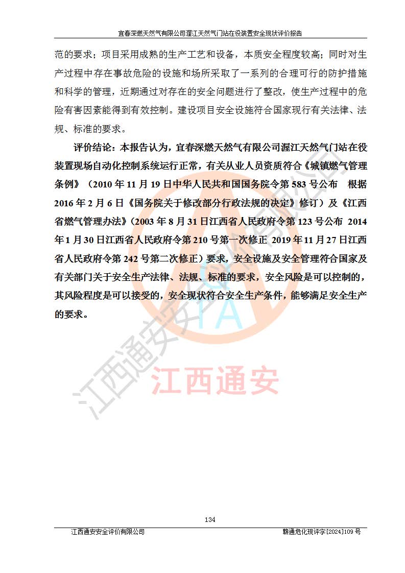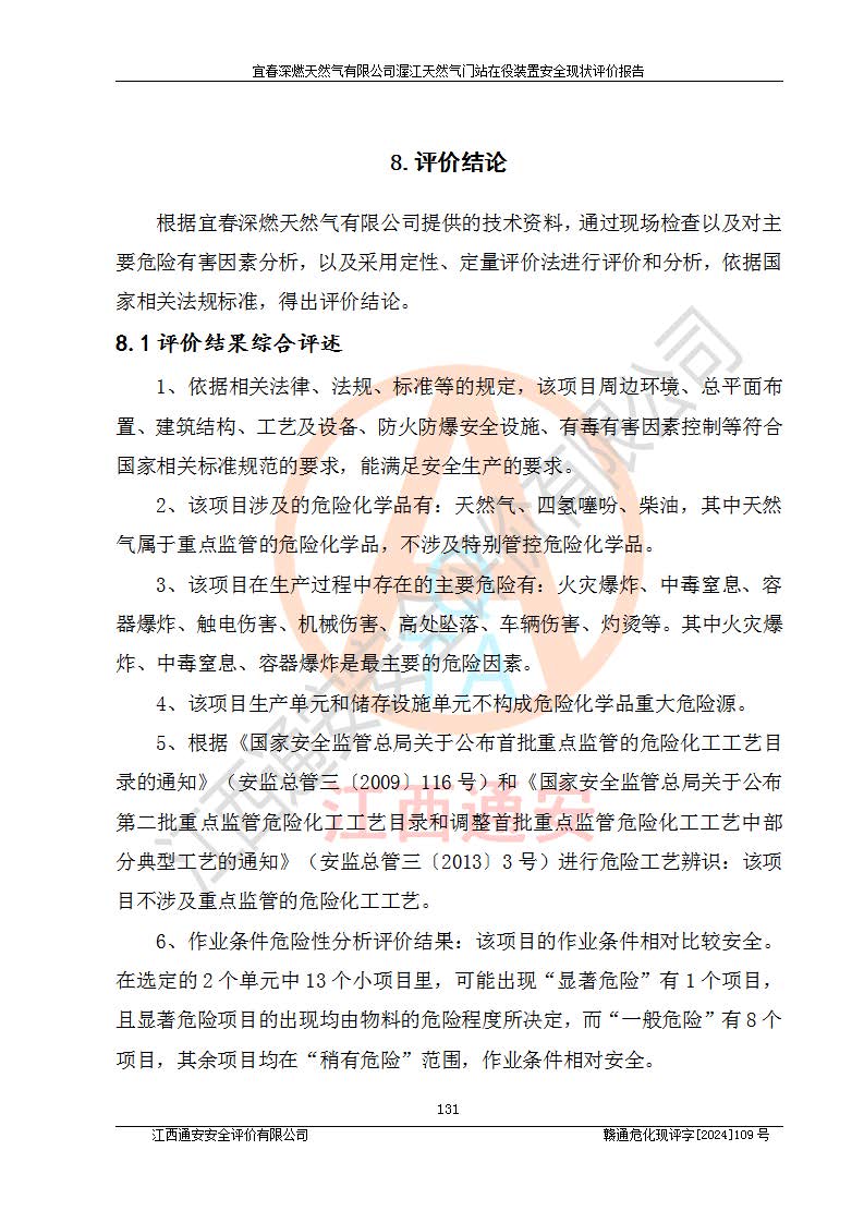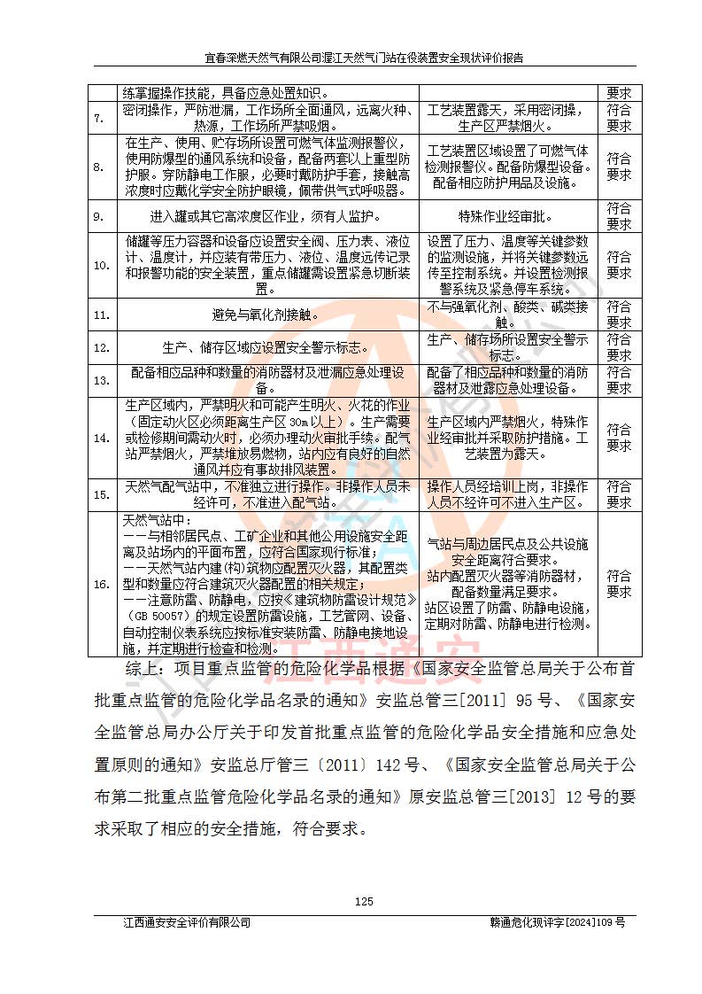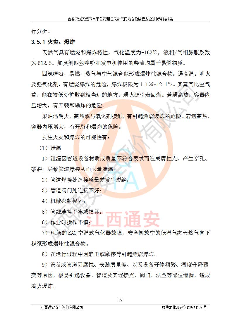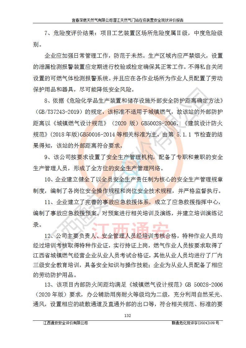 其它 | 1、依據(jù)相關(guān)法律、法規(guī)、標(biāo)準(zhǔn)等的規(guī)定,該項(xiàng)目周邊環(huán)境、總平面布置、建筑結(jié)構(gòu)、工藝及設(shè)備、防火防爆安全設(shè)施、有毒有害因素控制等符合**相關(guān)標(biāo)準(zhǔn)規(guī)范的要求,能滿足安全生產(chǎn)的要求。 2、該項(xiàng)目涉及的危險(xiǎn)化學(xué)品有:天然氣、四氫噻吩、柴油,其中天然氣屬于重點(diǎn)監(jiān)管的危險(xiǎn)化學(xué)品,不涉及特別管控危險(xiǎn)化學(xué)品。 3、該項(xiàng)目在生產(chǎn)過程中存在的主要危險(xiǎn)有:火災(zāi)爆炸、中毒窒息、容器爆炸、觸電傷害、機(jī)械傷害、高處墜落、**傷害、灼燙等。其中火災(zāi)爆炸、中毒窒息、容器爆炸是*主要的危險(xiǎn)因素。 4、該項(xiàng)目生產(chǎn)單元和儲存設(shè)施單元不構(gòu)成危險(xiǎn)化學(xué)品重大危險(xiǎn)源。 5、根據(jù)《**安全監(jiān)管總局關(guān)于公布首批重點(diǎn)監(jiān)管的危險(xiǎn)化工工藝目錄的通知》(安監(jiān)總管三〔2009〕116號)和《**安全監(jiān)管總局關(guān)于公布第二批重點(diǎn)監(jiān)管危險(xiǎn)化工工藝目錄和調(diào)整首批重點(diǎn)監(jiān)管危險(xiǎn)化工工藝中部分典型工藝的通知》(安監(jiān)總管三〔2013〕3號)進(jìn)行危險(xiǎn)工藝辨識:該項(xiàng)目不涉及重點(diǎn)監(jiān)管的危險(xiǎn)化工工藝。 6、作業(yè)條件危險(xiǎn)性分析評價(jià)結(jié)果:該項(xiàng)目的作業(yè)條件相對比較安全。在選定的2個單元中13個小項(xiàng)目里,可能出現(xiàn)“顯著危險(xiǎn)”有1個項(xiàng)目,且顯著危險(xiǎn)項(xiàng)目的出現(xiàn)均由物料的危險(xiǎn)程度所決定,而“一般危險(xiǎn)”有8個項(xiàng)目,其余項(xiàng)目均在“稍有危險(xiǎn)”范圍,作業(yè)條件相對安全。 7、危險(xiǎn)度評價(jià)結(jié)果:項(xiàng)目工藝裝置區(qū)場所危險(xiǎn)度屬Ⅱ級,中度危險(xiǎn)級別。 企業(yè)應(yīng)加強(qiáng)日常管理工作,防范于未然。生產(chǎn)區(qū)域內(nèi)應(yīng)嚴(yán)禁煙火,設(shè)置的泄漏檢測報(bào)警裝置應(yīng)定期進(jìn)行校驗(yàn)或檢定**其正常工作。不得私自關(guān)閉設(shè)置的可燃?xì)怏w檢測報(bào)警系統(tǒng)。并且應(yīng)在各作業(yè)場所為作業(yè)人員配置了勞動保護(hù)用品和器具,盡可能降低安全風(fēng)險(xiǎn)。 評價(jià)結(jié)論:本報(bào)告認(rèn)為,宜春深燃天然氣有限公司渥江天然氣門站在役裝置現(xiàn)場自動化控制系統(tǒng)運(yùn)行正常,有關(guān)從業(yè)人員資質(zhì)符合《城鎮(zhèn)燃?xì)夤芾項(xiàng)l例》(2010年11月19日中華人民共和國***令第583號公布 根據(jù)2016年2月6日《***關(guān)于修改部分行政法規(guī)的決定》修訂)及《江西省燃?xì)夤芾磙k法》(2003年8月31日江西省人民**令**23號公布 2014年1月30日江西省人民**令第210號**次修正 2019年11月27日江西省人民**令第242號第二次修正)要求,安全設(shè)施及安全管理符合**及有關(guān)部門關(guān)于安全生產(chǎn)法律、法規(guī)、標(biāo)準(zhǔn)的要求,安全風(fēng)險(xiǎn)是可以控制的,其風(fēng)險(xiǎn)程度是可以接受的,安全現(xiàn)狀符合安全生產(chǎn)條件,能夠滿足安全生產(chǎn)的要求。