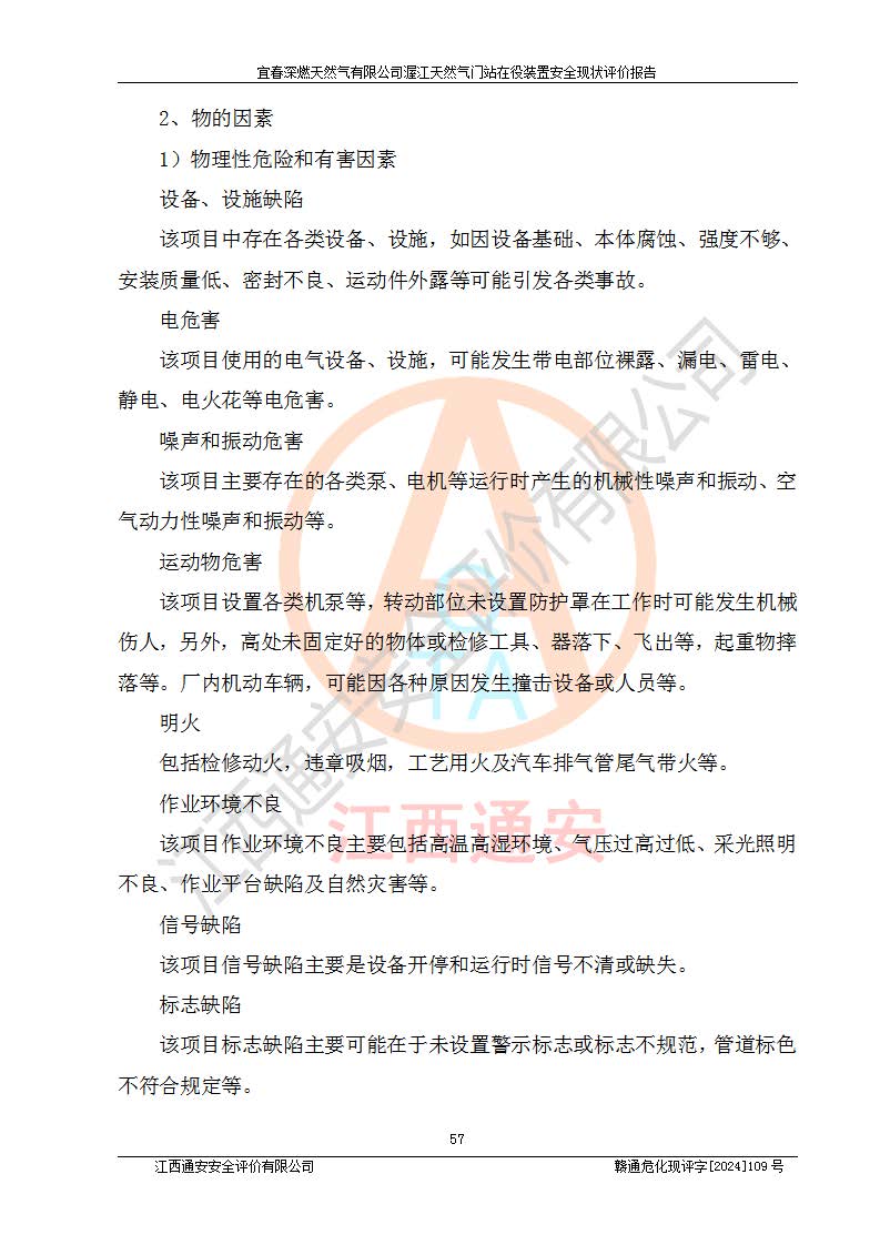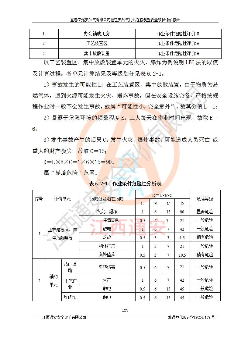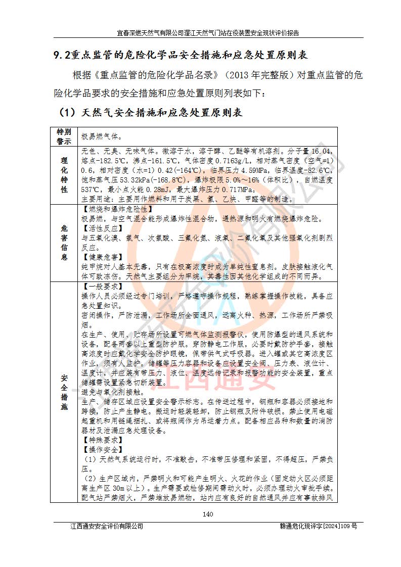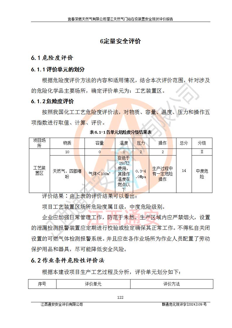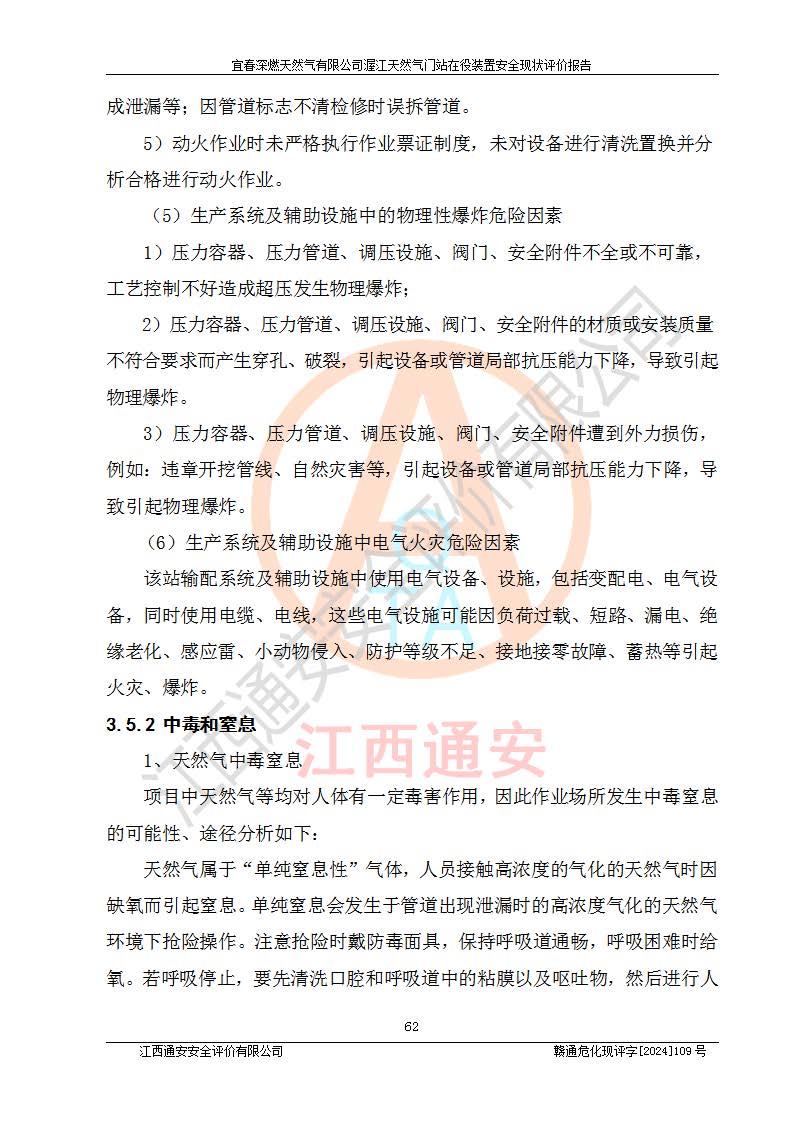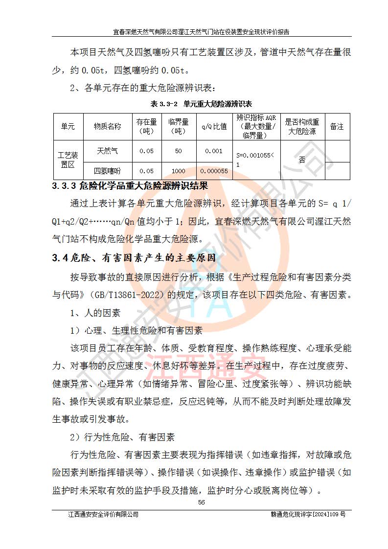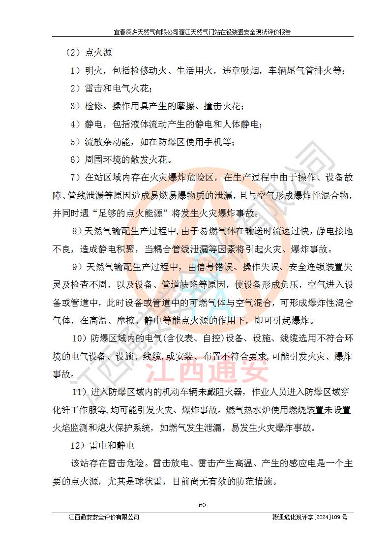 其它 | 1、依據(jù)相關(guān)法律、法規(guī)、標(biāo)準(zhǔn)等的規(guī)定,該項(xiàng)目周邊環(huán)境、總平面布置、建筑結(jié)構(gòu)、工藝及設(shè)備、防火防爆安全設(shè)施、有毒有害因素控制等符合**相關(guān)標(biāo)準(zhǔn)規(guī)范的要求,能滿足安全生產(chǎn)的要求。 2、該項(xiàng)目涉及的危險(xiǎn)化學(xué)品有:天然氣、四氫噻吩、柴油,其中天然氣屬于重點(diǎn)監(jiān)管的危險(xiǎn)化學(xué)品,不涉及特別管控危險(xiǎn)化學(xué)品。 3、該項(xiàng)目在生產(chǎn)過程中存在的主要危險(xiǎn)有:火災(zāi)爆炸、中毒窒息、容器爆炸、觸電傷害、機(jī)械傷害、高處墜落、**傷害、灼燙等。其中火災(zāi)爆炸、中毒窒息、容器爆炸是*主要的危險(xiǎn)因素。 4、該項(xiàng)目生產(chǎn)單元和儲存設(shè)施單元不構(gòu)成危險(xiǎn)化學(xué)品重大危險(xiǎn)源。 5、根據(jù)《**安全監(jiān)管總局關(guān)于公布首批重點(diǎn)監(jiān)管的危險(xiǎn)化工工藝目錄的通知》(安監(jiān)總管三〔2009〕116號)和《**安全監(jiān)管總局關(guān)于公布第二批重點(diǎn)監(jiān)管危險(xiǎn)化工工藝目錄和調(diào)整首批重點(diǎn)監(jiān)管危險(xiǎn)化工工藝中部分典型工藝的通知》(安監(jiān)總管三〔2013〕3號)進(jìn)行危險(xiǎn)工藝辨識:該項(xiàng)目不涉及重點(diǎn)監(jiān)管的危險(xiǎn)化工工藝。 6、作業(yè)條件危險(xiǎn)性分析評價(jià)結(jié)果:該項(xiàng)目的作業(yè)條件相對比較安全。在選定的2個單元中13個小項(xiàng)目里,可能出現(xiàn)“顯著危險(xiǎn)”有1個項(xiàng)目,且顯著危險(xiǎn)項(xiàng)目的出現(xiàn)均由物料的危險(xiǎn)程度所決定,而“一般危險(xiǎn)”有8個項(xiàng)目,其余項(xiàng)目均在“稍有危險(xiǎn)”范圍,作業(yè)條件相對安全。 7、危險(xiǎn)度評價(jià)結(jié)果:項(xiàng)目工藝裝置區(qū)場所危險(xiǎn)度屬Ⅱ級,中度危險(xiǎn)級別。 企業(yè)應(yīng)加強(qiáng)日常管理工作,防范于未然。生產(chǎn)區(qū)域內(nèi)應(yīng)嚴(yán)禁煙火,設(shè)置的泄漏檢測報(bào)警裝置應(yīng)定期進(jìn)行校驗(yàn)或檢定**其正常工作。不得私自關(guān)閉設(shè)置的可燃?xì)怏w檢測報(bào)警系統(tǒng)。并且應(yīng)在各作業(yè)場所為作業(yè)人員配置了勞動保護(hù)用品和器具,盡可能降低安全風(fēng)險(xiǎn)。 評價(jià)結(jié)論:本報(bào)告認(rèn)為,宜春深燃天然氣有限公司渥江天然氣門站在役裝置現(xiàn)場自動化控制系統(tǒng)運(yùn)行正常,有關(guān)從業(yè)人員資質(zhì)符合《城鎮(zhèn)燃?xì)夤芾項(xiàng)l例》(2010年11月19日中華人民共和國***令第583號公布 根據(jù)2016年2月6日《***關(guān)于修改部分行政法規(guī)的決定》修訂)及《江西省燃?xì)夤芾磙k法》(2003年8月31日江西省人民**令**23號公布 2014年1月30日江西省人民**令第210號**次修正 2019年11月27日江西省人民**令第242號第二次修正)要求,安全設(shè)施及安全管理符合**及有關(guān)部門關(guān)于安全生產(chǎn)法律、法規(guī)、標(biāo)準(zhǔn)的要求,安全風(fēng)險(xiǎn)是可以控制的,其風(fēng)險(xiǎn)程度是可以接受的,安全現(xiàn)狀符合安全生產(chǎn)條件,能夠滿足安全生產(chǎn)的要求。