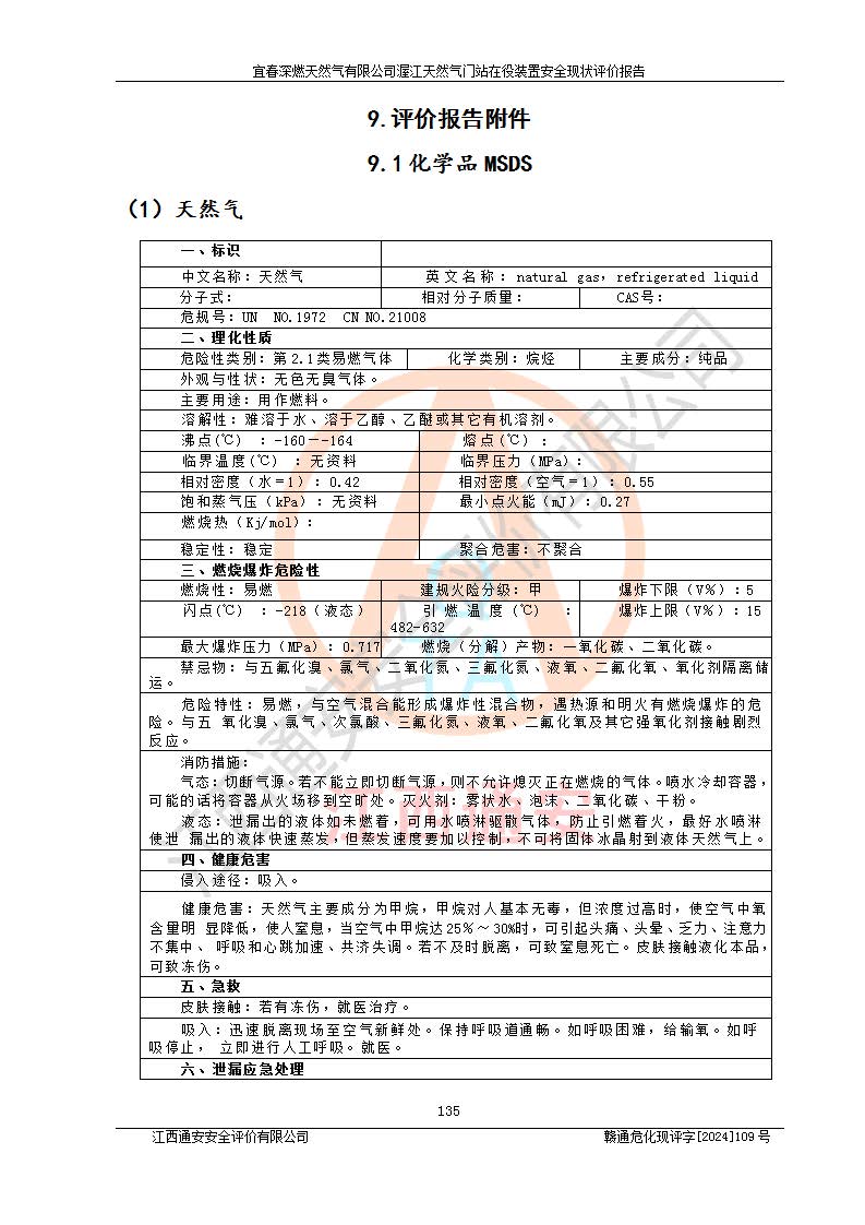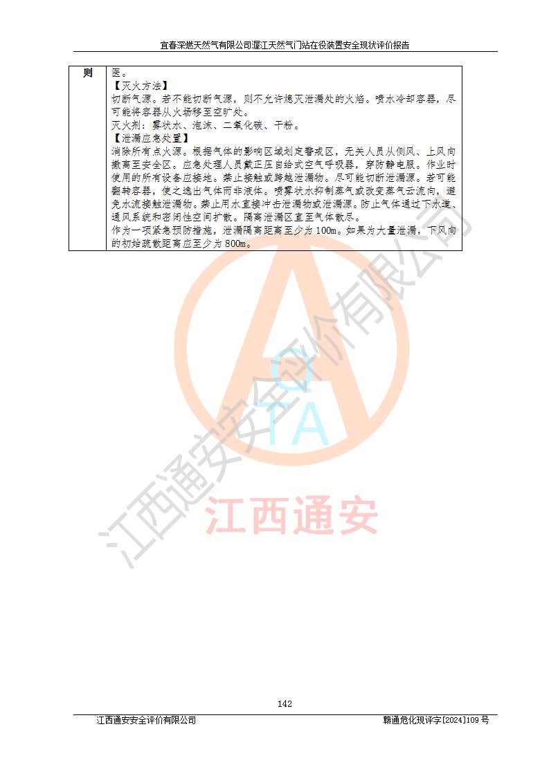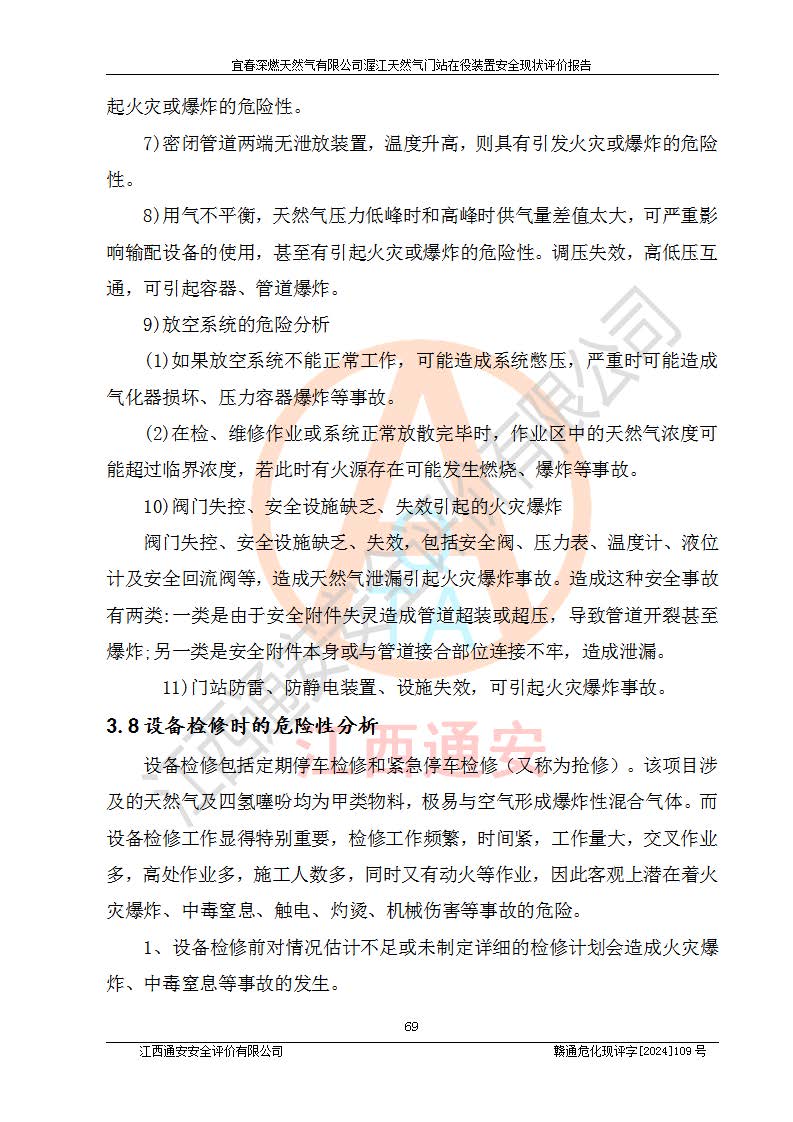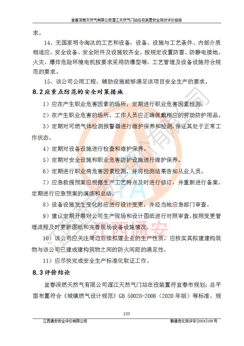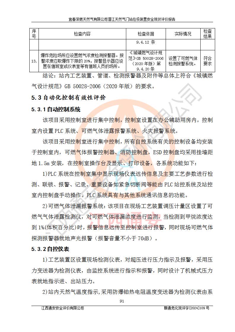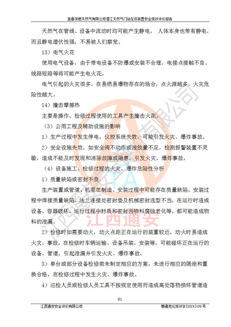 其它 | 1、依據(jù)相關(guān)法律、法規(guī)、標(biāo)準(zhǔn)等的規(guī)定,該項(xiàng)目周邊環(huán)境、總平面布置、建筑結(jié)構(gòu)、工藝及設(shè)備、防火防爆安全設(shè)施、有毒有害因素控制等符合**相關(guān)標(biāo)準(zhǔn)規(guī)范的要求,能滿足安全生產(chǎn)的要求。 2、該項(xiàng)目涉及的危險(xiǎn)化學(xué)品有:天然氣、四氫噻吩、柴油,其中天然氣屬于重點(diǎn)監(jiān)管的危險(xiǎn)化學(xué)品,不涉及特別管控危險(xiǎn)化學(xué)品。 3、該項(xiàng)目在生產(chǎn)過程中存在的主要危險(xiǎn)有:火災(zāi)爆炸、中毒窒息、容器爆炸、觸電傷害、機(jī)械傷害、高處墜落、**傷害、灼燙等。其中火災(zāi)爆炸、中毒窒息、容器爆炸是*主要的危險(xiǎn)因素。 4、該項(xiàng)目生產(chǎn)單元和儲存設(shè)施單元不構(gòu)成危險(xiǎn)化學(xué)品重大危險(xiǎn)源。 5、根據(jù)《**安全監(jiān)管總局關(guān)于公布首批重點(diǎn)監(jiān)管的危險(xiǎn)化工工藝目錄的通知》(安監(jiān)總管三〔2009〕116號)和《**安全監(jiān)管總局關(guān)于公布第二批重點(diǎn)監(jiān)管危險(xiǎn)化工工藝目錄和調(diào)整首批重點(diǎn)監(jiān)管危險(xiǎn)化工工藝中部分典型工藝的通知》(安監(jiān)總管三〔2013〕3號)進(jìn)行危險(xiǎn)工藝辨識:該項(xiàng)目不涉及重點(diǎn)監(jiān)管的危險(xiǎn)化工工藝。 6、作業(yè)條件危險(xiǎn)性分析評價(jià)結(jié)果:該項(xiàng)目的作業(yè)條件相對比較安全。在選定的2個單元中13個小項(xiàng)目里,可能出現(xiàn)“顯著危險(xiǎn)”有1個項(xiàng)目,且顯著危險(xiǎn)項(xiàng)目的出現(xiàn)均由物料的危險(xiǎn)程度所決定,而“一般危險(xiǎn)”有8個項(xiàng)目,其余項(xiàng)目均在“稍有危險(xiǎn)”范圍,作業(yè)條件相對安全。 7、危險(xiǎn)度評價(jià)結(jié)果:項(xiàng)目工藝裝置區(qū)場所危險(xiǎn)度屬Ⅱ級,中度危險(xiǎn)級別。 企業(yè)應(yīng)加強(qiáng)日常管理工作,防范于未然。生產(chǎn)區(qū)域內(nèi)應(yīng)嚴(yán)禁煙火,設(shè)置的泄漏檢測報(bào)警裝置應(yīng)定期進(jìn)行校驗(yàn)或檢定**其正常工作。不得私自關(guān)閉設(shè)置的可燃?xì)怏w檢測報(bào)警系統(tǒng)。并且應(yīng)在各作業(yè)場所為作業(yè)人員配置了勞動保護(hù)用品和器具,盡可能降低安全風(fēng)險(xiǎn)。 評價(jià)結(jié)論:本報(bào)告認(rèn)為,宜春深燃天然氣有限公司渥江天然氣門站在役裝置現(xiàn)場自動化控制系統(tǒng)運(yùn)行正常,有關(guān)從業(yè)人員資質(zhì)符合《城鎮(zhèn)燃?xì)夤芾項(xiàng)l例》(2010年11月19日中華人民共和國***令第583號公布 根據(jù)2016年2月6日《***關(guān)于修改部分行政法規(guī)的決定》修訂)及《江西省燃?xì)夤芾磙k法》(2003年8月31日江西省人民**令**23號公布 2014年1月30日江西省人民**令第210號**次修正 2019年11月27日江西省人民**令第242號第二次修正)要求,安全設(shè)施及安全管理符合**及有關(guān)部門關(guān)于安全生產(chǎn)法律、法規(guī)、標(biāo)準(zhǔn)的要求,安全風(fēng)險(xiǎn)是可以控制的,其風(fēng)險(xiǎn)程度是可以接受的,安全現(xiàn)狀符合安全生產(chǎn)條件,能夠滿足安全生產(chǎn)的要求。