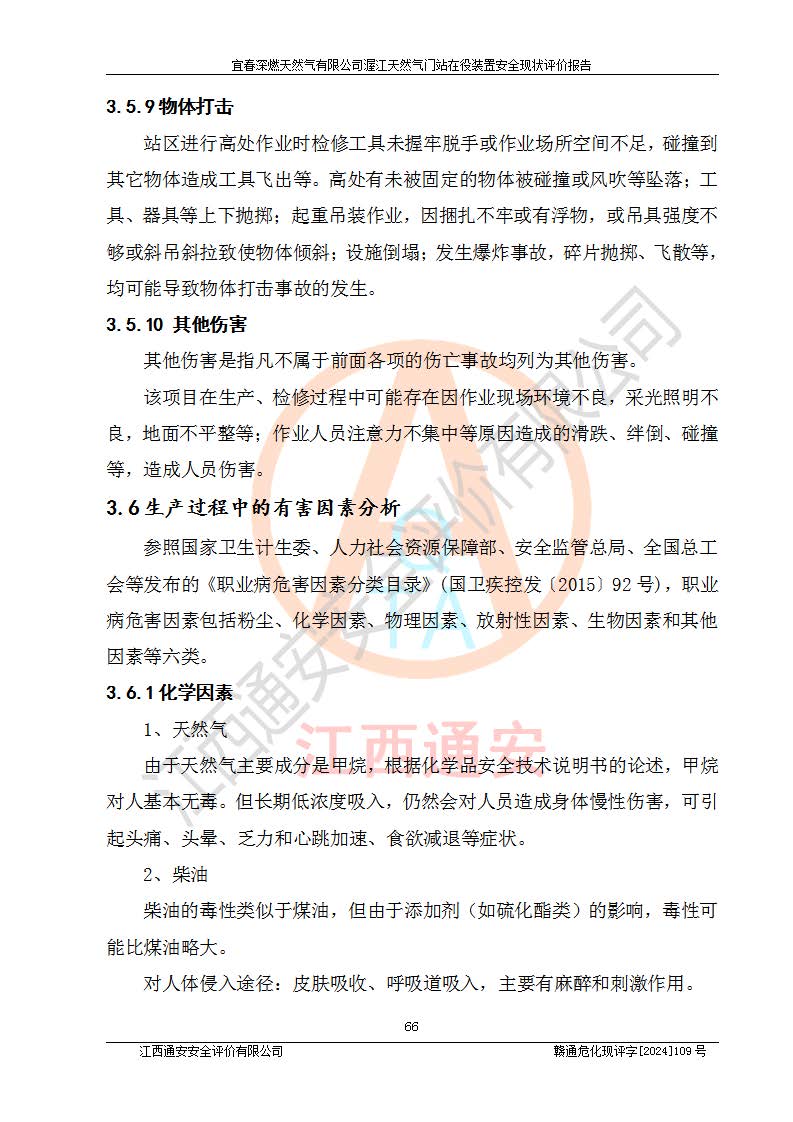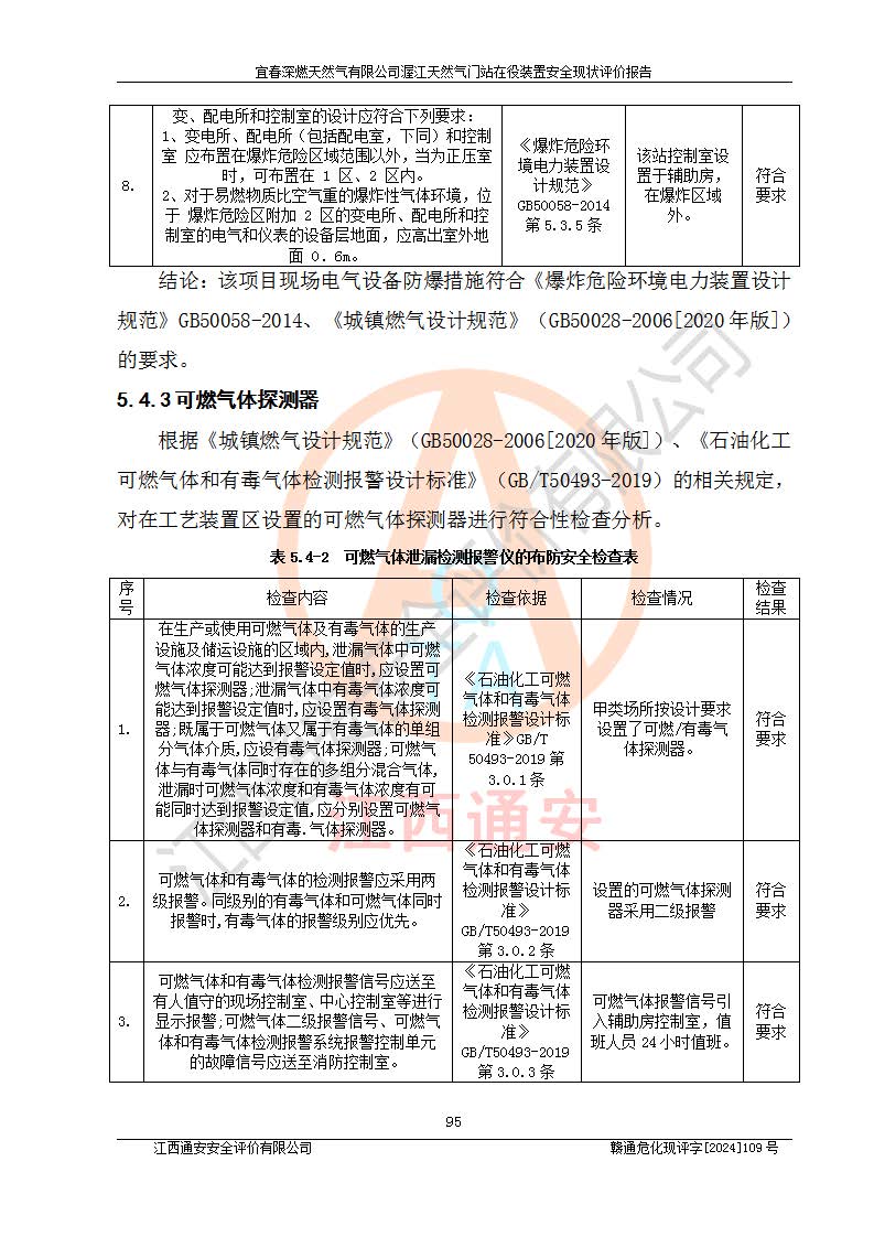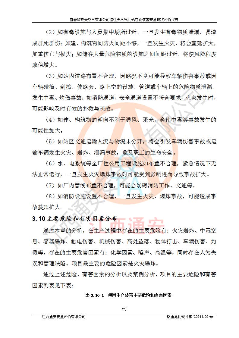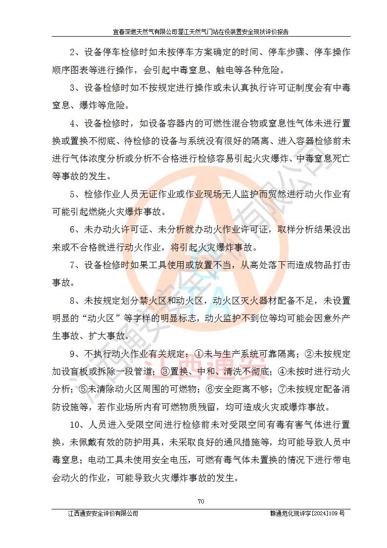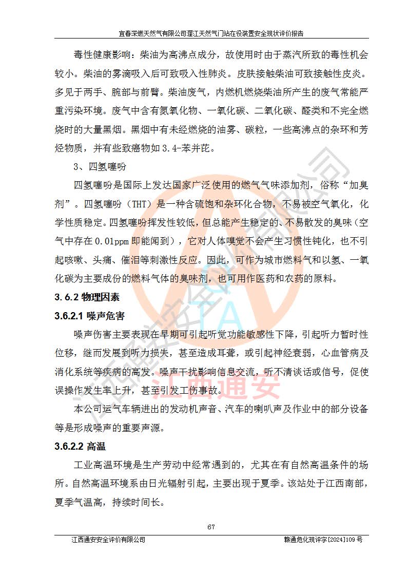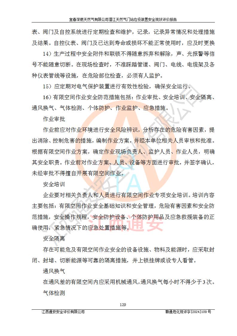 其它 | 1、依據(jù)相關(guān)法律、法規(guī)、標(biāo)準(zhǔn)等的規(guī)定,該項(xiàng)目周邊環(huán)境、總平面布置、建筑結(jié)構(gòu)、工藝及設(shè)備、防火防爆安全設(shè)施、有毒有害因素控制等符合**相關(guān)標(biāo)準(zhǔn)規(guī)范的要求,能滿足安全生產(chǎn)的要求。 2、該項(xiàng)目涉及的危險(xiǎn)化學(xué)品有:天然氣、四氫噻吩、柴油,其中天然氣屬于重點(diǎn)監(jiān)管的危險(xiǎn)化學(xué)品,不涉及特別管控危險(xiǎn)化學(xué)品。 3、該項(xiàng)目在生產(chǎn)過程中存在的主要危險(xiǎn)有:火災(zāi)爆炸、中毒窒息、容器爆炸、觸電傷害、機(jī)械傷害、高處墜落、**傷害、灼燙等。其中火災(zāi)爆炸、中毒窒息、容器爆炸是*主要的危險(xiǎn)因素。 4、該項(xiàng)目生產(chǎn)單元和儲存設(shè)施單元不構(gòu)成危險(xiǎn)化學(xué)品重大危險(xiǎn)源。 5、根據(jù)《**安全監(jiān)管總局關(guān)于公布首批重點(diǎn)監(jiān)管的危險(xiǎn)化工工藝目錄的通知》(安監(jiān)總管三〔2009〕116號)和《**安全監(jiān)管總局關(guān)于公布第二批重點(diǎn)監(jiān)管危險(xiǎn)化工工藝目錄和調(diào)整首批重點(diǎn)監(jiān)管危險(xiǎn)化工工藝中部分典型工藝的通知》(安監(jiān)總管三〔2013〕3號)進(jìn)行危險(xiǎn)工藝辨識:該項(xiàng)目不涉及重點(diǎn)監(jiān)管的危險(xiǎn)化工工藝。 6、作業(yè)條件危險(xiǎn)性分析評價(jià)結(jié)果:該項(xiàng)目的作業(yè)條件相對比較安全。在選定的2個單元中13個小項(xiàng)目里,可能出現(xiàn)“顯著危險(xiǎn)”有1個項(xiàng)目,且顯著危險(xiǎn)項(xiàng)目的出現(xiàn)均由物料的危險(xiǎn)程度所決定,而“一般危險(xiǎn)”有8個項(xiàng)目,其余項(xiàng)目均在“稍有危險(xiǎn)”范圍,作業(yè)條件相對安全。 7、危險(xiǎn)度評價(jià)結(jié)果:項(xiàng)目工藝裝置區(qū)場所危險(xiǎn)度屬Ⅱ級,中度危險(xiǎn)級別。 企業(yè)應(yīng)加強(qiáng)日常管理工作,防范于未然。生產(chǎn)區(qū)域內(nèi)應(yīng)嚴(yán)禁煙火,設(shè)置的泄漏檢測報(bào)警裝置應(yīng)定期進(jìn)行校驗(yàn)或檢定**其正常工作。不得私自關(guān)閉設(shè)置的可燃?xì)怏w檢測報(bào)警系統(tǒng)。并且應(yīng)在各作業(yè)場所為作業(yè)人員配置了勞動保護(hù)用品和器具,盡可能降低安全風(fēng)險(xiǎn)。 評價(jià)結(jié)論:本報(bào)告認(rèn)為,宜春深燃天然氣有限公司渥江天然氣門站在役裝置現(xiàn)場自動化控制系統(tǒng)運(yùn)行正常,有關(guān)從業(yè)人員資質(zhì)符合《城鎮(zhèn)燃?xì)夤芾項(xiàng)l例》(2010年11月19日中華人民共和國***令第583號公布 根據(jù)2016年2月6日《***關(guān)于修改部分行政法規(guī)的決定》修訂)及《江西省燃?xì)夤芾磙k法》(2003年8月31日江西省人民**令**23號公布 2014年1月30日江西省人民**令第210號**次修正 2019年11月27日江西省人民**令第242號第二次修正)要求,安全設(shè)施及安全管理符合**及有關(guān)部門關(guān)于安全生產(chǎn)法律、法規(guī)、標(biāo)準(zhǔn)的要求,安全風(fēng)險(xiǎn)是可以控制的,其風(fēng)險(xiǎn)程度是可以接受的,安全現(xiàn)狀符合安全生產(chǎn)條件,能夠滿足安全生產(chǎn)的要求。