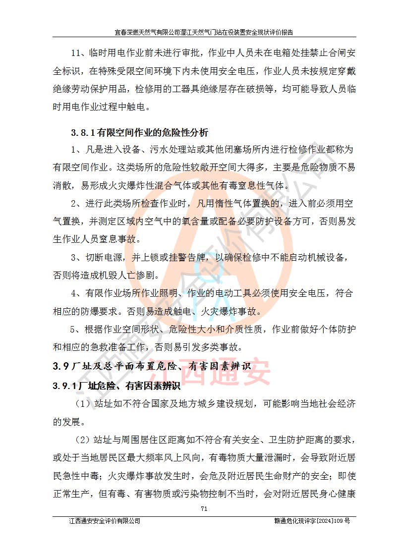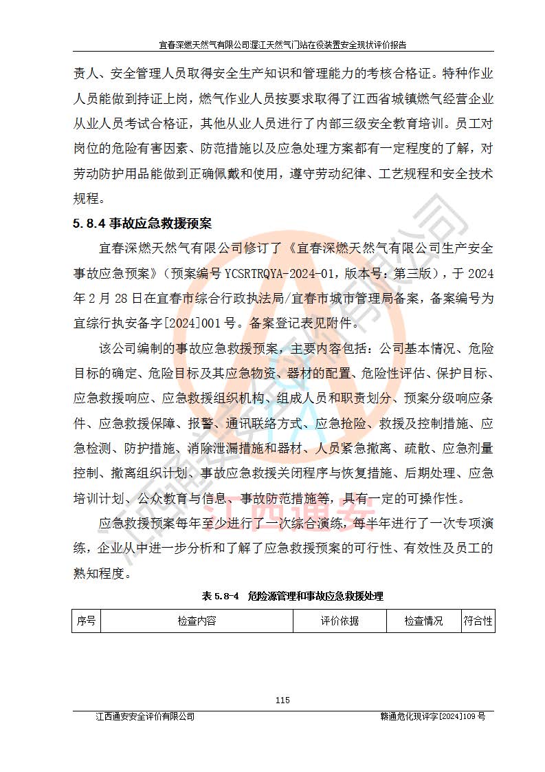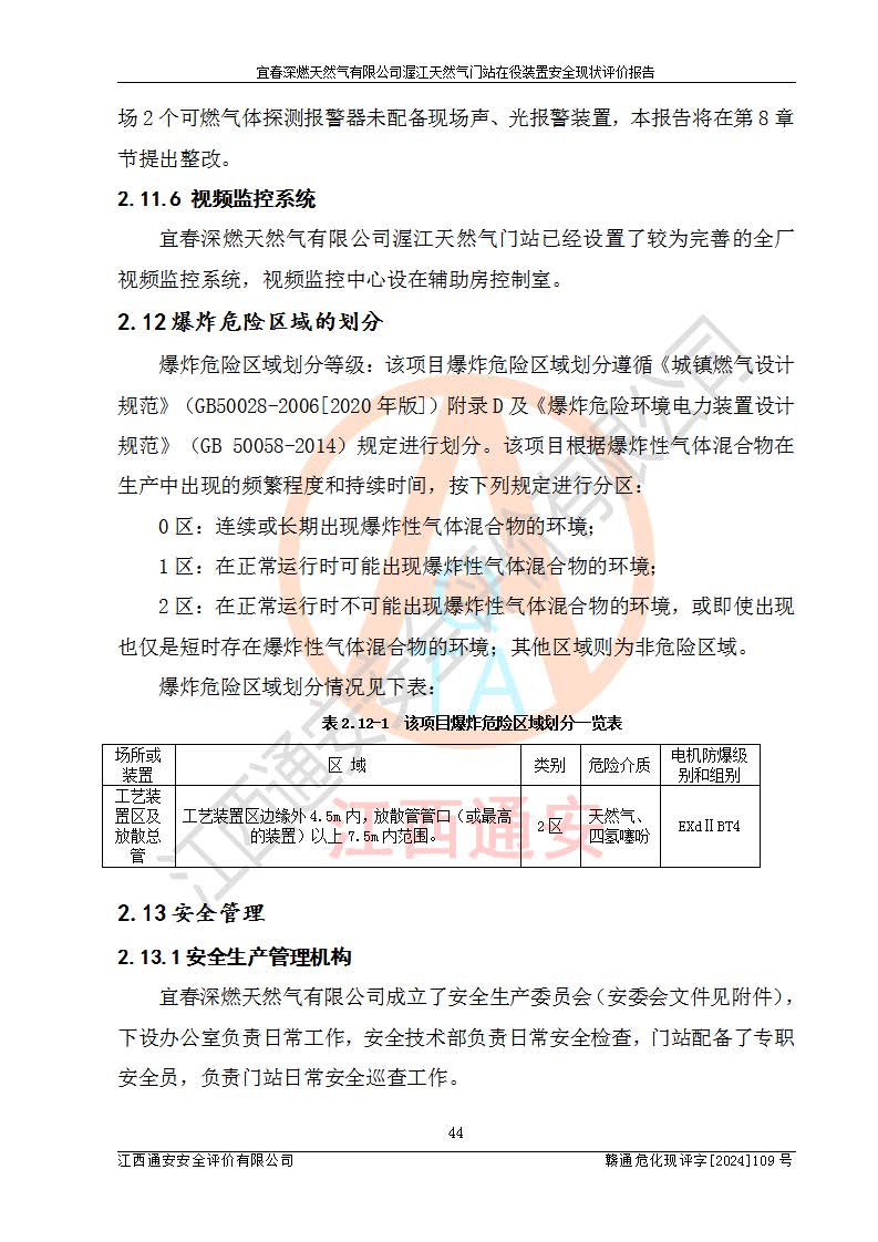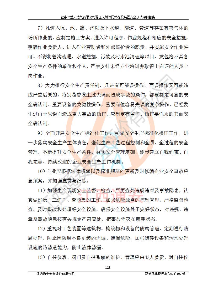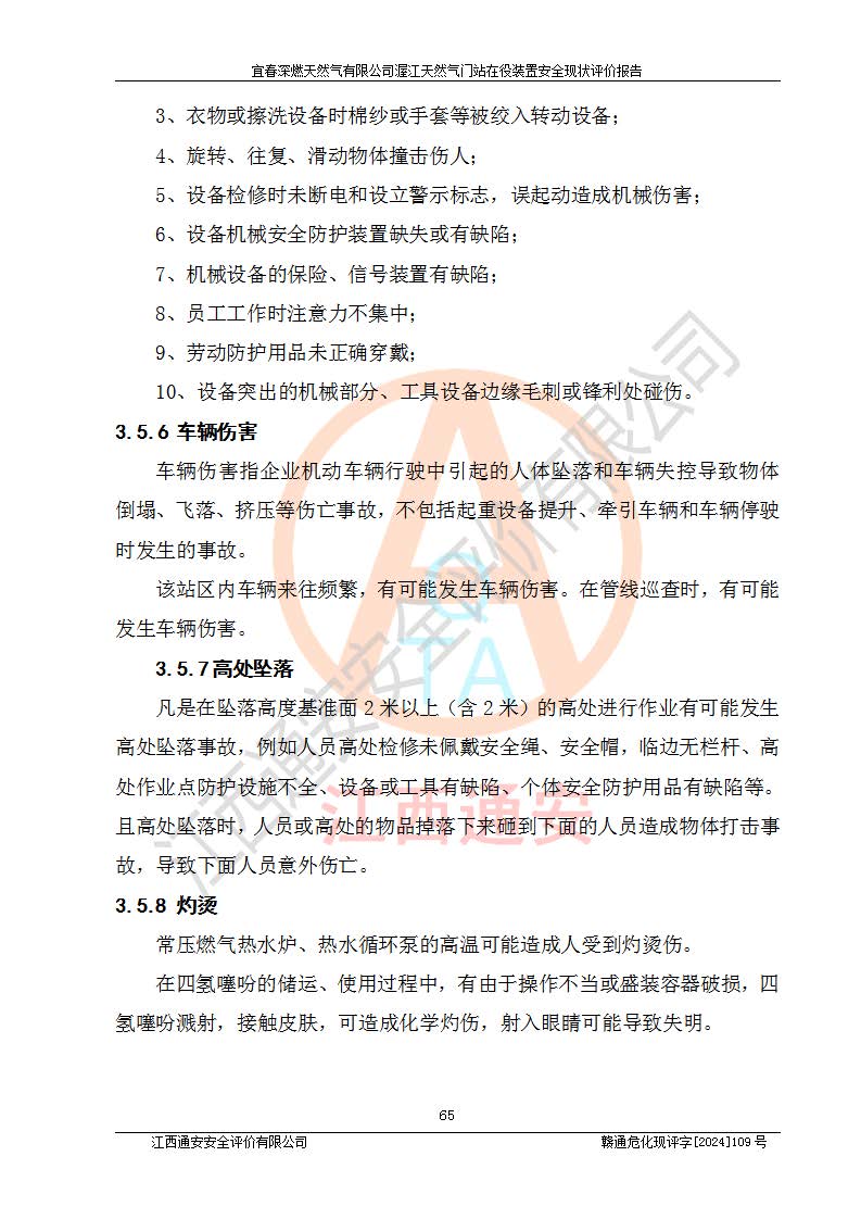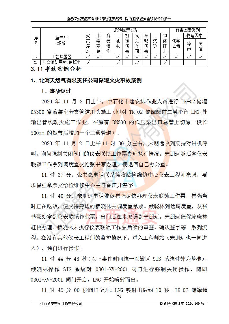 其它 | 1、依據(jù)相關(guān)法律、法規(guī)、標(biāo)準(zhǔn)等的規(guī)定,該項(xiàng)目周邊環(huán)境、總平面布置、建筑結(jié)構(gòu)、工藝及設(shè)備、防火防爆安全設(shè)施、有毒有害因素控制等符合**相關(guān)標(biāo)準(zhǔn)規(guī)范的要求,能滿足安全生產(chǎn)的要求。 2、該項(xiàng)目涉及的危險(xiǎn)化學(xué)品有:天然氣、四氫噻吩、柴油,其中天然氣屬于重點(diǎn)監(jiān)管的危險(xiǎn)化學(xué)品,不涉及特別管控危險(xiǎn)化學(xué)品。 3、該項(xiàng)目在生產(chǎn)過程中存在的主要危險(xiǎn)有:火災(zāi)爆炸、中毒窒息、容器爆炸、觸電傷害、機(jī)械傷害、高處墜落、**傷害、灼燙等。其中火災(zāi)爆炸、中毒窒息、容器爆炸是*主要的危險(xiǎn)因素。 4、該項(xiàng)目生產(chǎn)單元和儲存設(shè)施單元不構(gòu)成危險(xiǎn)化學(xué)品重大危險(xiǎn)源。 5、根據(jù)《**安全監(jiān)管總局關(guān)于公布首批重點(diǎn)監(jiān)管的危險(xiǎn)化工工藝目錄的通知》(安監(jiān)總管三〔2009〕116號)和《**安全監(jiān)管總局關(guān)于公布第二批重點(diǎn)監(jiān)管危險(xiǎn)化工工藝目錄和調(diào)整首批重點(diǎn)監(jiān)管危險(xiǎn)化工工藝中部分典型工藝的通知》(安監(jiān)總管三〔2013〕3號)進(jìn)行危險(xiǎn)工藝辨識:該項(xiàng)目不涉及重點(diǎn)監(jiān)管的危險(xiǎn)化工工藝。 6、作業(yè)條件危險(xiǎn)性分析評價(jià)結(jié)果:該項(xiàng)目的作業(yè)條件相對比較安全。在選定的2個單元中13個小項(xiàng)目里,可能出現(xiàn)“顯著危險(xiǎn)”有1個項(xiàng)目,且顯著危險(xiǎn)項(xiàng)目的出現(xiàn)均由物料的危險(xiǎn)程度所決定,而“一般危險(xiǎn)”有8個項(xiàng)目,其余項(xiàng)目均在“稍有危險(xiǎn)”范圍,作業(yè)條件相對安全。 7、危險(xiǎn)度評價(jià)結(jié)果:項(xiàng)目工藝裝置區(qū)場所危險(xiǎn)度屬Ⅱ級,中度危險(xiǎn)級別。 企業(yè)應(yīng)加強(qiáng)日常管理工作,防范于未然。生產(chǎn)區(qū)域內(nèi)應(yīng)嚴(yán)禁煙火,設(shè)置的泄漏檢測報(bào)警裝置應(yīng)定期進(jìn)行校驗(yàn)或檢定**其正常工作。不得私自關(guān)閉設(shè)置的可燃?xì)怏w檢測報(bào)警系統(tǒng)。并且應(yīng)在各作業(yè)場所為作業(yè)人員配置了勞動保護(hù)用品和器具,盡可能降低安全風(fēng)險(xiǎn)。 評價(jià)結(jié)論:本報(bào)告認(rèn)為,宜春深燃天然氣有限公司渥江天然氣門站在役裝置現(xiàn)場自動化控制系統(tǒng)運(yùn)行正常,有關(guān)從業(yè)人員資質(zhì)符合《城鎮(zhèn)燃?xì)夤芾項(xiàng)l例》(2010年11月19日中華人民共和國***令第583號公布 根據(jù)2016年2月6日《***關(guān)于修改部分行政法規(guī)的決定》修訂)及《江西省燃?xì)夤芾磙k法》(2003年8月31日江西省人民**令**23號公布 2014年1月30日江西省人民**令第210號**次修正 2019年11月27日江西省人民**令第242號第二次修正)要求,安全設(shè)施及安全管理符合**及有關(guān)部門關(guān)于安全生產(chǎn)法律、法規(guī)、標(biāo)準(zhǔn)的要求,安全風(fēng)險(xiǎn)是可以控制的,其風(fēng)險(xiǎn)程度是可以接受的,安全現(xiàn)狀符合安全生產(chǎn)條件,能夠滿足安全生產(chǎn)的要求。