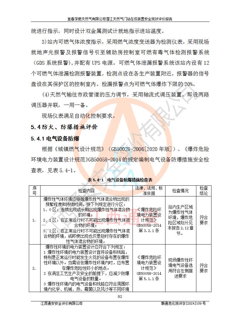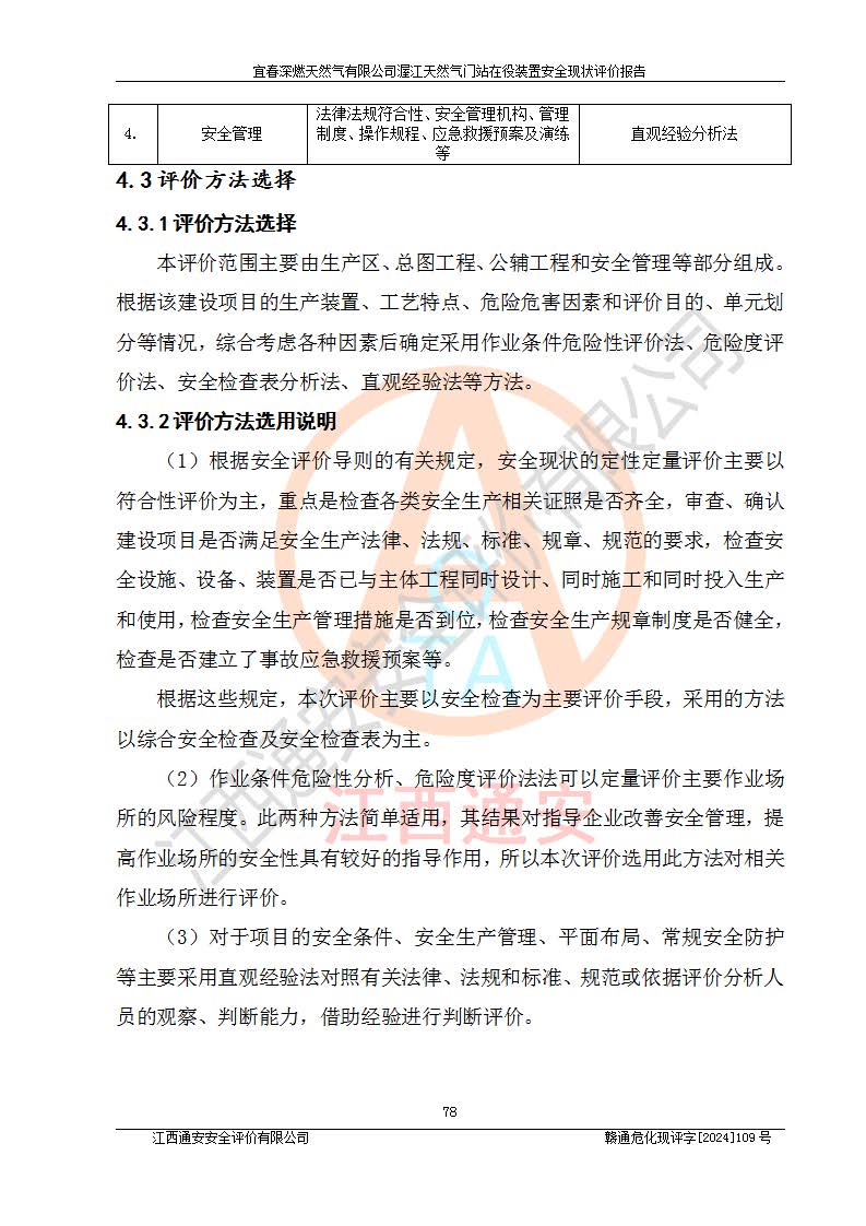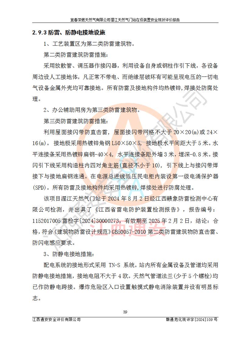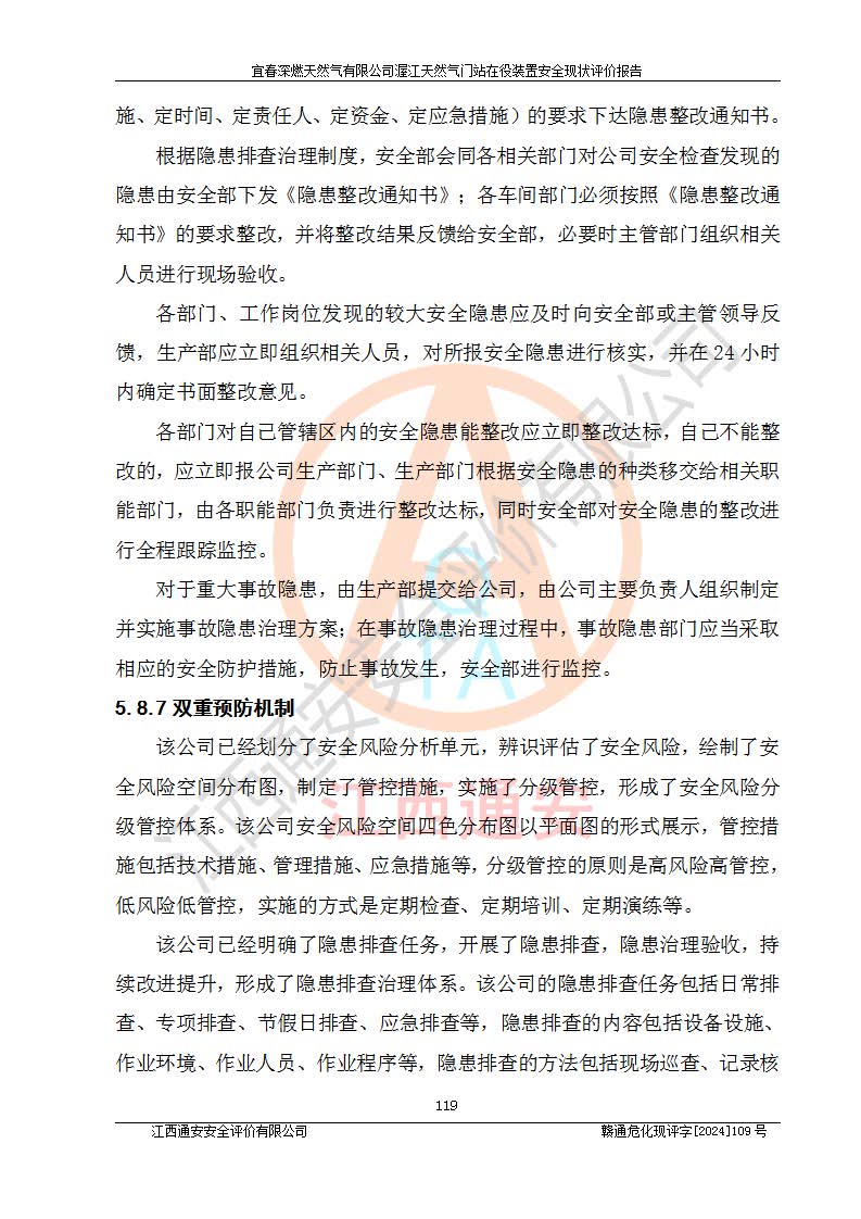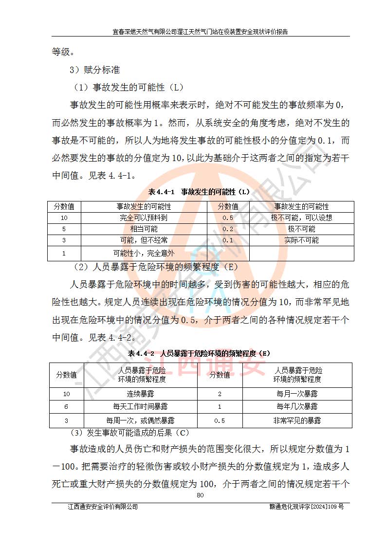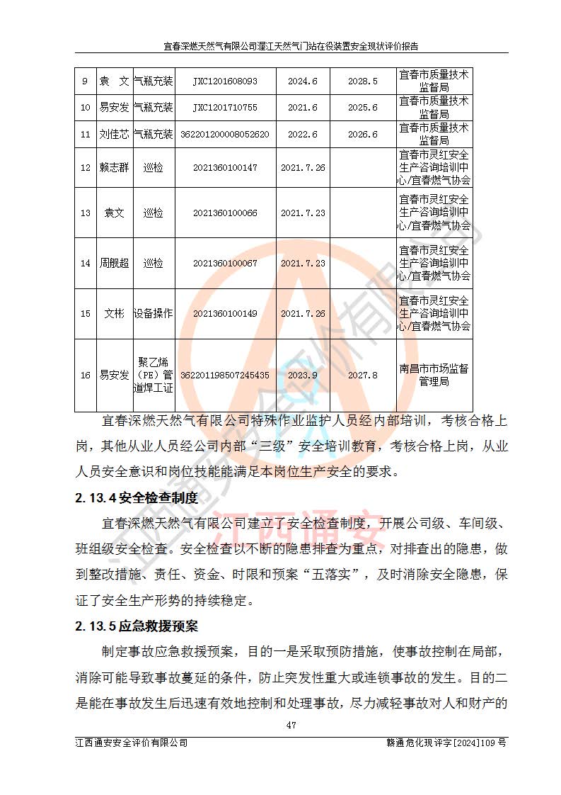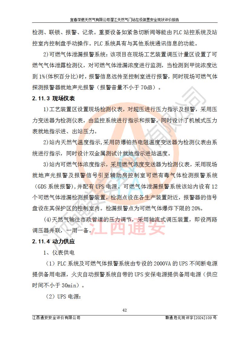 其它 | 1、依據(jù)相關(guān)法律、法規(guī)、標(biāo)準(zhǔn)等的規(guī)定,該項(xiàng)目周邊環(huán)境、總平面布置、建筑結(jié)構(gòu)、工藝及設(shè)備、防火防爆安全設(shè)施、有毒有害因素控制等符合**相關(guān)標(biāo)準(zhǔn)規(guī)范的要求,能滿足安全生產(chǎn)的要求。 2、該項(xiàng)目涉及的危險(xiǎn)化學(xué)品有:天然氣、四氫噻吩、柴油,其中天然氣屬于重點(diǎn)監(jiān)管的危險(xiǎn)化學(xué)品,不涉及特別管控危險(xiǎn)化學(xué)品。 3、該項(xiàng)目在生產(chǎn)過程中存在的主要危險(xiǎn)有:火災(zāi)爆炸、中毒窒息、容器爆炸、觸電傷害、機(jī)械傷害、高處墜落、**傷害、灼燙等。其中火災(zāi)爆炸、中毒窒息、容器爆炸是*主要的危險(xiǎn)因素。 4、該項(xiàng)目生產(chǎn)單元和儲存設(shè)施單元不構(gòu)成危險(xiǎn)化學(xué)品重大危險(xiǎn)源。 5、根據(jù)《**安全監(jiān)管總局關(guān)于公布首批重點(diǎn)監(jiān)管的危險(xiǎn)化工工藝目錄的通知》(安監(jiān)總管三〔2009〕116號)和《**安全監(jiān)管總局關(guān)于公布第二批重點(diǎn)監(jiān)管危險(xiǎn)化工工藝目錄和調(diào)整首批重點(diǎn)監(jiān)管危險(xiǎn)化工工藝中部分典型工藝的通知》(安監(jiān)總管三〔2013〕3號)進(jìn)行危險(xiǎn)工藝辨識:該項(xiàng)目不涉及重點(diǎn)監(jiān)管的危險(xiǎn)化工工藝。 6、作業(yè)條件危險(xiǎn)性分析評價(jià)結(jié)果:該項(xiàng)目的作業(yè)條件相對比較安全。在選定的2個單元中13個小項(xiàng)目里,可能出現(xiàn)“顯著危險(xiǎn)”有1個項(xiàng)目,且顯著危險(xiǎn)項(xiàng)目的出現(xiàn)均由物料的危險(xiǎn)程度所決定,而“一般危險(xiǎn)”有8個項(xiàng)目,其余項(xiàng)目均在“稍有危險(xiǎn)”范圍,作業(yè)條件相對安全。 7、危險(xiǎn)度評價(jià)結(jié)果:項(xiàng)目工藝裝置區(qū)場所危險(xiǎn)度屬Ⅱ級,中度危險(xiǎn)級別。 企業(yè)應(yīng)加強(qiáng)日常管理工作,防范于未然。生產(chǎn)區(qū)域內(nèi)應(yīng)嚴(yán)禁煙火,設(shè)置的泄漏檢測報(bào)警裝置應(yīng)定期進(jìn)行校驗(yàn)或檢定**其正常工作。不得私自關(guān)閉設(shè)置的可燃?xì)怏w檢測報(bào)警系統(tǒng)。并且應(yīng)在各作業(yè)場所為作業(yè)人員配置了勞動保護(hù)用品和器具,盡可能降低安全風(fēng)險(xiǎn)。 評價(jià)結(jié)論:本報(bào)告認(rèn)為,宜春深燃天然氣有限公司渥江天然氣門站在役裝置現(xiàn)場自動化控制系統(tǒng)運(yùn)行正常,有關(guān)從業(yè)人員資質(zhì)符合《城鎮(zhèn)燃?xì)夤芾項(xiàng)l例》(2010年11月19日中華人民共和國***令第583號公布 根據(jù)2016年2月6日《***關(guān)于修改部分行政法規(guī)的決定》修訂)及《江西省燃?xì)夤芾磙k法》(2003年8月31日江西省人民**令**23號公布 2014年1月30日江西省人民**令第210號**次修正 2019年11月27日江西省人民**令第242號第二次修正)要求,安全設(shè)施及安全管理符合**及有關(guān)部門關(guān)于安全生產(chǎn)法律、法規(guī)、標(biāo)準(zhǔn)的要求,安全風(fēng)險(xiǎn)是可以控制的,其風(fēng)險(xiǎn)程度是可以接受的,安全現(xiàn)狀符合安全生產(chǎn)條件,能夠滿足安全生產(chǎn)的要求。