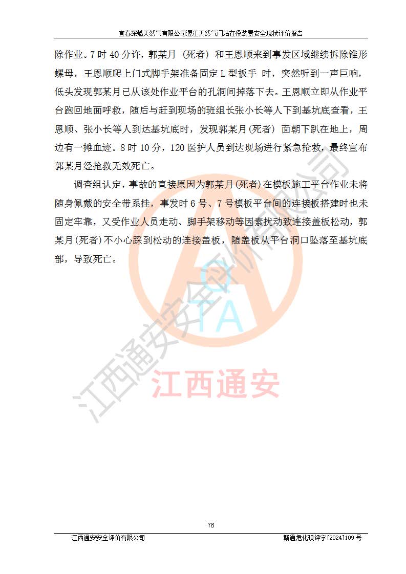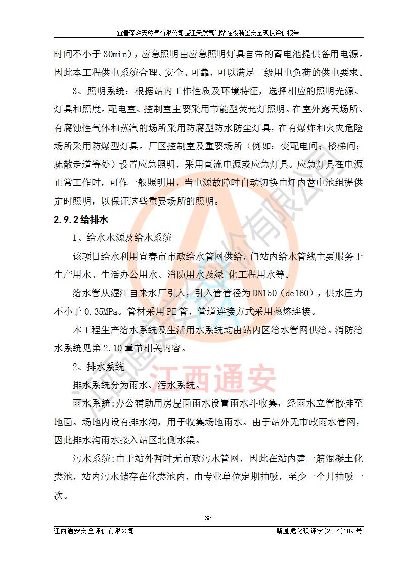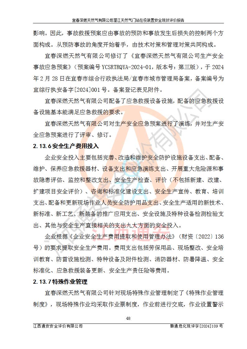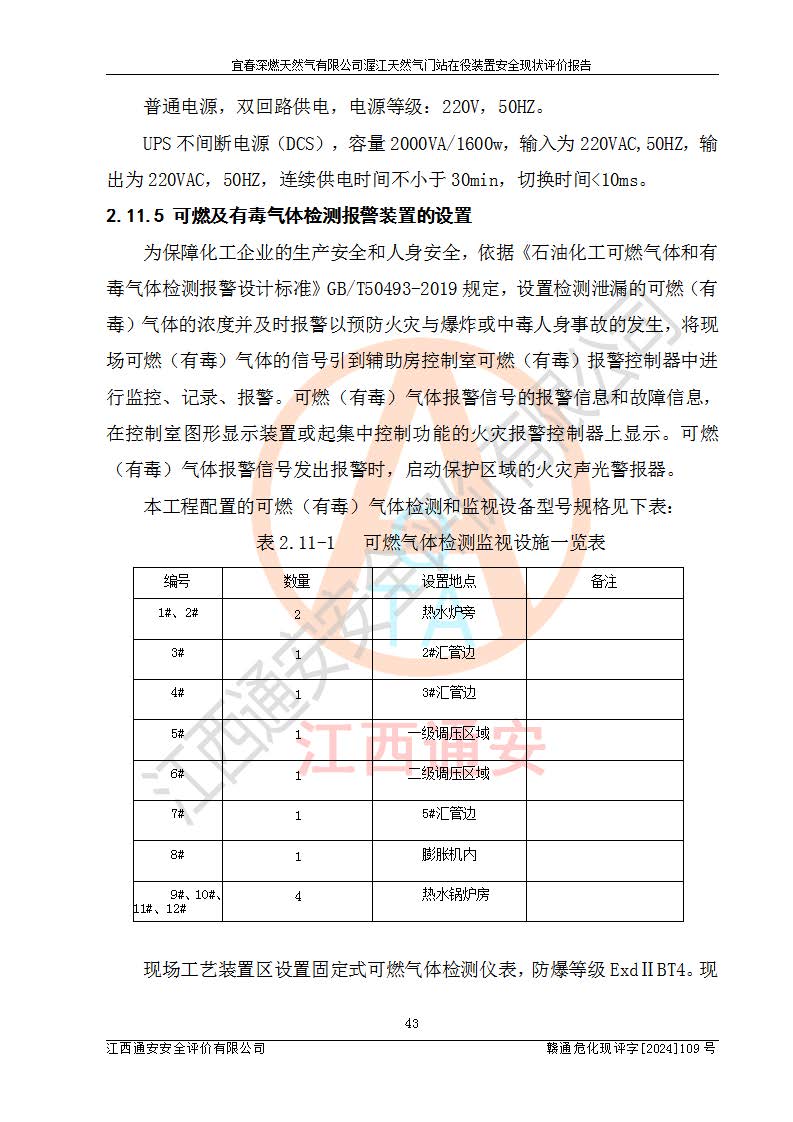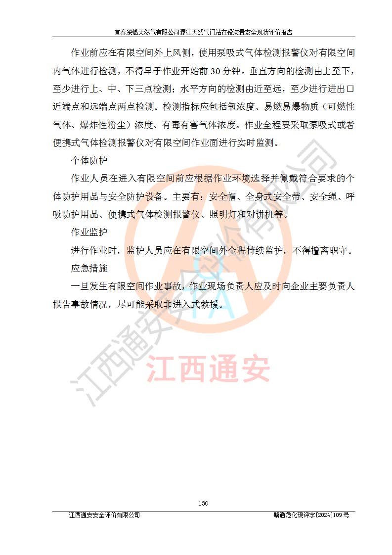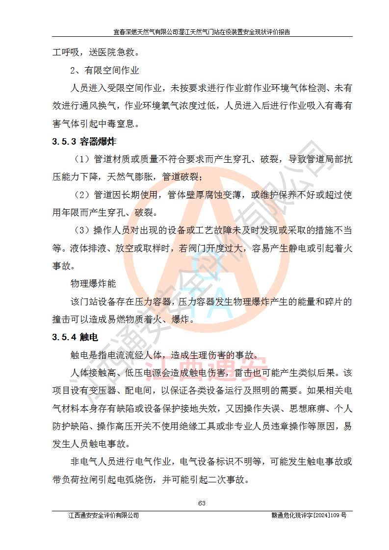 其它 | 1、依據(jù)相關(guān)法律、法規(guī)、標(biāo)準(zhǔn)等的規(guī)定,該項(xiàng)目周邊環(huán)境、總平面布置、建筑結(jié)構(gòu)、工藝及設(shè)備、防火防爆安全設(shè)施、有毒有害因素控制等符合**相關(guān)標(biāo)準(zhǔn)規(guī)范的要求,能滿足安全生產(chǎn)的要求。 2、該項(xiàng)目涉及的危險(xiǎn)化學(xué)品有:天然氣、四氫噻吩、柴油,其中天然氣屬于重點(diǎn)監(jiān)管的危險(xiǎn)化學(xué)品,不涉及特別管控危險(xiǎn)化學(xué)品。 3、該項(xiàng)目在生產(chǎn)過程中存在的主要危險(xiǎn)有:火災(zāi)爆炸、中毒窒息、容器爆炸、觸電傷害、機(jī)械傷害、高處墜落、**傷害、灼燙等。其中火災(zāi)爆炸、中毒窒息、容器爆炸是*主要的危險(xiǎn)因素。 4、該項(xiàng)目生產(chǎn)單元和儲存設(shè)施單元不構(gòu)成危險(xiǎn)化學(xué)品重大危險(xiǎn)源。 5、根據(jù)《**安全監(jiān)管總局關(guān)于公布首批重點(diǎn)監(jiān)管的危險(xiǎn)化工工藝目錄的通知》(安監(jiān)總管三〔2009〕116號)和《**安全監(jiān)管總局關(guān)于公布第二批重點(diǎn)監(jiān)管危險(xiǎn)化工工藝目錄和調(diào)整首批重點(diǎn)監(jiān)管危險(xiǎn)化工工藝中部分典型工藝的通知》(安監(jiān)總管三〔2013〕3號)進(jìn)行危險(xiǎn)工藝辨識:該項(xiàng)目不涉及重點(diǎn)監(jiān)管的危險(xiǎn)化工工藝。 6、作業(yè)條件危險(xiǎn)性分析評價(jià)結(jié)果:該項(xiàng)目的作業(yè)條件相對比較安全。在選定的2個單元中13個小項(xiàng)目里,可能出現(xiàn)“顯著危險(xiǎn)”有1個項(xiàng)目,且顯著危險(xiǎn)項(xiàng)目的出現(xiàn)均由物料的危險(xiǎn)程度所決定,而“一般危險(xiǎn)”有8個項(xiàng)目,其余項(xiàng)目均在“稍有危險(xiǎn)”范圍,作業(yè)條件相對安全。 7、危險(xiǎn)度評價(jià)結(jié)果:項(xiàng)目工藝裝置區(qū)場所危險(xiǎn)度屬Ⅱ級,中度危險(xiǎn)級別。 企業(yè)應(yīng)加強(qiáng)日常管理工作,防范于未然。生產(chǎn)區(qū)域內(nèi)應(yīng)嚴(yán)禁煙火,設(shè)置的泄漏檢測報(bào)警裝置應(yīng)定期進(jìn)行校驗(yàn)或檢定**其正常工作。不得私自關(guān)閉設(shè)置的可燃?xì)怏w檢測報(bào)警系統(tǒng)。并且應(yīng)在各作業(yè)場所為作業(yè)人員配置了勞動保護(hù)用品和器具,盡可能降低安全風(fēng)險(xiǎn)。 評價(jià)結(jié)論:本報(bào)告認(rèn)為,宜春深燃天然氣有限公司渥江天然氣門站在役裝置現(xiàn)場自動化控制系統(tǒng)運(yùn)行正常,有關(guān)從業(yè)人員資質(zhì)符合《城鎮(zhèn)燃?xì)夤芾項(xiàng)l例》(2010年11月19日中華人民共和國***令第583號公布 根據(jù)2016年2月6日《***關(guān)于修改部分行政法規(guī)的決定》修訂)及《江西省燃?xì)夤芾磙k法》(2003年8月31日江西省人民**令**23號公布 2014年1月30日江西省人民**令第210號**次修正 2019年11月27日江西省人民**令第242號第二次修正)要求,安全設(shè)施及安全管理符合**及有關(guān)部門關(guān)于安全生產(chǎn)法律、法規(guī)、標(biāo)準(zhǔn)的要求,安全風(fēng)險(xiǎn)是可以控制的,其風(fēng)險(xiǎn)程度是可以接受的,安全現(xiàn)狀符合安全生產(chǎn)條件,能夠滿足安全生產(chǎn)的要求。