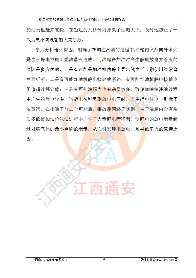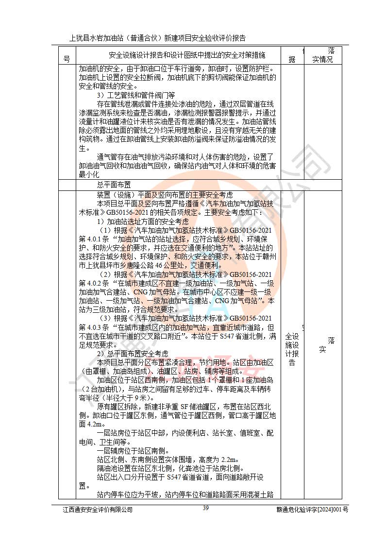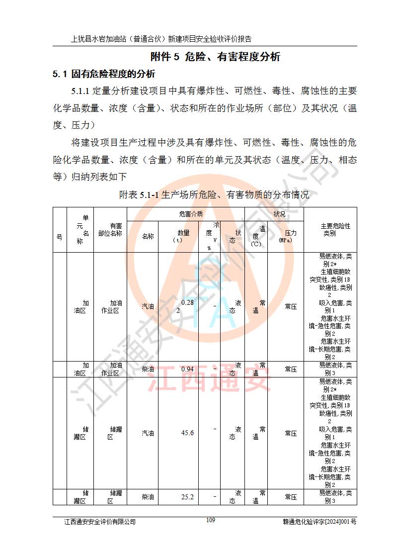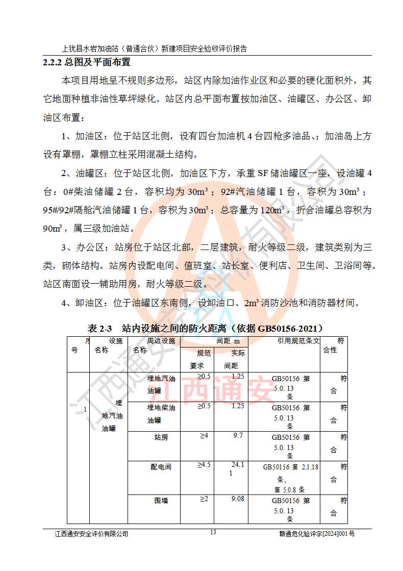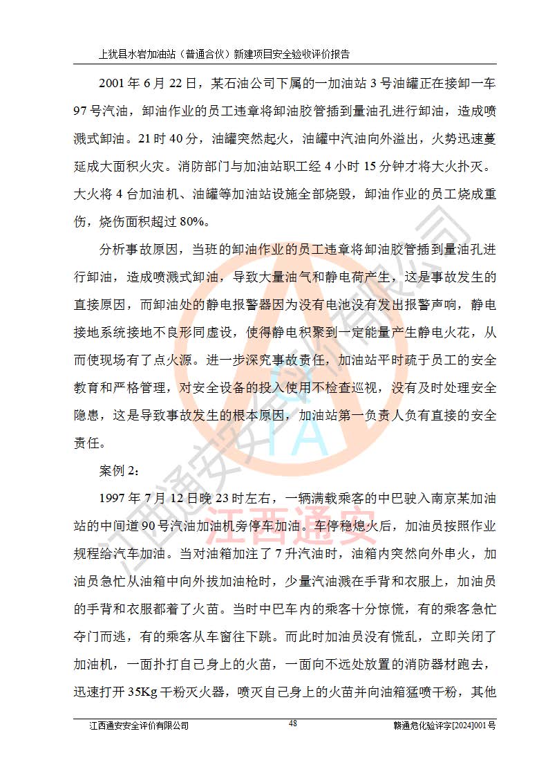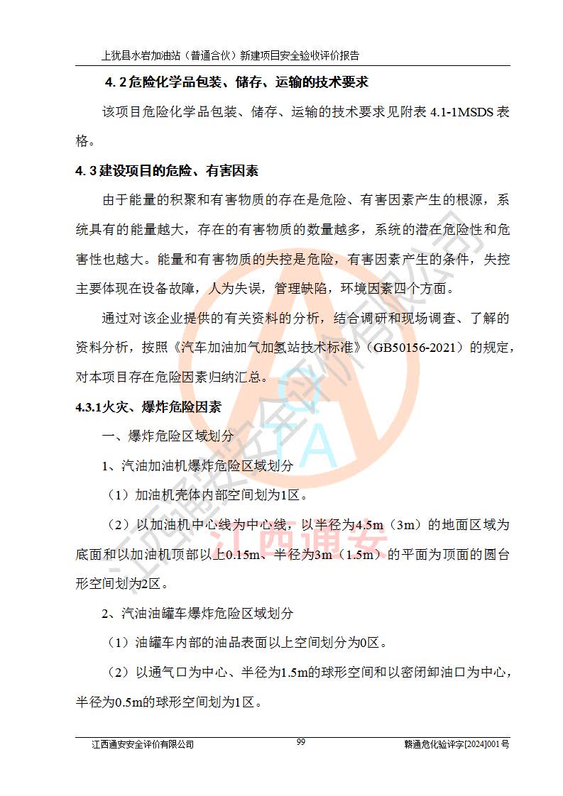項(xiàng)目簡(jiǎn)介 | 本報(bào)告為上猶縣水巖加油站(普通合伙)新建項(xiàng)目的安全驗(yàn)收評(píng)價(jià)報(bào)告。水巖加油站位于江西省贛州市上猶縣水巖鄉(xiāng)太乙村上排組。上猶縣水巖加油站(普通合伙)法定**人為王盛華,成立日期為2022年12月15日,統(tǒng)一社會(huì)信用代碼91360724MAC55LN63B。經(jīng)營(yíng)范圍包括成品油(汽油、柴油)零售。該站已取得江西省商務(wù)廳頒發(fā)的成品油零售經(jīng)營(yíng)批準(zhǔn)證書(shū)(油零售證書(shū)第贛B14-51082號(hào))登記編號(hào):贛康行審安經(jīng)(甲)字【2022】000007號(hào),于2023年4月4日取得上猶縣行政審批局出具的《江西省企業(yè)投資項(xiàng)目備案通知書(shū)》(項(xiàng)目統(tǒng)一代碼為:2302-360724-04-01-695326),由海灣工程有限公司設(shè)計(jì)。2023年5月30日已取得上猶縣行政審批局出具的安全條件審查批復(fù),2023年7月14日已取得上猶縣行政審批局出具的安全設(shè)施設(shè)計(jì)審查批復(fù)。由贛州全盛建設(shè)工程有限公司進(jìn)行施工。 該加油站有4臺(tái)自吸泵加油機(jī),儲(chǔ)罐區(qū)設(shè)置92#汽油罐30m3一具、95#/92#隔艙汽油罐30m3一具、0#柴油罐30m3兩具,總?cè)萘繛?/span>120m3折算容量為90m3,屬三級(jí)加油站。 汽油、0#柴油均為危險(xiǎn)化學(xué)品,其蒸汽與空氣形成爆炸性氣體,遇明火、高熱易燃燒爆炸;0#柴油火險(xiǎn)分級(jí)為丙A類(lèi),遇明火、高熱或與氧化劑接觸,有引起燃燒爆炸的危險(xiǎn)。其中汽油火險(xiǎn)分級(jí)為甲B類(lèi),是重點(diǎn)監(jiān)管和特別管控危險(xiǎn)化學(xué)品。因此,本項(xiàng)目存在的主要危險(xiǎn)有害因素是火災(zāi)、爆炸。 根據(jù)《中華人民共和國(guó)安全生產(chǎn)法》、《危險(xiǎn)化學(xué)品安全管理?xiàng)l例》(***第591號(hào)令)、《危險(xiǎn)化學(xué)品經(jīng)營(yíng)許可證管理辦法》安監(jiān)總局令第55號(hào)(安監(jiān)總局令第79號(hào)修正)、《危險(xiǎn)化學(xué)品建設(shè)項(xiàng)目安全監(jiān)督管理辦法》**安全生產(chǎn)監(jiān)督管理總局45號(hào)令(安監(jiān)總局令第79號(hào)修正)、《江西省危險(xiǎn)化學(xué)品建設(shè)項(xiàng)目安全監(jiān)督管理實(shí)施細(xì)則(試行)》贛應(yīng)急字【2021】100號(hào)文的要求,企業(yè)應(yīng)對(duì)項(xiàng)目進(jìn)行安全驗(yàn)收評(píng)價(jià),以判斷工程項(xiàng)目在勞動(dòng)安全衛(wèi)生方面對(duì)**及行業(yè)有關(guān)的標(biāo)準(zhǔn)和法規(guī)的符合性,并檢查相關(guān)安全配套設(shè)施“三同時(shí)”的**性。待項(xiàng)目驗(yàn)收完成后,需辦理“危險(xiǎn)化學(xué)品經(jīng)營(yíng)許可證。” 受上猶縣水巖加油站(普通合伙)的委托,江西通安安全評(píng)價(jià)有限公司承擔(dān)其項(xiàng)目安全驗(yàn)收評(píng)價(jià)工作,于2023年1月組成評(píng)價(jià)小組,對(duì)所提供的資料、文件進(jìn)行了審核,對(duì)現(xiàn)場(chǎng)進(jìn)行了實(shí)地檢測(cè),根據(jù)《安全評(píng)價(jià)通則》AQ8001-2007和《危險(xiǎn)化學(xué)品建設(shè)項(xiàng)目安全評(píng)價(jià)細(xì)則(試行)》(安監(jiān)總?;?/span>[2007]255號(hào))要求,編寫(xiě)此評(píng)價(jià)報(bào)告。 本報(bào)告依據(jù)《汽車(chē)加油加氣加氫站技術(shù)標(biāo)準(zhǔn)》(GB50156-2021)編寫(xiě)報(bào)告,特此說(shuō)明。 需要說(shuō)明的是,本安全評(píng)價(jià)報(bào)告和結(jié)論是根據(jù)評(píng)價(jià)時(shí)企業(yè)的現(xiàn)實(shí)系統(tǒng)狀況做出。評(píng)價(jià)小組的工作只對(duì)評(píng)價(jià)時(shí)企業(yè)的現(xiàn)實(shí)系統(tǒng)狀況負(fù)責(zé)。 評(píng)價(jià)小組在工作中得到了上猶縣水巖加油站(普通合伙)以及相關(guān)安全管理部門(mén)的大力支持,在此表示感謝。 | ||||