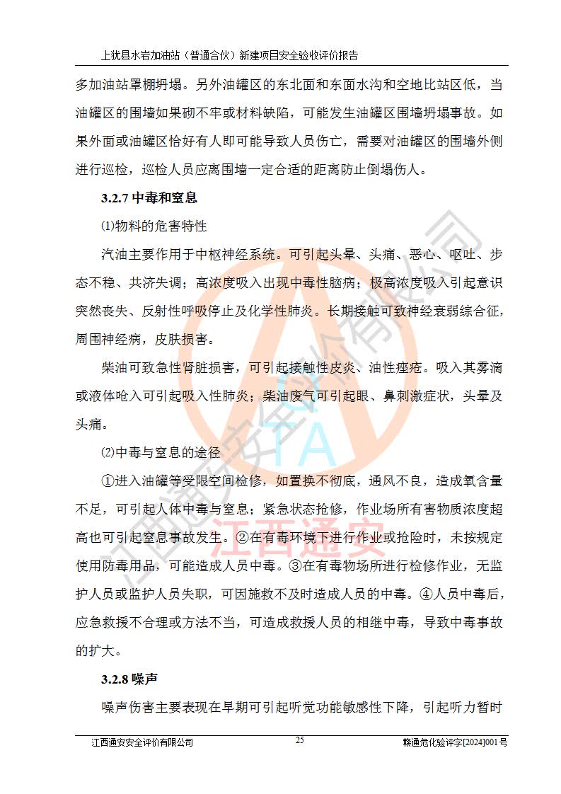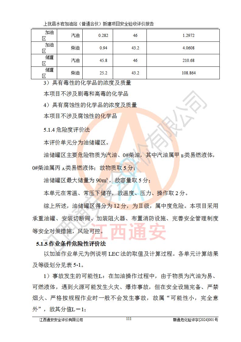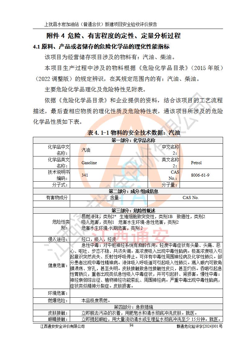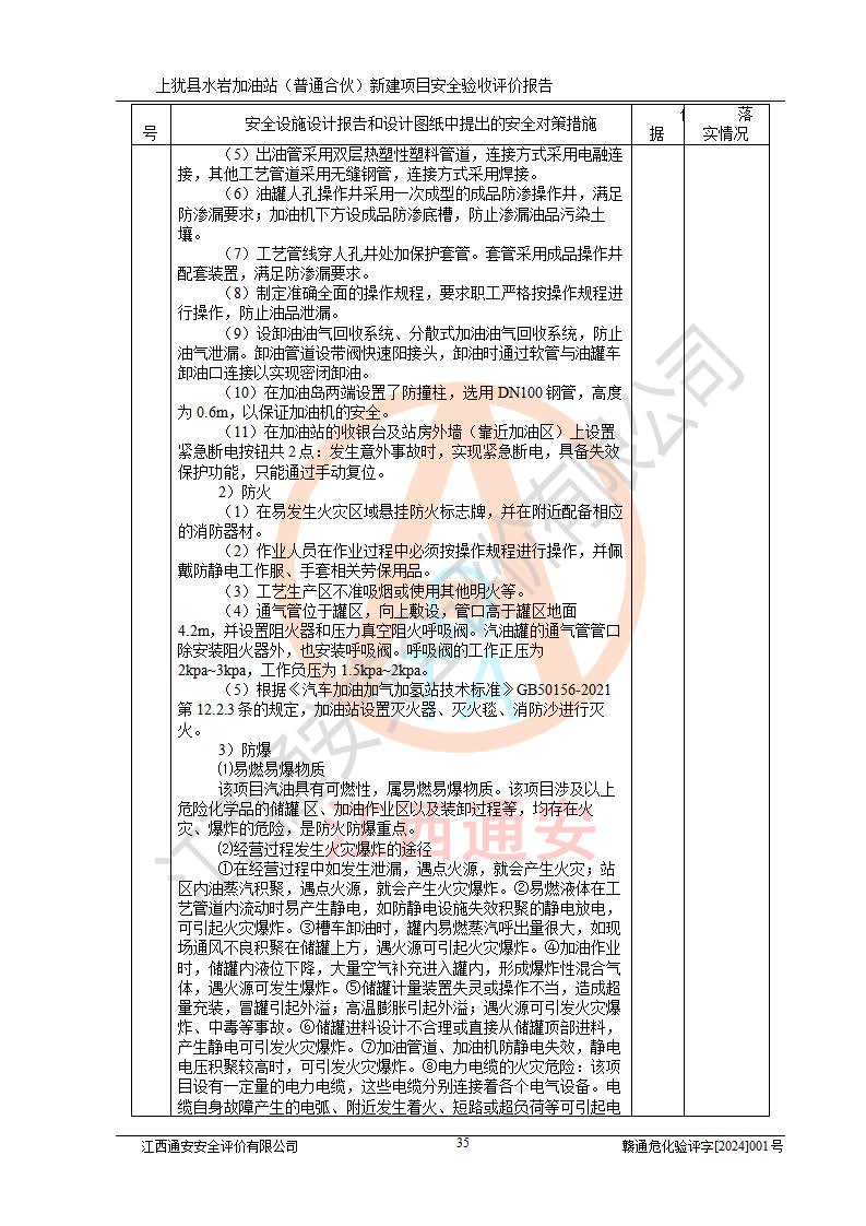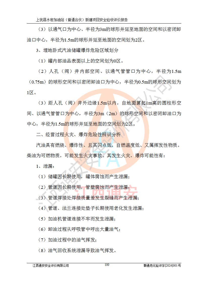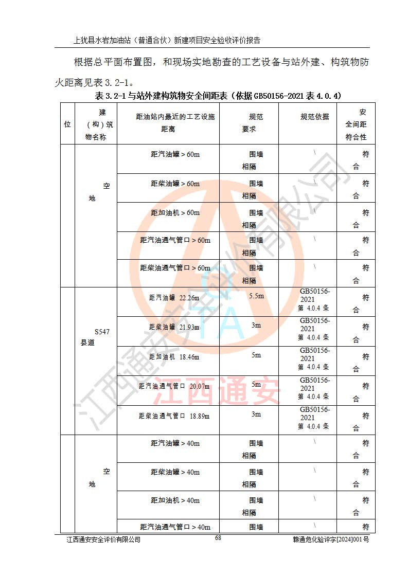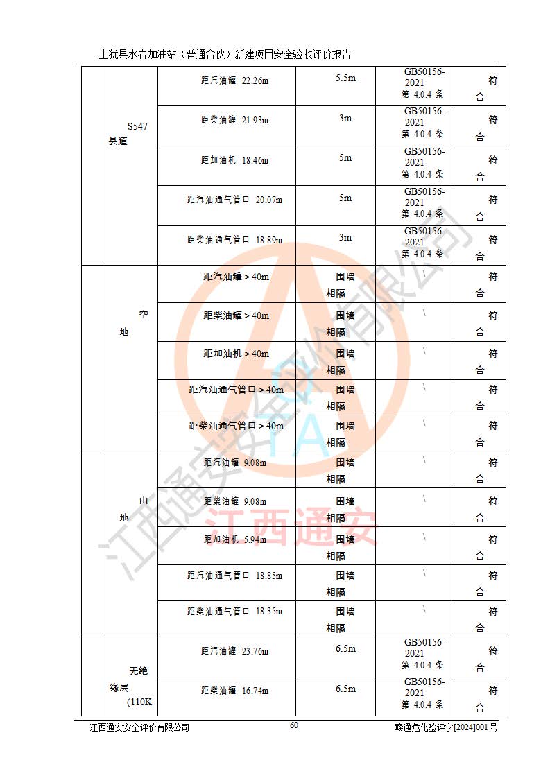 項(xiàng)目簡(jiǎn)介 | 本報(bào)告為上猶縣水巖加油站(普通合伙)新建項(xiàng)目的安全驗(yàn)收評(píng)價(jià)報(bào)告。水巖加油站位于江西省贛州市上猶縣水巖鄉(xiāng)太乙村上排組。上猶縣水巖加油站(普通合伙)法定**人為王盛華,成立日期為2022年12月15日,統(tǒng)一社會(huì)信用代碼91360724MAC55LN63B。經(jīng)營(yíng)范圍包括成品油(汽油、柴油)零售。該站已取得江西省商務(wù)廳頒發(fā)的成品油零售經(jīng)營(yíng)批準(zhǔn)證書(shū)(油零售證書(shū)第贛B14-51082號(hào))登記編號(hào):贛康行審安經(jīng)(甲)字【2022】000007號(hào),于2023年4月4日取得上猶縣行政審批局出具的《江西省企業(yè)投資項(xiàng)目備案通知書(shū)》(項(xiàng)目統(tǒng)一代碼為:2302-360724-04-01-695326),由海灣工程有限公司設(shè)計(jì)。2023年5月30日已取得上猶縣行政審批局出具的安全條件審查批復(fù),2023年7月14日已取得上猶縣行政審批局出具的安全設(shè)施設(shè)計(jì)審查批復(fù)。由贛州全盛建設(shè)工程有限公司進(jìn)行施工。 該加油站有4臺(tái)自吸泵加油機(jī),儲(chǔ)罐區(qū)設(shè)置92#汽油罐30m3一具、95#/92#隔艙汽油罐30m3一具、0#柴油罐30m3兩具,總?cè)萘繛?/span>120m3折算容量為90m3,屬三級(jí)加油站。 汽油、0#柴油均為危險(xiǎn)化學(xué)品,其蒸汽與空氣形成爆炸性氣體,遇明火、高熱易燃燒爆炸;0#柴油火險(xiǎn)分級(jí)為丙A類(lèi),遇明火、高熱或與氧化劑接觸,有引起燃燒爆炸的危險(xiǎn)。其中汽油火險(xiǎn)分級(jí)為甲B類(lèi),是重點(diǎn)監(jiān)管和特別管控危險(xiǎn)化學(xué)品。因此,本項(xiàng)目存在的主要危險(xiǎn)有害因素是火災(zāi)、爆炸。 根據(jù)《中華人民共和國(guó)安全生產(chǎn)法》、《危險(xiǎn)化學(xué)品安全管理?xiàng)l例》(***第591號(hào)令)、《危險(xiǎn)化學(xué)品經(jīng)營(yíng)許可證管理辦法》安監(jiān)總局令第55號(hào)(安監(jiān)總局令第79號(hào)修正)、《危險(xiǎn)化學(xué)品建設(shè)項(xiàng)目安全監(jiān)督管理辦法》**安全生產(chǎn)監(jiān)督管理總局45號(hào)令(安監(jiān)總局令第79號(hào)修正)、《江西省危險(xiǎn)化學(xué)品建設(shè)項(xiàng)目安全監(jiān)督管理實(shí)施細(xì)則(試行)》贛應(yīng)急字【2021】100號(hào)文的要求,企業(yè)應(yīng)對(duì)項(xiàng)目進(jìn)行安全驗(yàn)收評(píng)價(jià),以判斷工程項(xiàng)目在勞動(dòng)安全衛(wèi)生方面對(duì)**及行業(yè)有關(guān)的標(biāo)準(zhǔn)和法規(guī)的符合性,并檢查相關(guān)安全配套設(shè)施“三同時(shí)”的**性。待項(xiàng)目驗(yàn)收完成后,需辦理“危險(xiǎn)化學(xué)品經(jīng)營(yíng)許可證。” 受上猶縣水巖加油站(普通合伙)的委托,江西通安安全評(píng)價(jià)有限公司承擔(dān)其項(xiàng)目安全驗(yàn)收評(píng)價(jià)工作,于2023年1月組成評(píng)價(jià)小組,對(duì)所提供的資料、文件進(jìn)行了審核,對(duì)現(xiàn)場(chǎng)進(jìn)行了實(shí)地檢測(cè),根據(jù)《安全評(píng)價(jià)通則》AQ8001-2007和《危險(xiǎn)化學(xué)品建設(shè)項(xiàng)目安全評(píng)價(jià)細(xì)則(試行)》(安監(jiān)總?;?/span>[2007]255號(hào))要求,編寫(xiě)此評(píng)價(jià)報(bào)告。 本報(bào)告依據(jù)《汽車(chē)加油加氣加氫站技術(shù)標(biāo)準(zhǔn)》(GB50156-2021)編寫(xiě)報(bào)告,特此說(shuō)明。 需要說(shuō)明的是,本安全評(píng)價(jià)報(bào)告和結(jié)論是根據(jù)評(píng)價(jià)時(shí)企業(yè)的現(xiàn)實(shí)系統(tǒng)狀況做出。評(píng)價(jià)小組的工作只對(duì)評(píng)價(jià)時(shí)企業(yè)的現(xiàn)實(shí)系統(tǒng)狀況負(fù)責(zé)。 評(píng)價(jià)小組在工作中得到了上猶縣水巖加油站(普通合伙)以及相關(guān)安全管理部門(mén)的大力支持,在此表示感謝。 | ||||