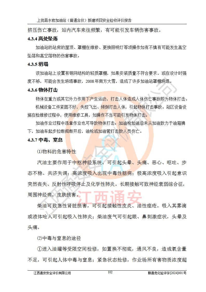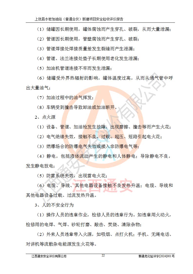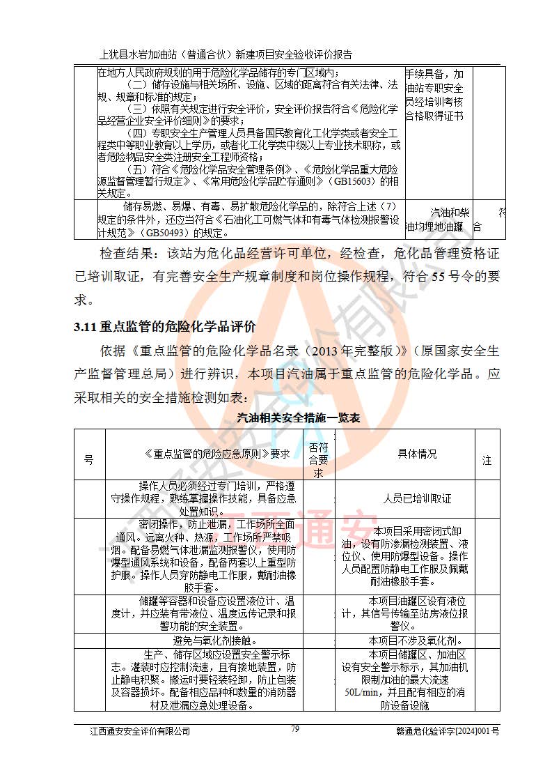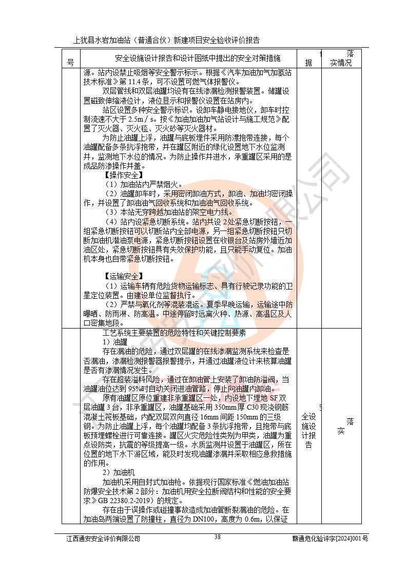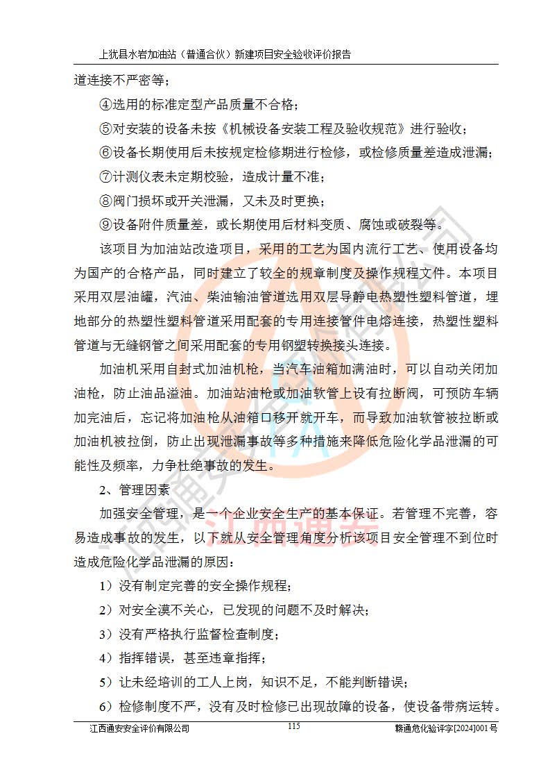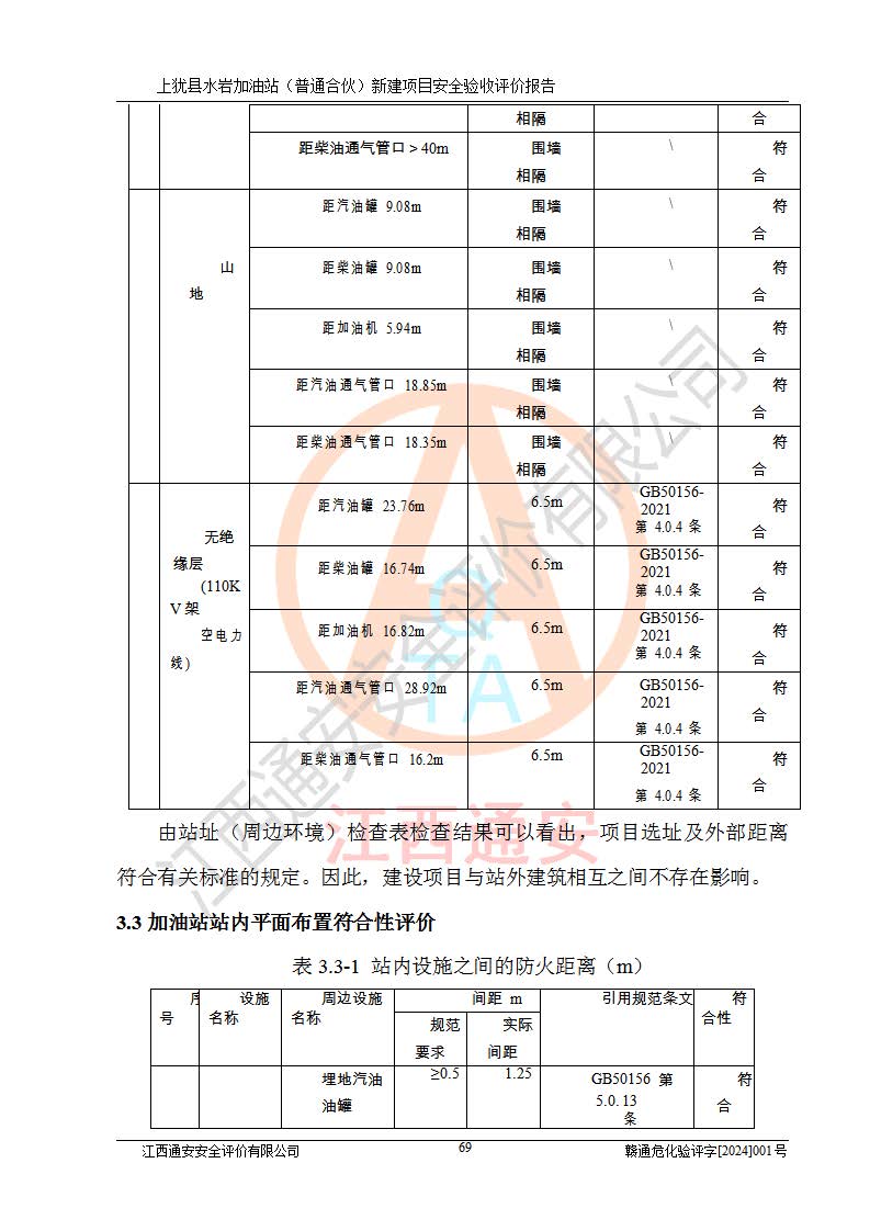 項(xiàng)目簡(jiǎn)介 | 本報(bào)告為上猶縣水巖加油站(普通合伙)新建項(xiàng)目的安全驗(yàn)收評(píng)價(jià)報(bào)告。水巖加油站位于江西省贛州市上猶縣水巖鄉(xiāng)太乙村上排組。上猶縣水巖加油站(普通合伙)法定**人為王盛華,成立日期為2022年12月15日,統(tǒng)一社會(huì)信用代碼91360724MAC55LN63B。經(jīng)營(yíng)范圍包括成品油(汽油、柴油)零售。該站已取得江西省商務(wù)廳頒發(fā)的成品油零售經(jīng)營(yíng)批準(zhǔn)證書(shū)(油零售證書(shū)第贛B14-51082號(hào))登記編號(hào):贛康行審安經(jīng)(甲)字【2022】000007號(hào),于2023年4月4日取得上猶縣行政審批局出具的《江西省企業(yè)投資項(xiàng)目備案通知書(shū)》(項(xiàng)目統(tǒng)一代碼為:2302-360724-04-01-695326),由海灣工程有限公司設(shè)計(jì)。2023年5月30日已取得上猶縣行政審批局出具的安全條件審查批復(fù),2023年7月14日已取得上猶縣行政審批局出具的安全設(shè)施設(shè)計(jì)審查批復(fù)。由贛州全盛建設(shè)工程有限公司進(jìn)行施工。 該加油站有4臺(tái)自吸泵加油機(jī),儲(chǔ)罐區(qū)設(shè)置92#汽油罐30m3一具、95#/92#隔艙汽油罐30m3一具、0#柴油罐30m3兩具,總?cè)萘繛?/span>120m3折算容量為90m3,屬三級(jí)加油站。 汽油、0#柴油均為危險(xiǎn)化學(xué)品,其蒸汽與空氣形成爆炸性氣體,遇明火、高熱易燃燒爆炸;0#柴油火險(xiǎn)分級(jí)為丙A類(lèi),遇明火、高熱或與氧化劑接觸,有引起燃燒爆炸的危險(xiǎn)。其中汽油火險(xiǎn)分級(jí)為甲B類(lèi),是重點(diǎn)監(jiān)管和特別管控危險(xiǎn)化學(xué)品。因此,本項(xiàng)目存在的主要危險(xiǎn)有害因素是火災(zāi)、爆炸。 根據(jù)《中華人民共和國(guó)安全生產(chǎn)法》、《危險(xiǎn)化學(xué)品安全管理?xiàng)l例》(***第591號(hào)令)、《危險(xiǎn)化學(xué)品經(jīng)營(yíng)許可證管理辦法》安監(jiān)總局令第55號(hào)(安監(jiān)總局令第79號(hào)修正)、《危險(xiǎn)化學(xué)品建設(shè)項(xiàng)目安全監(jiān)督管理辦法》**安全生產(chǎn)監(jiān)督管理總局45號(hào)令(安監(jiān)總局令第79號(hào)修正)、《江西省危險(xiǎn)化學(xué)品建設(shè)項(xiàng)目安全監(jiān)督管理實(shí)施細(xì)則(試行)》贛應(yīng)急字【2021】100號(hào)文的要求,企業(yè)應(yīng)對(duì)項(xiàng)目進(jìn)行安全驗(yàn)收評(píng)價(jià),以判斷工程項(xiàng)目在勞動(dòng)安全衛(wèi)生方面對(duì)**及行業(yè)有關(guān)的標(biāo)準(zhǔn)和法規(guī)的符合性,并檢查相關(guān)安全配套設(shè)施“三同時(shí)”的**性。待項(xiàng)目驗(yàn)收完成后,需辦理“危險(xiǎn)化學(xué)品經(jīng)營(yíng)許可證。” 受上猶縣水巖加油站(普通合伙)的委托,江西通安安全評(píng)價(jià)有限公司承擔(dān)其項(xiàng)目安全驗(yàn)收評(píng)價(jià)工作,于2023年1月組成評(píng)價(jià)小組,對(duì)所提供的資料、文件進(jìn)行了審核,對(duì)現(xiàn)場(chǎng)進(jìn)行了實(shí)地檢測(cè),根據(jù)《安全評(píng)價(jià)通則》AQ8001-2007和《危險(xiǎn)化學(xué)品建設(shè)項(xiàng)目安全評(píng)價(jià)細(xì)則(試行)》(安監(jiān)總?;?/span>[2007]255號(hào))要求,編寫(xiě)此評(píng)價(jià)報(bào)告。 本報(bào)告依據(jù)《汽車(chē)加油加氣加氫站技術(shù)標(biāo)準(zhǔn)》(GB50156-2021)編寫(xiě)報(bào)告,特此說(shuō)明。 需要說(shuō)明的是,本安全評(píng)價(jià)報(bào)告和結(jié)論是根據(jù)評(píng)價(jià)時(shí)企業(yè)的現(xiàn)實(shí)系統(tǒng)狀況做出。評(píng)價(jià)小組的工作只對(duì)評(píng)價(jià)時(shí)企業(yè)的現(xiàn)實(shí)系統(tǒng)狀況負(fù)責(zé)。 評(píng)價(jià)小組在工作中得到了上猶縣水巖加油站(普通合伙)以及相關(guān)安全管理部門(mén)的大力支持,在此表示感謝。 | ||||