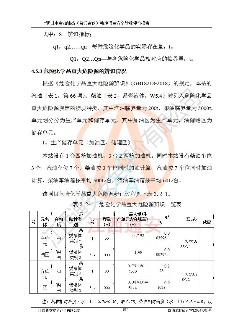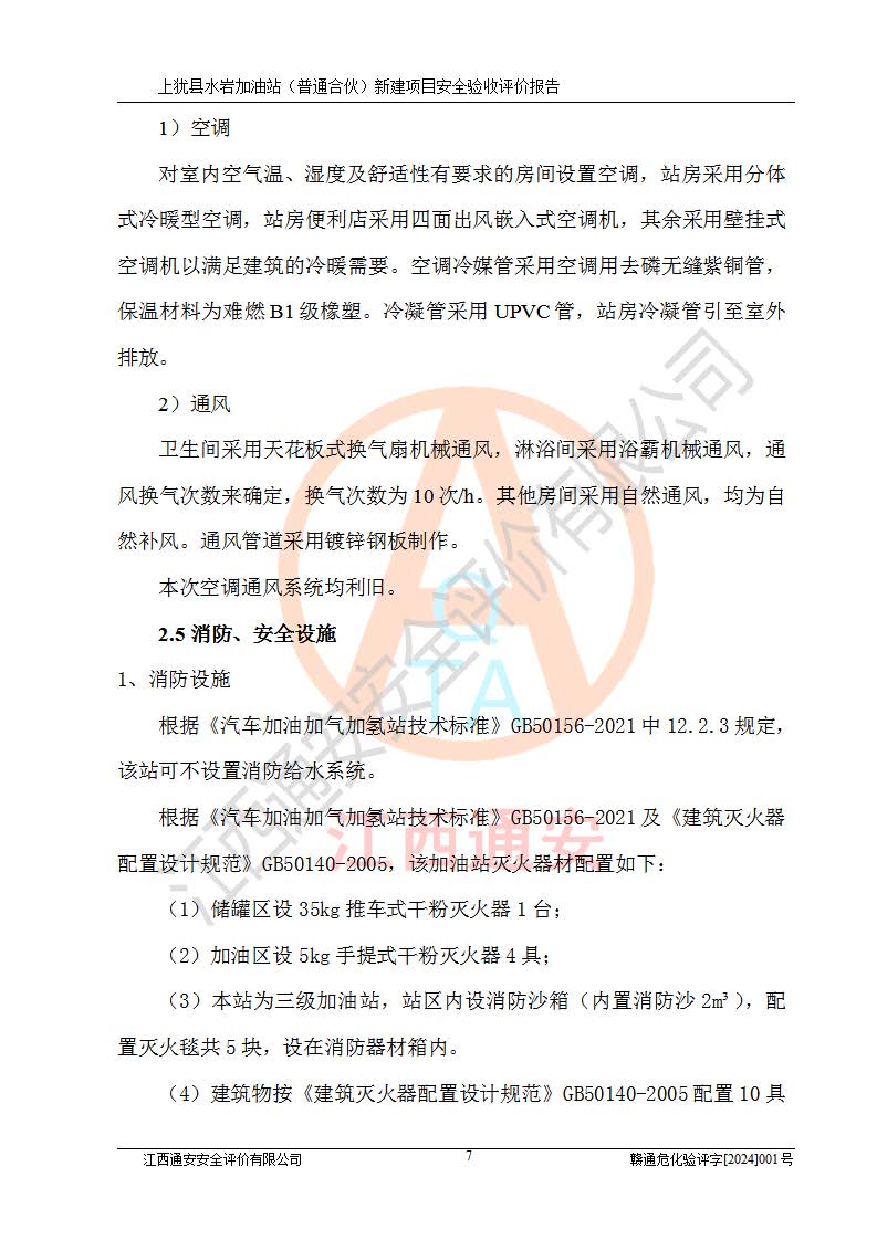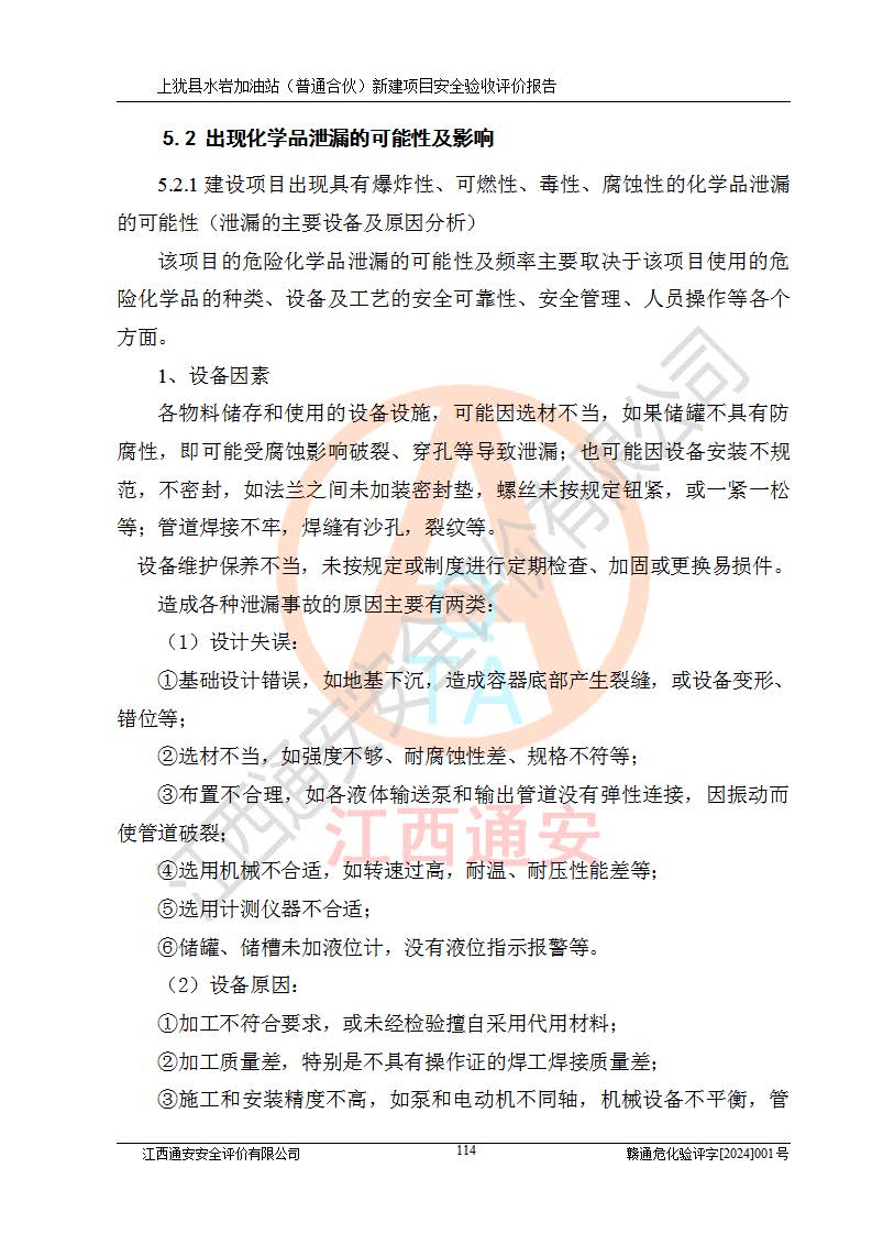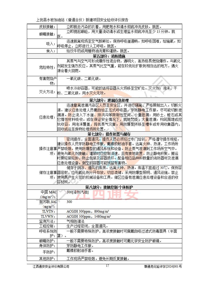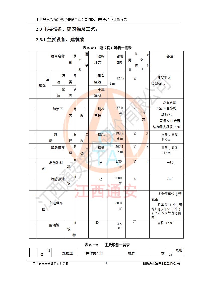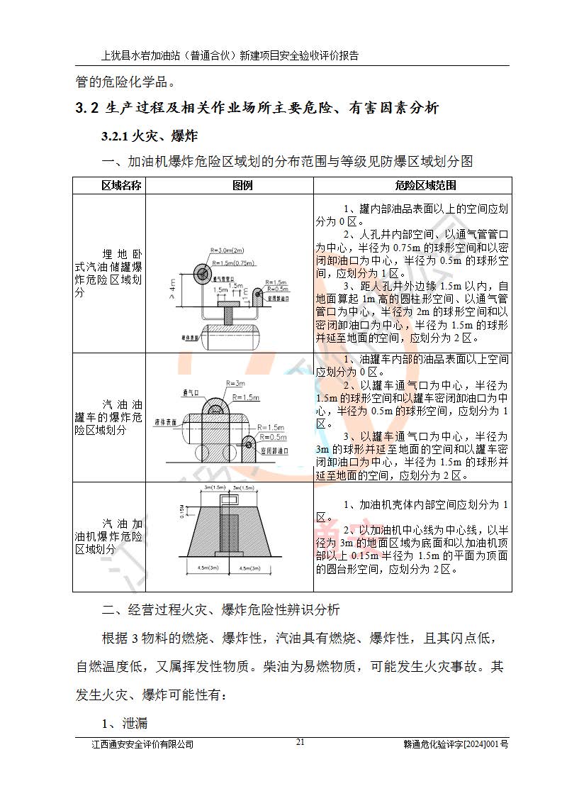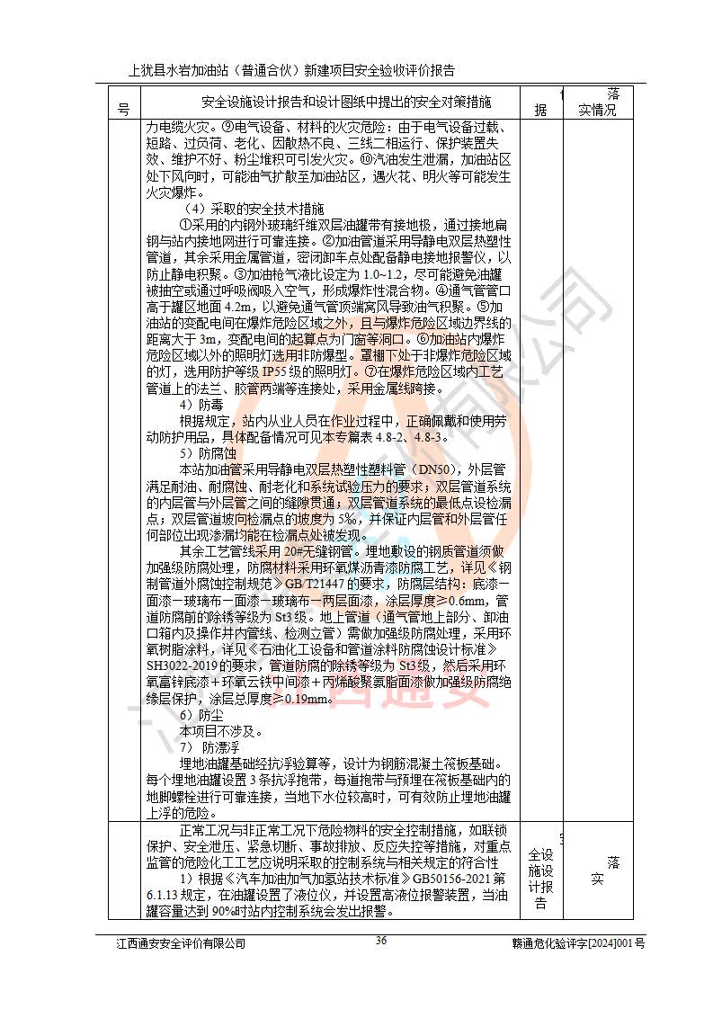 項(xiàng)目簡(jiǎn)介 | 本報(bào)告為上猶縣水巖加油站(普通合伙)新建項(xiàng)目的安全驗(yàn)收評(píng)價(jià)報(bào)告。水巖加油站位于江西省贛州市上猶縣水巖鄉(xiāng)太乙村上排組。上猶縣水巖加油站(普通合伙)法定**人為王盛華,成立日期為2022年12月15日,統(tǒng)一社會(huì)信用代碼91360724MAC55LN63B。經(jīng)營(yíng)范圍包括成品油(汽油、柴油)零售。該站已取得江西省商務(wù)廳頒發(fā)的成品油零售經(jīng)營(yíng)批準(zhǔn)證書(shū)(油零售證書(shū)第贛B14-51082號(hào))登記編號(hào):贛康行審安經(jīng)(甲)字【2022】000007號(hào),于2023年4月4日取得上猶縣行政審批局出具的《江西省企業(yè)投資項(xiàng)目備案通知書(shū)》(項(xiàng)目統(tǒng)一代碼為:2302-360724-04-01-695326),由海灣工程有限公司設(shè)計(jì)。2023年5月30日已取得上猶縣行政審批局出具的安全條件審查批復(fù),2023年7月14日已取得上猶縣行政審批局出具的安全設(shè)施設(shè)計(jì)審查批復(fù)。由贛州全盛建設(shè)工程有限公司進(jìn)行施工。 該加油站有4臺(tái)自吸泵加油機(jī),儲(chǔ)罐區(qū)設(shè)置92#汽油罐30m3一具、95#/92#隔艙汽油罐30m3一具、0#柴油罐30m3兩具,總?cè)萘繛?/span>120m3折算容量為90m3,屬三級(jí)加油站。 汽油、0#柴油均為危險(xiǎn)化學(xué)品,其蒸汽與空氣形成爆炸性氣體,遇明火、高熱易燃燒爆炸;0#柴油火險(xiǎn)分級(jí)為丙A類(lèi),遇明火、高熱或與氧化劑接觸,有引起燃燒爆炸的危險(xiǎn)。其中汽油火險(xiǎn)分級(jí)為甲B類(lèi),是重點(diǎn)監(jiān)管和特別管控危險(xiǎn)化學(xué)品。因此,本項(xiàng)目存在的主要危險(xiǎn)有害因素是火災(zāi)、爆炸。 根據(jù)《中華人民共和國(guó)安全生產(chǎn)法》、《危險(xiǎn)化學(xué)品安全管理?xiàng)l例》(***第591號(hào)令)、《危險(xiǎn)化學(xué)品經(jīng)營(yíng)許可證管理辦法》安監(jiān)總局令第55號(hào)(安監(jiān)總局令第79號(hào)修正)、《危險(xiǎn)化學(xué)品建設(shè)項(xiàng)目安全監(jiān)督管理辦法》**安全生產(chǎn)監(jiān)督管理總局45號(hào)令(安監(jiān)總局令第79號(hào)修正)、《江西省危險(xiǎn)化學(xué)品建設(shè)項(xiàng)目安全監(jiān)督管理實(shí)施細(xì)則(試行)》贛應(yīng)急字【2021】100號(hào)文的要求,企業(yè)應(yīng)對(duì)項(xiàng)目進(jìn)行安全驗(yàn)收評(píng)價(jià),以判斷工程項(xiàng)目在勞動(dòng)安全衛(wèi)生方面對(duì)**及行業(yè)有關(guān)的標(biāo)準(zhǔn)和法規(guī)的符合性,并檢查相關(guān)安全配套設(shè)施“三同時(shí)”的**性。待項(xiàng)目驗(yàn)收完成后,需辦理“危險(xiǎn)化學(xué)品經(jīng)營(yíng)許可證。” 受上猶縣水巖加油站(普通合伙)的委托,江西通安安全評(píng)價(jià)有限公司承擔(dān)其項(xiàng)目安全驗(yàn)收評(píng)價(jià)工作,于2023年1月組成評(píng)價(jià)小組,對(duì)所提供的資料、文件進(jìn)行了審核,對(duì)現(xiàn)場(chǎng)進(jìn)行了實(shí)地檢測(cè),根據(jù)《安全評(píng)價(jià)通則》AQ8001-2007和《危險(xiǎn)化學(xué)品建設(shè)項(xiàng)目安全評(píng)價(jià)細(xì)則(試行)》(安監(jiān)總?;?/span>[2007]255號(hào))要求,編寫(xiě)此評(píng)價(jià)報(bào)告。 本報(bào)告依據(jù)《汽車(chē)加油加氣加氫站技術(shù)標(biāo)準(zhǔn)》(GB50156-2021)編寫(xiě)報(bào)告,特此說(shuō)明。 需要說(shuō)明的是,本安全評(píng)價(jià)報(bào)告和結(jié)論是根據(jù)評(píng)價(jià)時(shí)企業(yè)的現(xiàn)實(shí)系統(tǒng)狀況做出。評(píng)價(jià)小組的工作只對(duì)評(píng)價(jià)時(shí)企業(yè)的現(xiàn)實(shí)系統(tǒng)狀況負(fù)責(zé)。 評(píng)價(jià)小組在工作中得到了上猶縣水巖加油站(普通合伙)以及相關(guān)安全管理部門(mén)的大力支持,在此表示感謝。 | ||||
