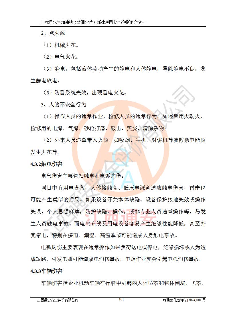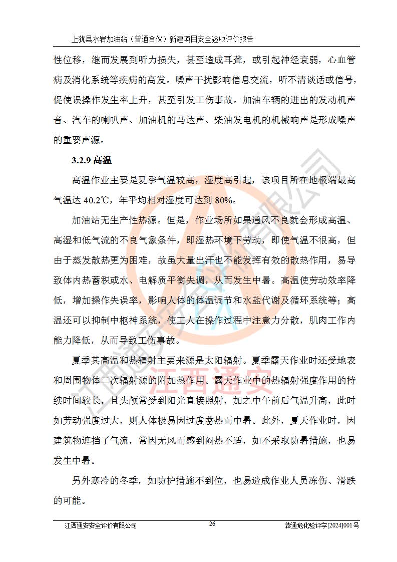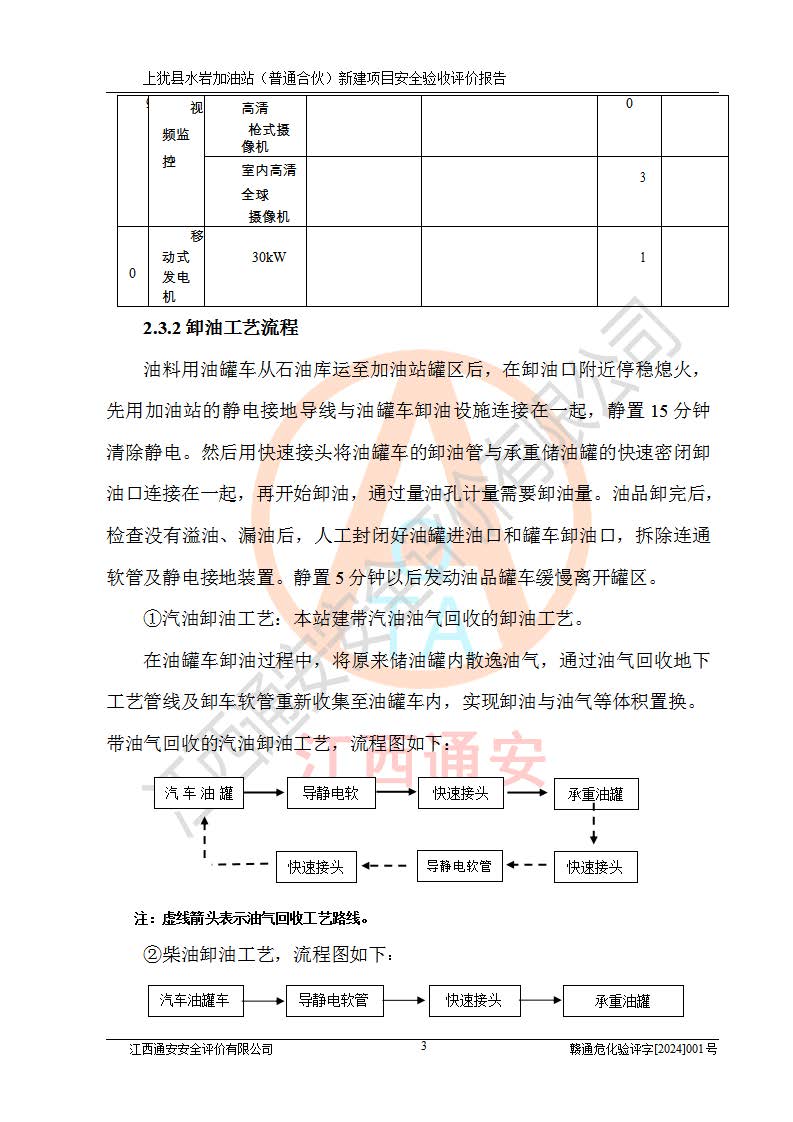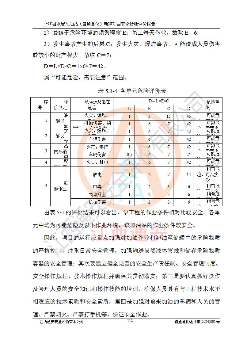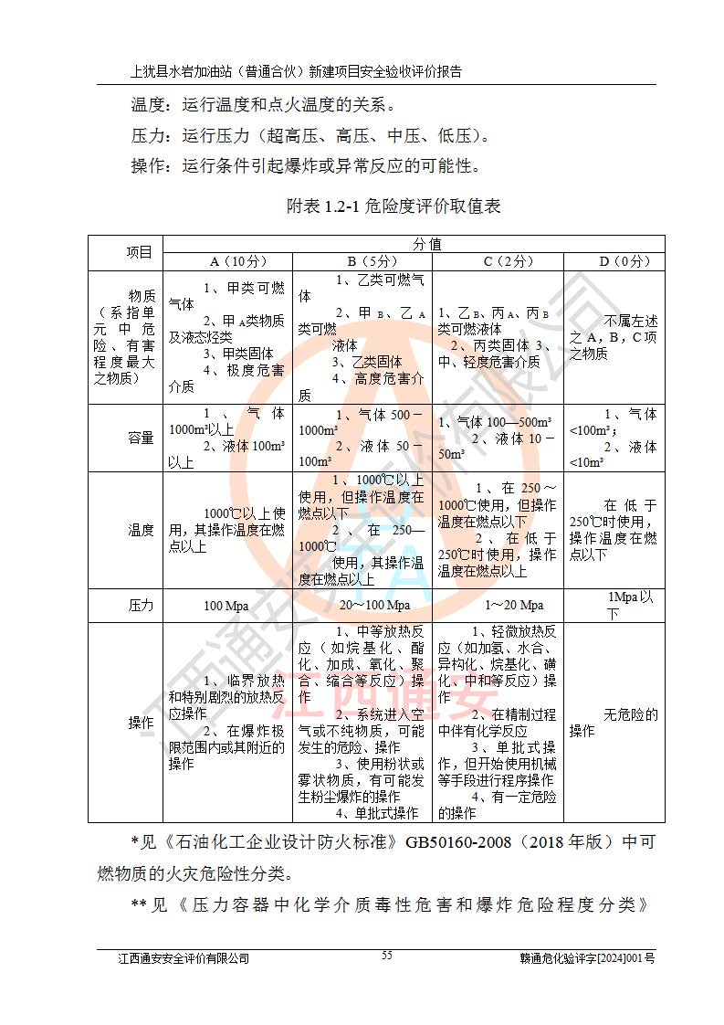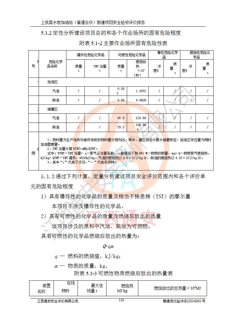 項(xiàng)目簡(jiǎn)介 | 本報(bào)告為上猶縣水巖加油站(普通合伙)新建項(xiàng)目的安全驗(yàn)收評(píng)價(jià)報(bào)告。水巖加油站位于江西省贛州市上猶縣水巖鄉(xiāng)太乙村上排組。上猶縣水巖加油站(普通合伙)法定**人為王盛華,成立日期為2022年12月15日,統(tǒng)一社會(huì)信用代碼91360724MAC55LN63B。經(jīng)營(yíng)范圍包括成品油(汽油、柴油)零售。該站已取得江西省商務(wù)廳頒發(fā)的成品油零售經(jīng)營(yíng)批準(zhǔn)證書(shū)(油零售證書(shū)第贛B14-51082號(hào))登記編號(hào):贛康行審安經(jīng)(甲)字【2022】000007號(hào),于2023年4月4日取得上猶縣行政審批局出具的《江西省企業(yè)投資項(xiàng)目備案通知書(shū)》(項(xiàng)目統(tǒng)一代碼為:2302-360724-04-01-695326),由海灣工程有限公司設(shè)計(jì)。2023年5月30日已取得上猶縣行政審批局出具的安全條件審查批復(fù),2023年7月14日已取得上猶縣行政審批局出具的安全設(shè)施設(shè)計(jì)審查批復(fù)。由贛州全盛建設(shè)工程有限公司進(jìn)行施工。 該加油站有4臺(tái)自吸泵加油機(jī),儲(chǔ)罐區(qū)設(shè)置92#汽油罐30m3一具、95#/92#隔艙汽油罐30m3一具、0#柴油罐30m3兩具,總?cè)萘繛?/span>120m3折算容量為90m3,屬三級(jí)加油站。 汽油、0#柴油均為危險(xiǎn)化學(xué)品,其蒸汽與空氣形成爆炸性氣體,遇明火、高熱易燃燒爆炸;0#柴油火險(xiǎn)分級(jí)為丙A類(lèi),遇明火、高熱或與氧化劑接觸,有引起燃燒爆炸的危險(xiǎn)。其中汽油火險(xiǎn)分級(jí)為甲B類(lèi),是重點(diǎn)監(jiān)管和特別管控危險(xiǎn)化學(xué)品。因此,本項(xiàng)目存在的主要危險(xiǎn)有害因素是火災(zāi)、爆炸。 根據(jù)《中華人民共和國(guó)安全生產(chǎn)法》、《危險(xiǎn)化學(xué)品安全管理?xiàng)l例》(***第591號(hào)令)、《危險(xiǎn)化學(xué)品經(jīng)營(yíng)許可證管理辦法》安監(jiān)總局令第55號(hào)(安監(jiān)總局令第79號(hào)修正)、《危險(xiǎn)化學(xué)品建設(shè)項(xiàng)目安全監(jiān)督管理辦法》**安全生產(chǎn)監(jiān)督管理總局45號(hào)令(安監(jiān)總局令第79號(hào)修正)、《江西省危險(xiǎn)化學(xué)品建設(shè)項(xiàng)目安全監(jiān)督管理實(shí)施細(xì)則(試行)》贛應(yīng)急字【2021】100號(hào)文的要求,企業(yè)應(yīng)對(duì)項(xiàng)目進(jìn)行安全驗(yàn)收評(píng)價(jià),以判斷工程項(xiàng)目在勞動(dòng)安全衛(wèi)生方面對(duì)**及行業(yè)有關(guān)的標(biāo)準(zhǔn)和法規(guī)的符合性,并檢查相關(guān)安全配套設(shè)施“三同時(shí)”的**性。待項(xiàng)目驗(yàn)收完成后,需辦理“危險(xiǎn)化學(xué)品經(jīng)營(yíng)許可證。” 受上猶縣水巖加油站(普通合伙)的委托,江西通安安全評(píng)價(jià)有限公司承擔(dān)其項(xiàng)目安全驗(yàn)收評(píng)價(jià)工作,于2023年1月組成評(píng)價(jià)小組,對(duì)所提供的資料、文件進(jìn)行了審核,對(duì)現(xiàn)場(chǎng)進(jìn)行了實(shí)地檢測(cè),根據(jù)《安全評(píng)價(jià)通則》AQ8001-2007和《危險(xiǎn)化學(xué)品建設(shè)項(xiàng)目安全評(píng)價(jià)細(xì)則(試行)》(安監(jiān)總?;?/span>[2007]255號(hào))要求,編寫(xiě)此評(píng)價(jià)報(bào)告。 本報(bào)告依據(jù)《汽車(chē)加油加氣加氫站技術(shù)標(biāo)準(zhǔn)》(GB50156-2021)編寫(xiě)報(bào)告,特此說(shuō)明。 需要說(shuō)明的是,本安全評(píng)價(jià)報(bào)告和結(jié)論是根據(jù)評(píng)價(jià)時(shí)企業(yè)的現(xiàn)實(shí)系統(tǒng)狀況做出。評(píng)價(jià)小組的工作只對(duì)評(píng)價(jià)時(shí)企業(yè)的現(xiàn)實(shí)系統(tǒng)狀況負(fù)責(zé)。 評(píng)價(jià)小組在工作中得到了上猶縣水巖加油站(普通合伙)以及相關(guān)安全管理部門(mén)的大力支持,在此表示感謝。 | ||||
