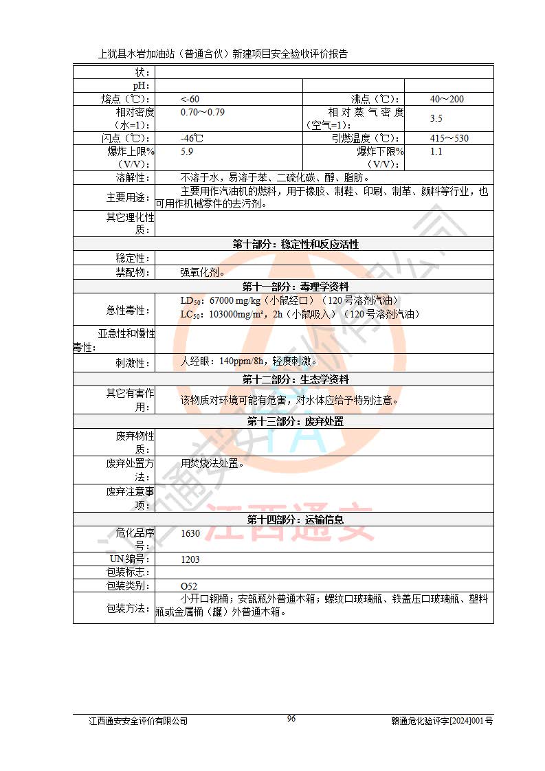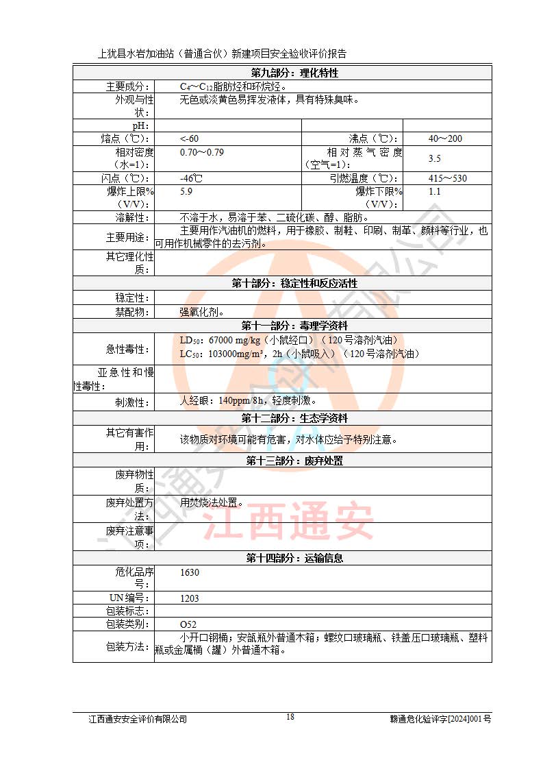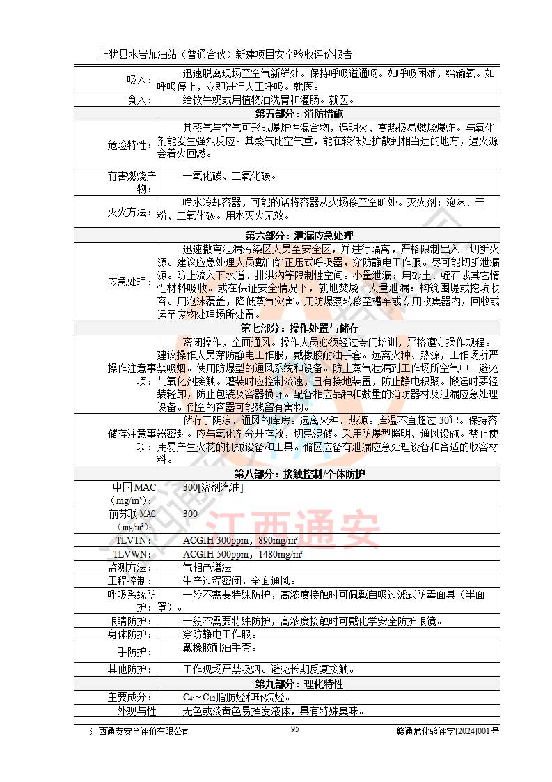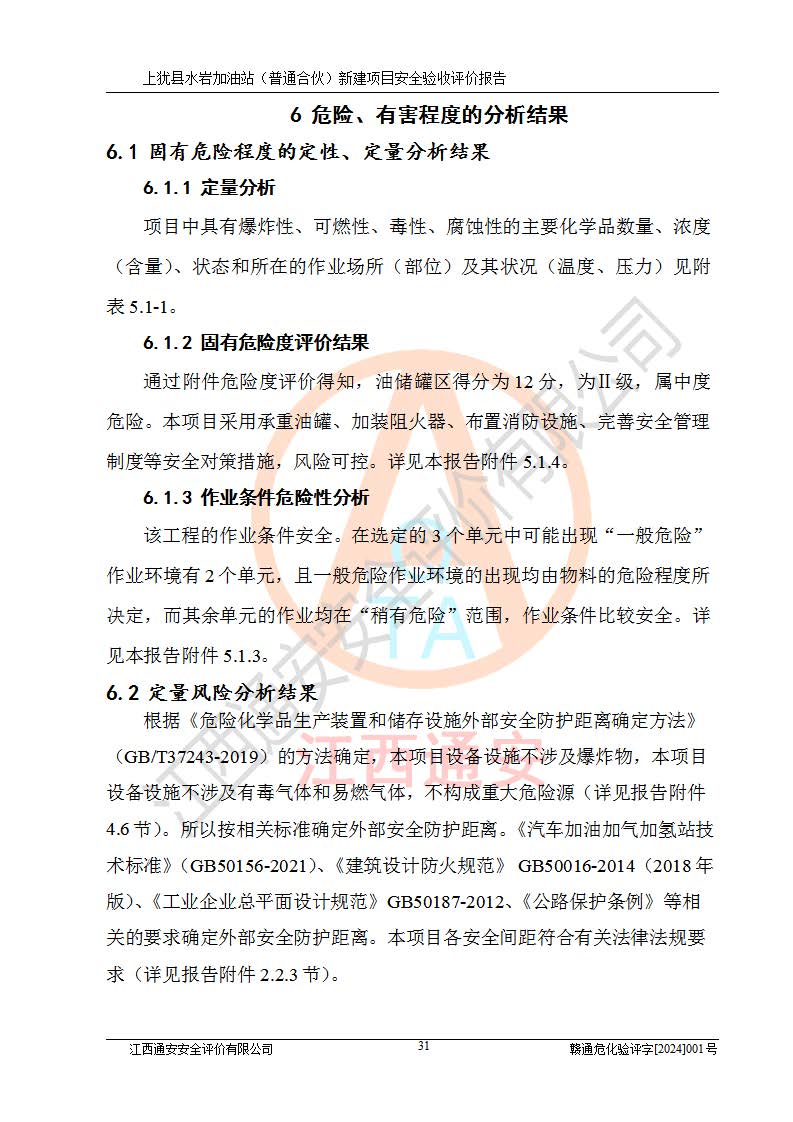 其它 | 1、上猶縣水巖加油站(普通合伙)所涉及的危險(xiǎn)化學(xué)品物質(zhì)的量不構(gòu)成重大危險(xiǎn)源。經(jīng)辨識(shí)本項(xiàng)目不涉及監(jiān)控、易制毒、易制爆、劇毒和**危險(xiǎn)化學(xué)品;項(xiàng)目涉及的汽油屬于重點(diǎn)監(jiān)管和特別管控危險(xiǎn)化學(xué)品,儲(chǔ)存經(jīng)營(yíng)單位應(yīng)根據(jù)“汽油安全措施和應(yīng)急處理原則”要求的措施完善安全、應(yīng)急設(shè)施和資源;依據(jù)《特別管控危險(xiǎn)化學(xué)品目錄(**版)》管控措施進(jìn)行檢查,加油站對(duì)汽油進(jìn)行儲(chǔ)存定置化管理,設(shè)置油罐區(qū)**儲(chǔ)存汽油,并制定各種管理制度,依法依規(guī)嚴(yán)格管理。項(xiàng)目不涉及重點(diǎn)監(jiān)管危險(xiǎn)化工工藝。 2、通過(guò)本報(bào)告分析,可以知道本項(xiàng)目投入經(jīng)營(yíng)后仍將面對(duì)多種危險(xiǎn)因素,如火災(zāi)、爆炸,電氣傷害、**傷害、噪聲等危險(xiǎn)有害因素。而項(xiàng)目*主要的危險(xiǎn)、有害因素是火災(zāi)、爆炸,對(duì)此加油站全體員工**保持**的安全防護(hù)意識(shí)。 3、項(xiàng)目公用工程能夠滿足安全經(jīng)營(yíng)的需要。 4、采用檢查表評(píng)價(jià)法進(jìn)行加油站安全評(píng)價(jià),評(píng)價(jià)范圍內(nèi)的設(shè)備設(shè)施結(jié)論為符合要求。 5、加油站取得了防雷接地檢測(cè)報(bào)告,加油站能夠符合安全規(guī)范要求。 6、該項(xiàng)目能按照《中華人民共和國(guó)安全生產(chǎn)法》的要求進(jìn)行“三同時(shí)”審批,安全設(shè)施按照安全設(shè)施與主體工程同時(shí)設(shè)計(jì)、同時(shí)施工、同時(shí)投入生產(chǎn)和使用的“三同時(shí)”的要求進(jìn)行,現(xiàn)場(chǎng)與設(shè)計(jì)一致。 7、該項(xiàng)目選址、外部防火距離、平面布置、消防安全設(shè)施和措施能夠滿足**法律、法規(guī)、標(biāo)準(zhǔn)、規(guī)范的要求。電氣防爆防護(hù)、機(jī)械設(shè)備的安全保護(hù)等方面的安全設(shè)施建立**。 8、該工程的作業(yè)條件相對(duì)比較安全。在選定的3個(gè)單元中可能出現(xiàn)“一般危險(xiǎn)”作業(yè)環(huán)境有2個(gè)單元,且“一般危險(xiǎn)”作業(yè)環(huán)境的出現(xiàn)均由物料的危險(xiǎn)程度所決定,而其余單元的作業(yè)均在“稍有危險(xiǎn)”范圍,作業(yè)條件相對(duì)安全。 9、危險(xiǎn)度評(píng)價(jià)油儲(chǔ)罐區(qū)得分為12分,為Ⅱ級(jí),屬中度危險(xiǎn)。由于采用承重油罐、密封操作等措施,危險(xiǎn)有害程度能控制在可接受的范圍。 10、加油站設(shè)置了安全**小組,制定了相應(yīng)的管理制度,操作規(guī)程和事故應(yīng)急預(yù)案,加油站的安全管理機(jī)構(gòu)工作有力,加油站安全經(jīng)營(yíng)管理處于正常有序開(kāi)展范圍。應(yīng)急資源配置和應(yīng)急管理能達(dá)到加油站的應(yīng)急要求。 四、評(píng)價(jià)結(jié)論: 綜上所述,上猶縣水巖加油站(普通合伙)新建項(xiàng)目嚴(yán)格執(zhí)行**有關(guān)安全生產(chǎn)法律、法規(guī)和有關(guān)標(biāo)準(zhǔn)、規(guī)范,認(rèn)真落實(shí)并合理采納安全條件評(píng)價(jià)報(bào)告及安全設(shè)施設(shè)計(jì)專(zhuān)篇設(shè)計(jì)中的安全對(duì)策、措施及建議,做到安全設(shè)施與主體工程同時(shí)設(shè)計(jì)、同時(shí)施工、同時(shí)投入生產(chǎn)和使用的“三同時(shí)”,對(duì)潛在的危險(xiǎn)、有害因素采取了安全對(duì)策措施。 該項(xiàng)目安全設(shè)施設(shè)計(jì)專(zhuān)篇設(shè)計(jì)的安全設(shè)施得到落實(shí)符合**安全生產(chǎn)方面的法律、法規(guī)、標(biāo)準(zhǔn)、規(guī)范的要求,具備安全驗(yàn)收條件,符合安全生產(chǎn)條件。 | ||||