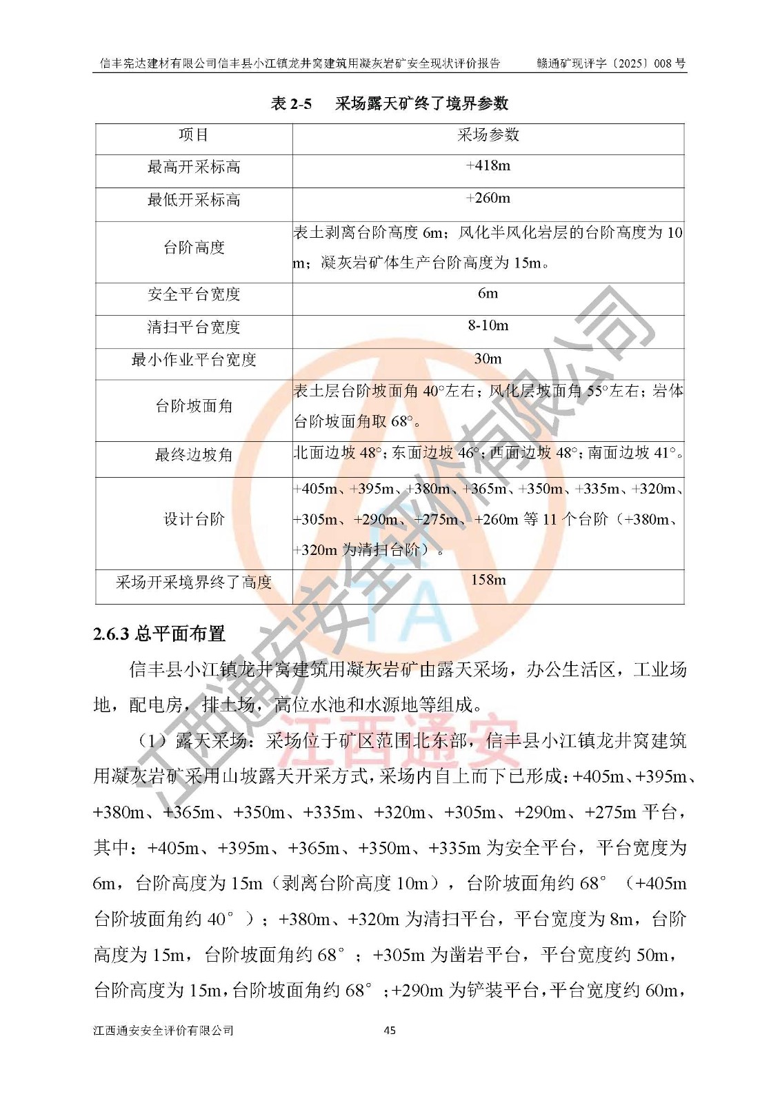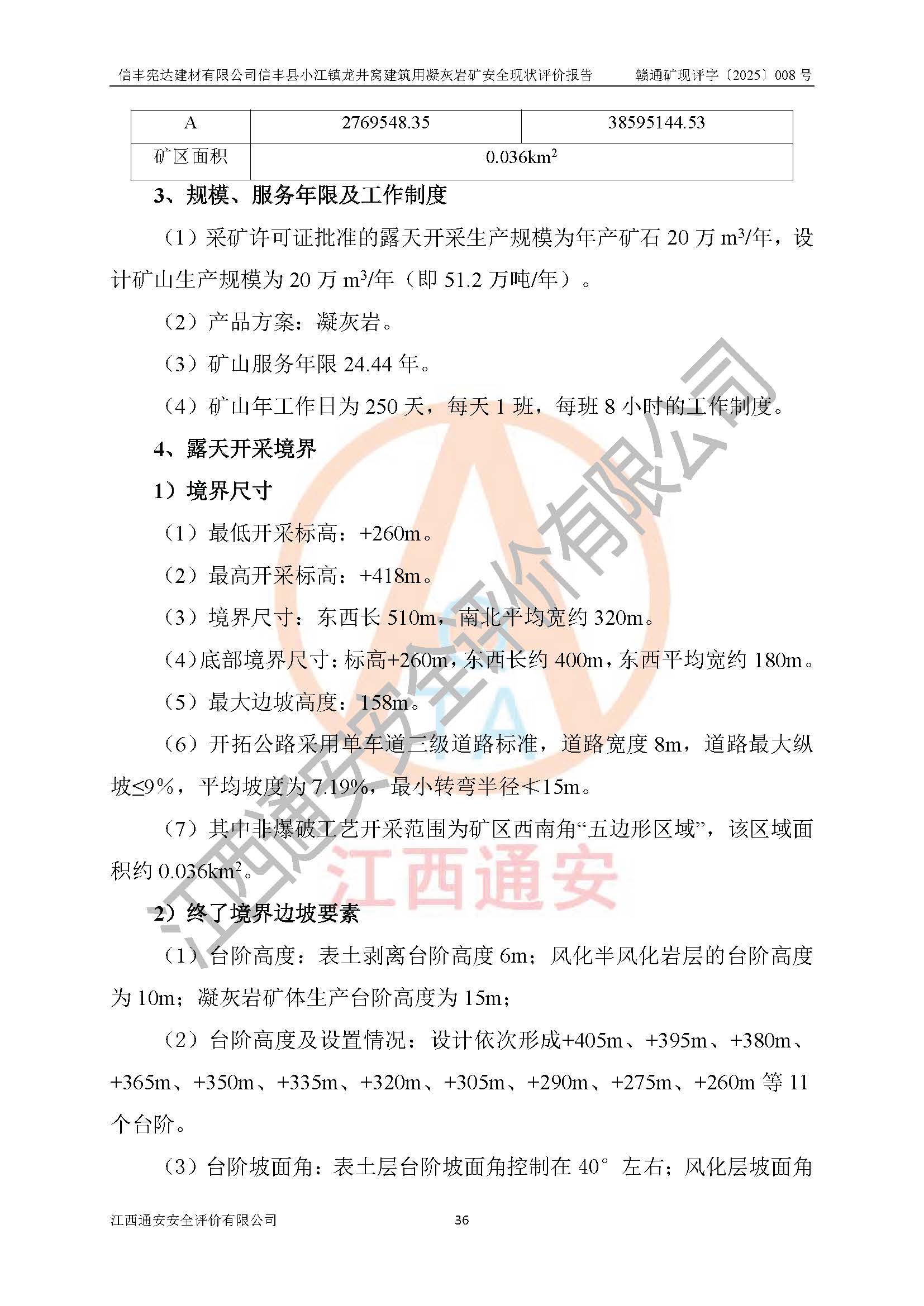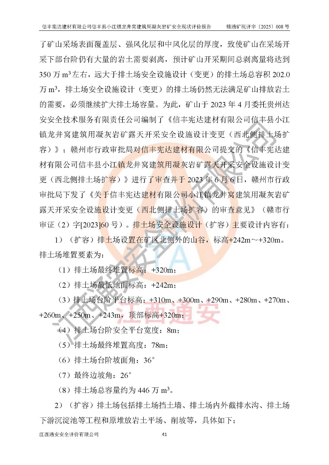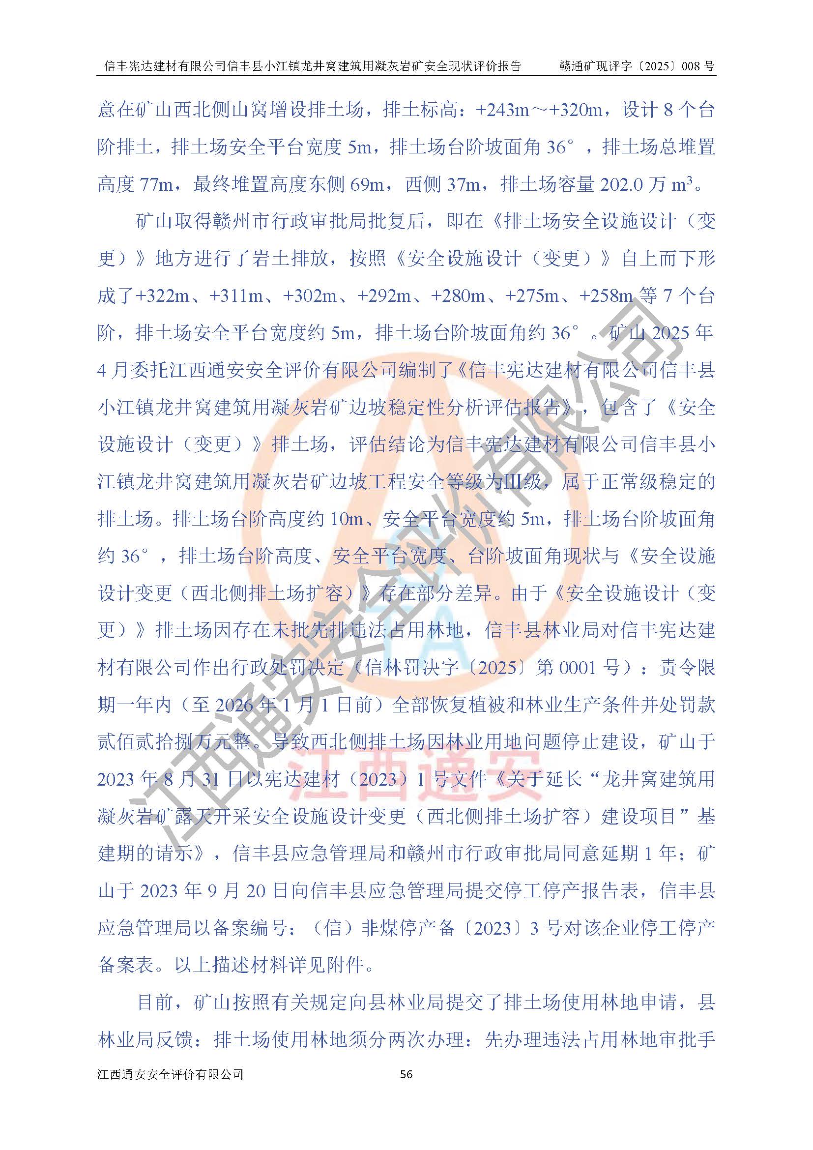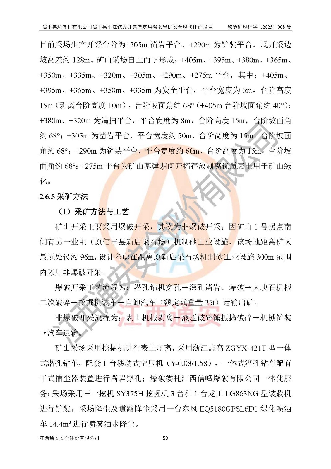 項(xiàng)目簡介 | 信豐憲達(dá)建材有限公司信豐縣小江鎮(zhèn)龍井窩建筑用凝灰?guī)r礦,屬有限責(zé)任公司(自然人投資或控股),法定**人:曾明花,經(jīng)營范圍:許可項(xiàng)目:礦產(chǎn)資源(非煤礦山)開采,各類工程建設(shè)活動(dòng),建筑勞務(wù)分包(依法須經(jīng)批準(zhǔn)的項(xiàng)目,經(jīng)相關(guān)部門批準(zhǔn)后方可開展經(jīng)營活動(dòng))。信豐憲達(dá)建材有限公司信豐縣小江鎮(zhèn)龍井窩建筑用凝灰?guī)r礦礦區(qū)位于信豐縣城180°方向直距約37km處的小江鎮(zhèn)新店村境內(nèi)。礦區(qū)中心地理坐標(biāo):東經(jīng)114°56′35.32″、北緯25°01′47.93″,行政區(qū)劃屬信豐縣小江鎮(zhèn)新店村管轄。礦區(qū)有水泥公路與105國道連接,交通便利。 礦山采用公路開拓、汽車運(yùn)輸方式。礦山開拓運(yùn)輸公路從礦區(qū)西側(cè)工業(yè)場地約+250m標(biāo)高為起點(diǎn)修至約+306m標(biāo)高處分岔進(jìn)入+305m鑿巖平臺(tái)和露天開采安全設(shè)施設(shè)計(jì)變更(西北側(cè)排土場擴(kuò)容)排土場及原開采的各平臺(tái),開拓運(yùn)輸公路道路面寬8m,采用泥結(jié)碎石路面,*大縱坡≤9%,平均坡度為7.19%,*小轉(zhuǎn)彎半徑≮15m;礦山經(jīng)過多年的開采,自上而下形成:+405m、+395m、+380m、+365m、+350m、+335m、+320m、+305m、+290m、+275m平臺(tái),其中:+405m、+395m、+365m、+350m、+335m為安全平臺(tái),平臺(tái)寬度為6m,臺(tái)階**15m(剝離臺(tái)階**10m),臺(tái)階坡面角約68°(+405m臺(tái)階坡面角約40°);+380m、+320m為清掃平臺(tái),平臺(tái)寬度為8m,臺(tái)階**15m,臺(tái)階坡面角約68°;+305m為鑿巖平臺(tái),平臺(tái)寬度約50m,臺(tái)階**為15m,臺(tái)階坡面角約68°;+290m為鏟裝平臺(tái),平臺(tái)寬度約60m,臺(tái)階**為15m,臺(tái)階坡面角約68°。 2023年4月12日,礦山取得贛州市應(yīng)急管理局頒發(fā)的安全生產(chǎn)標(biāo)準(zhǔn)化三級(jí)企業(yè)(非煤礦山)證書,證書編號(hào):贛市AQBKSⅢ[2023]16號(hào),**期至2026年4月11日。 | ||||