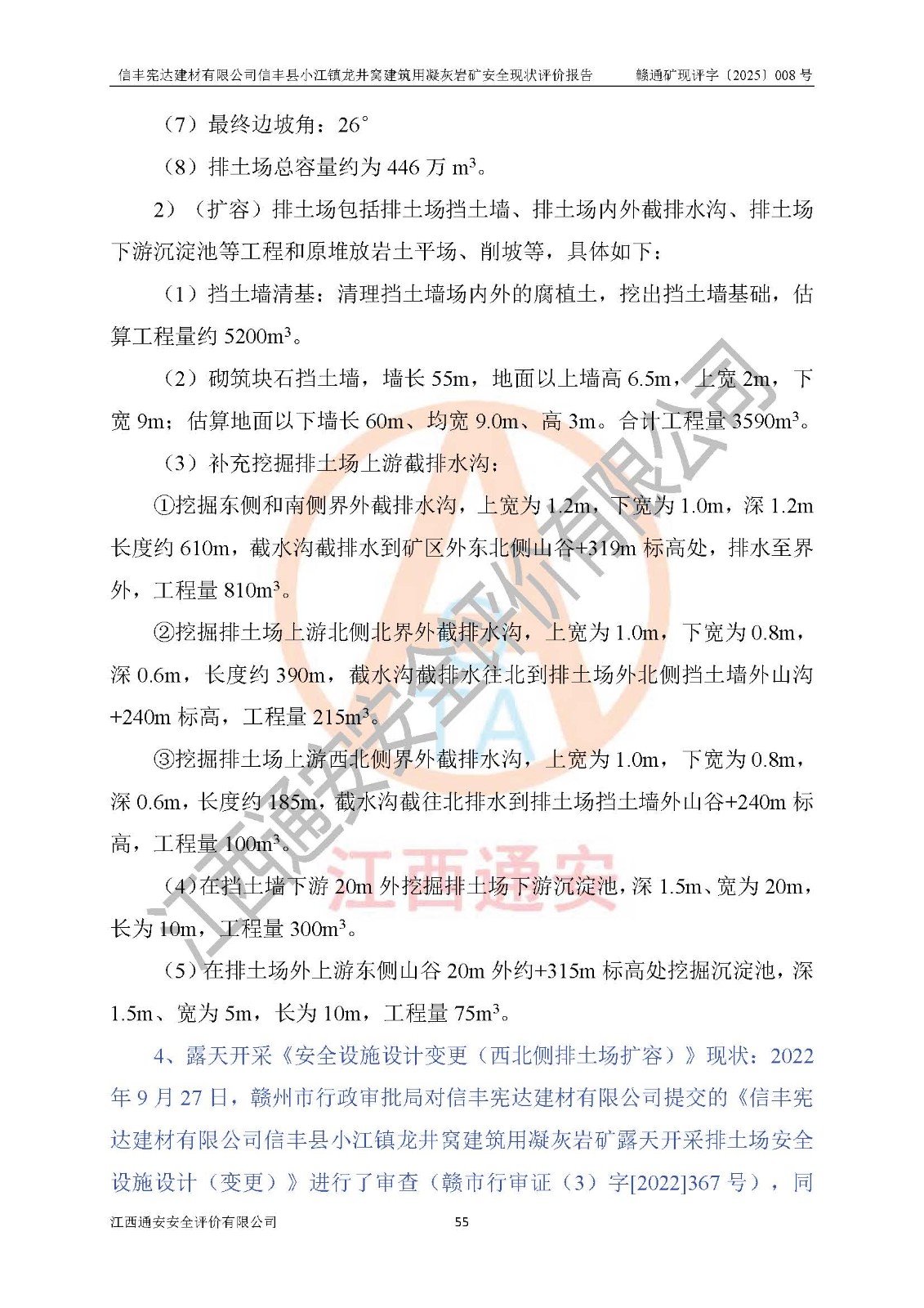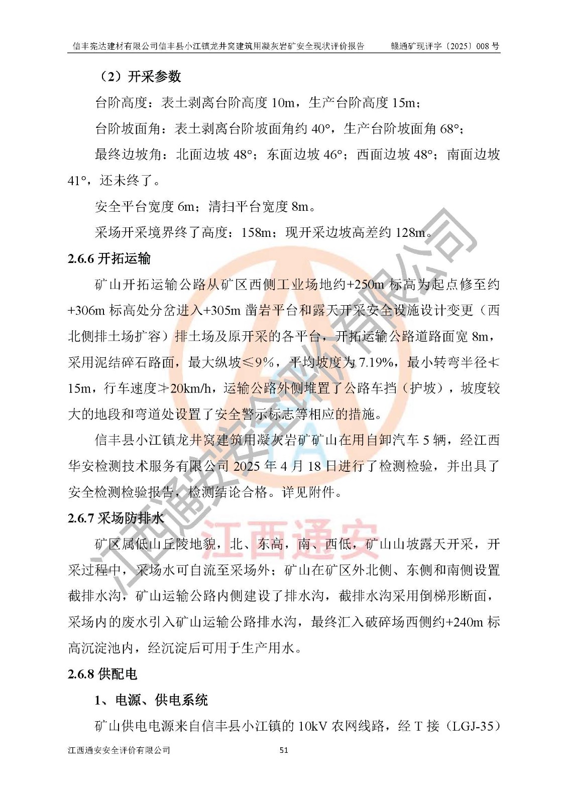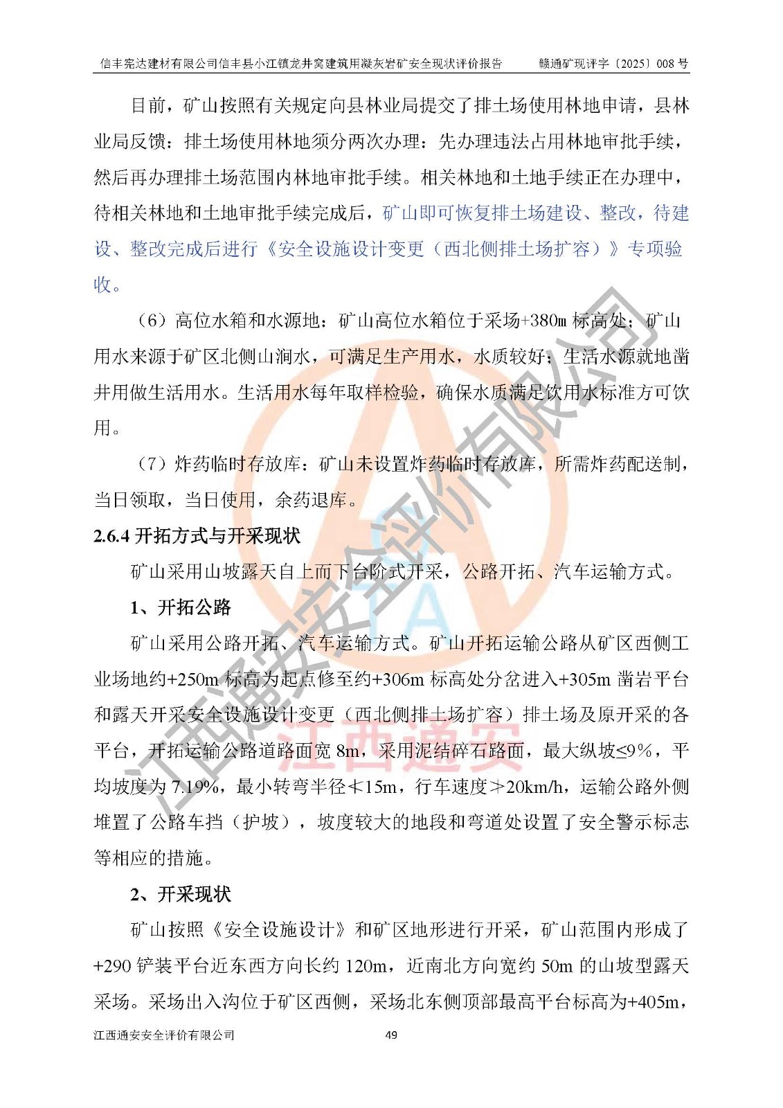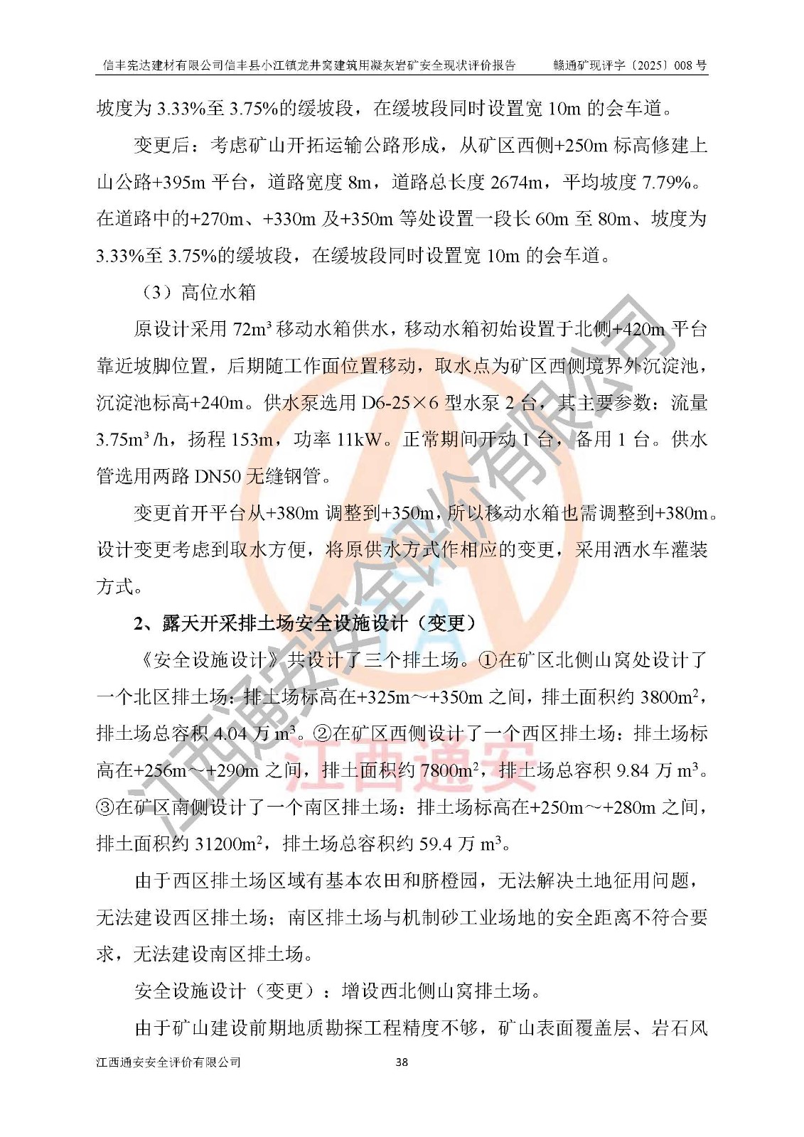 項(xiàng)目簡介 | 信豐憲達(dá)建材有限公司信豐縣小江鎮(zhèn)龍井窩建筑用凝灰?guī)r礦,屬有限責(zé)任公司(自然人投資或控股),法定**人:曾明花,經(jīng)營范圍:許可項(xiàng)目:礦產(chǎn)資源(非煤礦山)開采,各類工程建設(shè)活動(dòng),建筑勞務(wù)分包(依法須經(jīng)批準(zhǔn)的項(xiàng)目,經(jīng)相關(guān)部門批準(zhǔn)后方可開展經(jīng)營活動(dòng))。信豐憲達(dá)建材有限公司信豐縣小江鎮(zhèn)龍井窩建筑用凝灰?guī)r礦礦區(qū)位于信豐縣城180°方向直距約37km處的小江鎮(zhèn)新店村境內(nèi)。礦區(qū)中心地理坐標(biāo):東經(jīng)114°56′35.32″、北緯25°01′47.93″,行政區(qū)劃屬信豐縣小江鎮(zhèn)新店村管轄。礦區(qū)有水泥公路與105國道連接,交通便利。 礦山采用公路開拓、汽車運(yùn)輸方式。礦山開拓運(yùn)輸公路從礦區(qū)西側(cè)工業(yè)場地約+250m標(biāo)高為起點(diǎn)修至約+306m標(biāo)高處分岔進(jìn)入+305m鑿巖平臺(tái)和露天開采安全設(shè)施設(shè)計(jì)變更(西北側(cè)排土場擴(kuò)容)排土場及原開采的各平臺(tái),開拓運(yùn)輸公路道路面寬8m,采用泥結(jié)碎石路面,*大縱坡≤9%,平均坡度為7.19%,*小轉(zhuǎn)彎半徑≮15m;礦山經(jīng)過多年的開采,自上而下形成:+405m、+395m、+380m、+365m、+350m、+335m、+320m、+305m、+290m、+275m平臺(tái),其中:+405m、+395m、+365m、+350m、+335m為安全平臺(tái),平臺(tái)寬度為6m,臺(tái)階**15m(剝離臺(tái)階**10m),臺(tái)階坡面角約68°(+405m臺(tái)階坡面角約40°);+380m、+320m為清掃平臺(tái),平臺(tái)寬度為8m,臺(tái)階**15m,臺(tái)階坡面角約68°;+305m為鑿巖平臺(tái),平臺(tái)寬度約50m,臺(tái)階**為15m,臺(tái)階坡面角約68°;+290m為鏟裝平臺(tái),平臺(tái)寬度約60m,臺(tái)階**為15m,臺(tái)階坡面角約68°。 2023年4月12日,礦山取得贛州市應(yīng)急管理局頒發(fā)的安全生產(chǎn)標(biāo)準(zhǔn)化三級(jí)企業(yè)(非煤礦山)證書,證書編號(hào):贛市AQBKSⅢ[2023]16號(hào),**期至2026年4月11日。 | ||||