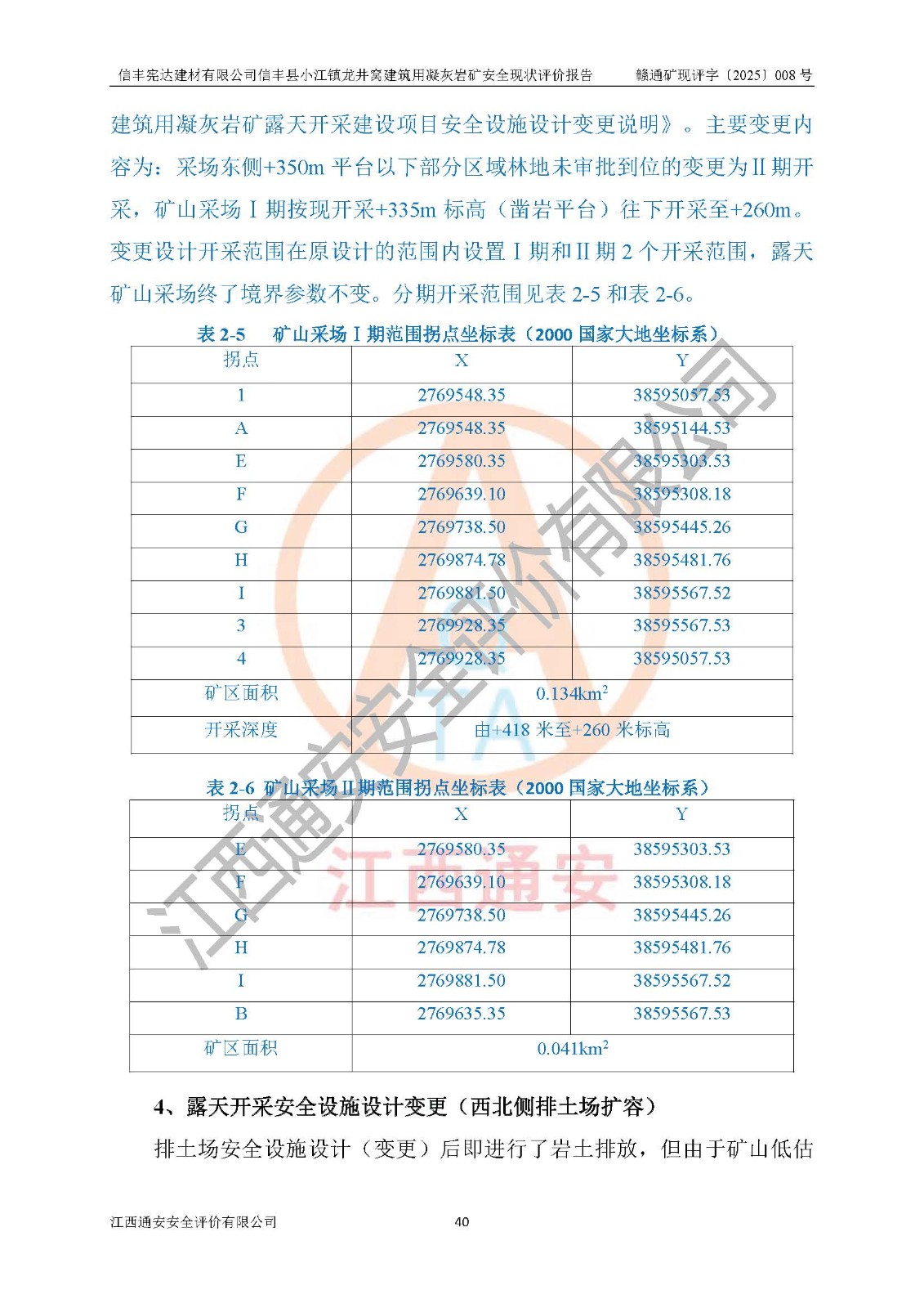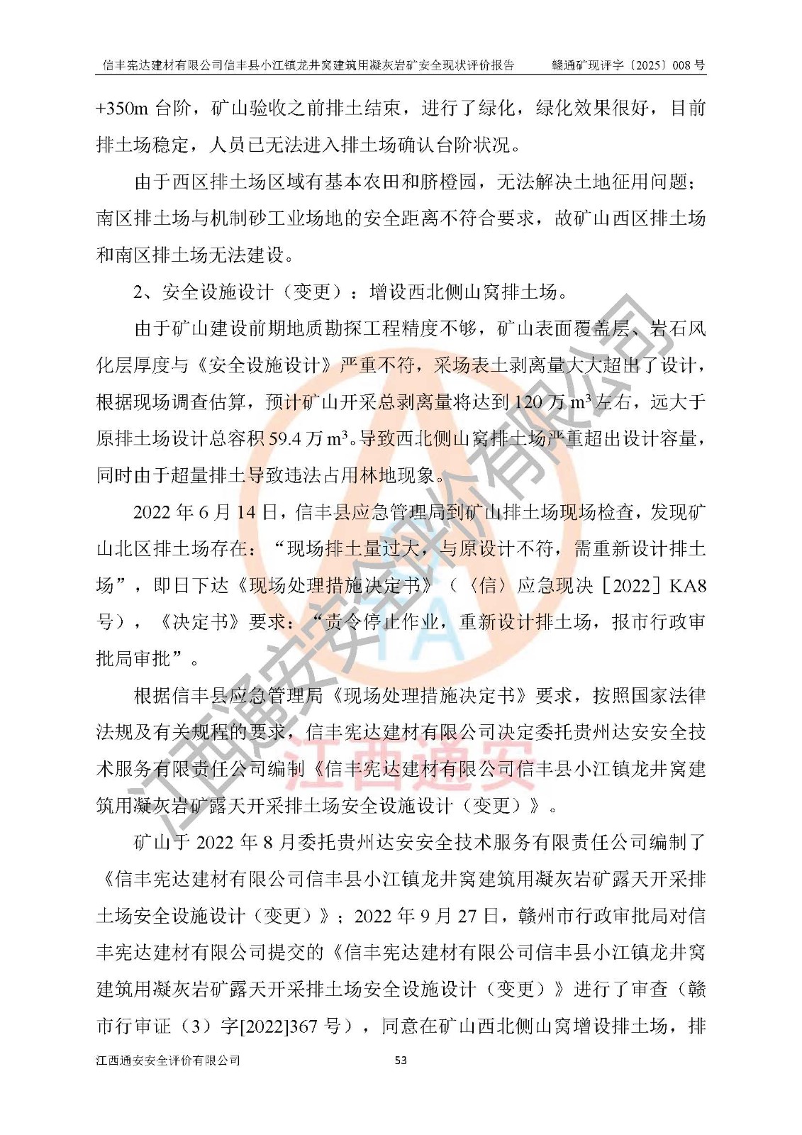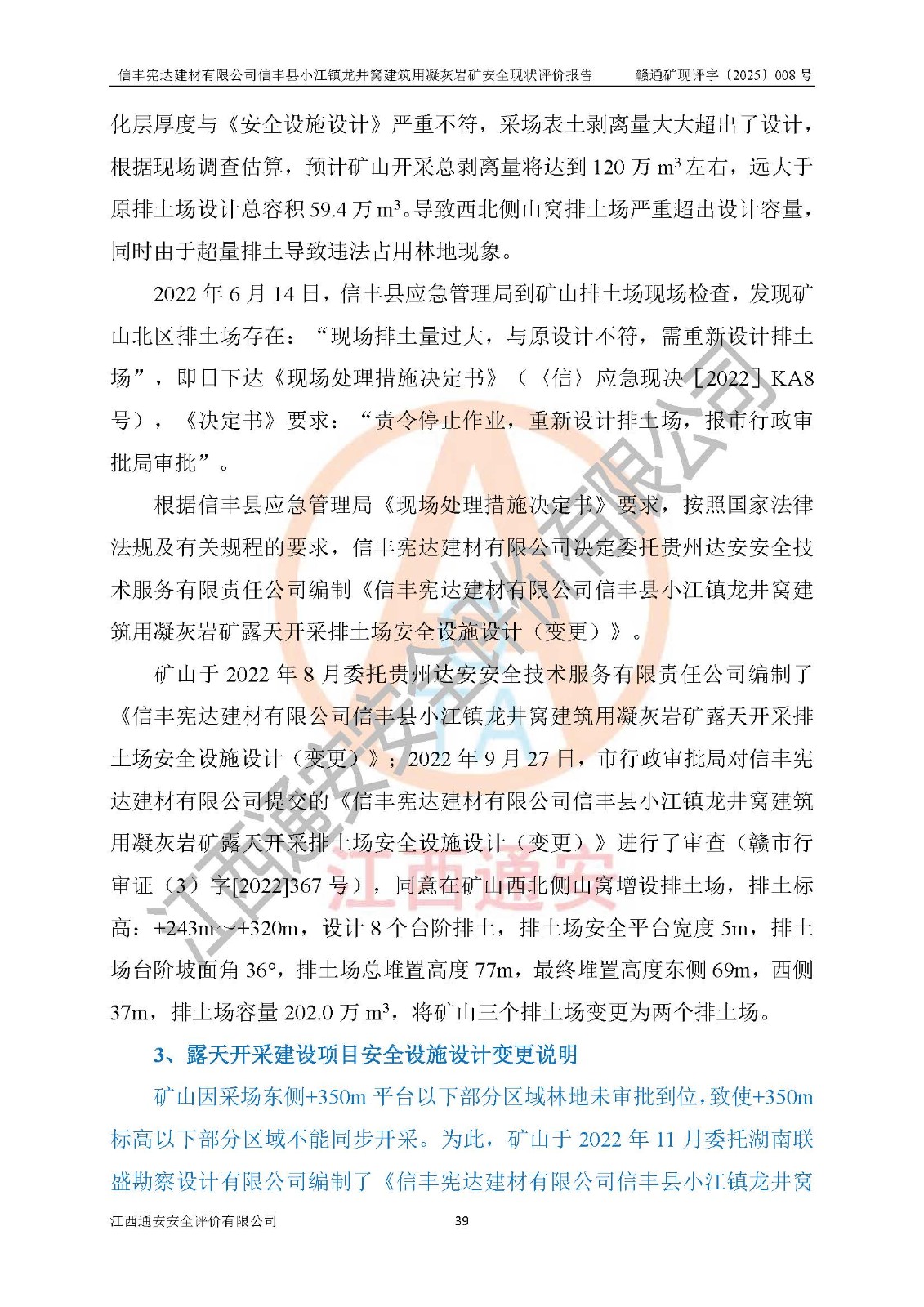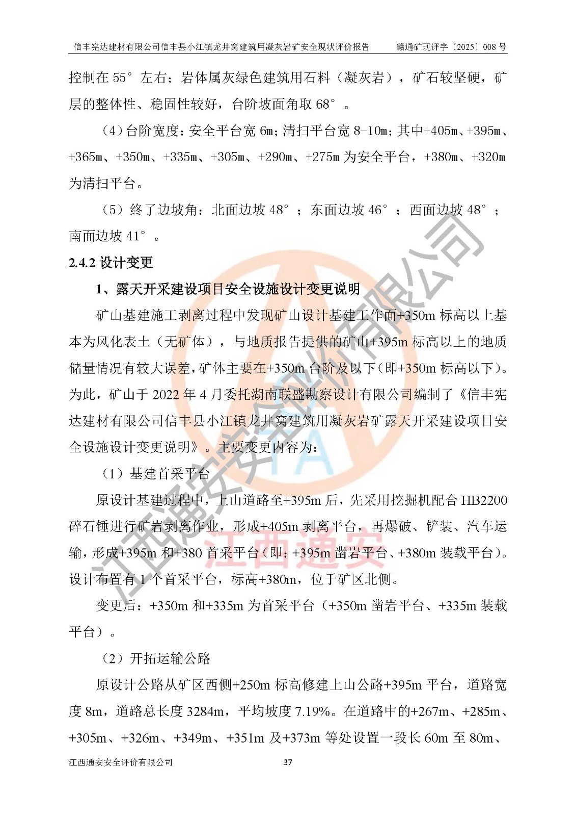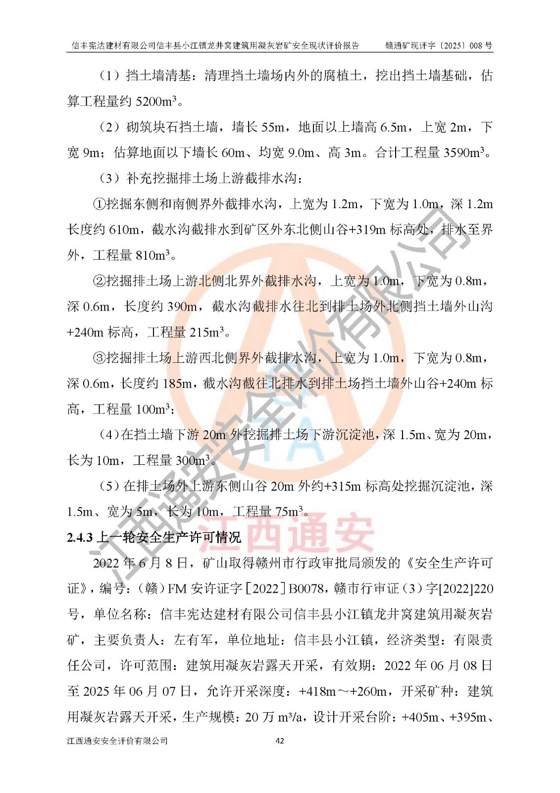 項(xiàng)目簡介 | 信豐憲達(dá)建材有限公司信豐縣小江鎮(zhèn)龍井窩建筑用凝灰?guī)r礦,屬有限責(zé)任公司(自然人投資或控股),法定**人:曾明花,經(jīng)營范圍:許可項(xiàng)目:礦產(chǎn)資源(非煤礦山)開采,各類工程建設(shè)活動(dòng),建筑勞務(wù)分包(依法須經(jīng)批準(zhǔn)的項(xiàng)目,經(jīng)相關(guān)部門批準(zhǔn)后方可開展經(jīng)營活動(dòng))。信豐憲達(dá)建材有限公司信豐縣小江鎮(zhèn)龍井窩建筑用凝灰?guī)r礦礦區(qū)位于信豐縣城180°方向直距約37km處的小江鎮(zhèn)新店村境內(nèi)。礦區(qū)中心地理坐標(biāo):東經(jīng)114°56′35.32″、北緯25°01′47.93″,行政區(qū)劃屬信豐縣小江鎮(zhèn)新店村管轄。礦區(qū)有水泥公路與105國道連接,交通便利。 礦山采用公路開拓、汽車運(yùn)輸方式。礦山開拓運(yùn)輸公路從礦區(qū)西側(cè)工業(yè)場地約+250m標(biāo)高為起點(diǎn)修至約+306m標(biāo)高處分岔進(jìn)入+305m鑿巖平臺(tái)和露天開采安全設(shè)施設(shè)計(jì)變更(西北側(cè)排土場擴(kuò)容)排土場及原開采的各平臺(tái),開拓運(yùn)輸公路道路面寬8m,采用泥結(jié)碎石路面,*大縱坡≤9%,平均坡度為7.19%,*小轉(zhuǎn)彎半徑≮15m;礦山經(jīng)過多年的開采,自上而下形成:+405m、+395m、+380m、+365m、+350m、+335m、+320m、+305m、+290m、+275m平臺(tái),其中:+405m、+395m、+365m、+350m、+335m為安全平臺(tái),平臺(tái)寬度為6m,臺(tái)階**15m(剝離臺(tái)階**10m),臺(tái)階坡面角約68°(+405m臺(tái)階坡面角約40°);+380m、+320m為清掃平臺(tái),平臺(tái)寬度為8m,臺(tái)階**15m,臺(tái)階坡面角約68°;+305m為鑿巖平臺(tái),平臺(tái)寬度約50m,臺(tái)階**為15m,臺(tái)階坡面角約68°;+290m為鏟裝平臺(tái),平臺(tái)寬度約60m,臺(tái)階**為15m,臺(tái)階坡面角約68°。 2023年4月12日,礦山取得贛州市應(yīng)急管理局頒發(fā)的安全生產(chǎn)標(biāo)準(zhǔn)化三級(jí)企業(yè)(非煤礦山)證書,證書編號(hào):贛市AQBKSⅢ[2023]16號(hào),**期至2026年4月11日。 | ||||