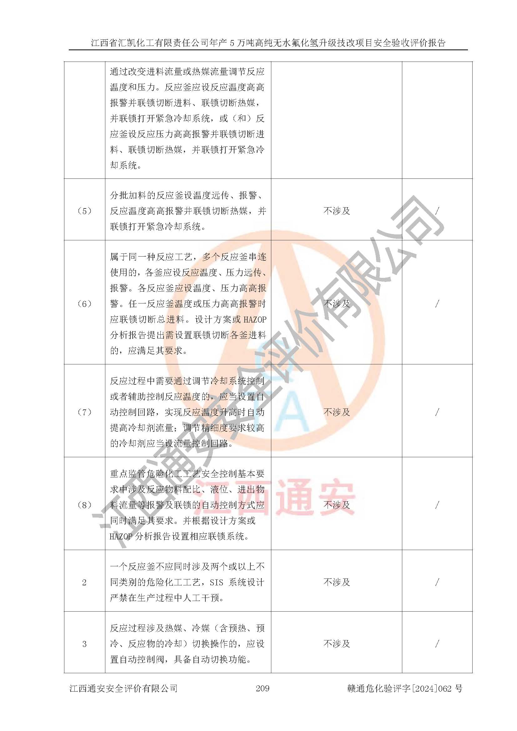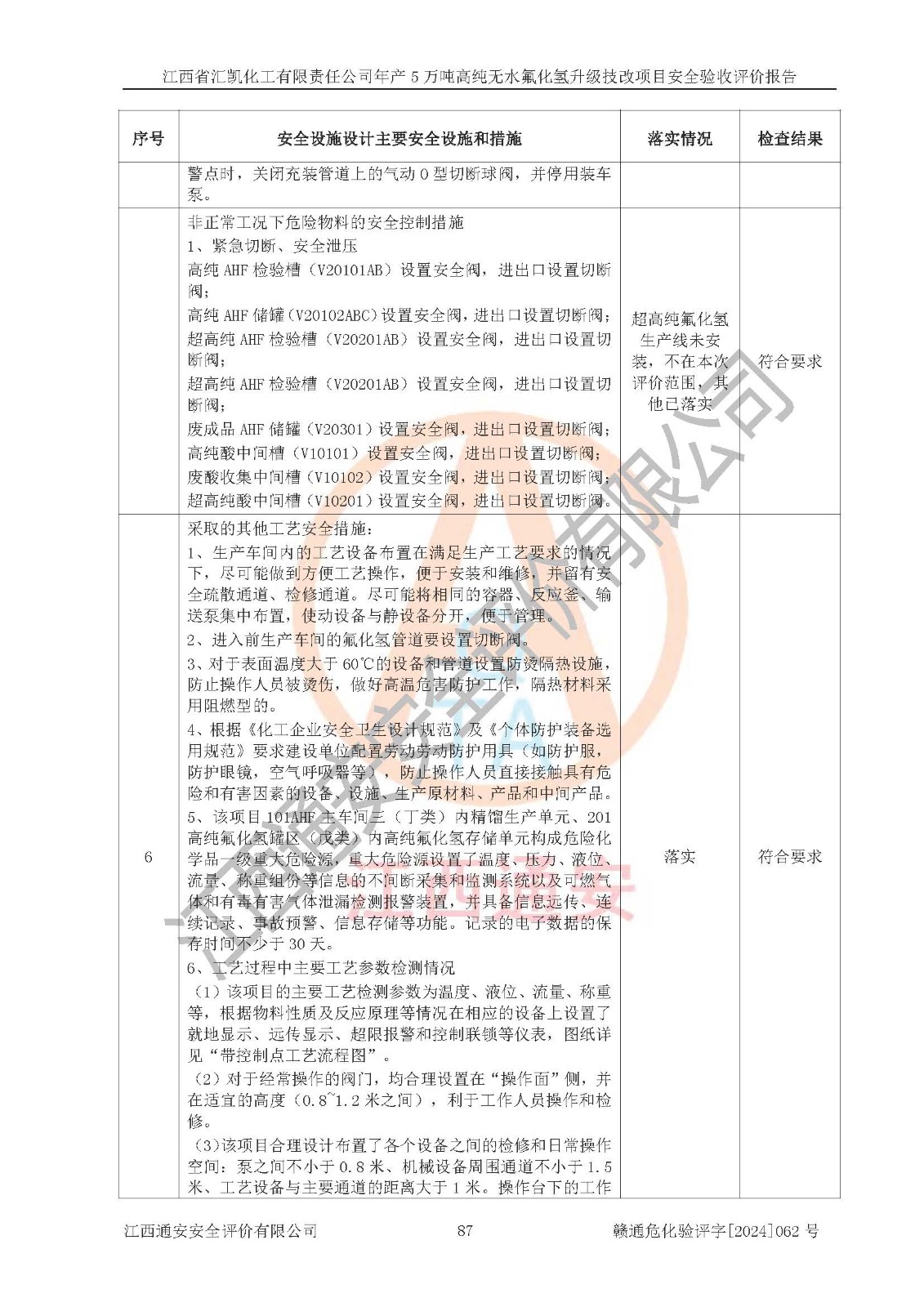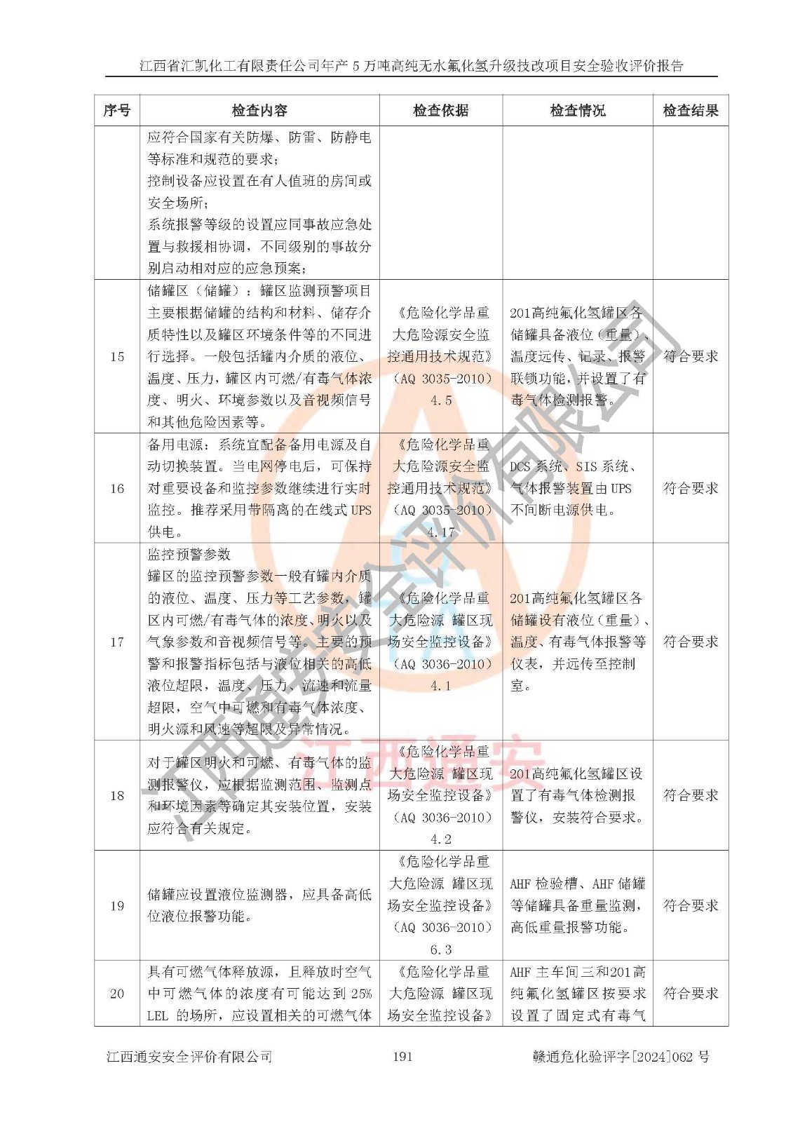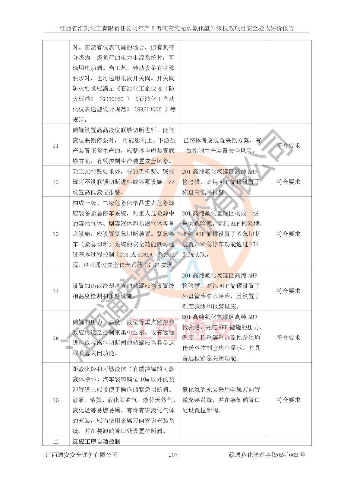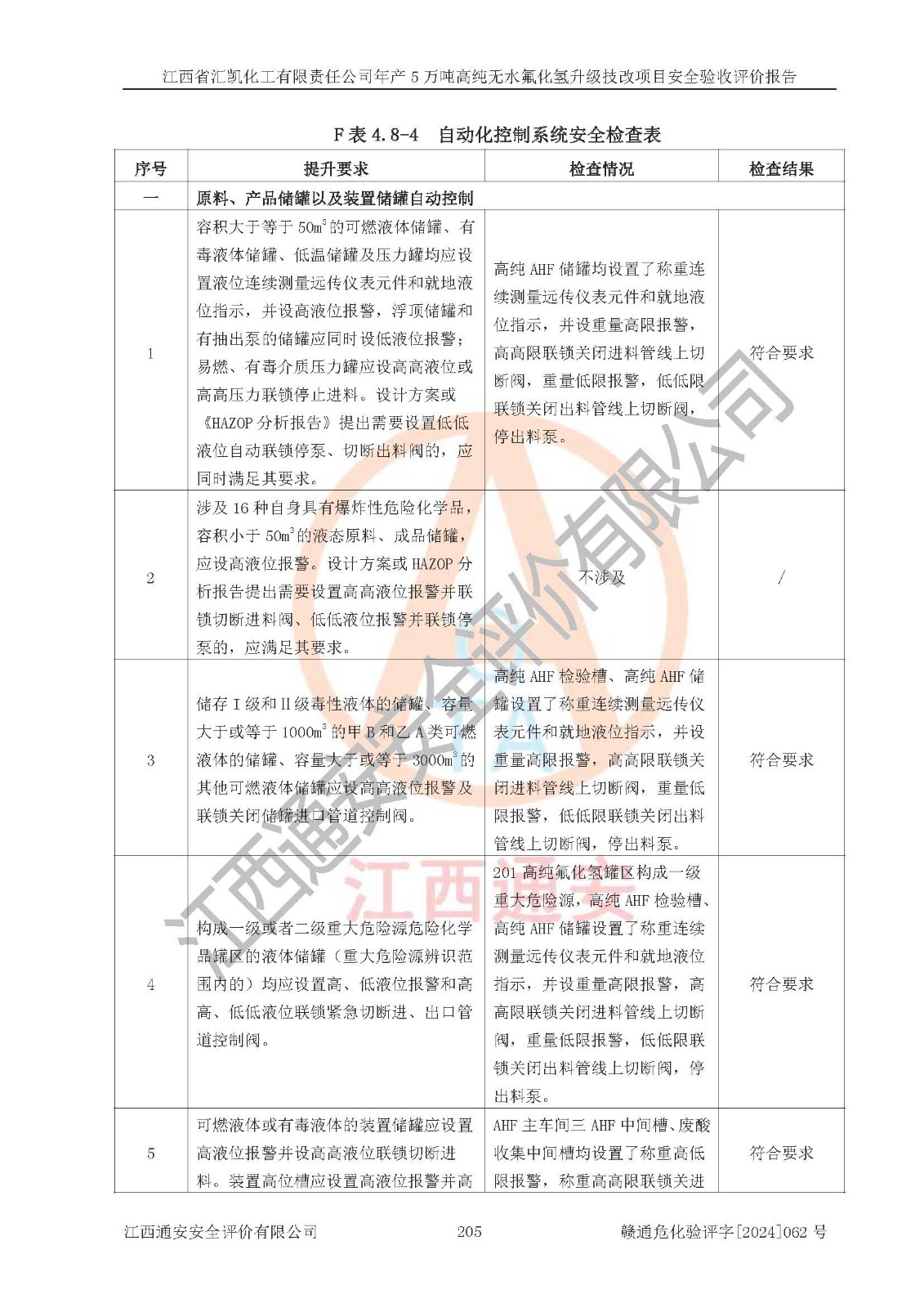 評價結(jié)論 | 江西省匯凱化工有限責任公司年產(chǎn)5萬噸高純無水氟化氫升級技改項目現(xiàn)場情況與設(shè)計圖紙一致,DCS系統(tǒng)和SIS系統(tǒng)符合設(shè)計要求、運行正常,主要負責人、安全管理人員等有關(guān)從業(yè)人員資質(zhì)符合《江西省危險化學品安全專項整治三年行動實施方案》要求,安全設(shè)施及安全管理符合**及有關(guān)部門關(guān)于安全生產(chǎn)法律、法規(guī)、標準的要求,該項目試生產(chǎn)以來,工藝設(shè)備運行正常,安全設(shè)施和采取的安全技術(shù)措施符合設(shè)計要求并達到預(yù)期結(jié)果,可以滿足建設(shè)項目安全生產(chǎn)的要求,安全生產(chǎn)管理**,具備了安全設(shè)施竣工驗收條件。 | ||||||