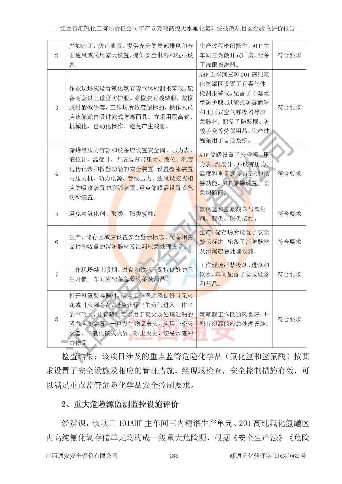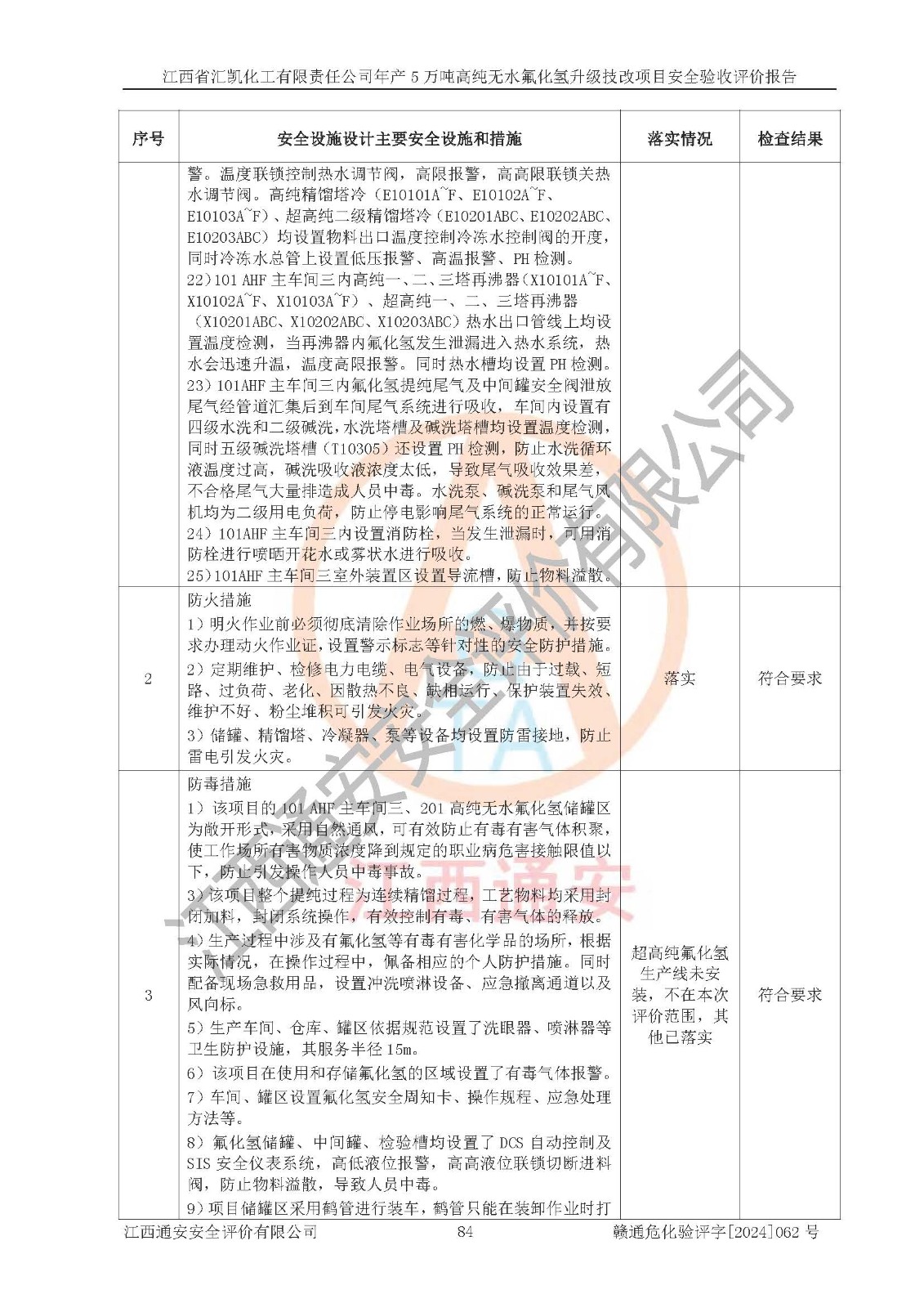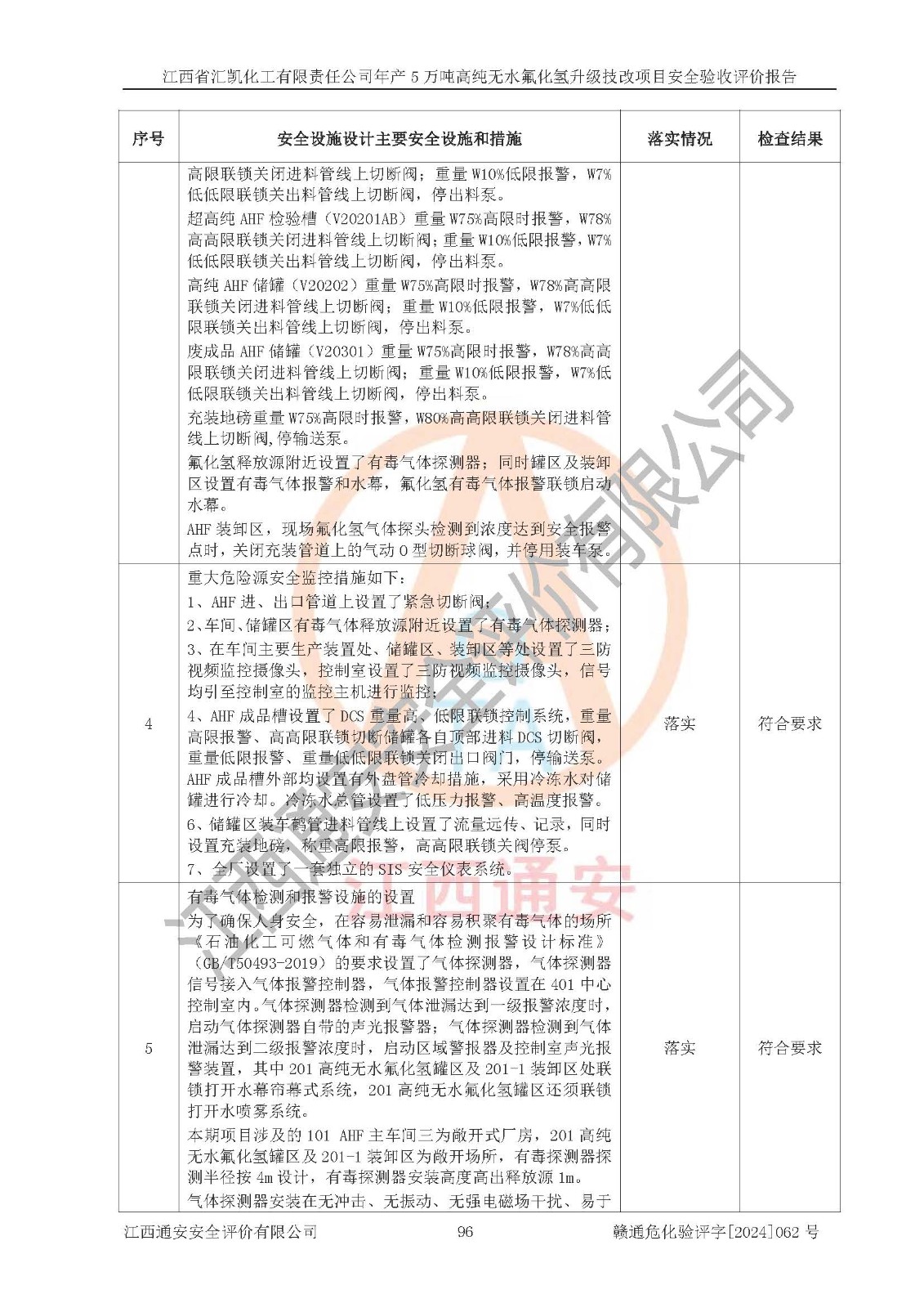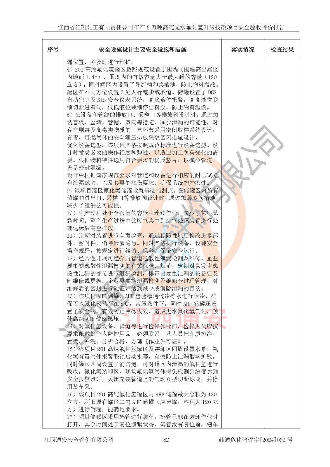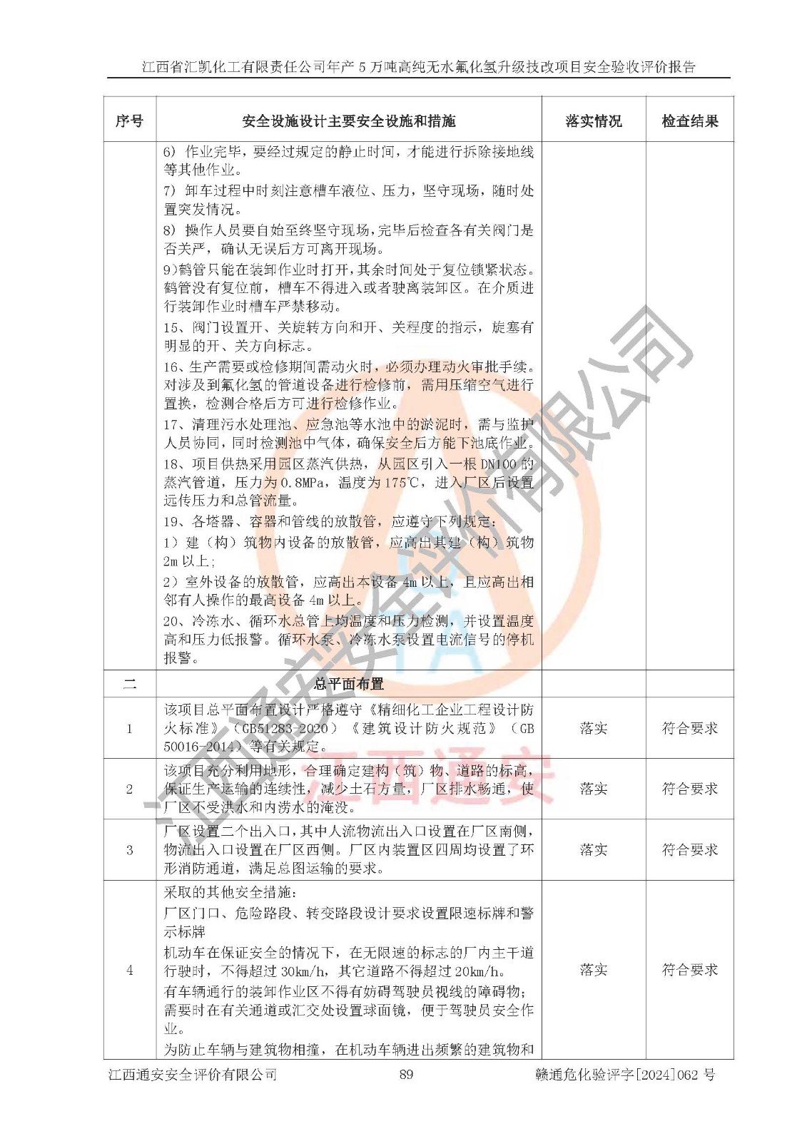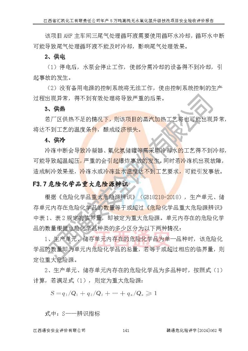 評價結(jié)論 | 江西省匯凱化工有限責任公司年產(chǎn)5萬噸高純無水氟化氫升級技改項目現(xiàn)場情況與設(shè)計圖紙一致,DCS系統(tǒng)和SIS系統(tǒng)符合設(shè)計要求、運行正常,主要負責人、安全管理人員等有關(guān)從業(yè)人員資質(zhì)符合《江西省危險化學品安全專項整治三年行動實施方案》要求,安全設(shè)施及安全管理符合**及有關(guān)部門關(guān)于安全生產(chǎn)法律、法規(guī)、標準的要求,該項目試生產(chǎn)以來,工藝設(shè)備運行正常,安全設(shè)施和采取的安全技術(shù)措施符合設(shè)計要求并達到預(yù)期結(jié)果,可以滿足建設(shè)項目安全生產(chǎn)的要求,安全生產(chǎn)管理**,具備了安全設(shè)施竣工驗收條件。 | ||||||