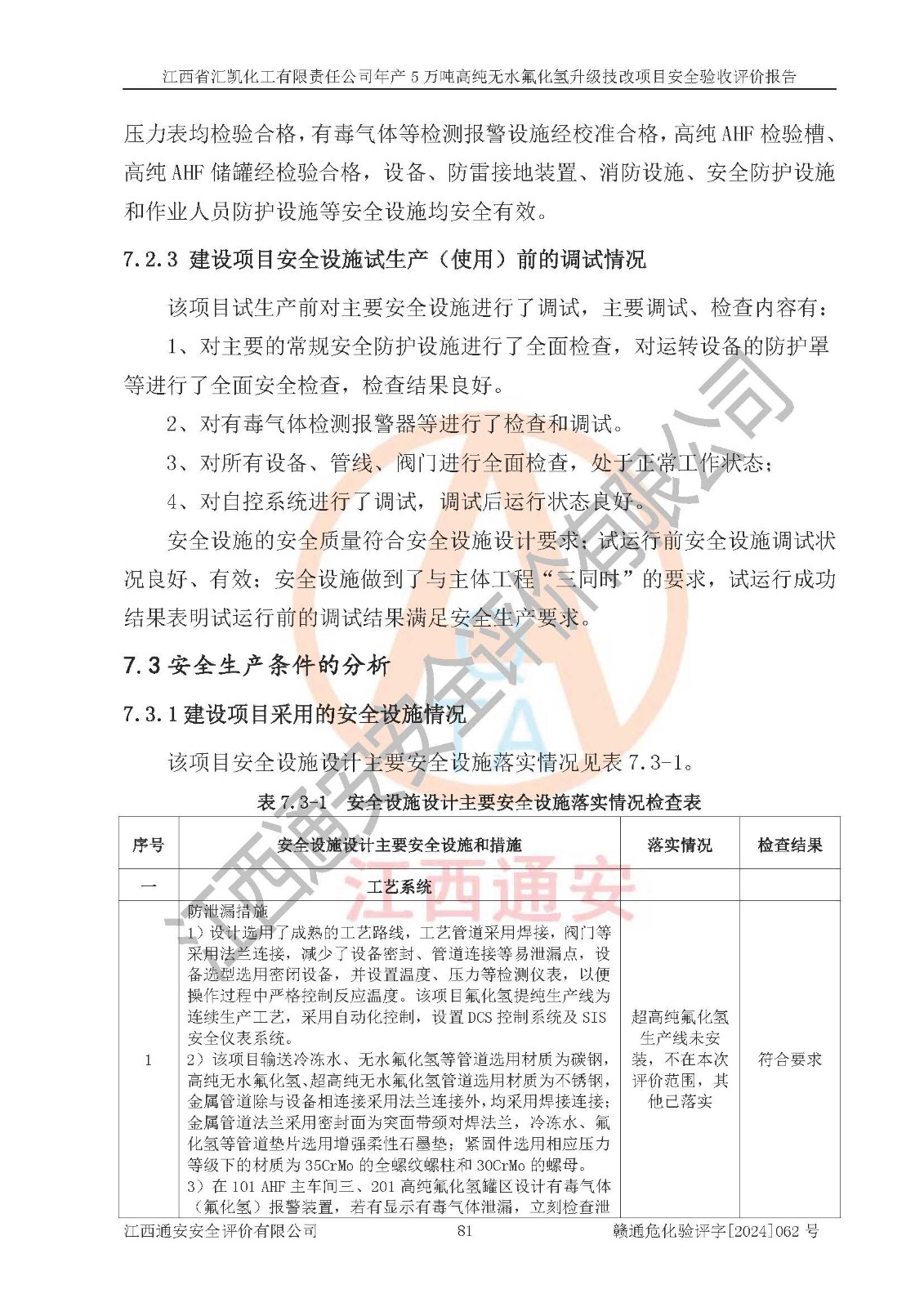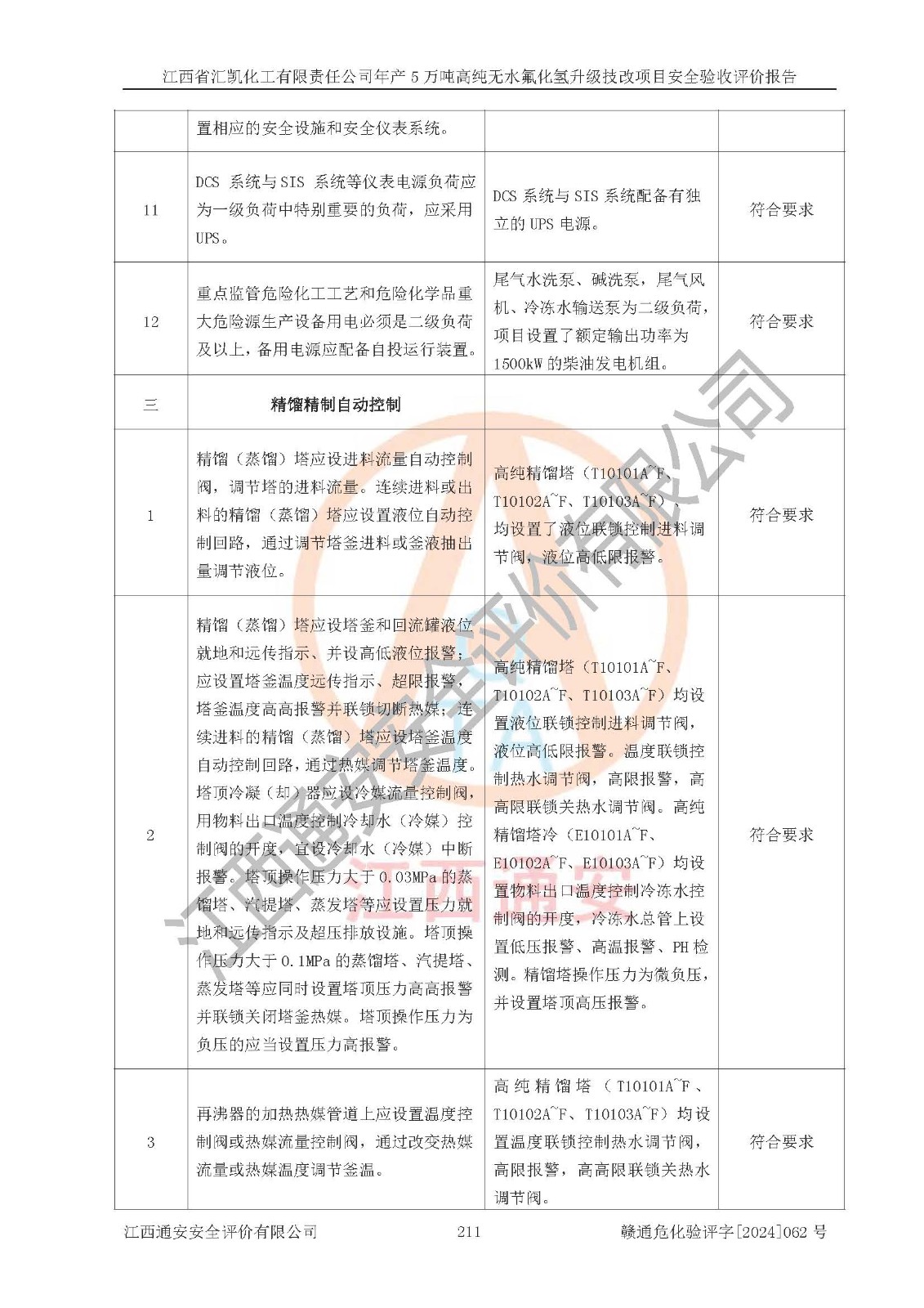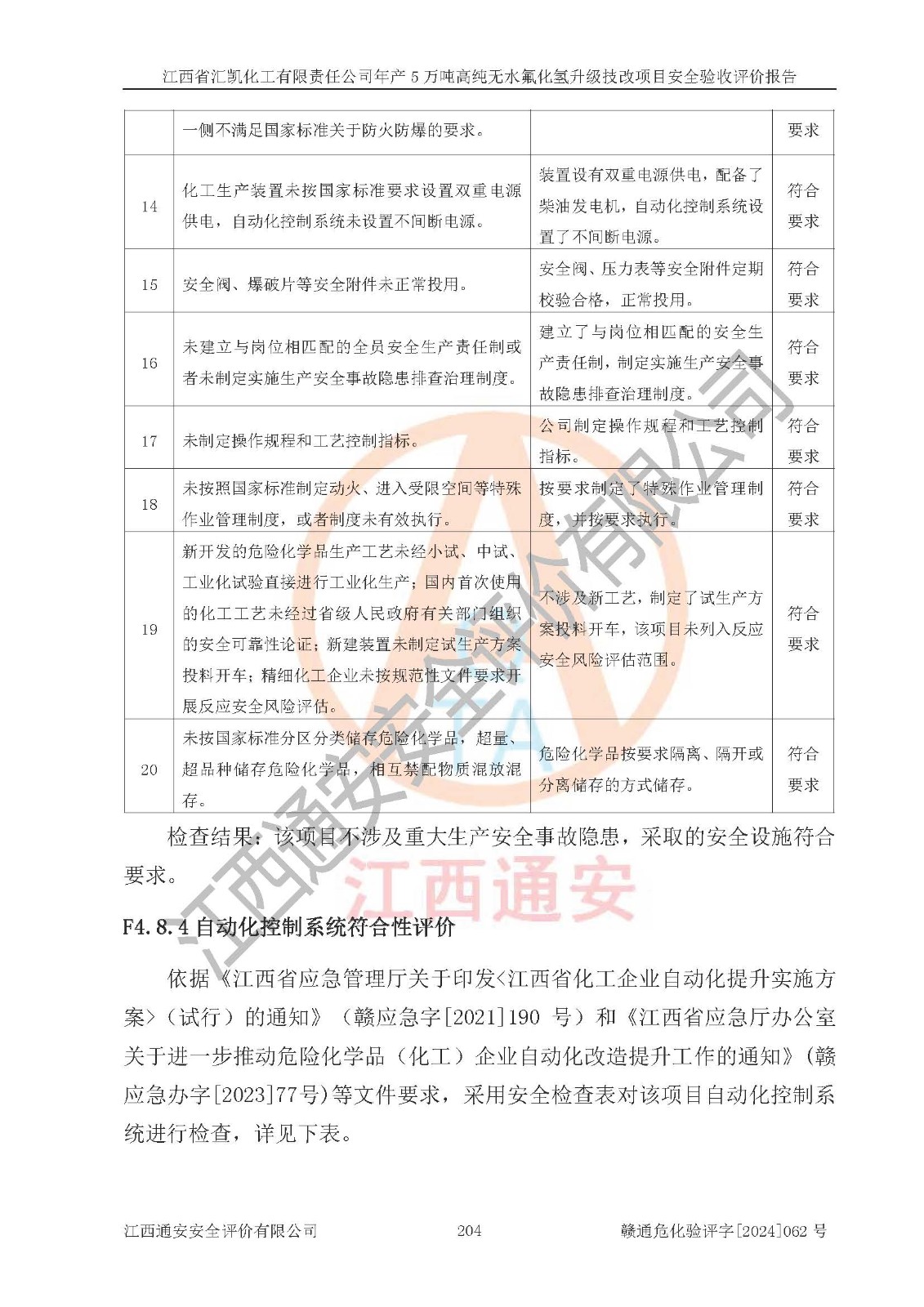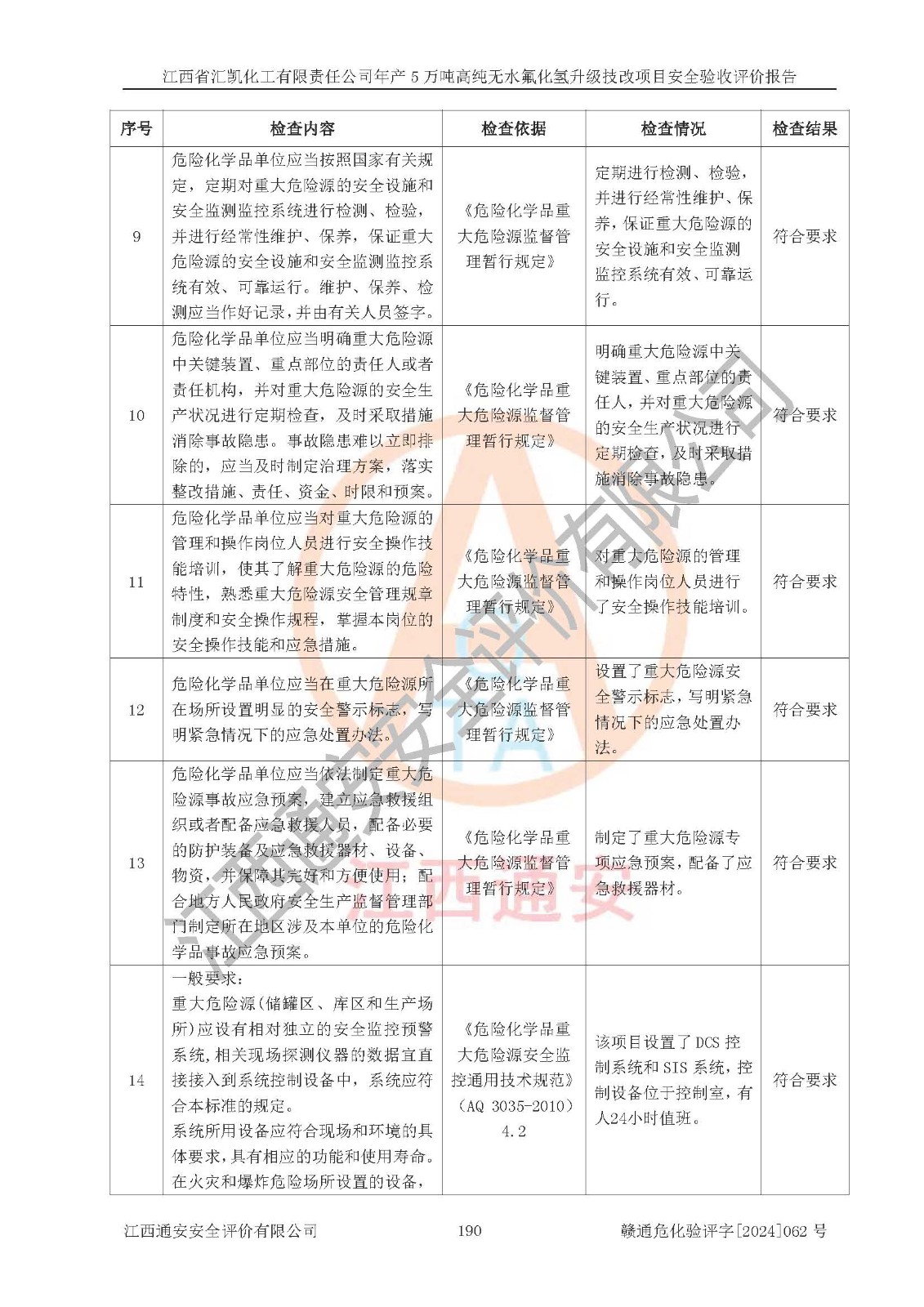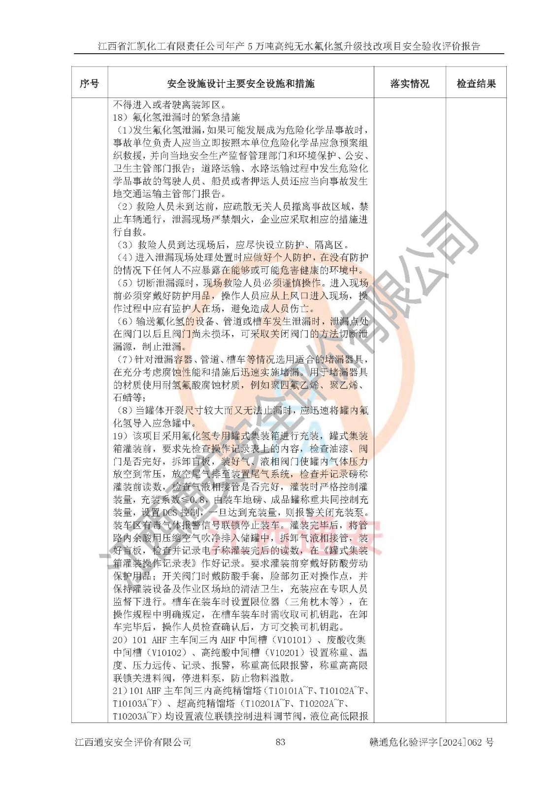 評價結(jié)論 | 江西省匯凱化工有限責任公司年產(chǎn)5萬噸高純無水氟化氫升級技改項目現(xiàn)場情況與設(shè)計圖紙一致,DCS系統(tǒng)和SIS系統(tǒng)符合設(shè)計要求、運行正常,主要負責人、安全管理人員等有關(guān)從業(yè)人員資質(zhì)符合《江西省危險化學品安全專項整治三年行動實施方案》要求,安全設(shè)施及安全管理符合**及有關(guān)部門關(guān)于安全生產(chǎn)法律、法規(guī)、標準的要求,該項目試生產(chǎn)以來,工藝設(shè)備運行正常,安全設(shè)施和采取的安全技術(shù)措施符合設(shè)計要求并達到預(yù)期結(jié)果,可以滿足建設(shè)項目安全生產(chǎn)的要求,安全生產(chǎn)管理**,具備了安全設(shè)施竣工驗收條件。 | ||||||