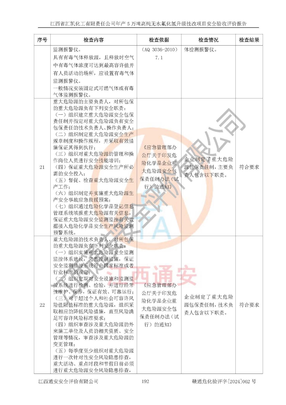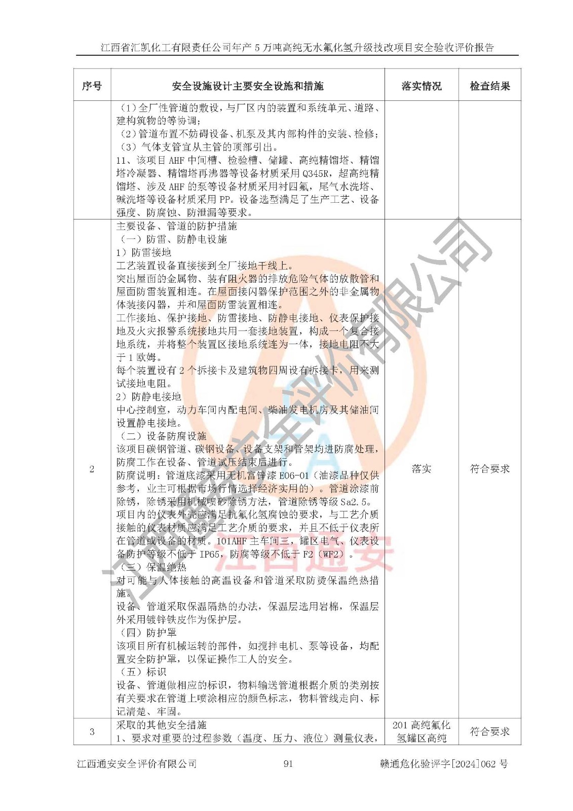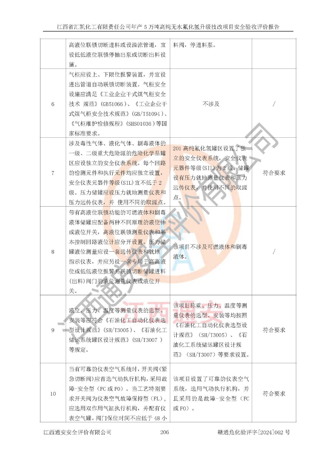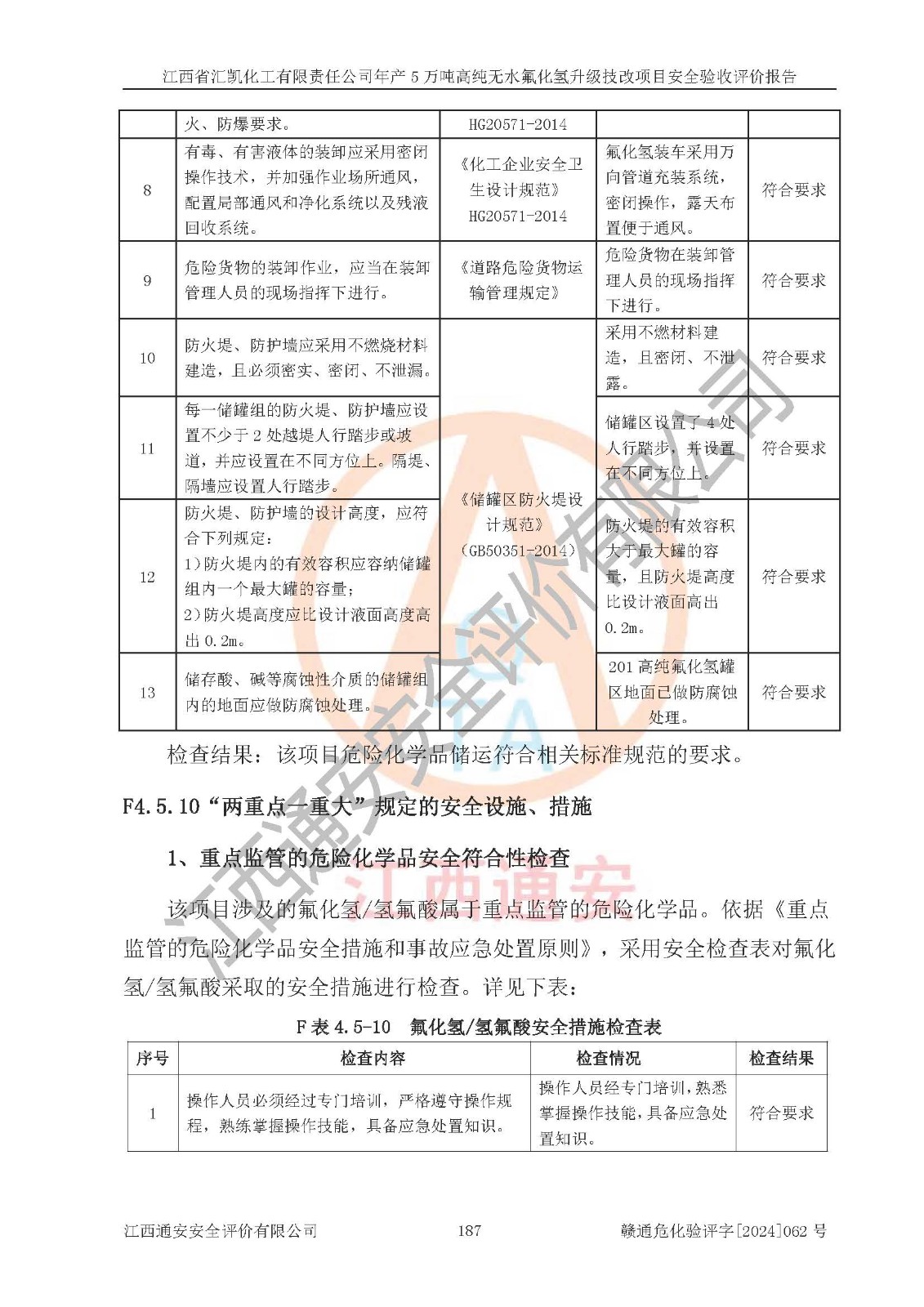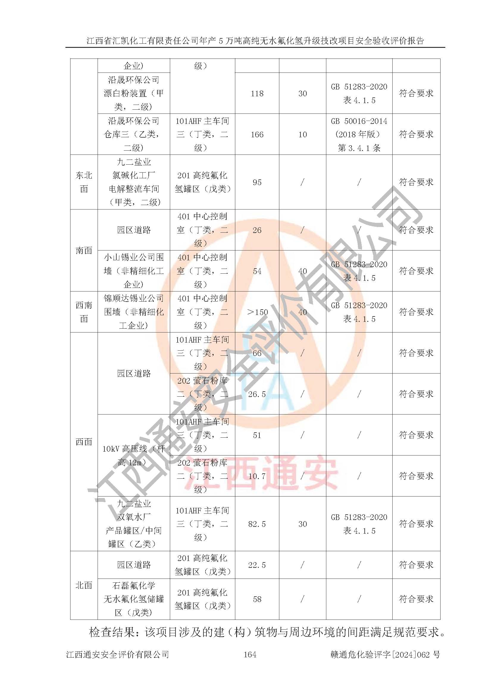 評價結(jié)論 | 江西省匯凱化工有限責任公司年產(chǎn)5萬噸高純無水氟化氫升級技改項目現(xiàn)場情況與設(shè)計圖紙一致,DCS系統(tǒng)和SIS系統(tǒng)符合設(shè)計要求、運行正常,主要負責人、安全管理人員等有關(guān)從業(yè)人員資質(zhì)符合《江西省危險化學品安全專項整治三年行動實施方案》要求,安全設(shè)施及安全管理符合**及有關(guān)部門關(guān)于安全生產(chǎn)法律、法規(guī)、標準的要求,該項目試生產(chǎn)以來,工藝設(shè)備運行正常,安全設(shè)施和采取的安全技術(shù)措施符合設(shè)計要求并達到預(yù)期結(jié)果,可以滿足建設(shè)項目安全生產(chǎn)的要求,安全生產(chǎn)管理**,具備了安全設(shè)施竣工驗收條件。 | ||||||
