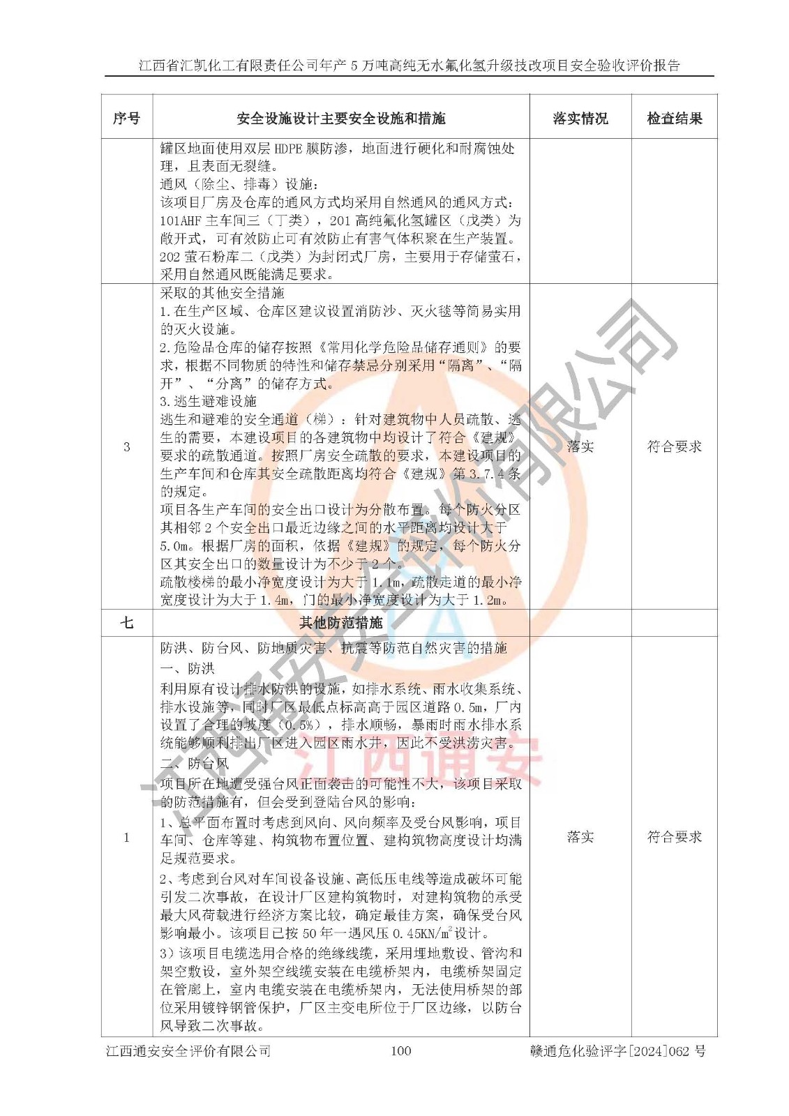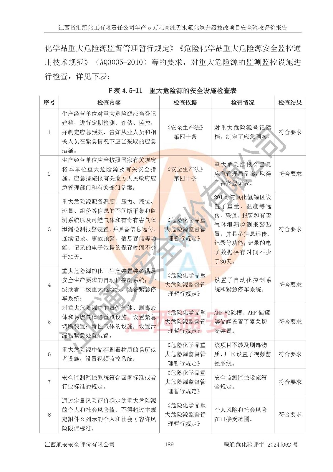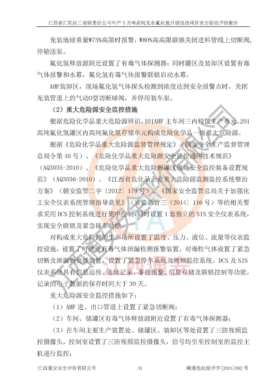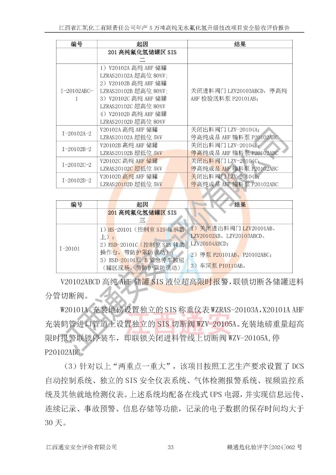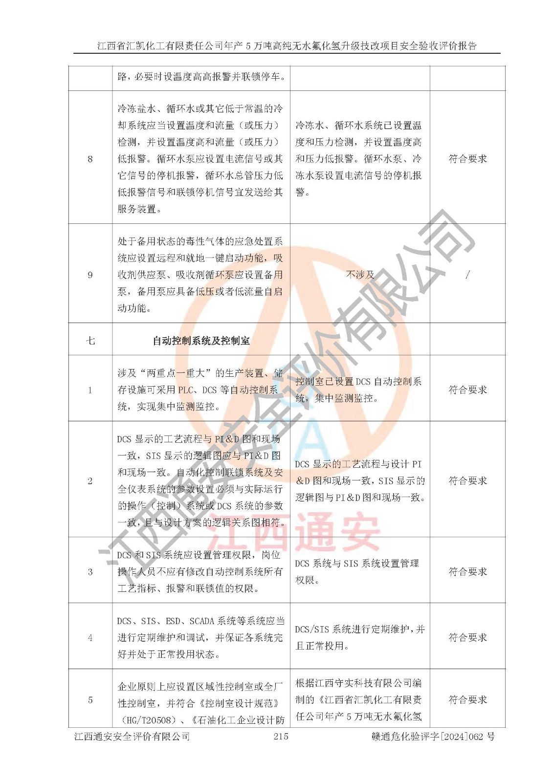評價結(jié)論 | 江西省匯凱化工有限責任公司年產(chǎn)5萬噸高純無水氟化氫升級技改項目現(xiàn)場情況與設(shè)計圖紙一致,DCS系統(tǒng)和SIS系統(tǒng)符合設(shè)計要求、運行正常,主要負責人、安全管理人員等有關(guān)從業(yè)人員資質(zhì)符合《江西省危險化學品安全專項整治三年行動實施方案》要求,安全設(shè)施及安全管理符合**及有關(guān)部門關(guān)于安全生產(chǎn)法律、法規(guī)、標準的要求,該項目試生產(chǎn)以來,工藝設(shè)備運行正常,安全設(shè)施和采取的安全技術(shù)措施符合設(shè)計要求并達到預(yù)期結(jié)果,可以滿足建設(shè)項目安全生產(chǎn)的要求,安全生產(chǎn)管理**,具備了安全設(shè)施竣工驗收條件。 | ||||||