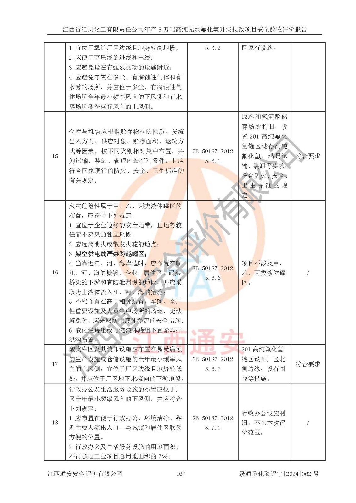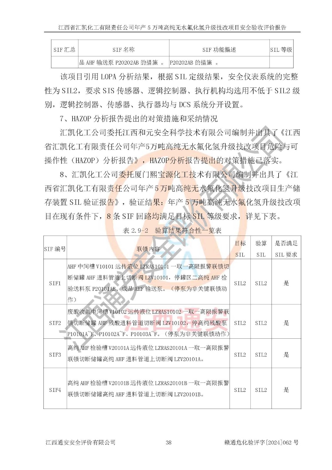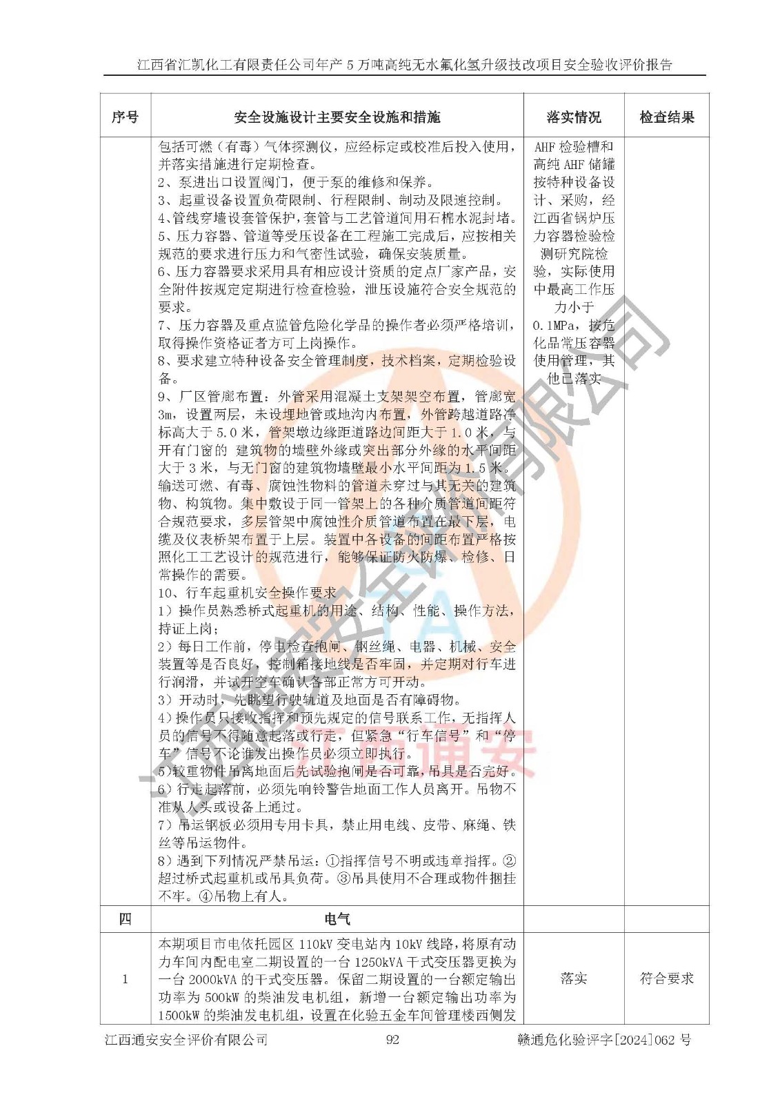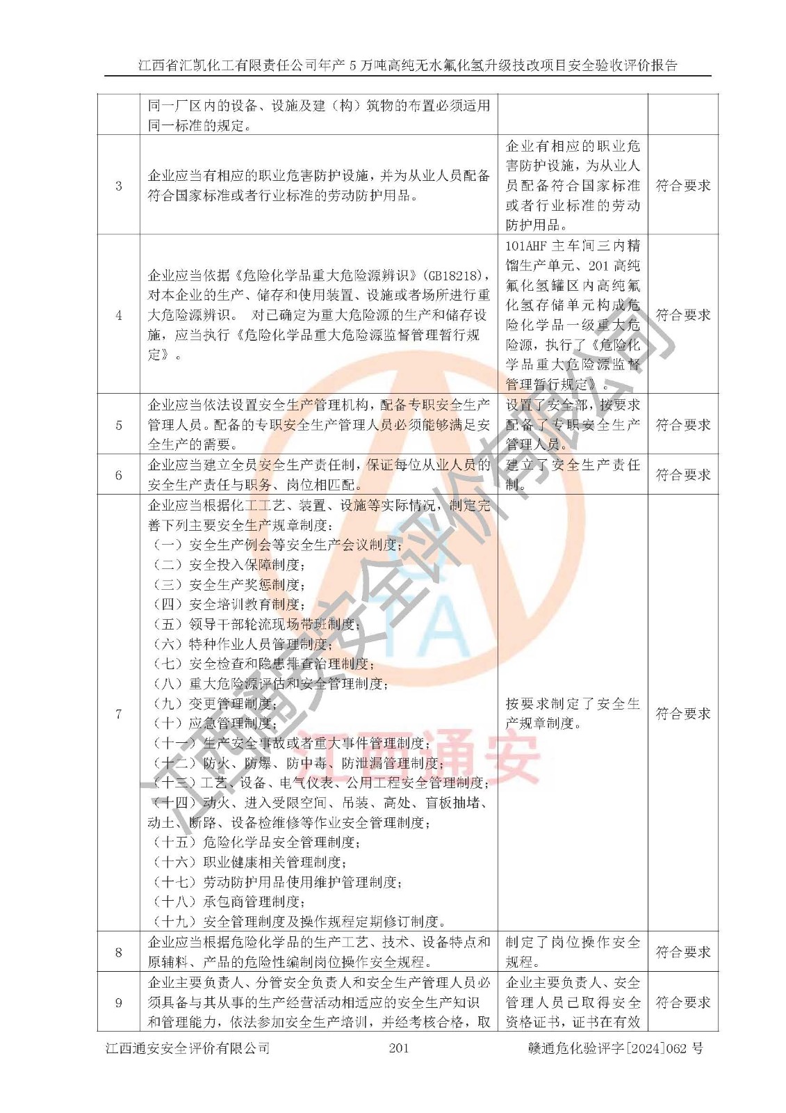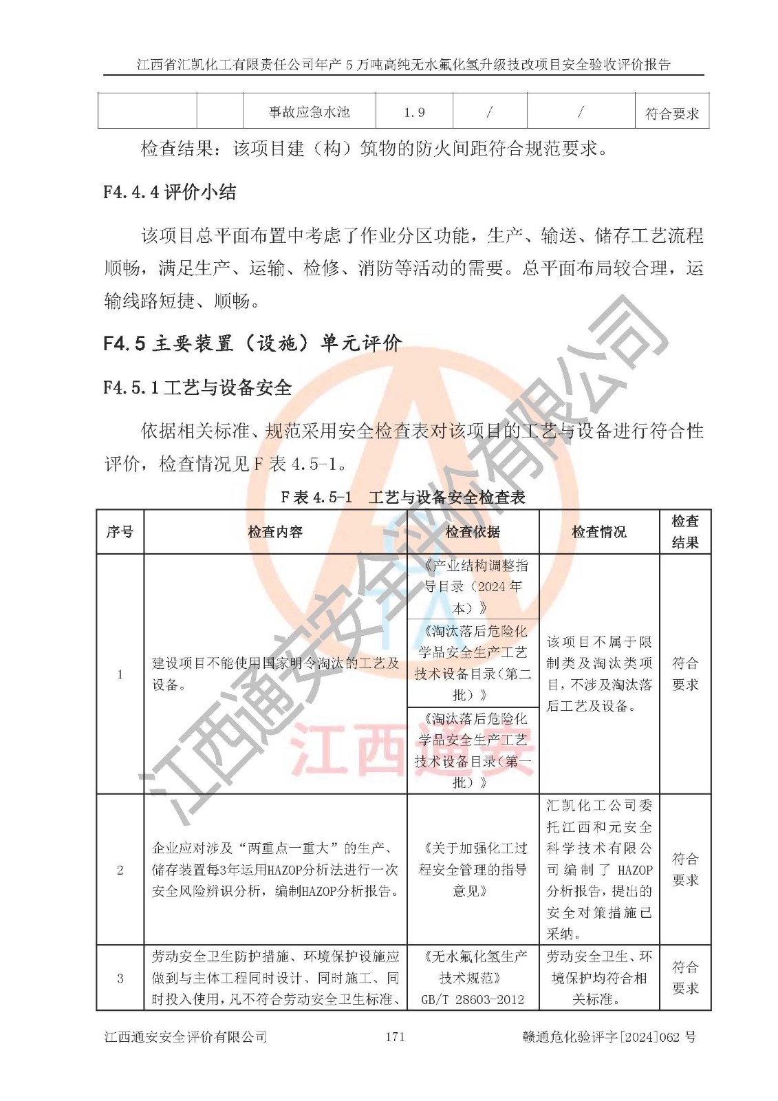 評價結(jié)論 | 江西省匯凱化工有限責任公司年產(chǎn)5萬噸高純無水氟化氫升級技改項目現(xiàn)場情況與設(shè)計圖紙一致,DCS系統(tǒng)和SIS系統(tǒng)符合設(shè)計要求、運行正常,主要負責人、安全管理人員等有關(guān)從業(yè)人員資質(zhì)符合《江西省危險化學品安全專項整治三年行動實施方案》要求,安全設(shè)施及安全管理符合**及有關(guān)部門關(guān)于安全生產(chǎn)法律、法規(guī)、標準的要求,該項目試生產(chǎn)以來,工藝設(shè)備運行正常,安全設(shè)施和采取的安全技術(shù)措施符合設(shè)計要求并達到預(yù)期結(jié)果,可以滿足建設(shè)項目安全生產(chǎn)的要求,安全生產(chǎn)管理**,具備了安全設(shè)施竣工驗收條件。 | ||||||