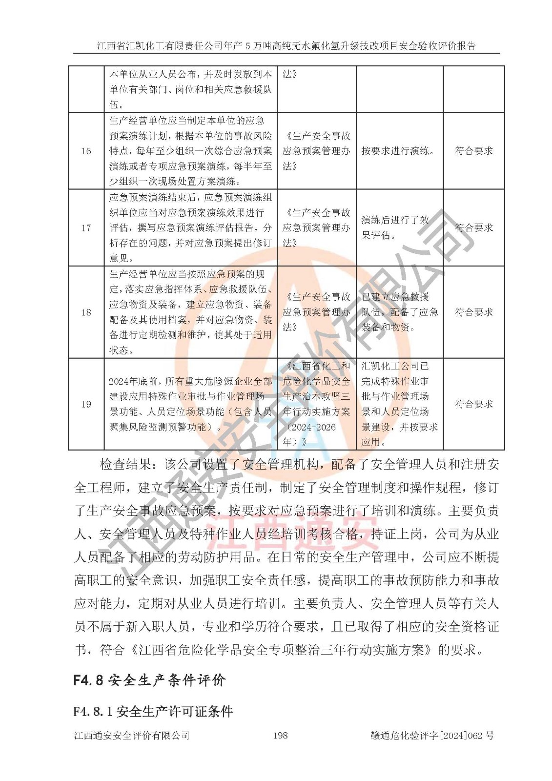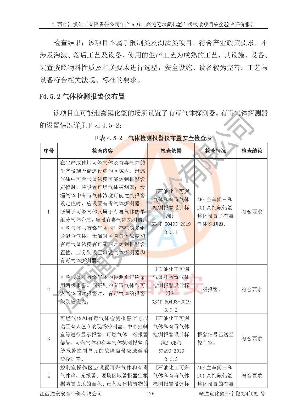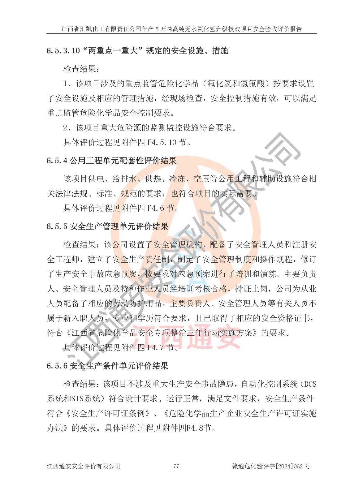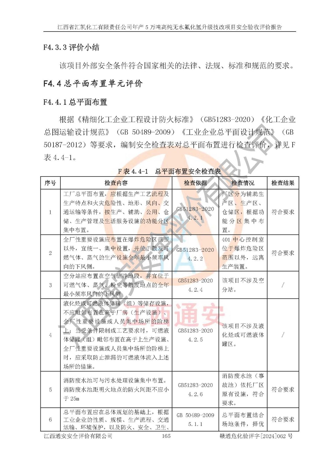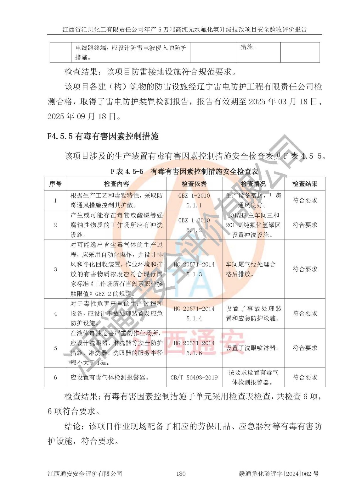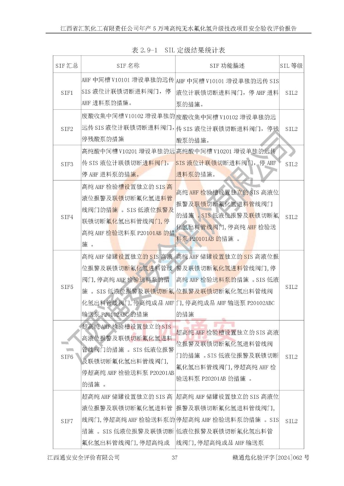 評價結(jié)論 | 江西省匯凱化工有限責任公司年產(chǎn)5萬噸高純無水氟化氫升級技改項目現(xiàn)場情況與設(shè)計圖紙一致,DCS系統(tǒng)和SIS系統(tǒng)符合設(shè)計要求、運行正常,主要負責人、安全管理人員等有關(guān)從業(yè)人員資質(zhì)符合《江西省危險化學品安全專項整治三年行動實施方案》要求,安全設(shè)施及安全管理符合**及有關(guān)部門關(guān)于安全生產(chǎn)法律、法規(guī)、標準的要求,該項目試生產(chǎn)以來,工藝設(shè)備運行正常,安全設(shè)施和采取的安全技術(shù)措施符合設(shè)計要求并達到預(yù)期結(jié)果,可以滿足建設(shè)項目安全生產(chǎn)的要求,安全生產(chǎn)管理**,具備了安全設(shè)施竣工驗收條件。 | ||||||