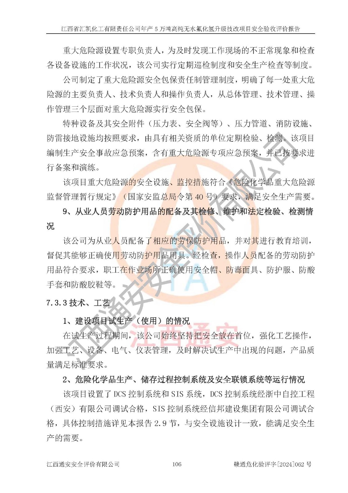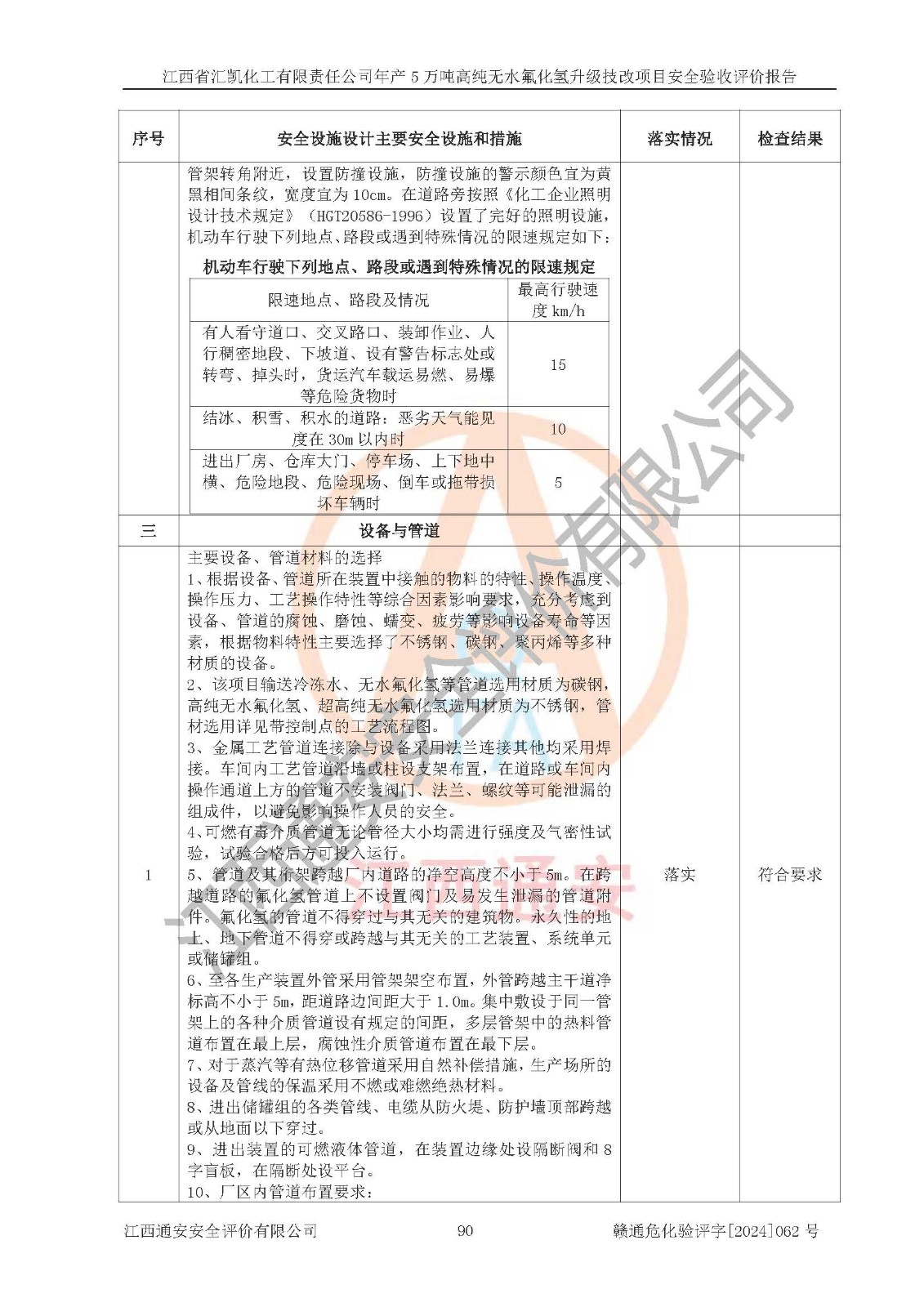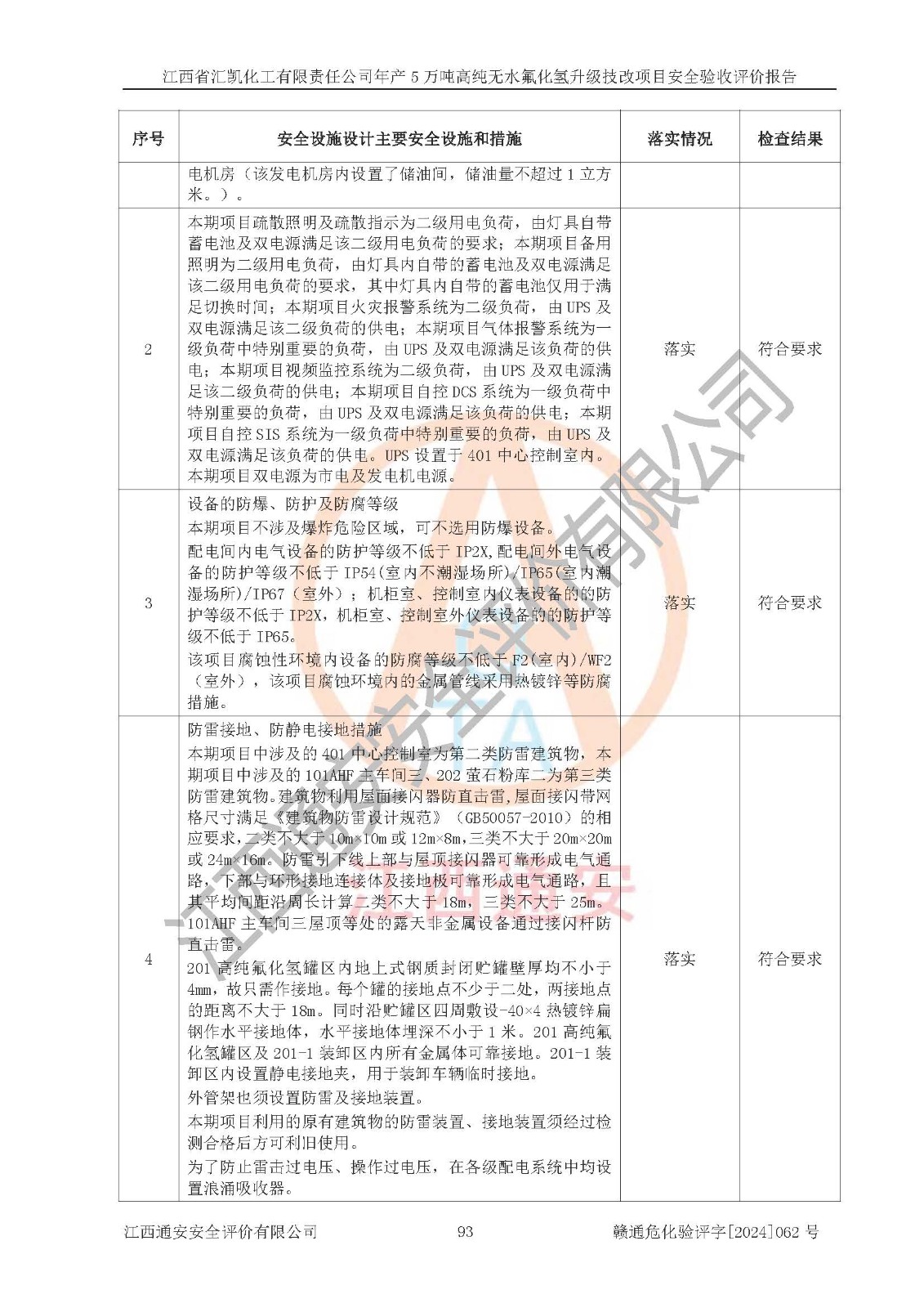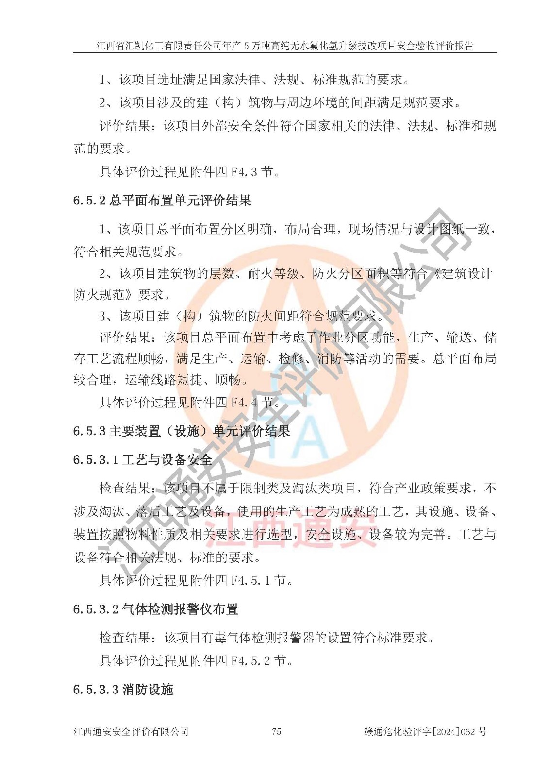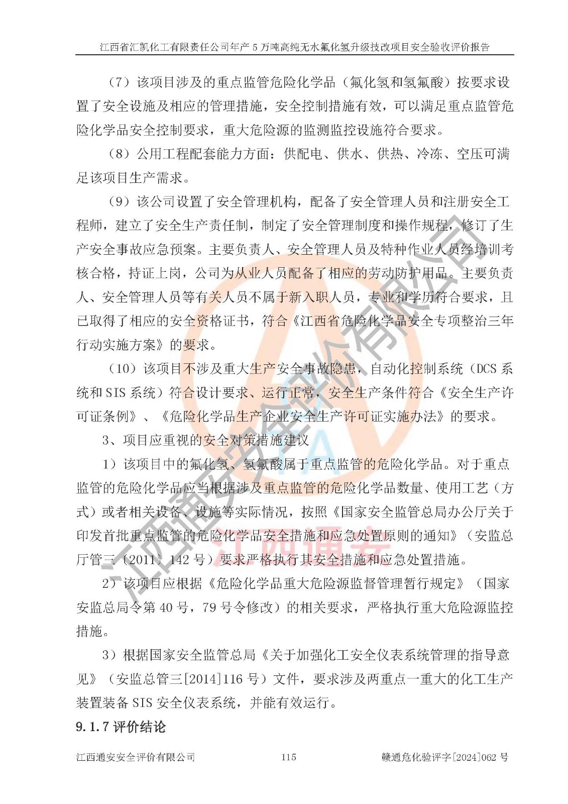 評價結(jié)論 | 江西省匯凱化工有限責任公司年產(chǎn)5萬噸高純無水氟化氫升級技改項目現(xiàn)場情況與設(shè)計圖紙一致,DCS系統(tǒng)和SIS系統(tǒng)符合設(shè)計要求、運行正常,主要負責人、安全管理人員等有關(guān)從業(yè)人員資質(zhì)符合《江西省危險化學品安全專項整治三年行動實施方案》要求,安全設(shè)施及安全管理符合**及有關(guān)部門關(guān)于安全生產(chǎn)法律、法規(guī)、標準的要求,該項目試生產(chǎn)以來,工藝設(shè)備運行正常,安全設(shè)施和采取的安全技術(shù)措施符合設(shè)計要求并達到預(yù)期結(jié)果,可以滿足建設(shè)項目安全生產(chǎn)的要求,安全生產(chǎn)管理**,具備了安全設(shè)施竣工驗收條件。 | ||||||