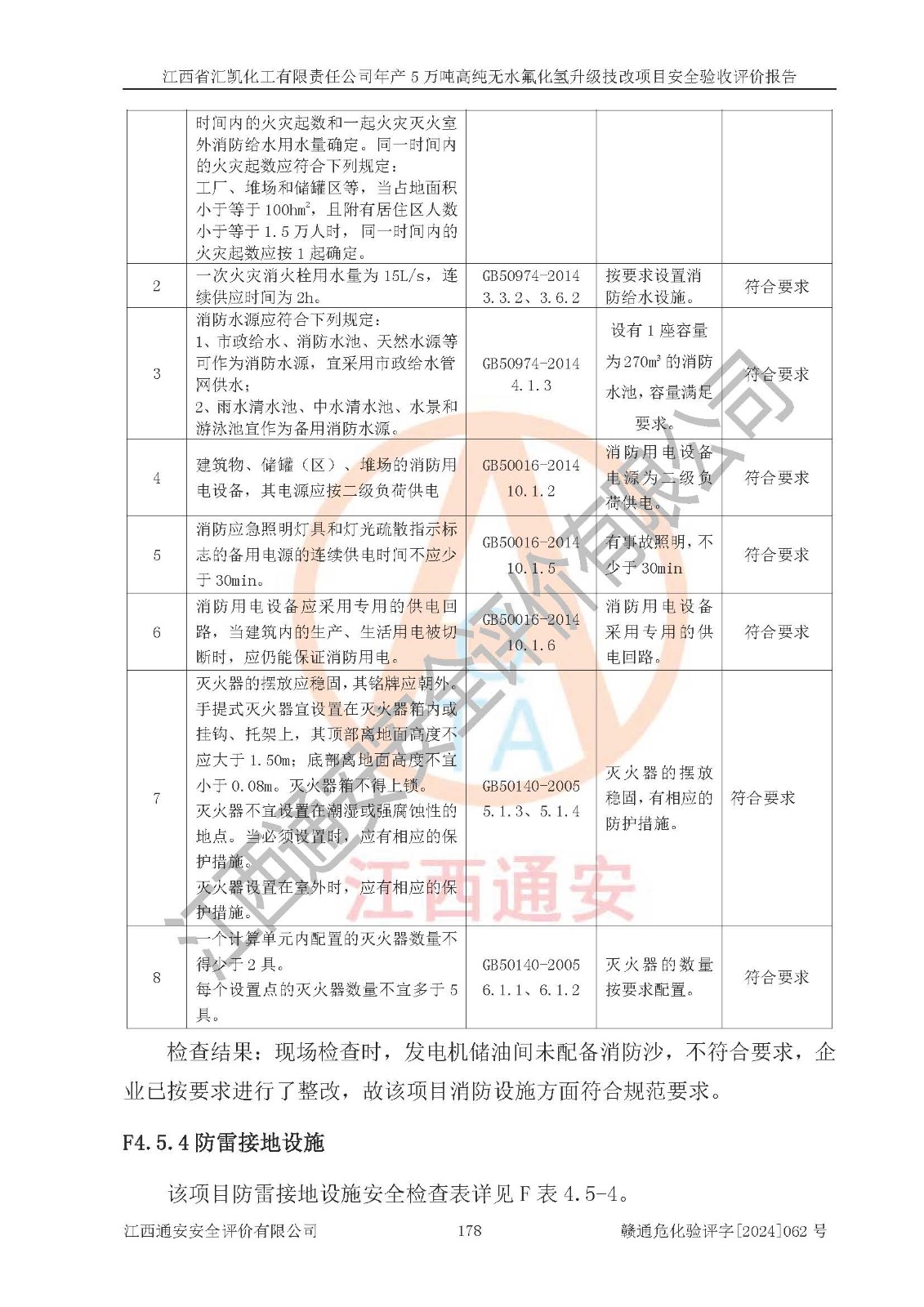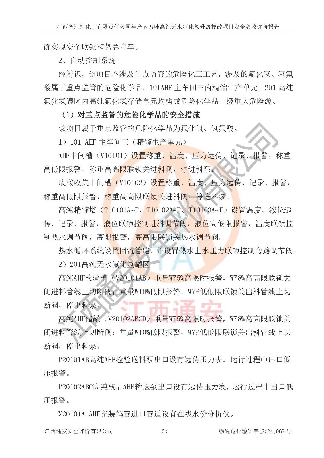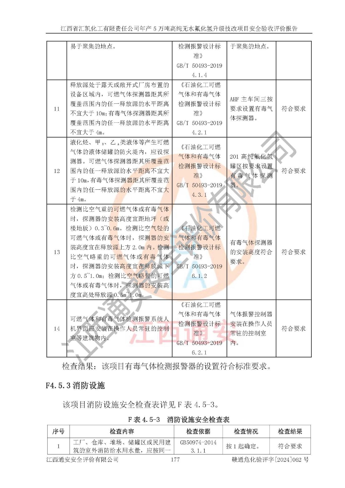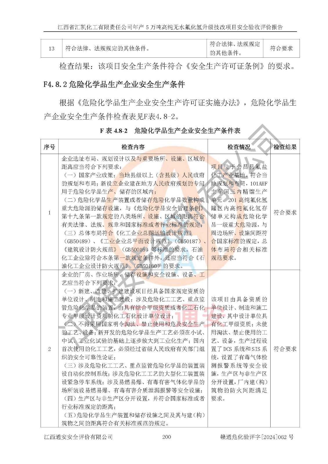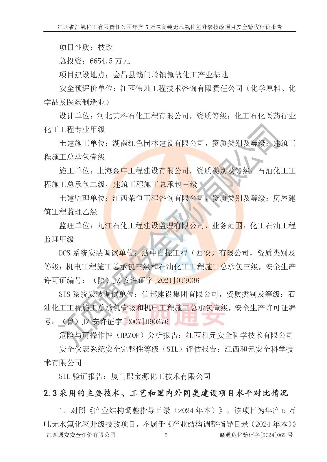 評價結(jié)論 | 江西省匯凱化工有限責任公司年產(chǎn)5萬噸高純無水氟化氫升級技改項目現(xiàn)場情況與設(shè)計圖紙一致,DCS系統(tǒng)和SIS系統(tǒng)符合設(shè)計要求、運行正常,主要負責人、安全管理人員等有關(guān)從業(yè)人員資質(zhì)符合《江西省危險化學品安全專項整治三年行動實施方案》要求,安全設(shè)施及安全管理符合**及有關(guān)部門關(guān)于安全生產(chǎn)法律、法規(guī)、標準的要求,該項目試生產(chǎn)以來,工藝設(shè)備運行正常,安全設(shè)施和采取的安全技術(shù)措施符合設(shè)計要求并達到預(yù)期結(jié)果,可以滿足建設(shè)項目安全生產(chǎn)的要求,安全生產(chǎn)管理**,具備了安全設(shè)施竣工驗收條件。 | ||||||