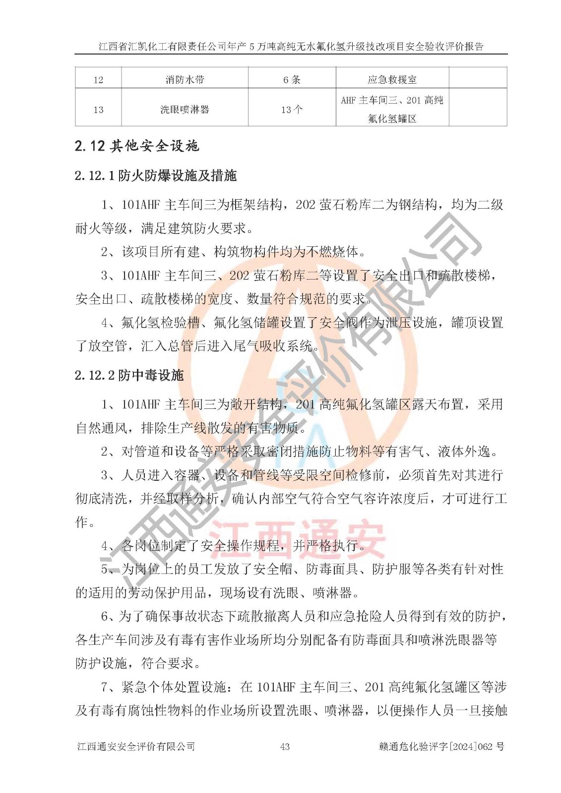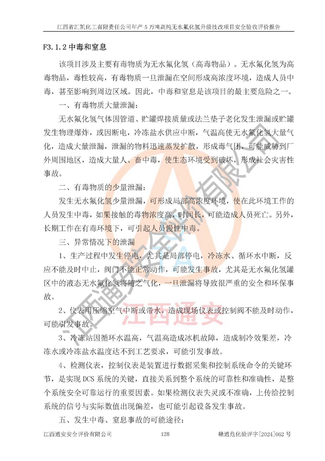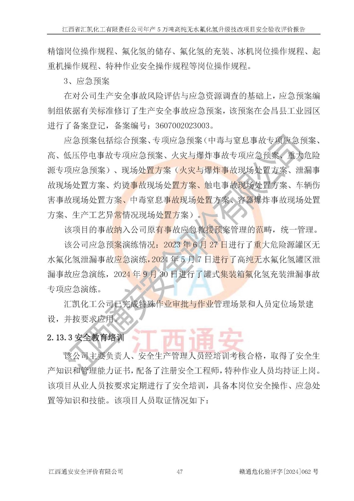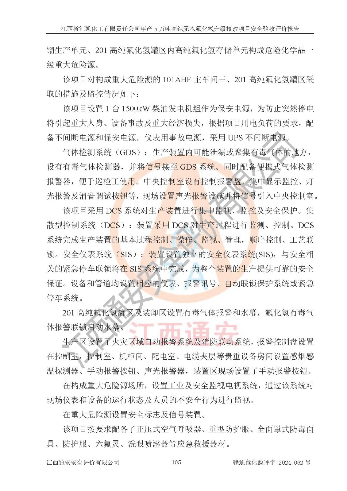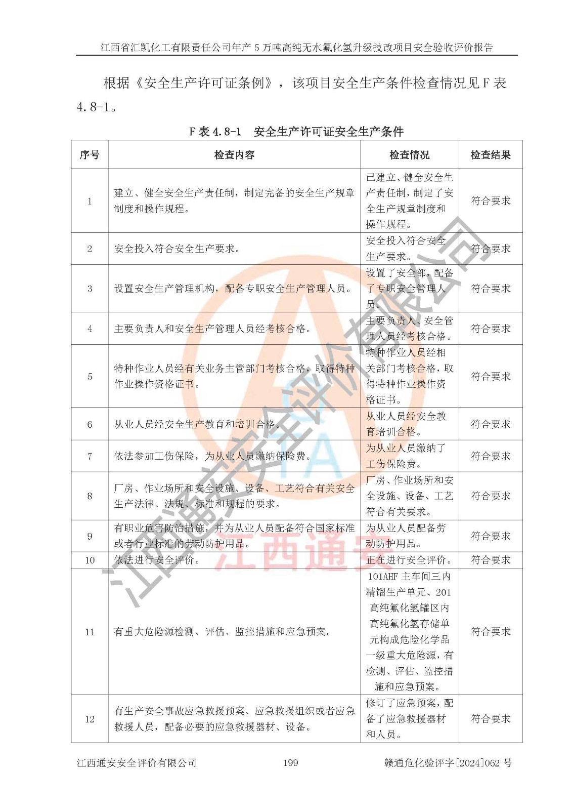 評價結(jié)論 | 江西省匯凱化工有限責任公司年產(chǎn)5萬噸高純無水氟化氫升級技改項目現(xiàn)場情況與設(shè)計圖紙一致,DCS系統(tǒng)和SIS系統(tǒng)符合設(shè)計要求、運行正常,主要負責人、安全管理人員等有關(guān)從業(yè)人員資質(zhì)符合《江西省危險化學品安全專項整治三年行動實施方案》要求,安全設(shè)施及安全管理符合**及有關(guān)部門關(guān)于安全生產(chǎn)法律、法規(guī)、標準的要求,該項目試生產(chǎn)以來,工藝設(shè)備運行正常,安全設(shè)施和采取的安全技術(shù)措施符合設(shè)計要求并達到預(yù)期結(jié)果,可以滿足建設(shè)項目安全生產(chǎn)的要求,安全生產(chǎn)管理**,具備了安全設(shè)施竣工驗收條件。 | ||||||