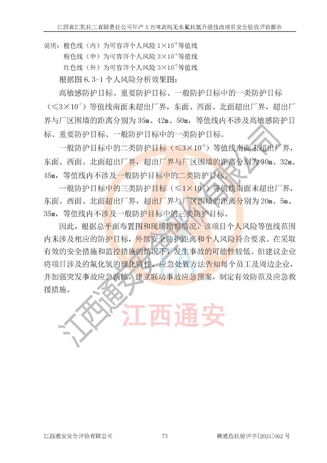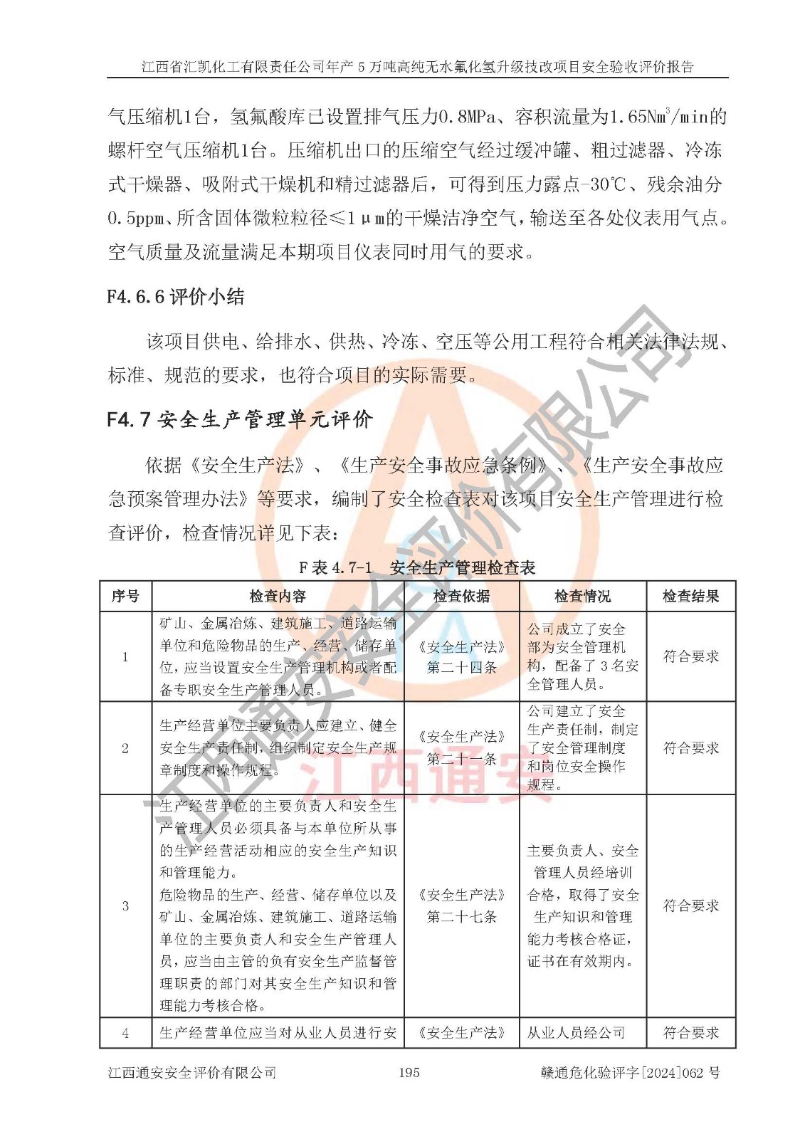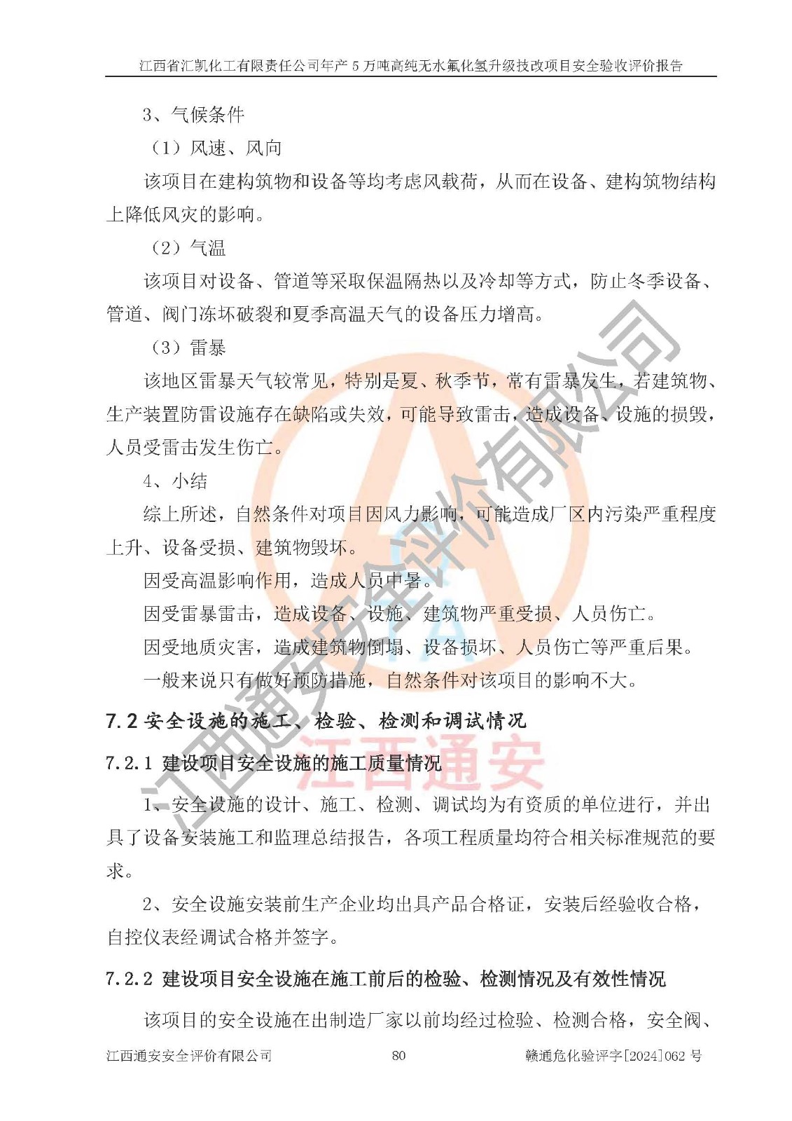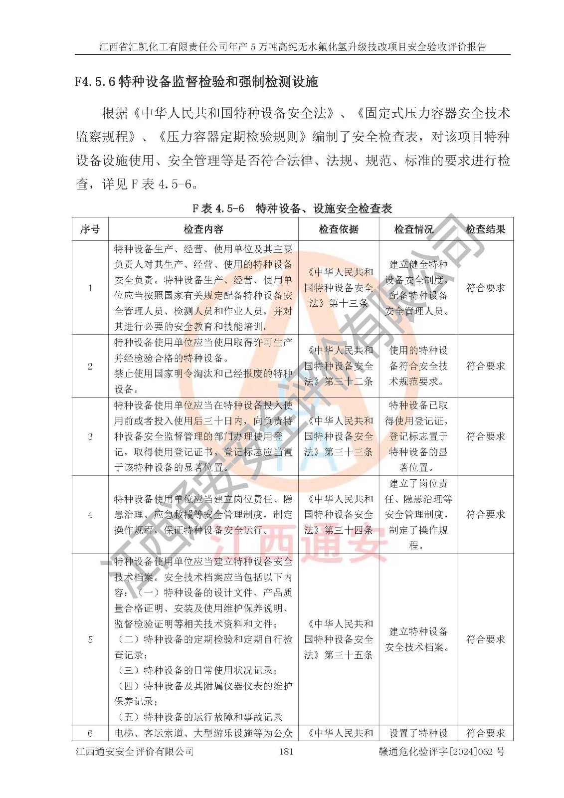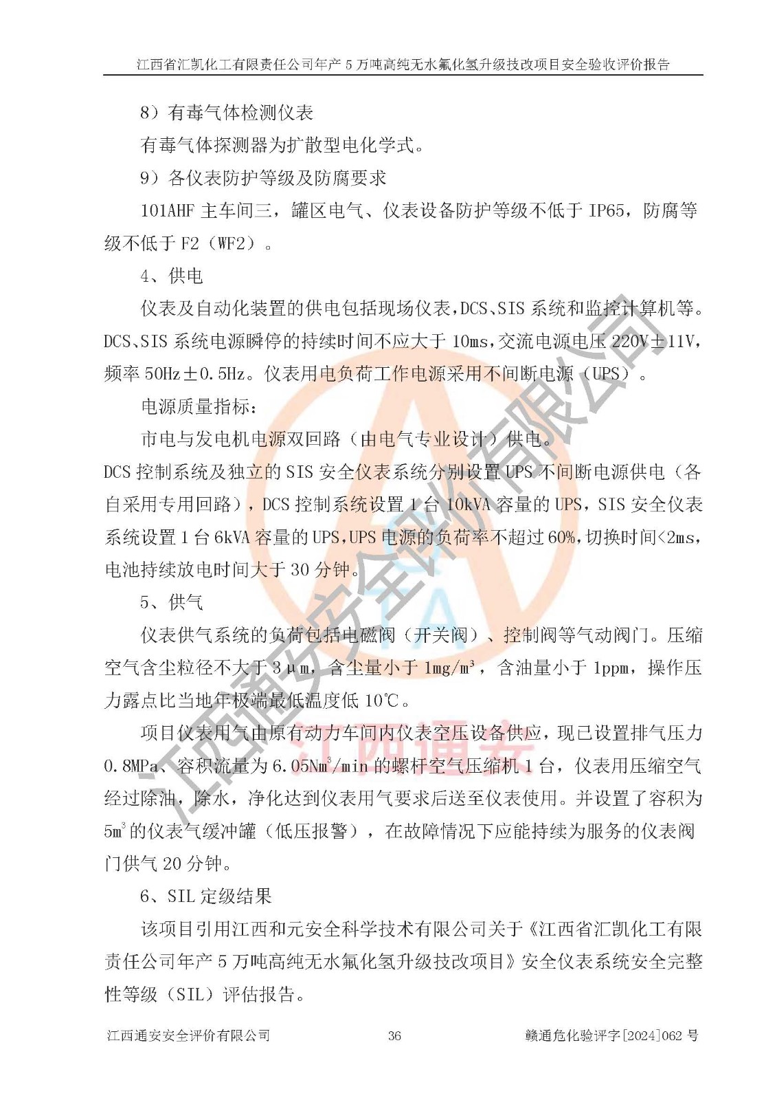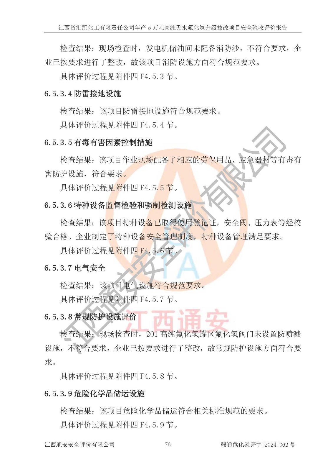 評價結(jié)論 | 江西省匯凱化工有限責任公司年產(chǎn)5萬噸高純無水氟化氫升級技改項目現(xiàn)場情況與設(shè)計圖紙一致,DCS系統(tǒng)和SIS系統(tǒng)符合設(shè)計要求、運行正常,主要負責人、安全管理人員等有關(guān)從業(yè)人員資質(zhì)符合《江西省危險化學品安全專項整治三年行動實施方案》要求,安全設(shè)施及安全管理符合**及有關(guān)部門關(guān)于安全生產(chǎn)法律、法規(guī)、標準的要求,該項目試生產(chǎn)以來,工藝設(shè)備運行正常,安全設(shè)施和采取的安全技術(shù)措施符合設(shè)計要求并達到預(yù)期結(jié)果,可以滿足建設(shè)項目安全生產(chǎn)的要求,安全生產(chǎn)管理**,具備了安全設(shè)施竣工驗收條件。 | ||||||