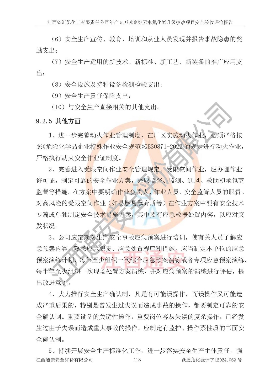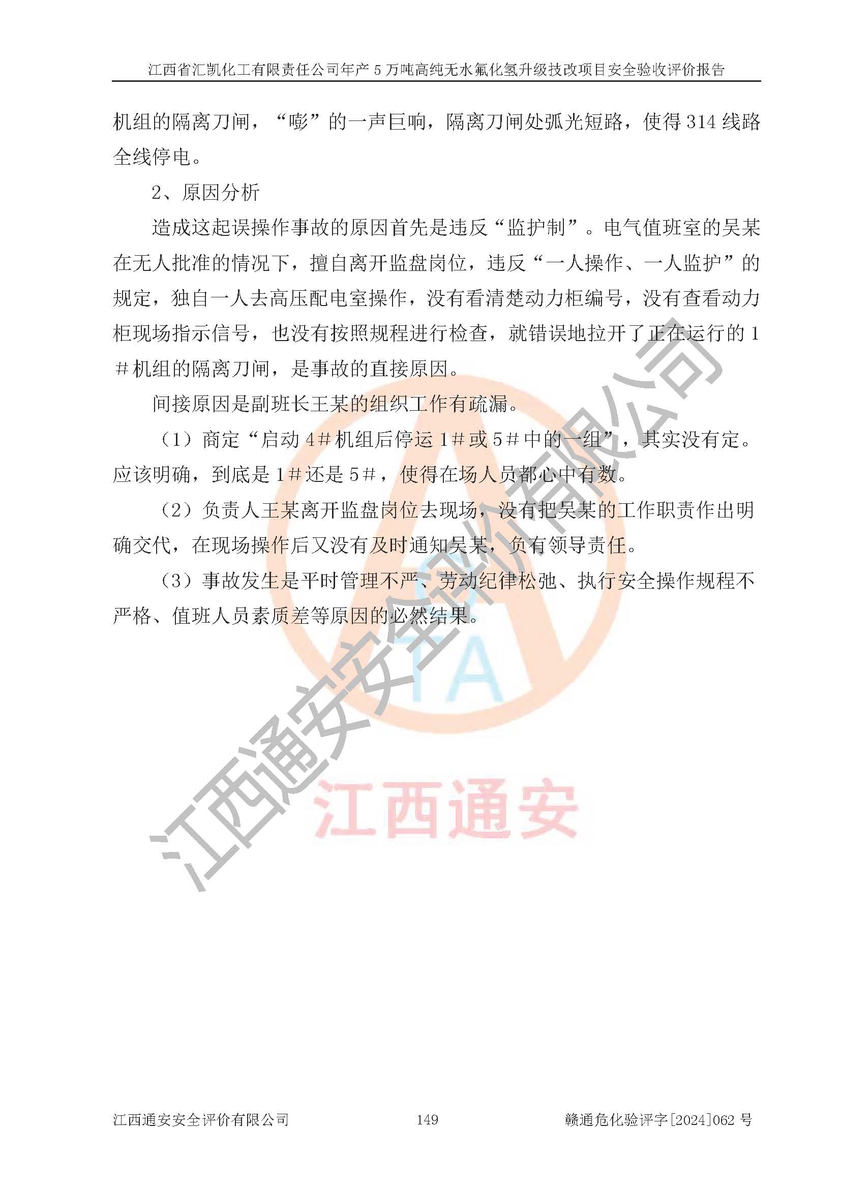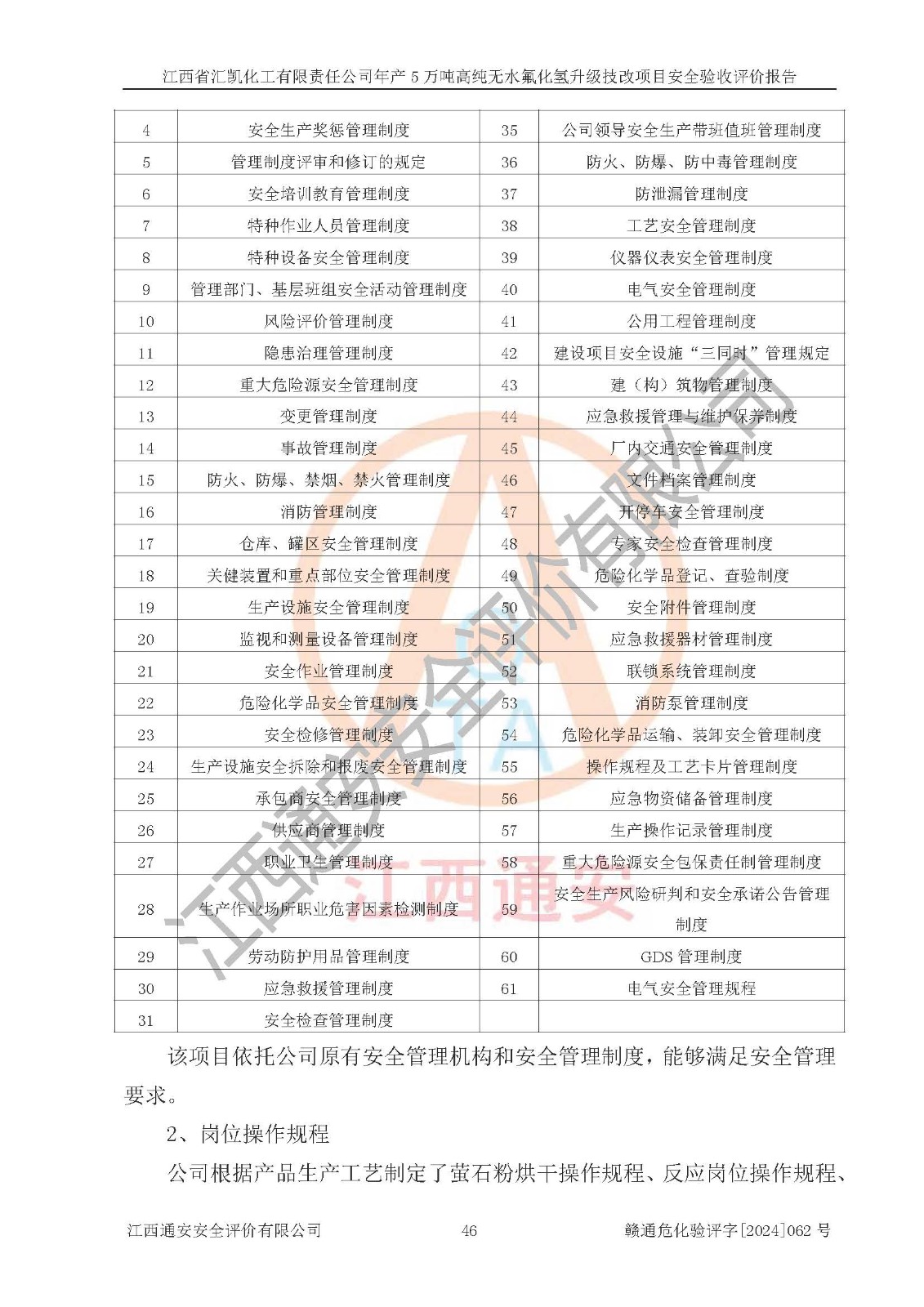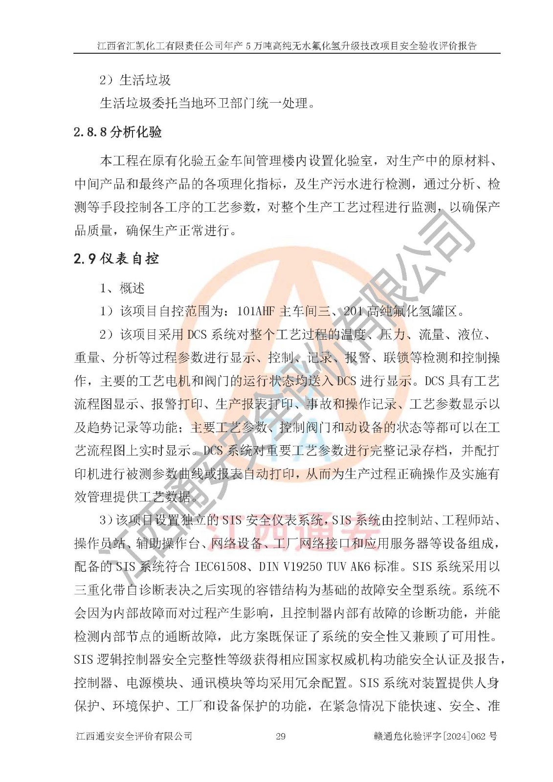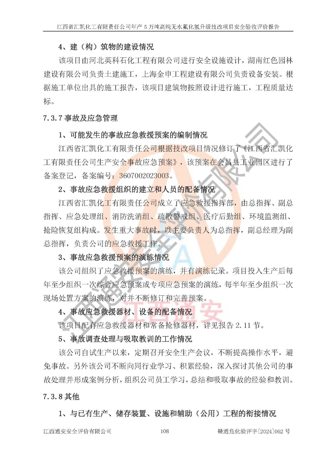 評價結(jié)論 | 江西省匯凱化工有限責任公司年產(chǎn)5萬噸高純無水氟化氫升級技改項目現(xiàn)場情況與設(shè)計圖紙一致,DCS系統(tǒng)和SIS系統(tǒng)符合設(shè)計要求、運行正常,主要負責人、安全管理人員等有關(guān)從業(yè)人員資質(zhì)符合《江西省危險化學品安全專項整治三年行動實施方案》要求,安全設(shè)施及安全管理符合**及有關(guān)部門關(guān)于安全生產(chǎn)法律、法規(guī)、標準的要求,該項目試生產(chǎn)以來,工藝設(shè)備運行正常,安全設(shè)施和采取的安全技術(shù)措施符合設(shè)計要求并達到預(yù)期結(jié)果,可以滿足建設(shè)項目安全生產(chǎn)的要求,安全生產(chǎn)管理**,具備了安全設(shè)施竣工驗收條件。 | ||||||