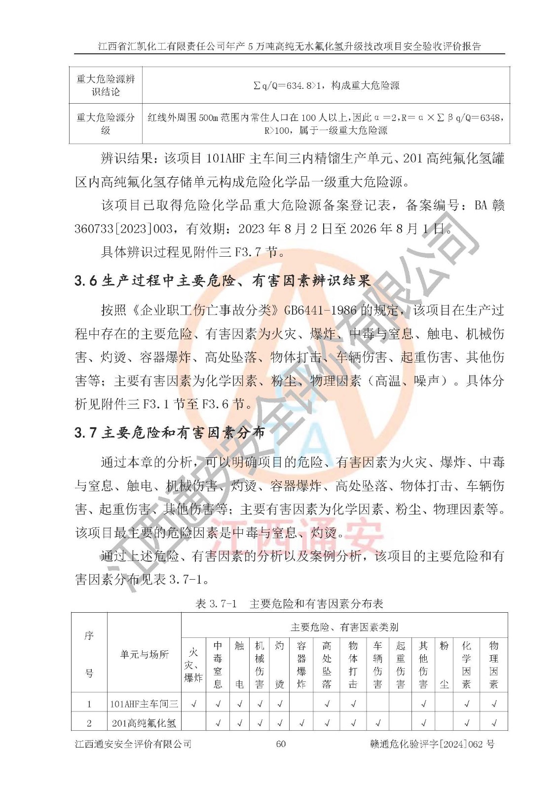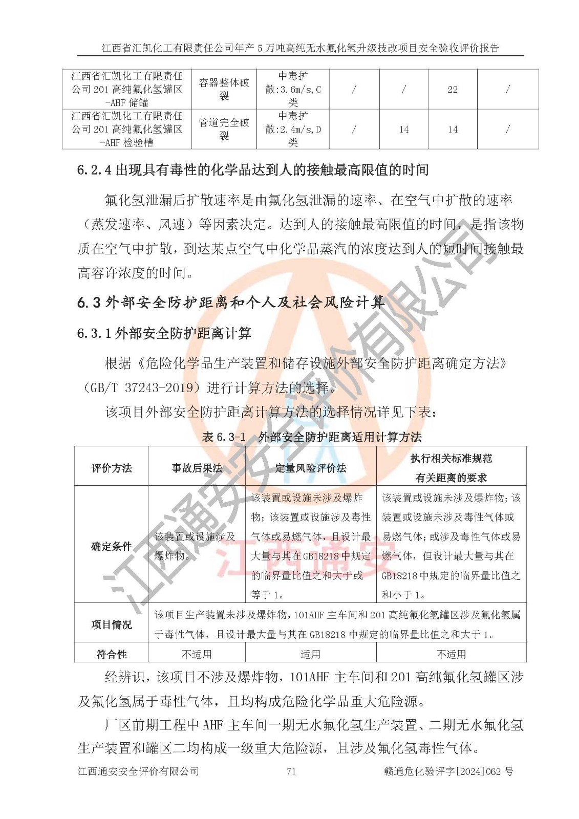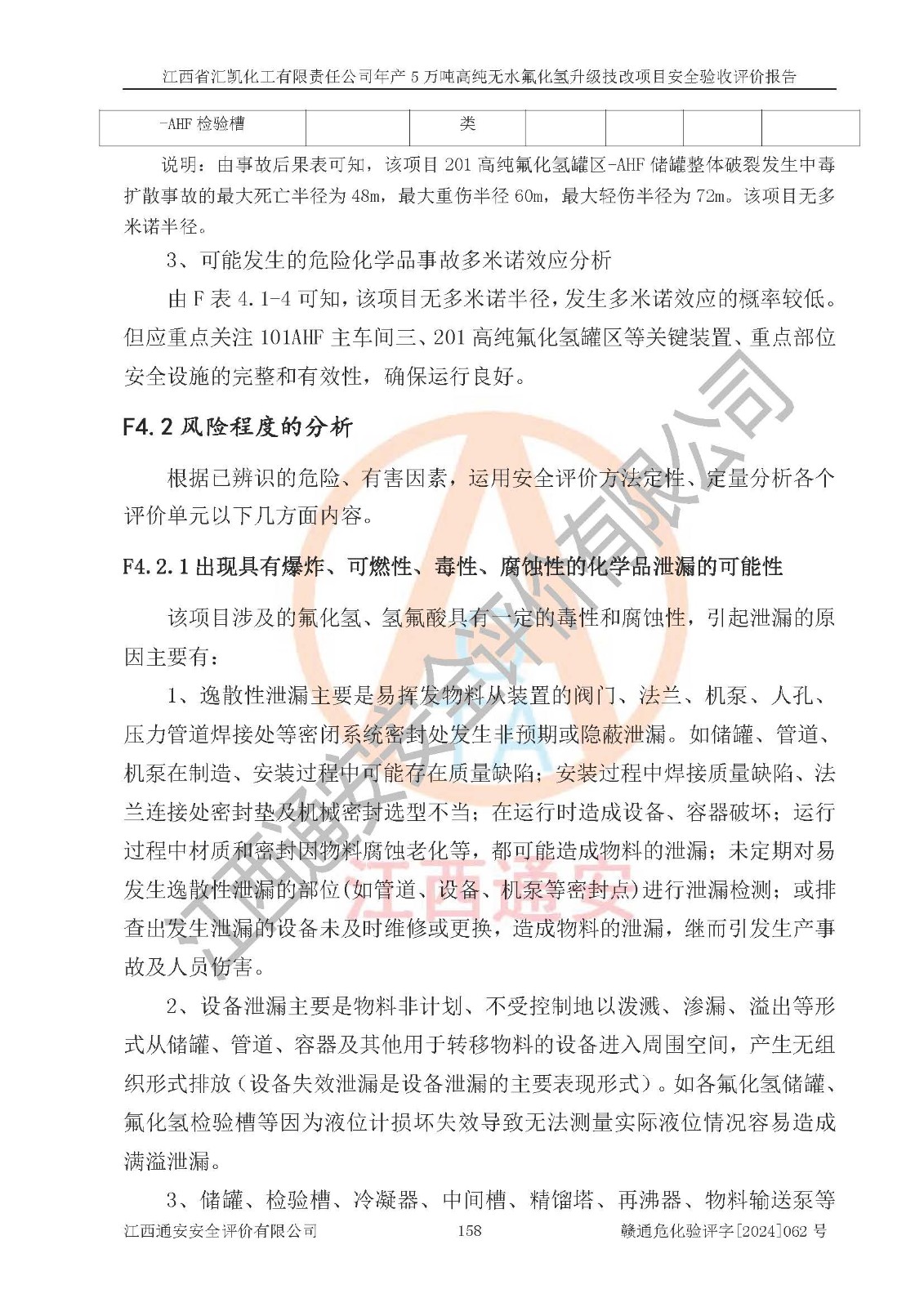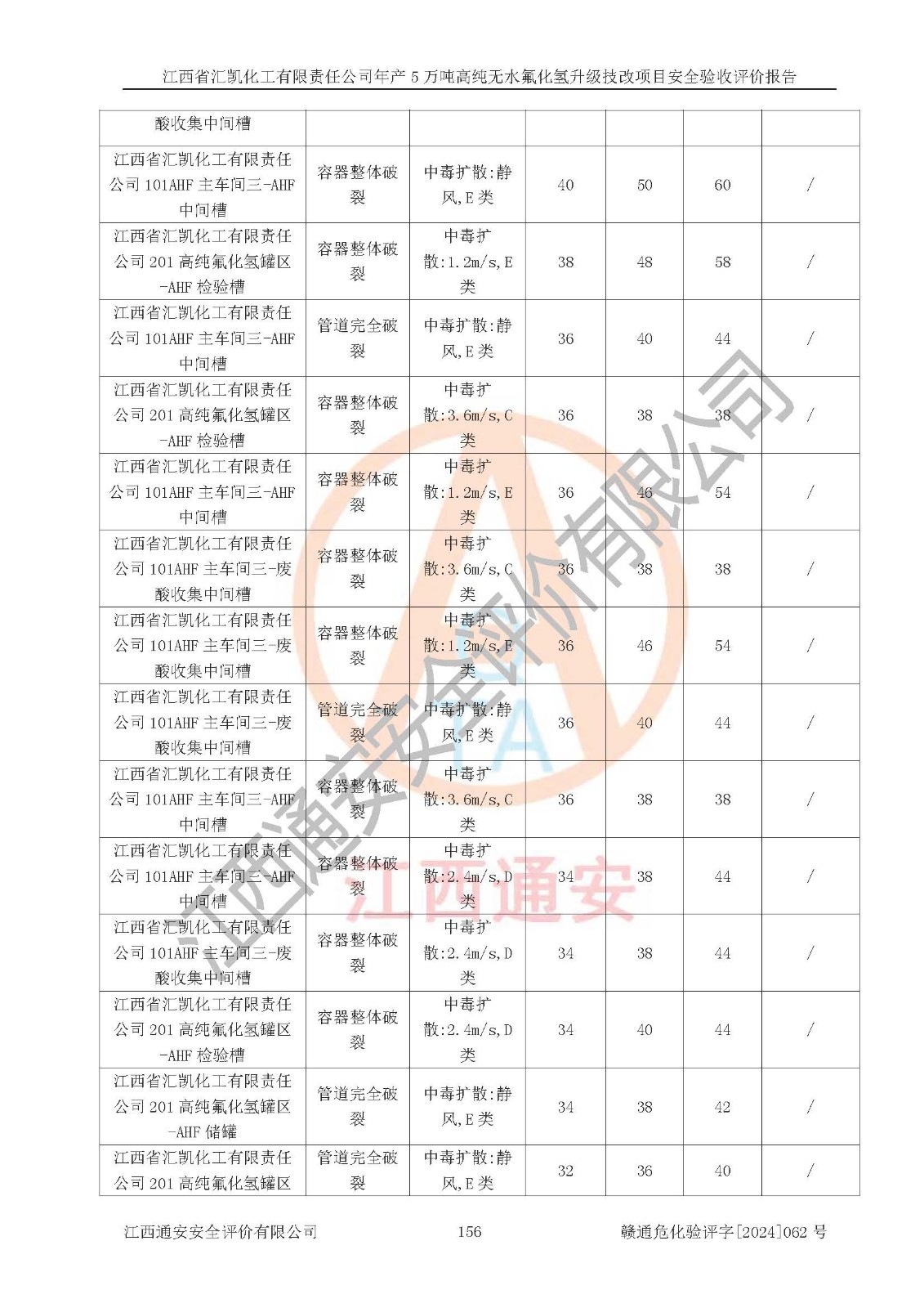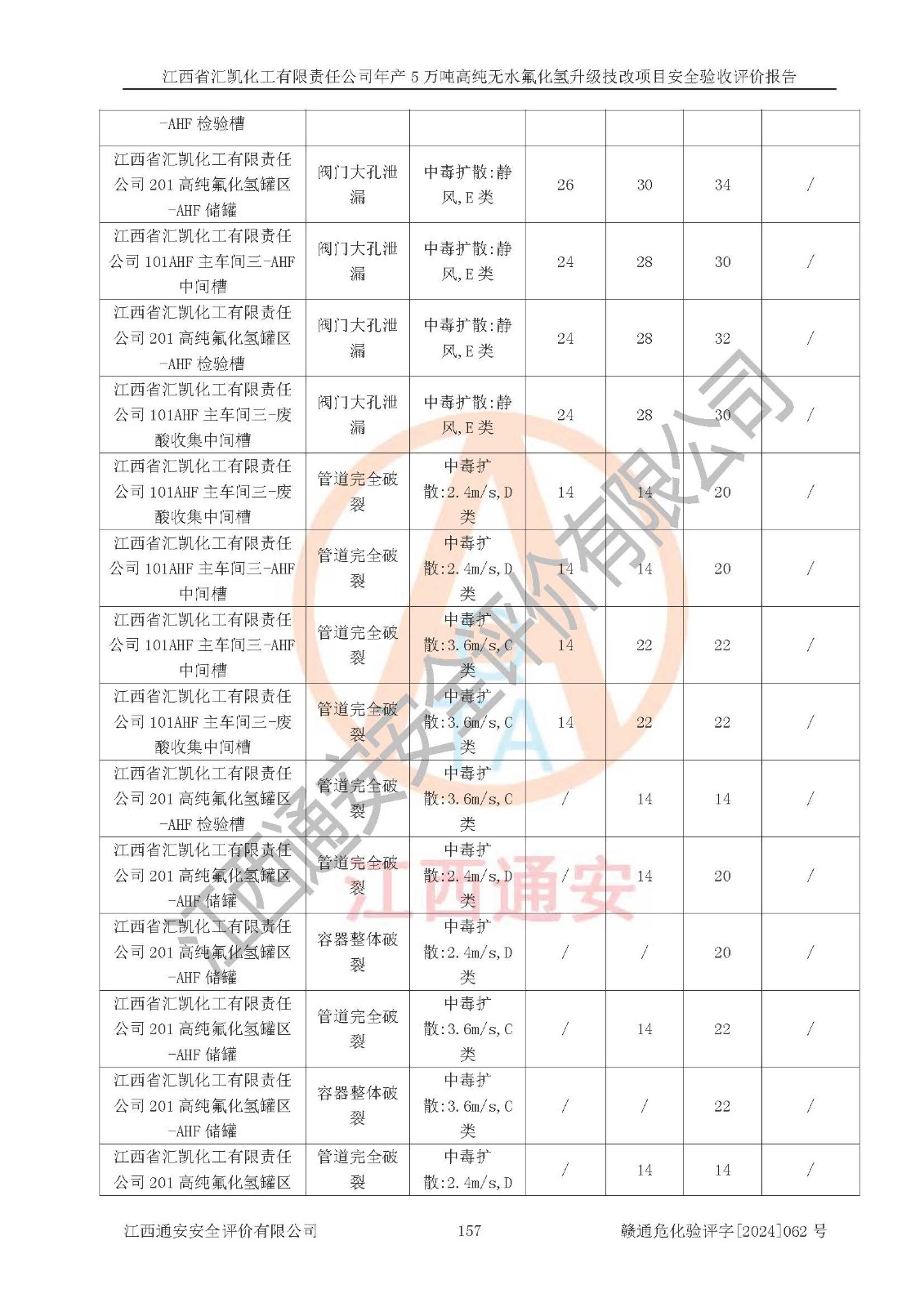 項目簡介 | 江西省匯凱化工有限責任公司(以下簡稱“匯凱化工”)成立于2017年08月08日,注冊地址位于江西省贛州市會昌縣筠門嶺鎮(zhèn)九二工業(yè)基地,法定**人為張裕生,注冊資本壹億元整,經(jīng)營范圍為危險化學品生產(chǎn)、化工產(chǎn)品銷售等。 匯凱化工公司2022年11月03日取得了《安全生產(chǎn)許可證》,許可證編號:(贛)WH安許證字[2019]1060號,許可范圍為無水氟化氫(50kt/a)、氫氟酸(1690t/a)、氟硅酸(4468t/a),**期:2022年11月25日至2025年11月24日。 2017年9月21日,會昌縣工信局同意公司在收購鷹鵬化工有限公司原有2萬噸氫氟酸生產(chǎn)線基礎(chǔ)上,建設(shè)“年產(chǎn)2萬噸無水氟化氫異地搬遷技改項目”,并出具《關(guān)于江西省匯凱化工有限責任公司年產(chǎn)2萬噸無水氟化氫異地搬遷技改項目備案的批復(fù)》(會工信投資字[2017]3號),項目已于2019年9月通過了竣工驗收;2019年依據(jù)工業(yè)和信息化部公告《氟化氫行業(yè)準入條件》(2011年第6號)規(guī)定“為滿足節(jié)能、**以及安全生產(chǎn)要求,提高氟資源利用率,實現(xiàn)合理的規(guī)模經(jīng)濟,新建生產(chǎn)企業(yè)的氟化氫總規(guī)模不得低于5萬噸/年”;為滿足《氟化氫行業(yè)準入條件》及企業(yè)未來發(fā)展需要,公司在現(xiàn)有生產(chǎn)線的基礎(chǔ)上進行技改,二期于2019年10月建設(shè)年產(chǎn)3萬噸無水氟化氫,2021年9月已竣工驗收,達到5萬噸/年無水氟化氫的生產(chǎn)規(guī)模,滿足行業(yè)準入的規(guī)模要求。 匯凱化工公司為了進一步提升競爭力,現(xiàn)對原有年產(chǎn)5萬噸無水氟化氫項目進行技改,將原產(chǎn)品進一步純化,達到高純無水氟化氫。匯凱化工公司已取得了年產(chǎn)5萬噸高純無水氟化氫升級技改項目備案通知書。 匯凱化工公司委托江西偉燦工程技術(shù)咨詢有限責任公司編制了年產(chǎn)5萬噸高純無水氟化氫升級技改項目安全預(yù)評價報告,并于2022年4月18日取得了贛州市行政審批局《關(guān)于江西省匯凱化工有限責任公司年產(chǎn)5萬噸高純無水氟化氫升級技改項目安全條件審查的批復(fù)》{贛市行審證(3)字[2022]131號},委托河北英科石化工程有限公司編制了年產(chǎn)5萬噸高純無水氟化氫升級技改項目安全設(shè)施設(shè)計,并于2022年7月4日取得了贛州市行政審批局《關(guān)于江西省匯凱化工有限責任公司年產(chǎn)5萬噸高純無水氟化氫升級技改項目安全設(shè)施設(shè)計審查的批復(fù)》{贛市行審證(3)字[2022]253號}。因生產(chǎn)經(jīng)營需要,匯凱化工公司編制了年產(chǎn)5萬噸高純無水氟化氫升級技改項目試生產(chǎn)方案,2024年1月5日組織專家對試生產(chǎn)方案及現(xiàn)場進行了評審,經(jīng)整改后取得了會昌縣應(yīng)急管理局出具的試生產(chǎn)方案備案回執(zhí),試生產(chǎn)期限為2024年5月31日至2025年5月30日,目前試生產(chǎn)目標任務(wù)基本達成,擬進行項目的安全設(shè)施驗收工作。 江西省匯凱化工有限責任公司年產(chǎn)5萬噸高純無水氟化氫升級技改項目(以下簡稱“該項目”)主要建設(shè)內(nèi)容為101AHF主車間三高純氟化氫生產(chǎn)線設(shè)備、201高純氟化氫罐區(qū)、201-1裝卸區(qū)、202螢石粉庫二、401中心控制室,生產(chǎn)工藝為通過精餾提純除去原產(chǎn)品氟化氫內(nèi)的鐵、硫酸鹽等雜質(zhì),得到高純無水氟化氫產(chǎn)品(99.999%)。 該項目生產(chǎn)過程中涉及的物料為氟化氫、液堿(氫氧化鈉)和氫氟酸,氟化氫、氫氧化鈉和氫氟酸屬于危險化學品。經(jīng)辨識,該項目涉及的氟化氫和氫氟酸屬于重點監(jiān)管的危險化學品和高毒物品,不涉及監(jiān)控化學品、易制毒化學品、易制爆危險化學品、劇毒化學品和特別管控危險化學品,不涉及重點監(jiān)管的危險化工工藝。101AHF主車間三內(nèi)精餾生產(chǎn)單元、201高純氟化氫罐區(qū)內(nèi)高純氟化氫存儲單元分別構(gòu)成危險化學品一級重大危險源。根據(jù)生產(chǎn)工藝特點及物料的理化特性可知,該項目生產(chǎn)過程中主要存在火災(zāi)與爆炸、中毒與窒息、灼燙、觸電、機械傷害等危險因素。 | ||||||