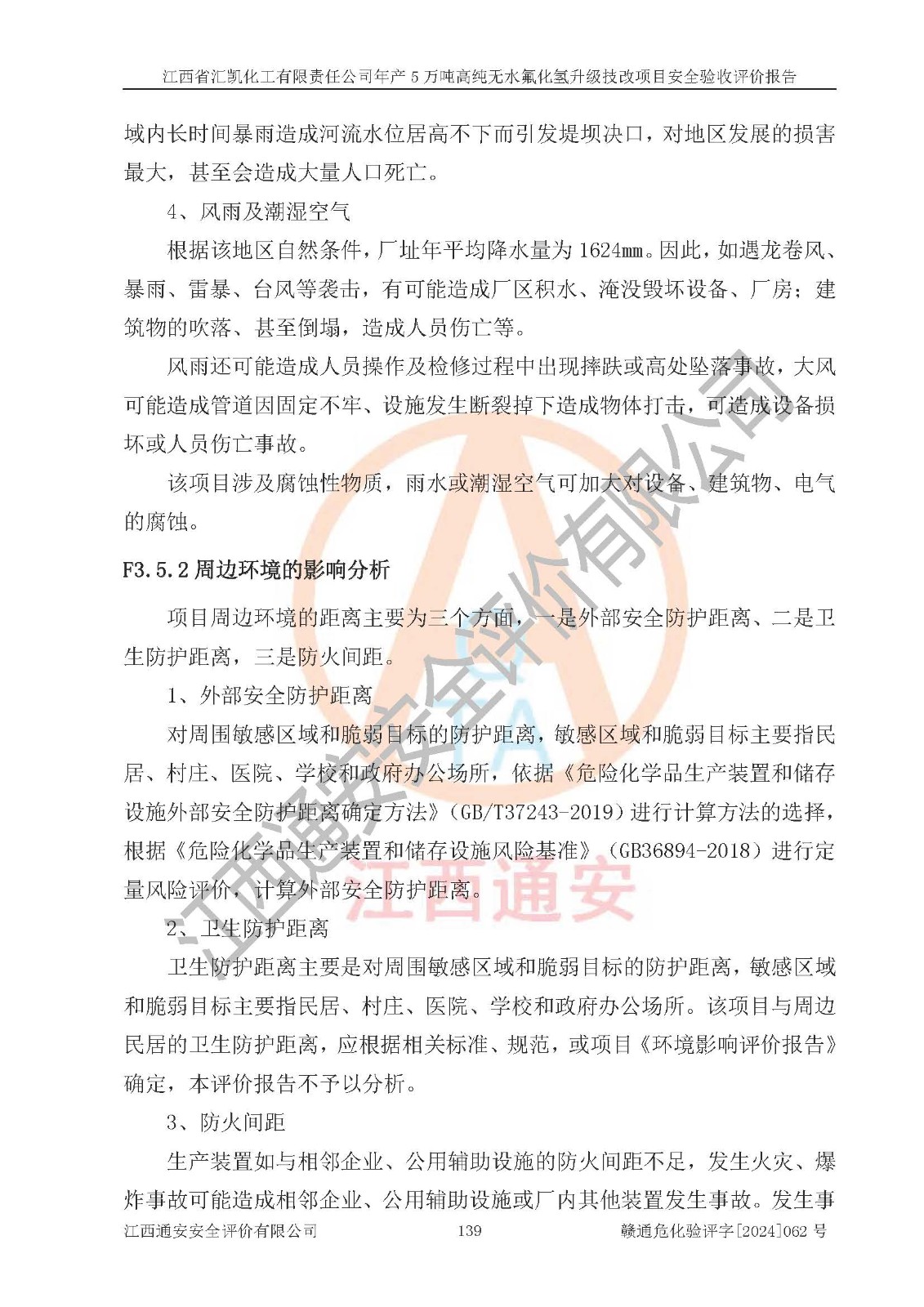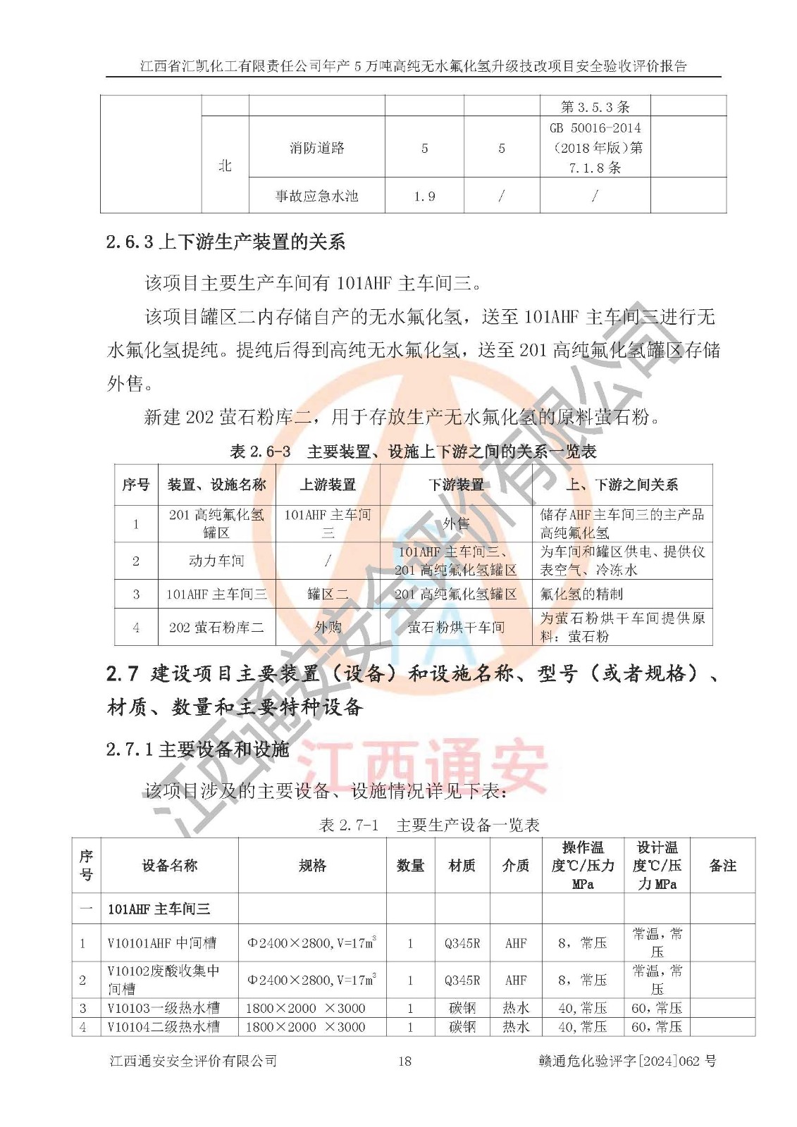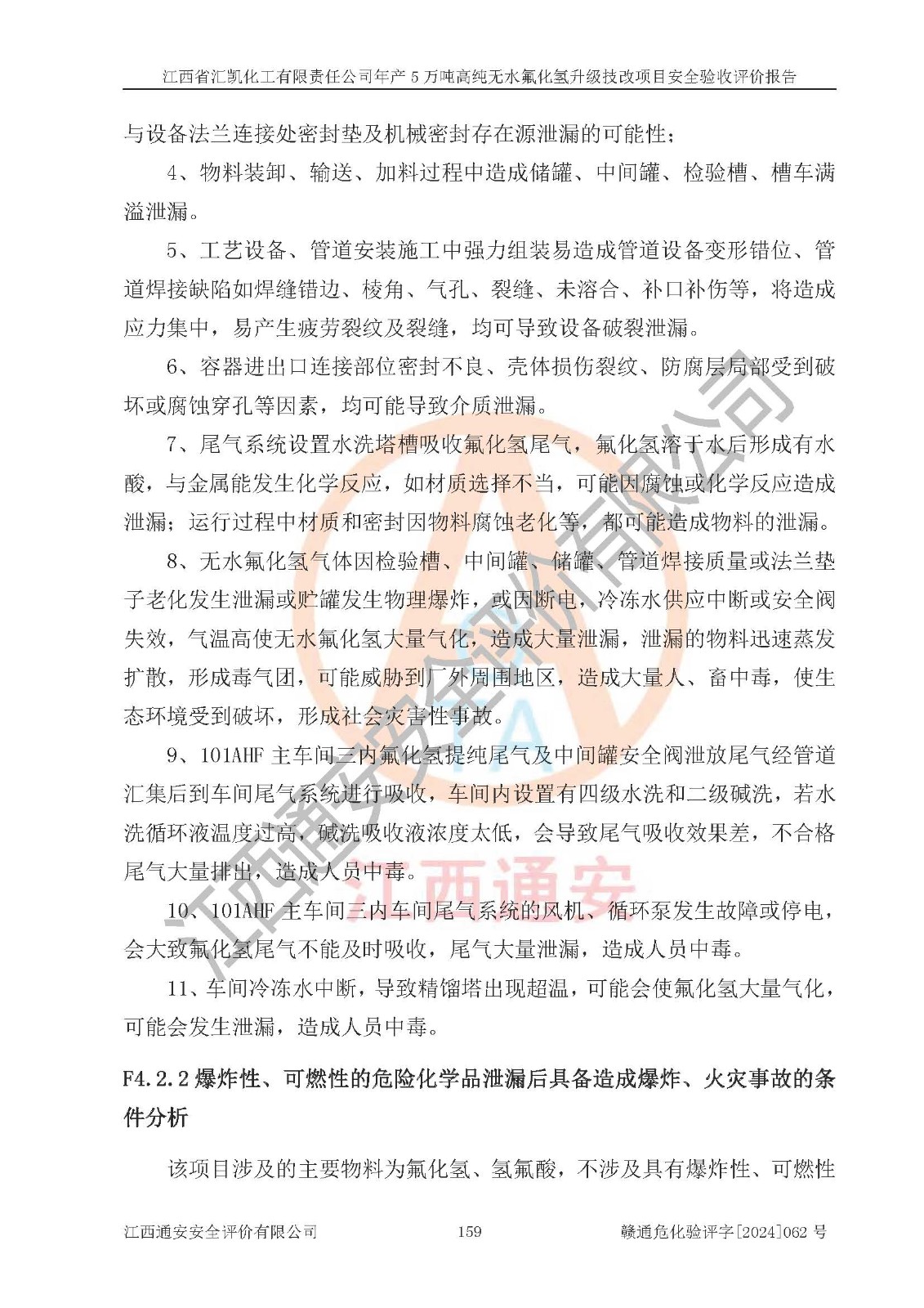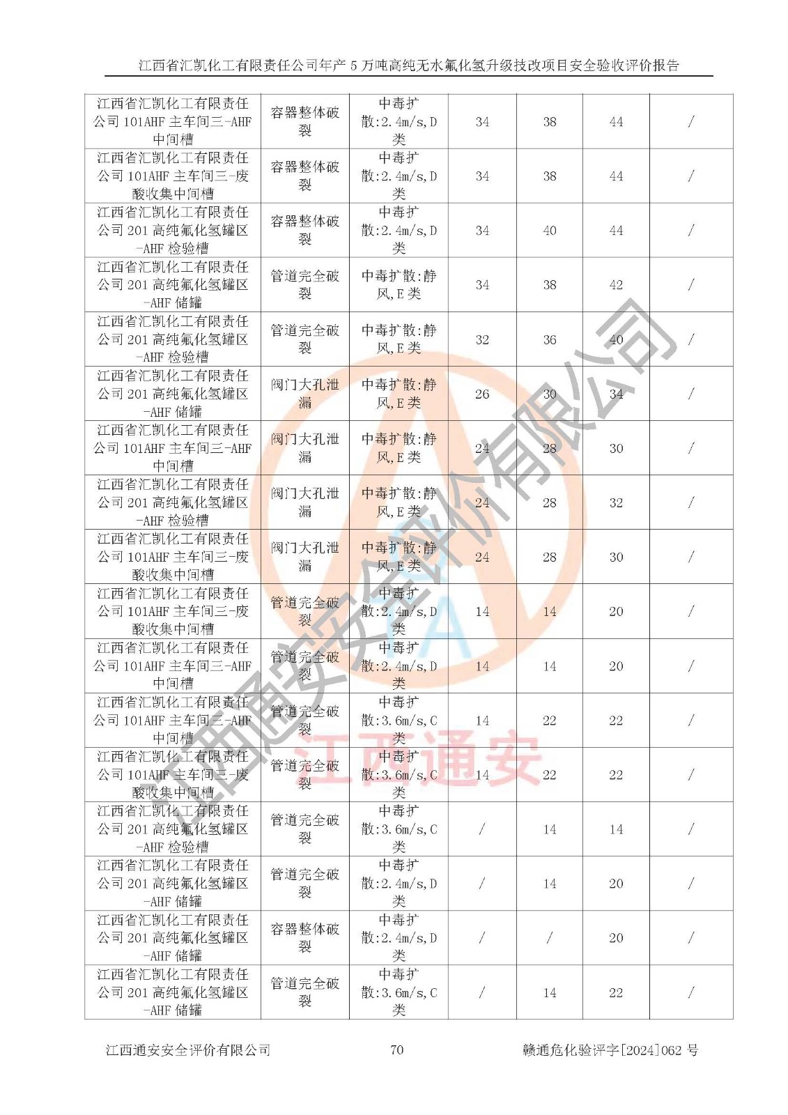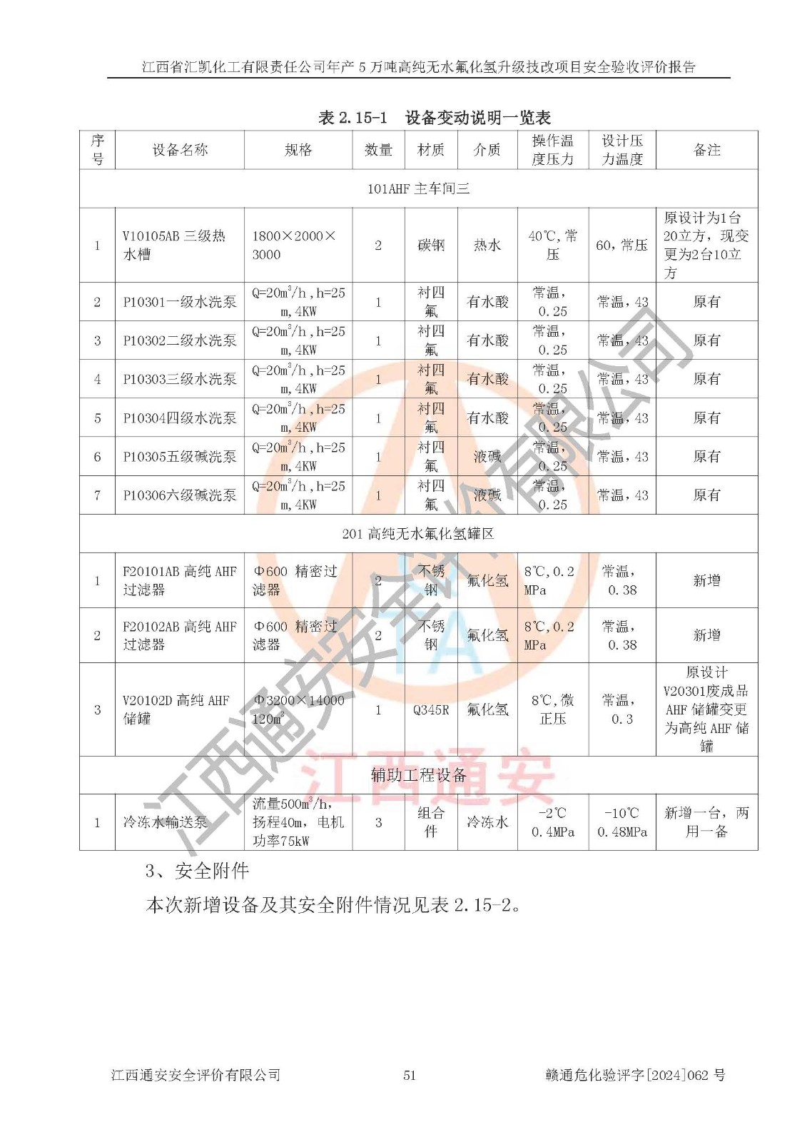 項目簡介 | 江西省匯凱化工有限責任公司(以下簡稱“匯凱化工”)成立于2017年08月08日,注冊地址位于江西省贛州市會昌縣筠門嶺鎮(zhèn)九二工業(yè)基地,法定**人為張裕生,注冊資本壹億元整,經(jīng)營范圍為危險化學品生產(chǎn)、化工產(chǎn)品銷售等。 匯凱化工公司2022年11月03日取得了《安全生產(chǎn)許可證》,許可證編號:(贛)WH安許證字[2019]1060號,許可范圍為無水氟化氫(50kt/a)、氫氟酸(1690t/a)、氟硅酸(4468t/a),**期:2022年11月25日至2025年11月24日。 2017年9月21日,會昌縣工信局同意公司在收購鷹鵬化工有限公司原有2萬噸氫氟酸生產(chǎn)線基礎(chǔ)上,建設(shè)“年產(chǎn)2萬噸無水氟化氫異地搬遷技改項目”,并出具《關(guān)于江西省匯凱化工有限責任公司年產(chǎn)2萬噸無水氟化氫異地搬遷技改項目備案的批復(fù)》(會工信投資字[2017]3號),項目已于2019年9月通過了竣工驗收;2019年依據(jù)工業(yè)和信息化部公告《氟化氫行業(yè)準入條件》(2011年第6號)規(guī)定“為滿足節(jié)能、**以及安全生產(chǎn)要求,提高氟資源利用率,實現(xiàn)合理的規(guī)模經(jīng)濟,新建生產(chǎn)企業(yè)的氟化氫總規(guī)模不得低于5萬噸/年”;為滿足《氟化氫行業(yè)準入條件》及企業(yè)未來發(fā)展需要,公司在現(xiàn)有生產(chǎn)線的基礎(chǔ)上進行技改,二期于2019年10月建設(shè)年產(chǎn)3萬噸無水氟化氫,2021年9月已竣工驗收,達到5萬噸/年無水氟化氫的生產(chǎn)規(guī)模,滿足行業(yè)準入的規(guī)模要求。 匯凱化工公司為了進一步提升競爭力,現(xiàn)對原有年產(chǎn)5萬噸無水氟化氫項目進行技改,將原產(chǎn)品進一步純化,達到高純無水氟化氫。匯凱化工公司已取得了年產(chǎn)5萬噸高純無水氟化氫升級技改項目備案通知書。 匯凱化工公司委托江西偉燦工程技術(shù)咨詢有限責任公司編制了年產(chǎn)5萬噸高純無水氟化氫升級技改項目安全預(yù)評價報告,并于2022年4月18日取得了贛州市行政審批局《關(guān)于江西省匯凱化工有限責任公司年產(chǎn)5萬噸高純無水氟化氫升級技改項目安全條件審查的批復(fù)》{贛市行審證(3)字[2022]131號},委托河北英科石化工程有限公司編制了年產(chǎn)5萬噸高純無水氟化氫升級技改項目安全設(shè)施設(shè)計,并于2022年7月4日取得了贛州市行政審批局《關(guān)于江西省匯凱化工有限責任公司年產(chǎn)5萬噸高純無水氟化氫升級技改項目安全設(shè)施設(shè)計審查的批復(fù)》{贛市行審證(3)字[2022]253號}。因生產(chǎn)經(jīng)營需要,匯凱化工公司編制了年產(chǎn)5萬噸高純無水氟化氫升級技改項目試生產(chǎn)方案,2024年1月5日組織專家對試生產(chǎn)方案及現(xiàn)場進行了評審,經(jīng)整改后取得了會昌縣應(yīng)急管理局出具的試生產(chǎn)方案備案回執(zhí),試生產(chǎn)期限為2024年5月31日至2025年5月30日,目前試生產(chǎn)目標任務(wù)基本達成,擬進行項目的安全設(shè)施驗收工作。 江西省匯凱化工有限責任公司年產(chǎn)5萬噸高純無水氟化氫升級技改項目(以下簡稱“該項目”)主要建設(shè)內(nèi)容為101AHF主車間三高純氟化氫生產(chǎn)線設(shè)備、201高純氟化氫罐區(qū)、201-1裝卸區(qū)、202螢石粉庫二、401中心控制室,生產(chǎn)工藝為通過精餾提純除去原產(chǎn)品氟化氫內(nèi)的鐵、硫酸鹽等雜質(zhì),得到高純無水氟化氫產(chǎn)品(99.999%)。 該項目生產(chǎn)過程中涉及的物料為氟化氫、液堿(氫氧化鈉)和氫氟酸,氟化氫、氫氧化鈉和氫氟酸屬于危險化學品。經(jīng)辨識,該項目涉及的氟化氫和氫氟酸屬于重點監(jiān)管的危險化學品和高毒物品,不涉及監(jiān)控化學品、易制毒化學品、易制爆危險化學品、劇毒化學品和特別管控危險化學品,不涉及重點監(jiān)管的危險化工工藝。101AHF主車間三內(nèi)精餾生產(chǎn)單元、201高純氟化氫罐區(qū)內(nèi)高純氟化氫存儲單元分別構(gòu)成危險化學品一級重大危險源。根據(jù)生產(chǎn)工藝特點及物料的理化特性可知,該項目生產(chǎn)過程中主要存在火災(zāi)與爆炸、中毒與窒息、灼燙、觸電、機械傷害等危險因素。 | ||||||