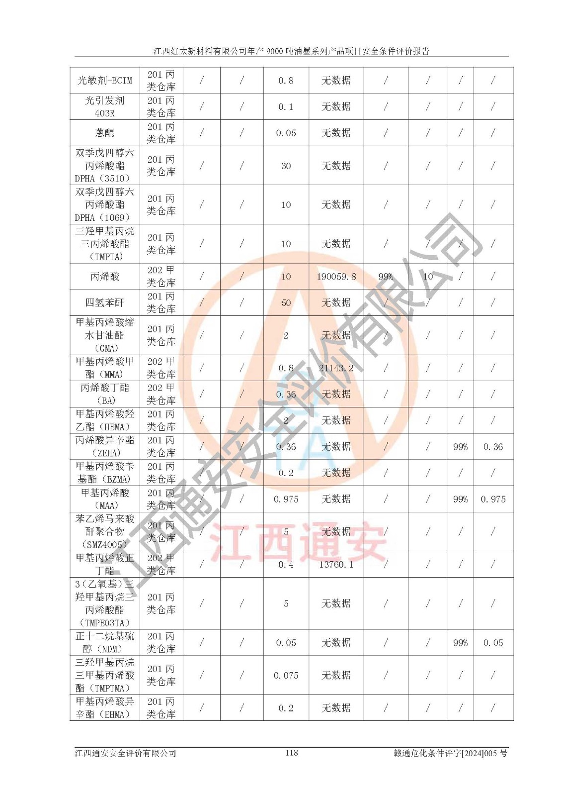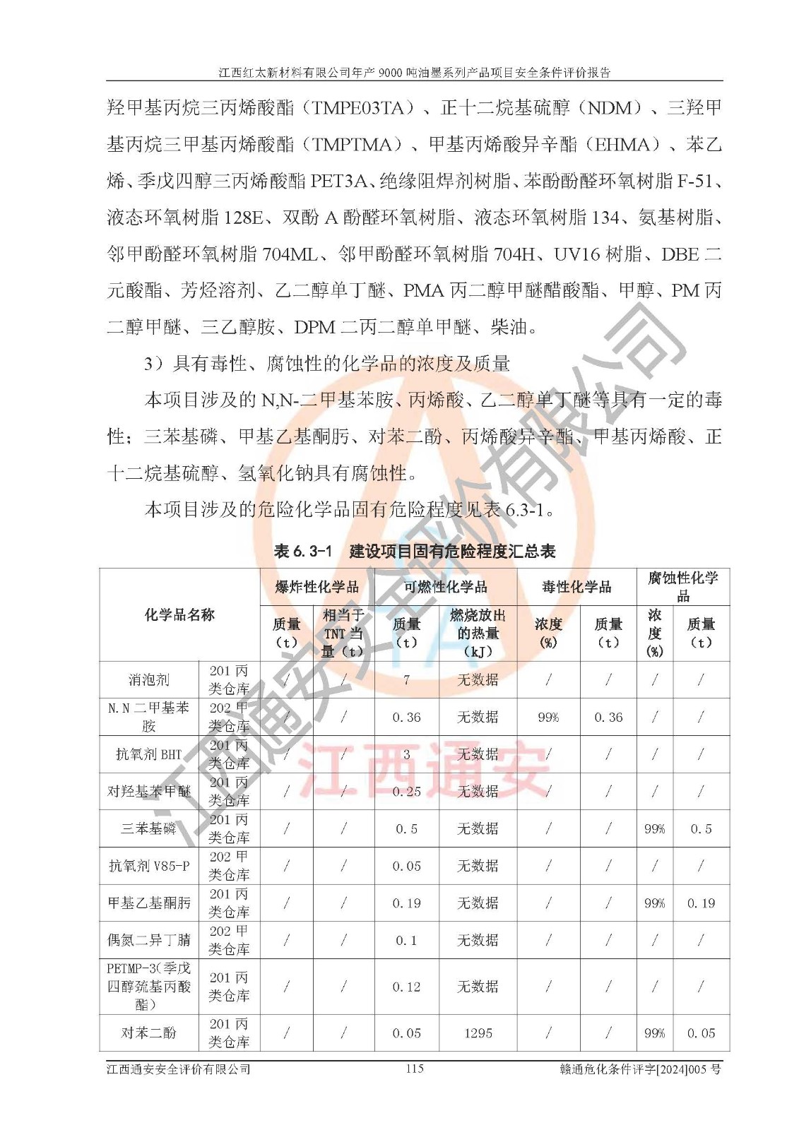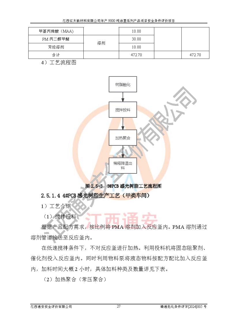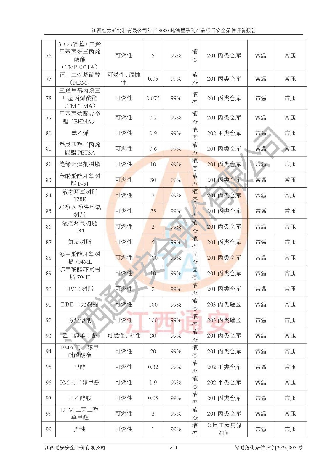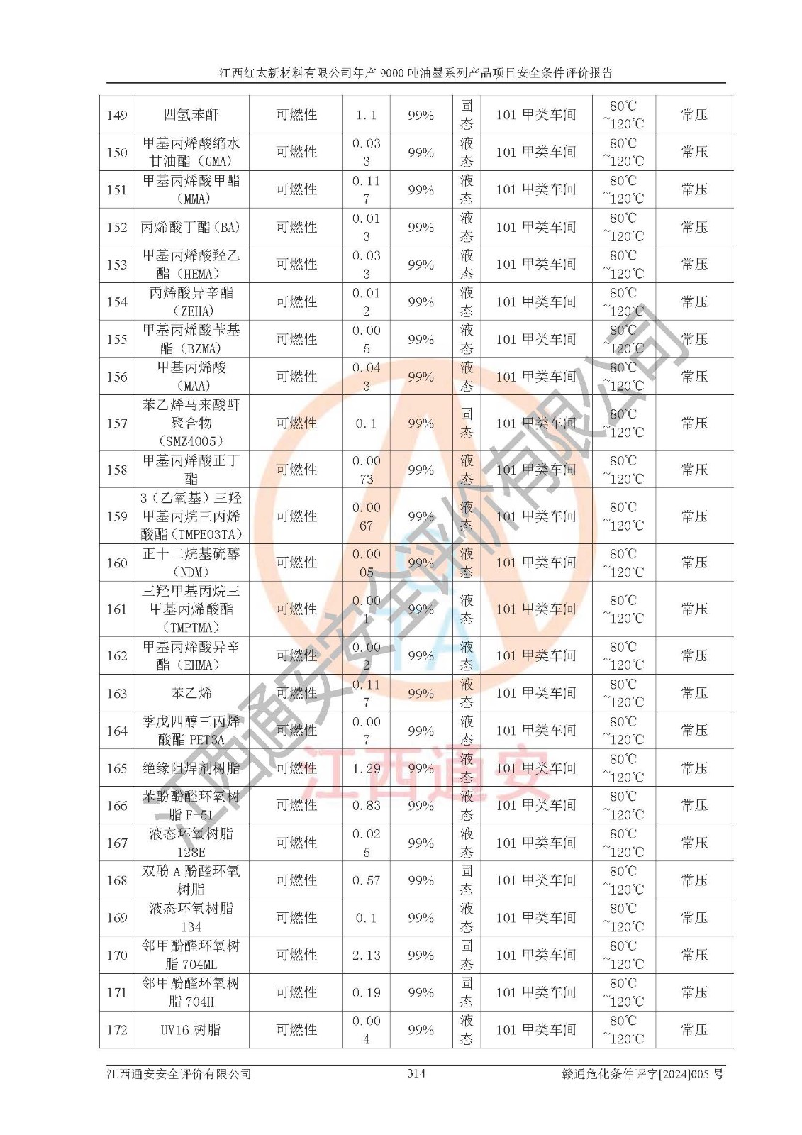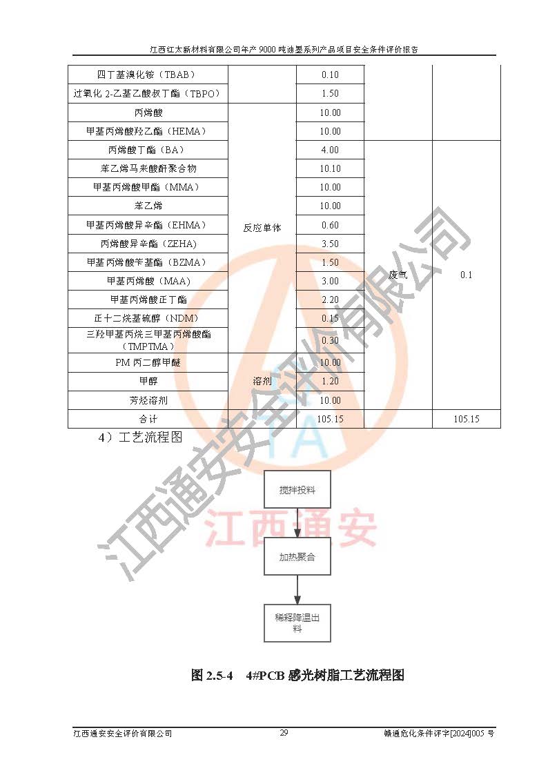 1)本項(xiàng)目依法取得了《江西省企業(yè)投資項(xiàng)目備案通知書》、《建設(shè)用地規(guī)劃許可證》,符合地方產(chǎn)業(yè)發(fā)展規(guī)劃的要求。 2)根據(jù)《**安全監(jiān)管總局關(guān)于公布首批重點(diǎn)監(jiān)管的危險(xiǎn)化工工藝目錄的通知》(安監(jiān)總管三[2009]116號(hào))和《**安全監(jiān)管總局關(guān)于公布第二批重點(diǎn)監(jiān)管危險(xiǎn)化工工藝目錄和調(diào)整首批重點(diǎn)監(jiān)管危險(xiǎn)化工工藝中部分典型工藝的通知》(安監(jiān)總管三[2013]3號(hào)),本項(xiàng)目聚合工藝為常壓條件生產(chǎn)工藝,故不列入危險(xiǎn)工藝。 3)根據(jù)《危險(xiǎn)化學(xué)品重大危險(xiǎn)源辨識(shí)》(GB18218-2018),該項(xiàng)目未構(gòu)成危險(xiǎn)化學(xué)品重大危險(xiǎn)源。 4)項(xiàng)目存在的主要危險(xiǎn)因素有:火災(zāi)爆炸、容器爆炸、中毒窒息、灼燙、觸電、**傷害、機(jī)械傷害、高處墜落、物體打擊、淹溺等,存在的主要危害因素有:噪聲與振動(dòng)、高溫、有害化學(xué)物質(zhì)等;引起事故的原因有人的不安全行為、物的不安全狀態(tài)、管理缺陷和環(huán)境不良。其中*主要的危險(xiǎn)有害因素是火災(zāi)爆炸。 5)采用預(yù)先危險(xiǎn)性分析法評(píng)價(jià),結(jié)果為: (1)通過預(yù)先危險(xiǎn)(PHA)分析可知,項(xiàng)目廠址及總體布局單元存在周邊環(huán)境相互影響,發(fā)生異常情況,可對(duì)周邊企業(yè)生產(chǎn)經(jīng)營(yíng)活動(dòng)、人員活動(dòng)產(chǎn)生影響;存在自然條件影響,可因雷擊、暴雨等引起事故;存在**傷害、建筑物危害,其固有的危險(xiǎn)性等級(jí)為Ⅱ級(jí),屬于“臨界的”,應(yīng)予以排除、采取控制措施因素。 (2)生產(chǎn)作業(yè)存在的危險(xiǎn)因素包括火災(zāi)爆炸、觸電、灼燙、中毒窒息固有的危險(xiǎn)等級(jí)為Ⅲ級(jí),屬于“危險(xiǎn)的”,可能導(dǎo)致人員傷亡和系統(tǒng)損壞的因素,需要采取防范和對(duì)策措施的因素;其它危險(xiǎn)因素固有的危險(xiǎn)等級(jí)為Ⅱ級(jí),屬于“臨界的”,應(yīng)予以排除、采取控制措施因素。 (3)生產(chǎn)作業(yè)存在的噪聲、粉塵、高溫、有害化學(xué)物質(zhì)的危險(xiǎn)有害因素等級(jí)為Ⅱ級(jí),屬于“臨界的”,應(yīng)予以排除、采取控制措施因素。 6)危險(xiǎn)度評(píng)價(jià)分析,結(jié)果為: 生產(chǎn)裝置危險(xiǎn)度評(píng)價(jià)分析:101甲類車間為**危險(xiǎn)(Ⅰ級(jí)),102丙類車間為中度危險(xiǎn)(Ⅱ級(jí))。 儲(chǔ)存單元危險(xiǎn)度評(píng)價(jià)分析:202甲類倉(cāng)庫(kù)為**危險(xiǎn)(Ⅰ級(jí)),201丙類倉(cāng)庫(kù)為低度危險(xiǎn)(Ⅲ級(jí)),203丙類罐區(qū)為中度危險(xiǎn)(Ⅱ級(jí))。 7)作業(yè)條件危險(xiǎn)性評(píng)價(jià)結(jié)果:在選定的評(píng)價(jià)單元中,其危險(xiǎn)分值均在70以下,危險(xiǎn)程度基本屬于“可能危險(xiǎn)”、“稍有危險(xiǎn)”范圍,作業(yè)條件相對(duì)安全。企業(yè)經(jīng)營(yíng)過程中首先應(yīng)重點(diǎn)加強(qiáng)對(duì)甲類生產(chǎn)車間、甲類倉(cāng)庫(kù)、儲(chǔ)罐區(qū)的危險(xiǎn)因素的嚴(yán)格控制,注重日常安全管理;其次要建立健全完善的安全生產(chǎn)責(zé)任制、安全管理制度、安全技術(shù)操作規(guī)程并**其貫徹落實(shí);第三要認(rèn)真抓好操作人員、管理人員的安全知識(shí)和操作技能的培訓(xùn),**人員具有與工程技術(shù)水平相適應(yīng)的技術(shù)素質(zhì)和安全素質(zhì),**安全作業(yè)。 8)項(xiàng)目建設(shè)場(chǎng)地符合當(dāng)?shù)匾?guī)劃要求,建設(shè)場(chǎng)地通過合理規(guī)劃,其選址、周邊環(huán)境、總平面布置、交通運(yùn)輸?shù)饶芊稀吨腥A人民共和國(guó)安全生產(chǎn)法》、《危險(xiǎn)化學(xué)品安全管理?xiàng)l例》、《建筑設(shè)計(jì)防火規(guī)范》、《精細(xì)化工企業(yè)工程設(shè)計(jì)防火標(biāo)準(zhǔn)》等法規(guī)、標(biāo)準(zhǔn)、規(guī)范要求。 廠址地區(qū)地震活動(dòng)相對(duì)較弱,災(zāi)害性天氣出現(xiàn)頻率稍高,自然災(zāi)害對(duì)項(xiàng)目建設(shè)具有**影響,通過采取相應(yīng)的防護(hù)措施,自然條件適宜建設(shè)。 9)建設(shè)項(xiàng)目符合**產(chǎn)業(yè)政策的要求;選擇工藝為現(xiàn)行成熟工藝,其安全可靠性可得到**。 10)本報(bào)告已根據(jù)有關(guān)安全生產(chǎn)法律、法規(guī)、規(guī)章和**標(biāo)準(zhǔn)、行業(yè)標(biāo)準(zhǔn),并嚴(yán)格執(zhí)行省委辦公廳省**辦公廳《關(guān)于全面加強(qiáng)危險(xiǎn)化學(xué)品安全生產(chǎn)工作的實(shí)施意見》(贛辦發(fā)[2020]32號(hào))及都陽(yáng)湖生態(tài)經(jīng)濟(jì)區(qū)、長(zhǎng)江經(jīng)濟(jì)帶、“五河一湖”相關(guān)政策規(guī)定,客觀、公正、科學(xué)地進(jìn)行安全評(píng)價(jià),項(xiàng)目符合《江西省應(yīng)急管理廳關(guān)于印發(fā)《江西省危險(xiǎn)化學(xué)品建設(shè)項(xiàng)目安全監(jiān)督管理實(shí)施細(xì)則》(試行)的通知》(贛應(yīng)急字[2021]100號(hào))的要求。 11)本報(bào)告結(jié)合工藝特征,提出應(yīng)采取的對(duì)應(yīng)的自動(dòng)化控制系統(tǒng)及自動(dòng)化實(shí)施方案,滿足《江西省應(yīng)急管理廳關(gu