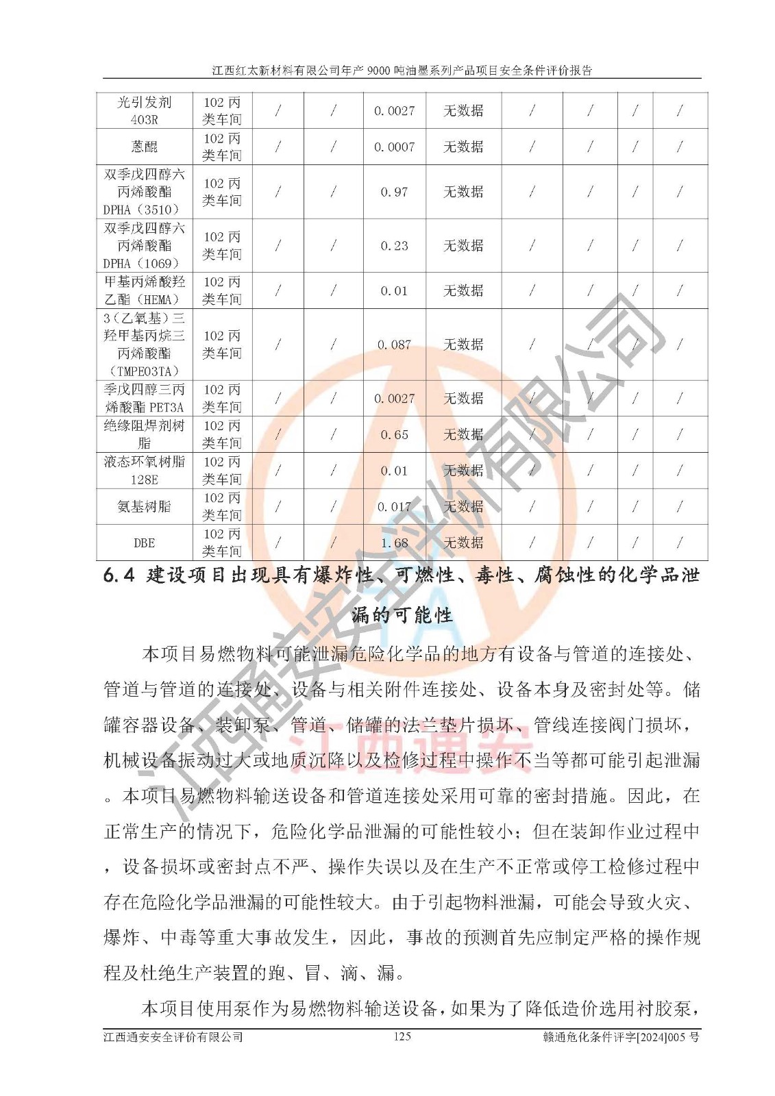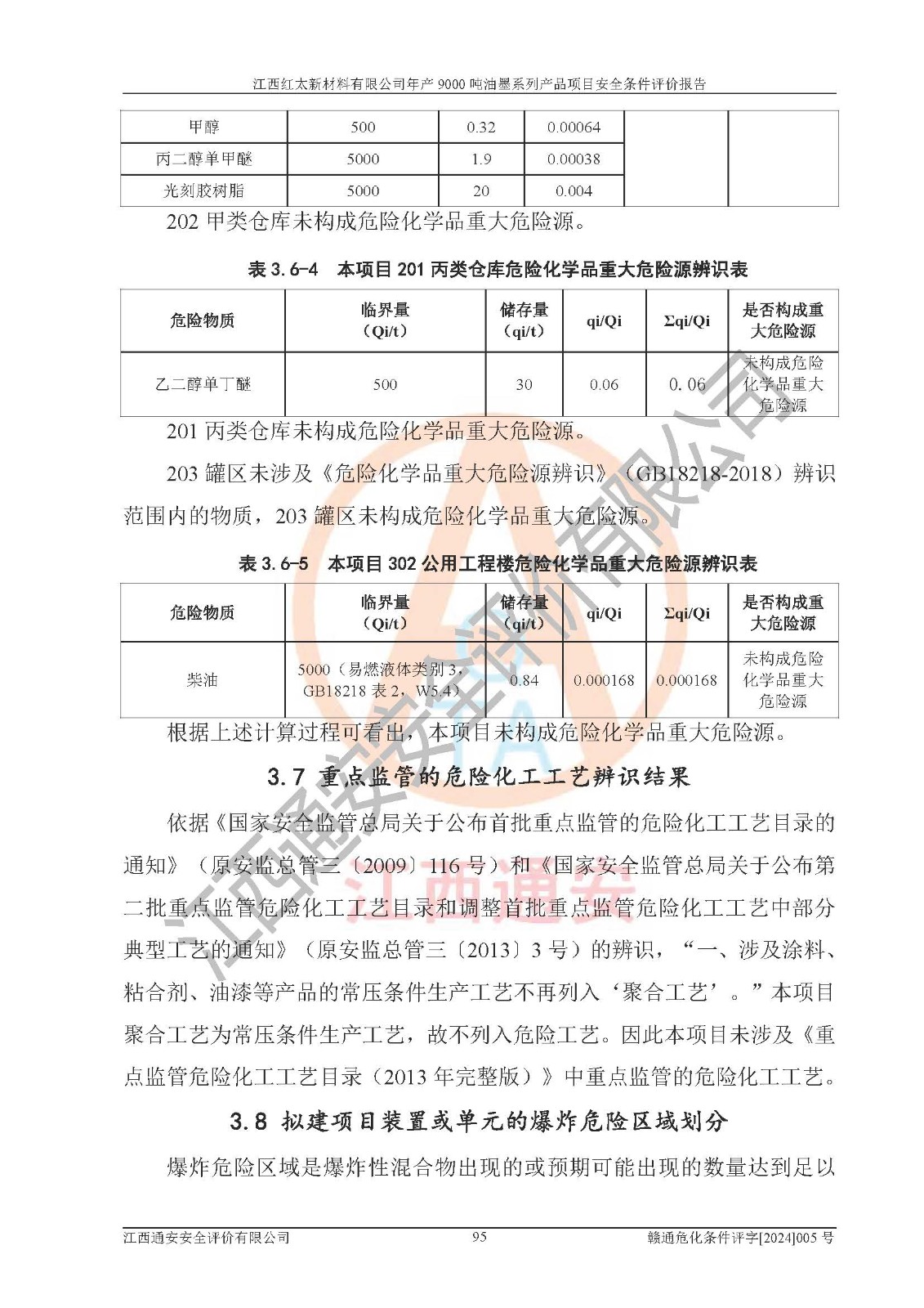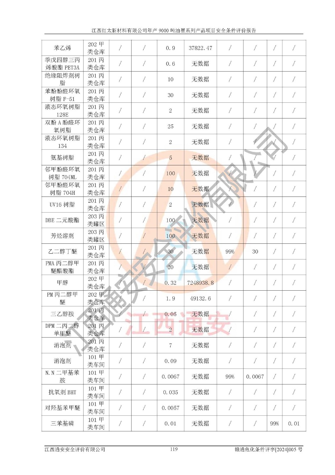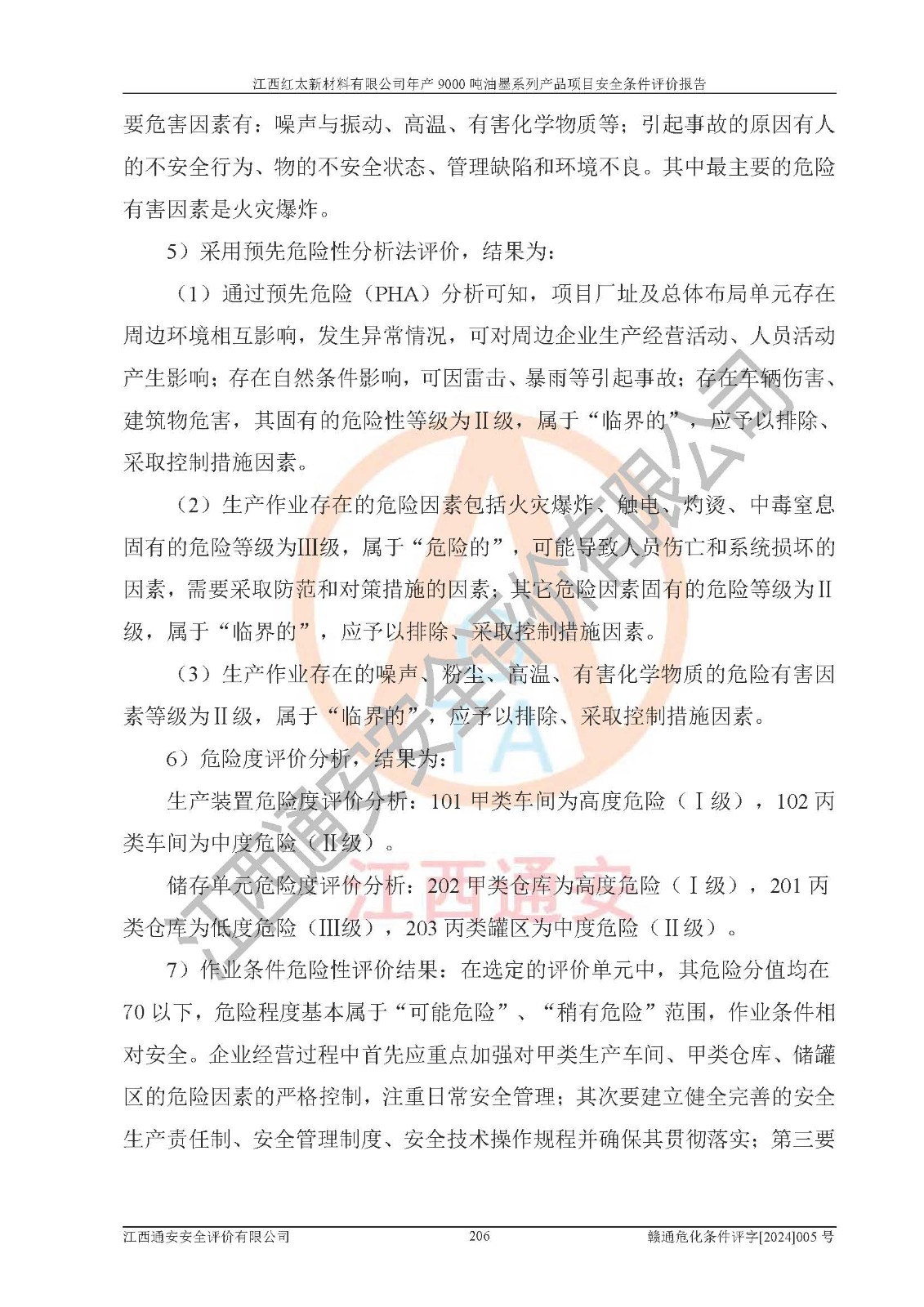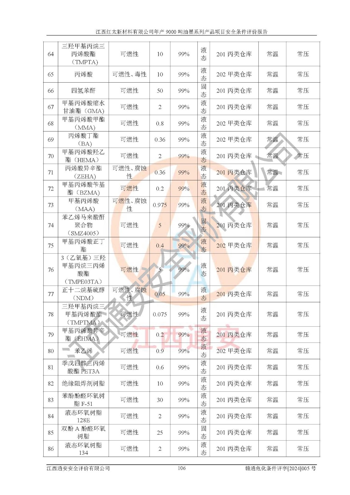 1)本項(xiàng)目依法取得了《江西省企業(yè)投資項(xiàng)目備案通知書》、《建設(shè)用地規(guī)劃許可證》,符合地方產(chǎn)業(yè)發(fā)展規(guī)劃的要求。 2)根據(jù)《**安全監(jiān)管總局關(guān)于公布首批重點(diǎn)監(jiān)管的危險(xiǎn)化工工藝目錄的通知》(安監(jiān)總管三[2009]116號(hào))和《**安全監(jiān)管總局關(guān)于公布第二批重點(diǎn)監(jiān)管危險(xiǎn)化工工藝目錄和調(diào)整首批重點(diǎn)監(jiān)管危險(xiǎn)化工工藝中部分典型工藝的通知》(安監(jiān)總管三[2013]3號(hào)),本項(xiàng)目聚合工藝為常壓條件生產(chǎn)工藝,故不列入危險(xiǎn)工藝。 3)根據(jù)《危險(xiǎn)化學(xué)品重大危險(xiǎn)源辨識(shí)》(GB18218-2018),該項(xiàng)目未構(gòu)成危險(xiǎn)化學(xué)品重大危險(xiǎn)源。 4)項(xiàng)目存在的主要危險(xiǎn)因素有:火災(zāi)爆炸、容器爆炸、中毒窒息、灼燙、觸電、**傷害、機(jī)械傷害、高處墜落、物體打擊、淹溺等,存在的主要危害因素有:噪聲與振動(dòng)、高溫、有害化學(xué)物質(zhì)等;引起事故的原因有人的不安全行為、物的不安全狀態(tài)、管理缺陷和環(huán)境不良。其中*主要的危險(xiǎn)有害因素是火災(zāi)爆炸。 5)采用預(yù)先危險(xiǎn)性分析法評(píng)價(jià),結(jié)果為: (1)通過預(yù)先危險(xiǎn)(PHA)分析可知,項(xiàng)目廠址及總體布局單元存在周邊環(huán)境相互影響,發(fā)生異常情況,可對(duì)周邊企業(yè)生產(chǎn)經(jīng)營(yíng)活動(dòng)、人員活動(dòng)產(chǎn)生影響;存在自然條件影響,可因雷擊、暴雨等引起事故;存在**傷害、建筑物危害,其固有的危險(xiǎn)性等級(jí)為Ⅱ級(jí),屬于“臨界的”,應(yīng)予以排除、采取控制措施因素。 (2)生產(chǎn)作業(yè)存在的危險(xiǎn)因素包括火災(zāi)爆炸、觸電、灼燙、中毒窒息固有的危險(xiǎn)等級(jí)為Ⅲ級(jí),屬于“危險(xiǎn)的”,可能導(dǎo)致人員傷亡和系統(tǒng)損壞的因素,需要采取防范和對(duì)策措施的因素;其它危險(xiǎn)因素固有的危險(xiǎn)等級(jí)為Ⅱ級(jí),屬于“臨界的”,應(yīng)予以排除、采取控制措施因素。 (3)生產(chǎn)作業(yè)存在的噪聲、粉塵、高溫、有害化學(xué)物質(zhì)的危險(xiǎn)有害因素等級(jí)為Ⅱ級(jí),屬于“臨界的”,應(yīng)予以排除、采取控制措施因素。 6)危險(xiǎn)度評(píng)價(jià)分析,結(jié)果為: 生產(chǎn)裝置危險(xiǎn)度評(píng)價(jià)分析:101甲類車間為**危險(xiǎn)(Ⅰ級(jí)),102丙類車間為中度危險(xiǎn)(Ⅱ級(jí))。 儲(chǔ)存單元危險(xiǎn)度評(píng)價(jià)分析:202甲類倉(cāng)庫(kù)為**危險(xiǎn)(Ⅰ級(jí)),201丙類倉(cāng)庫(kù)為低度危險(xiǎn)(Ⅲ級(jí)),203丙類罐區(qū)為中度危險(xiǎn)(Ⅱ級(jí))。 7)作業(yè)條件危險(xiǎn)性評(píng)價(jià)結(jié)果:在選定的評(píng)價(jià)單元中,其危險(xiǎn)分值均在70以下,危險(xiǎn)程度基本屬于“可能危險(xiǎn)”、“稍有危險(xiǎn)”范圍,作業(yè)條件相對(duì)安全。企業(yè)經(jīng)營(yíng)過程中首先應(yīng)重點(diǎn)加強(qiáng)對(duì)甲類生產(chǎn)車間、甲類倉(cāng)庫(kù)、儲(chǔ)罐區(qū)的危險(xiǎn)因素的嚴(yán)格控制,注重日常安全管理;其次要建立健全完善的安全生產(chǎn)責(zé)任制、安全管理制度、安全技術(shù)操作規(guī)程并**其貫徹落實(shí);第三要認(rèn)真抓好操作人員、管理人員的安全知識(shí)和操作技能的培訓(xùn),**人員具有與工程技術(shù)水平相適應(yīng)的技術(shù)素質(zhì)和安全素質(zhì),**安全作業(yè)。 8)項(xiàng)目建設(shè)場(chǎng)地符合當(dāng)?shù)匾?guī)劃要求,建設(shè)場(chǎng)地通過合理規(guī)劃,其選址、周邊環(huán)境、總平面布置、交通運(yùn)輸?shù)饶芊稀吨腥A人民共和國(guó)安全生產(chǎn)法》、《危險(xiǎn)化學(xué)品安全管理?xiàng)l例》、《建筑設(shè)計(jì)防火規(guī)范》、《精細(xì)化工企業(yè)工程設(shè)計(jì)防火標(biāo)準(zhǔn)》等法規(guī)、標(biāo)準(zhǔn)、規(guī)范要求。 廠址地區(qū)地震活動(dòng)相對(duì)較弱,災(zāi)害性天氣出現(xiàn)頻率稍高,自然災(zāi)害對(duì)項(xiàng)目建設(shè)具有**影響,通過采取相應(yīng)的防護(hù)措施,自然條件適宜建設(shè)。 9)建設(shè)項(xiàng)目符合**產(chǎn)業(yè)政策的要求;選擇工藝為現(xiàn)行成熟工藝,其安全可靠性可得到**。 10)本報(bào)告已根據(jù)有關(guān)安全生產(chǎn)法律、法規(guī)、規(guī)章和**標(biāo)準(zhǔn)、行業(yè)標(biāo)準(zhǔn),并嚴(yán)格執(zhí)行省委辦公廳省**辦公廳《關(guān)于全面加強(qiáng)危險(xiǎn)化學(xué)品安全生產(chǎn)工作的實(shí)施意見》(贛辦發(fā)[2020]32號(hào))及都陽(yáng)湖生態(tài)經(jīng)濟(jì)區(qū)、長(zhǎng)江經(jīng)濟(jì)帶、“五河一湖”相關(guān)政策規(guī)定,客觀、公正、科學(xué)地進(jìn)行安全評(píng)價(jià),項(xiàng)目符合《江西省應(yīng)急管理廳關(guān)于印發(fā)《江西省危險(xiǎn)化學(xué)品建設(shè)項(xiàng)目安全監(jiān)督管理實(shí)施細(xì)則》(試行)的通知》(贛應(yīng)急字[2021]100號(hào))的要求。 11)本報(bào)告結(jié)合工藝特征,提出應(yīng)采取的對(duì)應(yīng)的自動(dòng)化控制系統(tǒng)及自動(dòng)化實(shí)施方案,滿足《江西省應(yīng)急管理廳關(gu