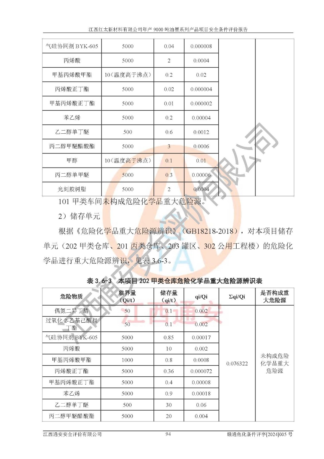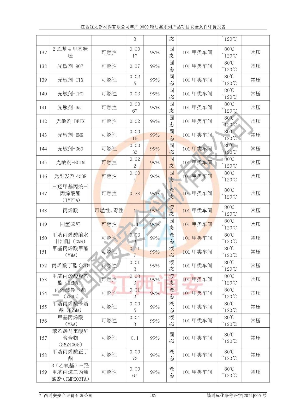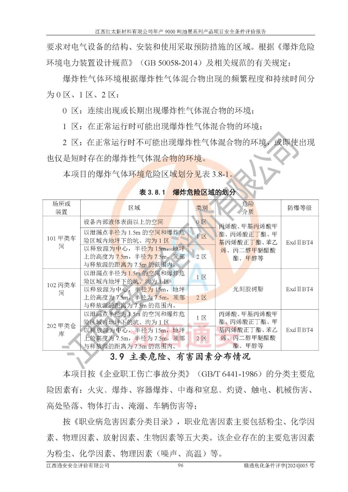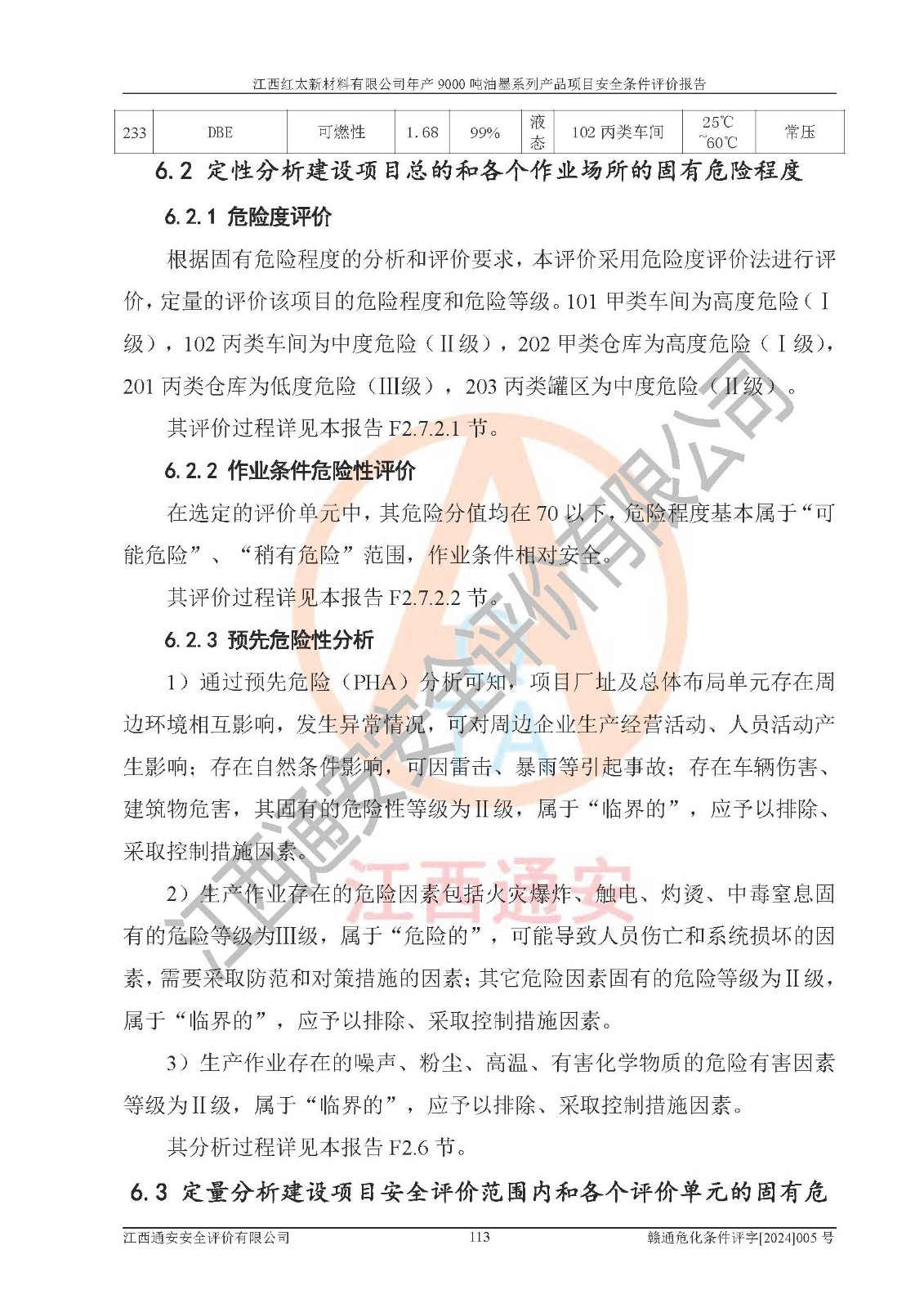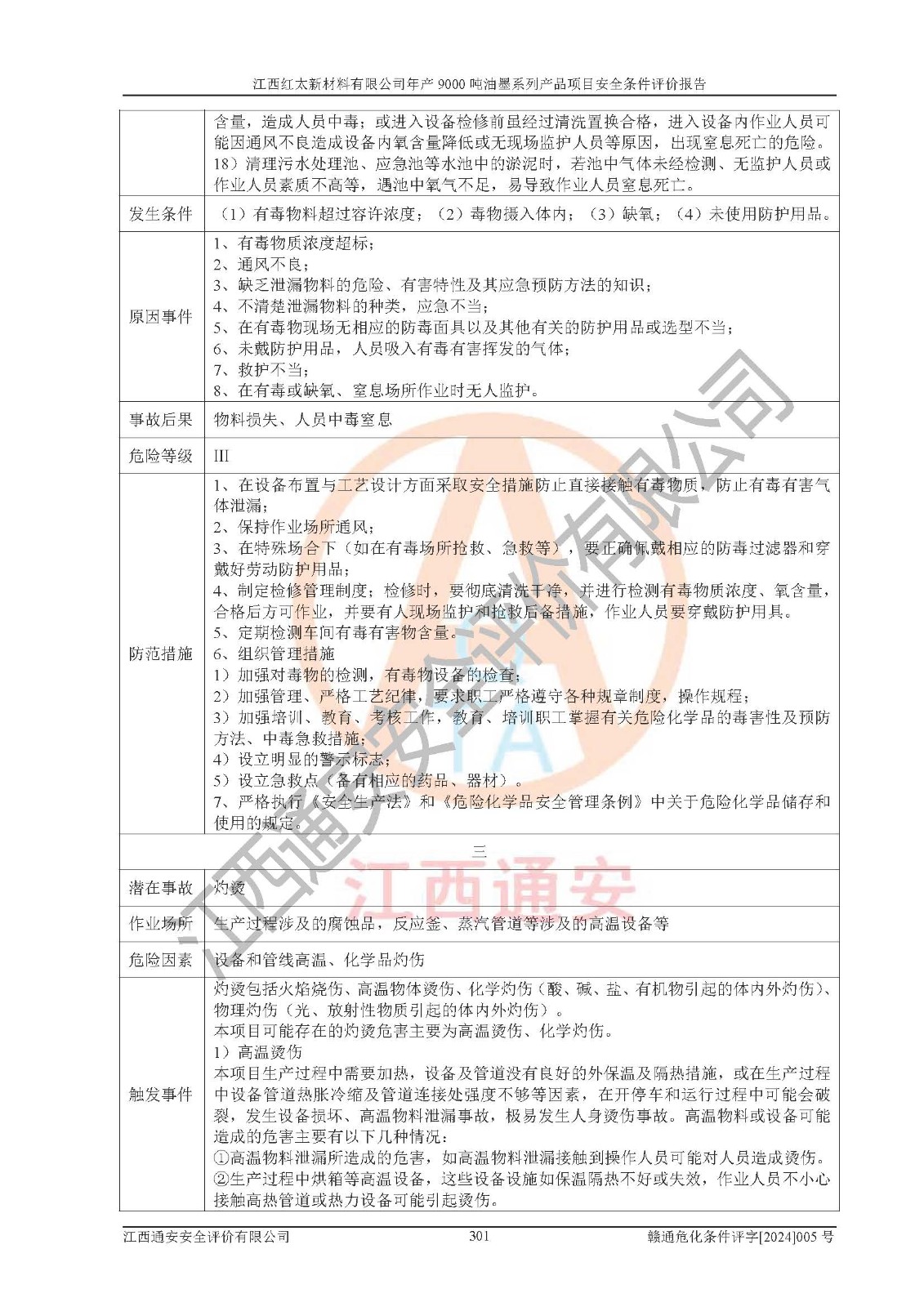 1)本項(xiàng)目依法取得了《江西省企業(yè)投資項(xiàng)目備案通知書》、《建設(shè)用地規(guī)劃許可證》,符合地方產(chǎn)業(yè)發(fā)展規(guī)劃的要求。 2)根據(jù)《**安全監(jiān)管總局關(guān)于公布首批重點(diǎn)監(jiān)管的危險(xiǎn)化工工藝目錄的通知》(安監(jiān)總管三[2009]116號(hào))和《**安全監(jiān)管總局關(guān)于公布第二批重點(diǎn)監(jiān)管危險(xiǎn)化工工藝目錄和調(diào)整首批重點(diǎn)監(jiān)管危險(xiǎn)化工工藝中部分典型工藝的通知》(安監(jiān)總管三[2013]3號(hào)),本項(xiàng)目聚合工藝為常壓條件生產(chǎn)工藝,故不列入危險(xiǎn)工藝。 3)根據(jù)《危險(xiǎn)化學(xué)品重大危險(xiǎn)源辨識(shí)》(GB18218-2018),該項(xiàng)目未構(gòu)成危險(xiǎn)化學(xué)品重大危險(xiǎn)源。 4)項(xiàng)目存在的主要危險(xiǎn)因素有:火災(zāi)爆炸、容器爆炸、中毒窒息、灼燙、觸電、**傷害、機(jī)械傷害、高處墜落、物體打擊、淹溺等,存在的主要危害因素有:噪聲與振動(dòng)、高溫、有害化學(xué)物質(zhì)等;引起事故的原因有人的不安全行為、物的不安全狀態(tài)、管理缺陷和環(huán)境不良。其中*主要的危險(xiǎn)有害因素是火災(zāi)爆炸。 5)采用預(yù)先危險(xiǎn)性分析法評(píng)價(jià),結(jié)果為: (1)通過預(yù)先危險(xiǎn)(PHA)分析可知,項(xiàng)目廠址及總體布局單元存在周邊環(huán)境相互影響,發(fā)生異常情況,可對(duì)周邊企業(yè)生產(chǎn)經(jīng)營(yíng)活動(dòng)、人員活動(dòng)產(chǎn)生影響;存在自然條件影響,可因雷擊、暴雨等引起事故;存在**傷害、建筑物危害,其固有的危險(xiǎn)性等級(jí)為Ⅱ級(jí),屬于“臨界的”,應(yīng)予以排除、采取控制措施因素。 (2)生產(chǎn)作業(yè)存在的危險(xiǎn)因素包括火災(zāi)爆炸、觸電、灼燙、中毒窒息固有的危險(xiǎn)等級(jí)為Ⅲ級(jí),屬于“危險(xiǎn)的”,可能導(dǎo)致人員傷亡和系統(tǒng)損壞的因素,需要采取防范和對(duì)策措施的因素;其它危險(xiǎn)因素固有的危險(xiǎn)等級(jí)為Ⅱ級(jí),屬于“臨界的”,應(yīng)予以排除、采取控制措施因素。 (3)生產(chǎn)作業(yè)存在的噪聲、粉塵、高溫、有害化學(xué)物質(zhì)的危險(xiǎn)有害因素等級(jí)為Ⅱ級(jí),屬于“臨界的”,應(yīng)予以排除、采取控制措施因素。 6)危險(xiǎn)度評(píng)價(jià)分析,結(jié)果為: 生產(chǎn)裝置危險(xiǎn)度評(píng)價(jià)分析:101甲類車間為**危險(xiǎn)(Ⅰ級(jí)),102丙類車間為中度危險(xiǎn)(Ⅱ級(jí))。 儲(chǔ)存單元危險(xiǎn)度評(píng)價(jià)分析:202甲類倉(cāng)庫(kù)為**危險(xiǎn)(Ⅰ級(jí)),201丙類倉(cāng)庫(kù)為低度危險(xiǎn)(Ⅲ級(jí)),203丙類罐區(qū)為中度危險(xiǎn)(Ⅱ級(jí))。 7)作業(yè)條件危險(xiǎn)性評(píng)價(jià)結(jié)果:在選定的評(píng)價(jià)單元中,其危險(xiǎn)分值均在70以下,危險(xiǎn)程度基本屬于“可能危險(xiǎn)”、“稍有危險(xiǎn)”范圍,作業(yè)條件相對(duì)安全。企業(yè)經(jīng)營(yíng)過程中首先應(yīng)重點(diǎn)加強(qiáng)對(duì)甲類生產(chǎn)車間、甲類倉(cāng)庫(kù)、儲(chǔ)罐區(qū)的危險(xiǎn)因素的嚴(yán)格控制,注重日常安全管理;其次要建立健全完善的安全生產(chǎn)責(zé)任制、安全管理制度、安全技術(shù)操作規(guī)程并**其貫徹落實(shí);第三要認(rèn)真抓好操作人員、管理人員的安全知識(shí)和操作技能的培訓(xùn),**人員具有與工程技術(shù)水平相適應(yīng)的技術(shù)素質(zhì)和安全素質(zhì),**安全作業(yè)。 8)項(xiàng)目建設(shè)場(chǎng)地符合當(dāng)?shù)匾?guī)劃要求,建設(shè)場(chǎng)地通過合理規(guī)劃,其選址、周邊環(huán)境、總平面布置、交通運(yùn)輸?shù)饶芊稀吨腥A人民共和國(guó)安全生產(chǎn)法》、《危險(xiǎn)化學(xué)品安全管理?xiàng)l例》、《建筑設(shè)計(jì)防火規(guī)范》、《精細(xì)化工企業(yè)工程設(shè)計(jì)防火標(biāo)準(zhǔn)》等法規(guī)、標(biāo)準(zhǔn)、規(guī)范要求。 廠址地區(qū)地震活動(dòng)相對(duì)較弱,災(zāi)害性天氣出現(xiàn)頻率稍高,自然災(zāi)害對(duì)項(xiàng)目建設(shè)具有**影響,通過采取相應(yīng)的防護(hù)措施,自然條件適宜建設(shè)。 9)建設(shè)項(xiàng)目符合**產(chǎn)業(yè)政策的要求;選擇工藝為現(xiàn)行成熟工藝,其安全可靠性可得到**。 10)本報(bào)告已根據(jù)有關(guān)安全生產(chǎn)法律、法規(guī)、規(guī)章和**標(biāo)準(zhǔn)、行業(yè)標(biāo)準(zhǔn),并嚴(yán)格執(zhí)行省委辦公廳省**辦公廳《關(guān)于全面加強(qiáng)危險(xiǎn)化學(xué)品安全生產(chǎn)工作的實(shí)施意見》(贛辦發(fā)[2020]32號(hào))及都陽(yáng)湖生態(tài)經(jīng)濟(jì)區(qū)、長(zhǎng)江經(jīng)濟(jì)帶、“五河一湖”相關(guān)政策規(guī)定,客觀、公正、科學(xué)地進(jìn)行安全評(píng)價(jià),項(xiàng)目符合《江西省應(yīng)急管理廳關(guān)于印發(fā)《江西省危險(xiǎn)化學(xué)品建設(shè)項(xiàng)目安全監(jiān)督管理實(shí)施細(xì)則》(試行)的通知》(贛應(yīng)急字[2021]100號(hào))的要求。 11)本報(bào)告結(jié)合工藝特征,提出應(yīng)采取的對(duì)應(yīng)的自動(dòng)化控制系統(tǒng)及自動(dòng)化實(shí)施方案,滿足《江西省應(yīng)急管理廳關(gu