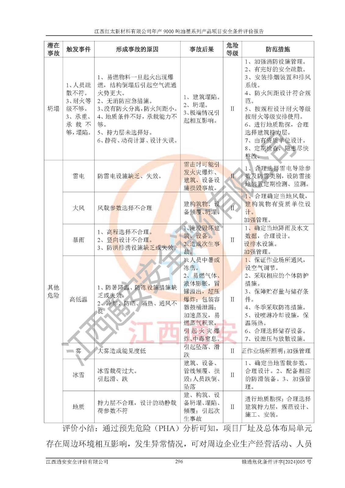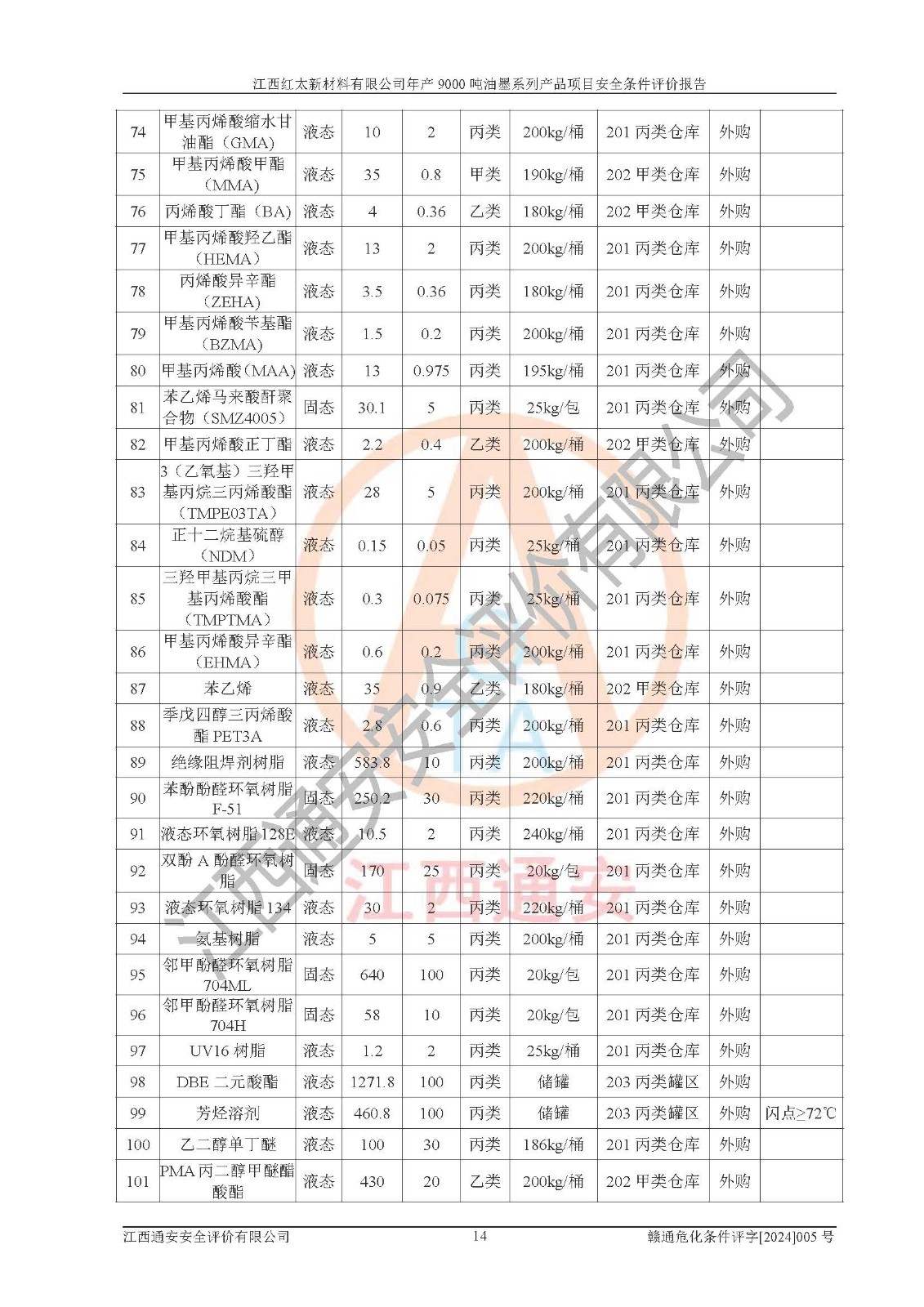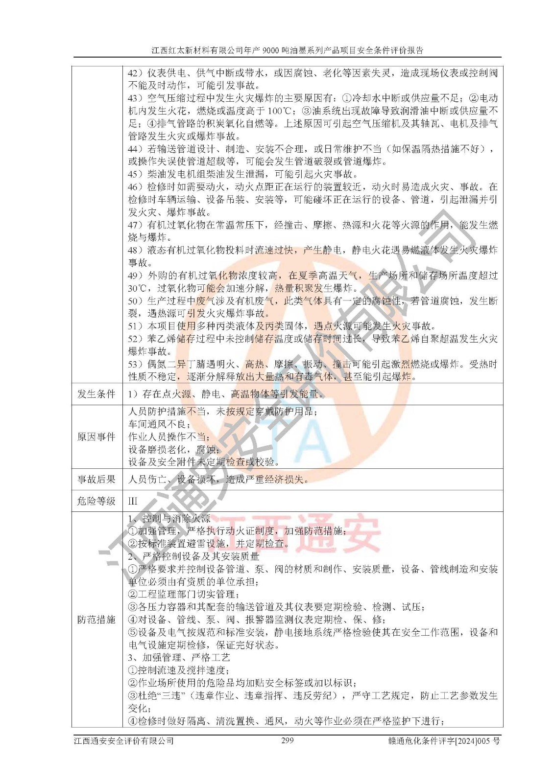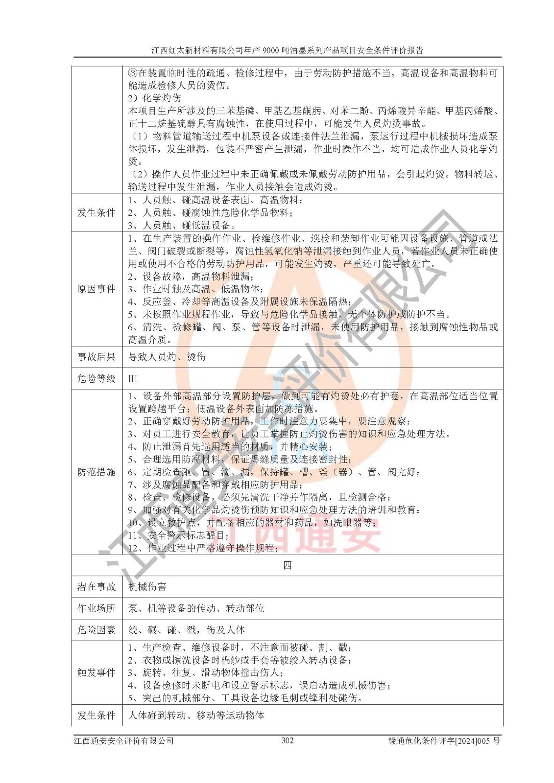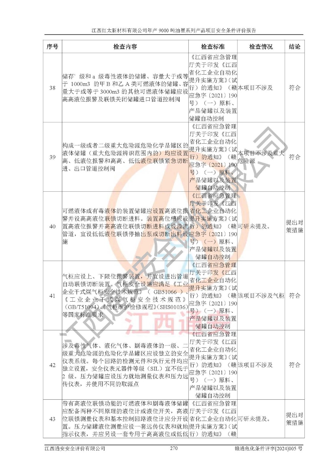 1)本項(xiàng)目依法取得了《江西省企業(yè)投資項(xiàng)目備案通知書》、《建設(shè)用地規(guī)劃許可證》,符合地方產(chǎn)業(yè)發(fā)展規(guī)劃的要求。 2)根據(jù)《**安全監(jiān)管總局關(guān)于公布首批重點(diǎn)監(jiān)管的危險(xiǎn)化工工藝目錄的通知》(安監(jiān)總管三[2009]116號(hào))和《**安全監(jiān)管總局關(guān)于公布第二批重點(diǎn)監(jiān)管危險(xiǎn)化工工藝目錄和調(diào)整首批重點(diǎn)監(jiān)管危險(xiǎn)化工工藝中部分典型工藝的通知》(安監(jiān)總管三[2013]3號(hào)),本項(xiàng)目聚合工藝為常壓條件生產(chǎn)工藝,故不列入危險(xiǎn)工藝。 3)根據(jù)《危險(xiǎn)化學(xué)品重大危險(xiǎn)源辨識(shí)》(GB18218-2018),該項(xiàng)目未構(gòu)成危險(xiǎn)化學(xué)品重大危險(xiǎn)源。 4)項(xiàng)目存在的主要危險(xiǎn)因素有:火災(zāi)爆炸、容器爆炸、中毒窒息、灼燙、觸電、**傷害、機(jī)械傷害、高處墜落、物體打擊、淹溺等,存在的主要危害因素有:噪聲與振動(dòng)、高溫、有害化學(xué)物質(zhì)等;引起事故的原因有人的不安全行為、物的不安全狀態(tài)、管理缺陷和環(huán)境不良。其中*主要的危險(xiǎn)有害因素是火災(zāi)爆炸。 5)采用預(yù)先危險(xiǎn)性分析法評(píng)價(jià),結(jié)果為: (1)通過預(yù)先危險(xiǎn)(PHA)分析可知,項(xiàng)目廠址及總體布局單元存在周邊環(huán)境相互影響,發(fā)生異常情況,可對(duì)周邊企業(yè)生產(chǎn)經(jīng)營(yíng)活動(dòng)、人員活動(dòng)產(chǎn)生影響;存在自然條件影響,可因雷擊、暴雨等引起事故;存在**傷害、建筑物危害,其固有的危險(xiǎn)性等級(jí)為Ⅱ級(jí),屬于“臨界的”,應(yīng)予以排除、采取控制措施因素。 (2)生產(chǎn)作業(yè)存在的危險(xiǎn)因素包括火災(zāi)爆炸、觸電、灼燙、中毒窒息固有的危險(xiǎn)等級(jí)為Ⅲ級(jí),屬于“危險(xiǎn)的”,可能導(dǎo)致人員傷亡和系統(tǒng)損壞的因素,需要采取防范和對(duì)策措施的因素;其它危險(xiǎn)因素固有的危險(xiǎn)等級(jí)為Ⅱ級(jí),屬于“臨界的”,應(yīng)予以排除、采取控制措施因素。 (3)生產(chǎn)作業(yè)存在的噪聲、粉塵、高溫、有害化學(xué)物質(zhì)的危險(xiǎn)有害因素等級(jí)為Ⅱ級(jí),屬于“臨界的”,應(yīng)予以排除、采取控制措施因素。 6)危險(xiǎn)度評(píng)價(jià)分析,結(jié)果為: 生產(chǎn)裝置危險(xiǎn)度評(píng)價(jià)分析:101甲類車間為**危險(xiǎn)(Ⅰ級(jí)),102丙類車間為中度危險(xiǎn)(Ⅱ級(jí))。 儲(chǔ)存單元危險(xiǎn)度評(píng)價(jià)分析:202甲類倉(cāng)庫(kù)為**危險(xiǎn)(Ⅰ級(jí)),201丙類倉(cāng)庫(kù)為低度危險(xiǎn)(Ⅲ級(jí)),203丙類罐區(qū)為中度危險(xiǎn)(Ⅱ級(jí))。 7)作業(yè)條件危險(xiǎn)性評(píng)價(jià)結(jié)果:在選定的評(píng)價(jià)單元中,其危險(xiǎn)分值均在70以下,危險(xiǎn)程度基本屬于“可能危險(xiǎn)”、“稍有危險(xiǎn)”范圍,作業(yè)條件相對(duì)安全。企業(yè)經(jīng)營(yíng)過程中首先應(yīng)重點(diǎn)加強(qiáng)對(duì)甲類生產(chǎn)車間、甲類倉(cāng)庫(kù)、儲(chǔ)罐區(qū)的危險(xiǎn)因素的嚴(yán)格控制,注重日常安全管理;其次要建立健全完善的安全生產(chǎn)責(zé)任制、安全管理制度、安全技術(shù)操作規(guī)程并**其貫徹落實(shí);第三要認(rèn)真抓好操作人員、管理人員的安全知識(shí)和操作技能的培訓(xùn),**人員具有與工程技術(shù)水平相適應(yīng)的技術(shù)素質(zhì)和安全素質(zhì),**安全作業(yè)。 8)項(xiàng)目建設(shè)場(chǎng)地符合當(dāng)?shù)匾?guī)劃要求,建設(shè)場(chǎng)地通過合理規(guī)劃,其選址、周邊環(huán)境、總平面布置、交通運(yùn)輸?shù)饶芊稀吨腥A人民共和國(guó)安全生產(chǎn)法》、《危險(xiǎn)化學(xué)品安全管理?xiàng)l例》、《建筑設(shè)計(jì)防火規(guī)范》、《精細(xì)化工企業(yè)工程設(shè)計(jì)防火標(biāo)準(zhǔn)》等法規(guī)、標(biāo)準(zhǔn)、規(guī)范要求。 廠址地區(qū)地震活動(dòng)相對(duì)較弱,災(zāi)害性天氣出現(xiàn)頻率稍高,自然災(zāi)害對(duì)項(xiàng)目建設(shè)具有**影響,通過采取相應(yīng)的防護(hù)措施,自然條件適宜建設(shè)。 9)建設(shè)項(xiàng)目符合**產(chǎn)業(yè)政策的要求;選擇工藝為現(xiàn)行成熟工藝,其安全可靠性可得到**。 10)本報(bào)告已根據(jù)有關(guān)安全生產(chǎn)法律、法規(guī)、規(guī)章和**標(biāo)準(zhǔn)、行業(yè)標(biāo)準(zhǔn),并嚴(yán)格執(zhí)行省委辦公廳省**辦公廳《關(guān)于全面加強(qiáng)危險(xiǎn)化學(xué)品安全生產(chǎn)工作的實(shí)施意見》(贛辦發(fā)[2020]32號(hào))及都陽(yáng)湖生態(tài)經(jīng)濟(jì)區(qū)、長(zhǎng)江經(jīng)濟(jì)帶、“五河一湖”相關(guān)政策規(guī)定,客觀、公正、科學(xué)地進(jìn)行安全評(píng)價(jià),項(xiàng)目符合《江西省應(yīng)急管理廳關(guān)于印發(fā)《江西省危險(xiǎn)化學(xué)品建設(shè)項(xiàng)目安全監(jiān)督管理實(shí)施細(xì)則》(試行)的通知》(贛應(yīng)急字[2021]100號(hào))的要求。 11)本報(bào)告結(jié)合工藝特征,提出應(yīng)采取的對(duì)應(yīng)的自動(dòng)化控制系統(tǒng)及自動(dòng)化實(shí)施方案,滿足《江西省應(yīng)急管理廳關(gu