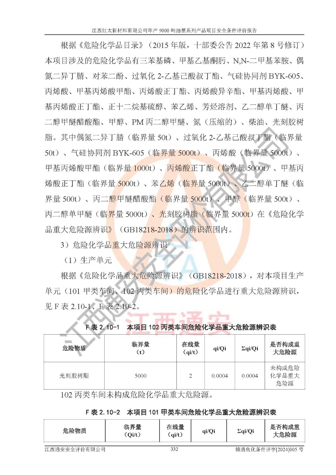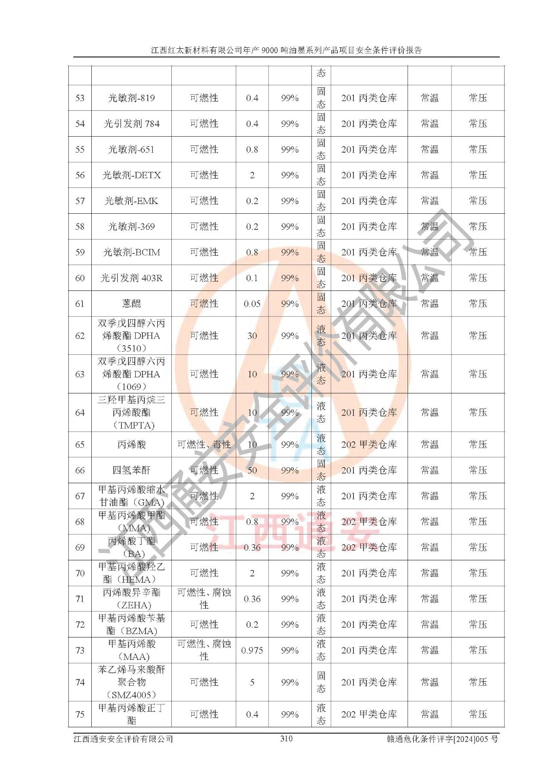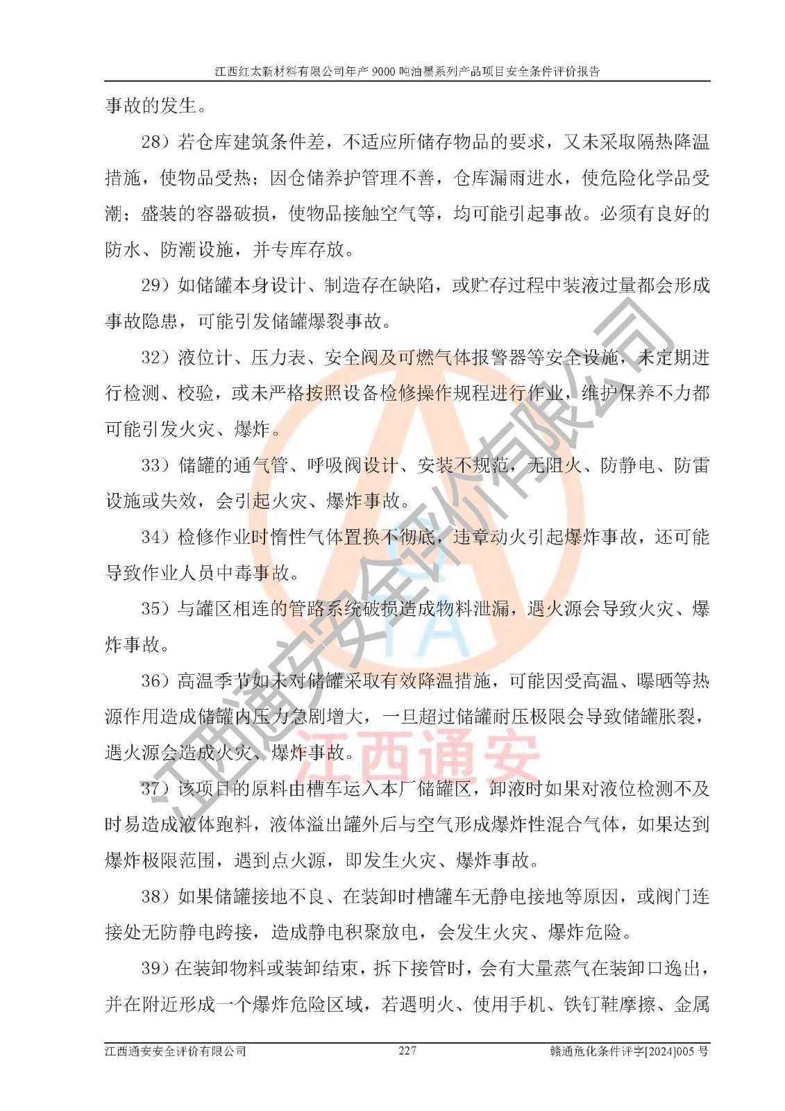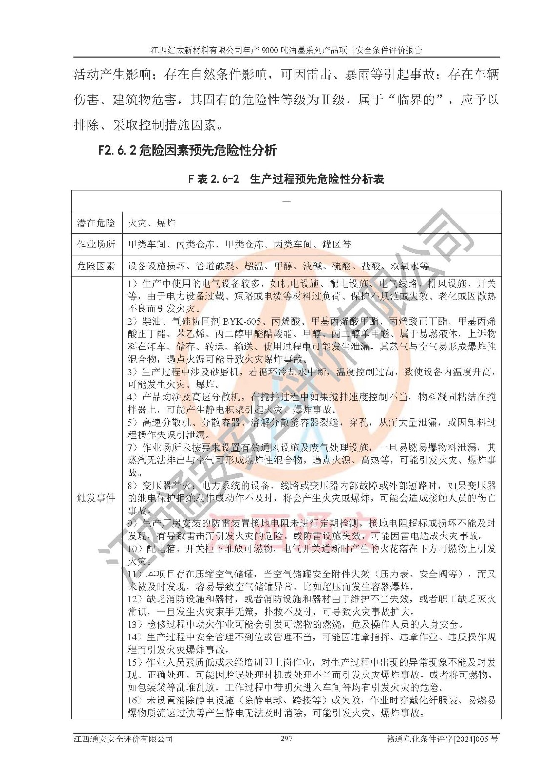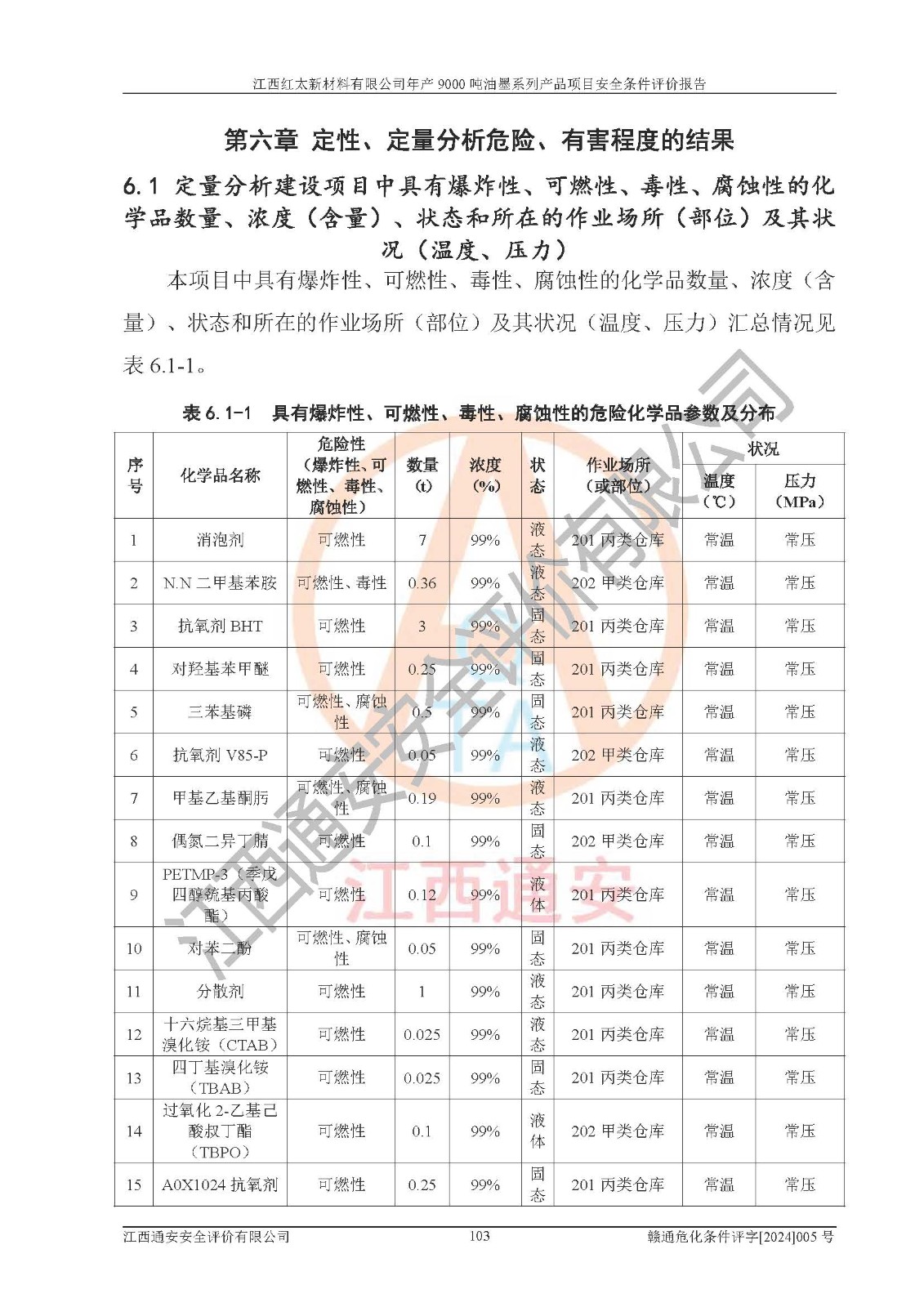 1)本項(xiàng)目依法取得了《江西省企業(yè)投資項(xiàng)目備案通知書》、《建設(shè)用地規(guī)劃許可證》,符合地方產(chǎn)業(yè)發(fā)展規(guī)劃的要求。 2)根據(jù)《**安全監(jiān)管總局關(guān)于公布首批重點(diǎn)監(jiān)管的危險(xiǎn)化工工藝目錄的通知》(安監(jiān)總管三[2009]116號(hào))和《**安全監(jiān)管總局關(guān)于公布第二批重點(diǎn)監(jiān)管危險(xiǎn)化工工藝目錄和調(diào)整首批重點(diǎn)監(jiān)管危險(xiǎn)化工工藝中部分典型工藝的通知》(安監(jiān)總管三[2013]3號(hào)),本項(xiàng)目聚合工藝為常壓條件生產(chǎn)工藝,故不列入危險(xiǎn)工藝。 3)根據(jù)《危險(xiǎn)化學(xué)品重大危險(xiǎn)源辨識(shí)》(GB18218-2018),該項(xiàng)目未構(gòu)成危險(xiǎn)化學(xué)品重大危險(xiǎn)源。 4)項(xiàng)目存在的主要危險(xiǎn)因素有:火災(zāi)爆炸、容器爆炸、中毒窒息、灼燙、觸電、**傷害、機(jī)械傷害、高處墜落、物體打擊、淹溺等,存在的主要危害因素有:噪聲與振動(dòng)、高溫、有害化學(xué)物質(zhì)等;引起事故的原因有人的不安全行為、物的不安全狀態(tài)、管理缺陷和環(huán)境不良。其中*主要的危險(xiǎn)有害因素是火災(zāi)爆炸。 5)采用預(yù)先危險(xiǎn)性分析法評(píng)價(jià),結(jié)果為: (1)通過預(yù)先危險(xiǎn)(PHA)分析可知,項(xiàng)目廠址及總體布局單元存在周邊環(huán)境相互影響,發(fā)生異常情況,可對(duì)周邊企業(yè)生產(chǎn)經(jīng)營(yíng)活動(dòng)、人員活動(dòng)產(chǎn)生影響;存在自然條件影響,可因雷擊、暴雨等引起事故;存在**傷害、建筑物危害,其固有的危險(xiǎn)性等級(jí)為Ⅱ級(jí),屬于“臨界的”,應(yīng)予以排除、采取控制措施因素。 (2)生產(chǎn)作業(yè)存在的危險(xiǎn)因素包括火災(zāi)爆炸、觸電、灼燙、中毒窒息固有的危險(xiǎn)等級(jí)為Ⅲ級(jí),屬于“危險(xiǎn)的”,可能導(dǎo)致人員傷亡和系統(tǒng)損壞的因素,需要采取防范和對(duì)策措施的因素;其它危險(xiǎn)因素固有的危險(xiǎn)等級(jí)為Ⅱ級(jí),屬于“臨界的”,應(yīng)予以排除、采取控制措施因素。 (3)生產(chǎn)作業(yè)存在的噪聲、粉塵、高溫、有害化學(xué)物質(zhì)的危險(xiǎn)有害因素等級(jí)為Ⅱ級(jí),屬于“臨界的”,應(yīng)予以排除、采取控制措施因素。 6)危險(xiǎn)度評(píng)價(jià)分析,結(jié)果為: 生產(chǎn)裝置危險(xiǎn)度評(píng)價(jià)分析:101甲類車間為**危險(xiǎn)(Ⅰ級(jí)),102丙類車間為中度危險(xiǎn)(Ⅱ級(jí))。 儲(chǔ)存單元危險(xiǎn)度評(píng)價(jià)分析:202甲類倉(cāng)庫(kù)為**危險(xiǎn)(Ⅰ級(jí)),201丙類倉(cāng)庫(kù)為低度危險(xiǎn)(Ⅲ級(jí)),203丙類罐區(qū)為中度危險(xiǎn)(Ⅱ級(jí))。 7)作業(yè)條件危險(xiǎn)性評(píng)價(jià)結(jié)果:在選定的評(píng)價(jià)單元中,其危險(xiǎn)分值均在70以下,危險(xiǎn)程度基本屬于“可能危險(xiǎn)”、“稍有危險(xiǎn)”范圍,作業(yè)條件相對(duì)安全。企業(yè)經(jīng)營(yíng)過程中首先應(yīng)重點(diǎn)加強(qiáng)對(duì)甲類生產(chǎn)車間、甲類倉(cāng)庫(kù)、儲(chǔ)罐區(qū)的危險(xiǎn)因素的嚴(yán)格控制,注重日常安全管理;其次要建立健全完善的安全生產(chǎn)責(zé)任制、安全管理制度、安全技術(shù)操作規(guī)程并**其貫徹落實(shí);第三要認(rèn)真抓好操作人員、管理人員的安全知識(shí)和操作技能的培訓(xùn),**人員具有與工程技術(shù)水平相適應(yīng)的技術(shù)素質(zhì)和安全素質(zhì),**安全作業(yè)。 8)項(xiàng)目建設(shè)場(chǎng)地符合當(dāng)?shù)匾?guī)劃要求,建設(shè)場(chǎng)地通過合理規(guī)劃,其選址、周邊環(huán)境、總平面布置、交通運(yùn)輸?shù)饶芊稀吨腥A人民共和國(guó)安全生產(chǎn)法》、《危險(xiǎn)化學(xué)品安全管理?xiàng)l例》、《建筑設(shè)計(jì)防火規(guī)范》、《精細(xì)化工企業(yè)工程設(shè)計(jì)防火標(biāo)準(zhǔn)》等法規(guī)、標(biāo)準(zhǔn)、規(guī)范要求。 廠址地區(qū)地震活動(dòng)相對(duì)較弱,災(zāi)害性天氣出現(xiàn)頻率稍高,自然災(zāi)害對(duì)項(xiàng)目建設(shè)具有**影響,通過采取相應(yīng)的防護(hù)措施,自然條件適宜建設(shè)。 9)建設(shè)項(xiàng)目符合**產(chǎn)業(yè)政策的要求;選擇工藝為現(xiàn)行成熟工藝,其安全可靠性可得到**。 10)本報(bào)告已根據(jù)有關(guān)安全生產(chǎn)法律、法規(guī)、規(guī)章和**標(biāo)準(zhǔn)、行業(yè)標(biāo)準(zhǔn),并嚴(yán)格執(zhí)行省委辦公廳省**辦公廳《關(guān)于全面加強(qiáng)危險(xiǎn)化學(xué)品安全生產(chǎn)工作的實(shí)施意見》(贛辦發(fā)[2020]32號(hào))及都陽(yáng)湖生態(tài)經(jīng)濟(jì)區(qū)、長(zhǎng)江經(jīng)濟(jì)帶、“五河一湖”相關(guān)政策規(guī)定,客觀、公正、科學(xué)地進(jìn)行安全評(píng)價(jià),項(xiàng)目符合《江西省應(yīng)急管理廳關(guān)于印發(fā)《江西省危險(xiǎn)化學(xué)品建設(shè)項(xiàng)目安全監(jiān)督管理實(shí)施細(xì)則》(試行)的通知》(贛應(yīng)急字[2021]100號(hào))的要求。 11)本報(bào)告結(jié)合工藝特征,提出應(yīng)采取的對(duì)應(yīng)的自動(dòng)化控制系統(tǒng)及自動(dòng)化實(shí)施方案,滿足《江西省應(yīng)急管理廳關(gu