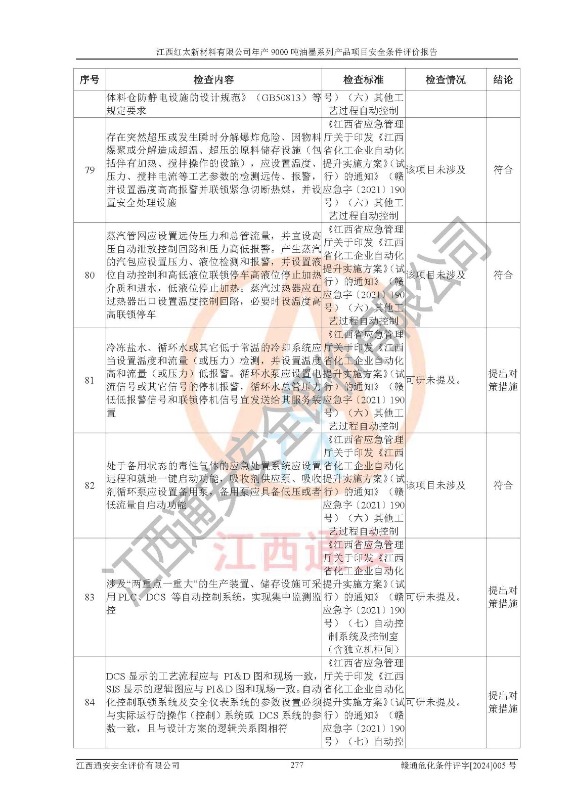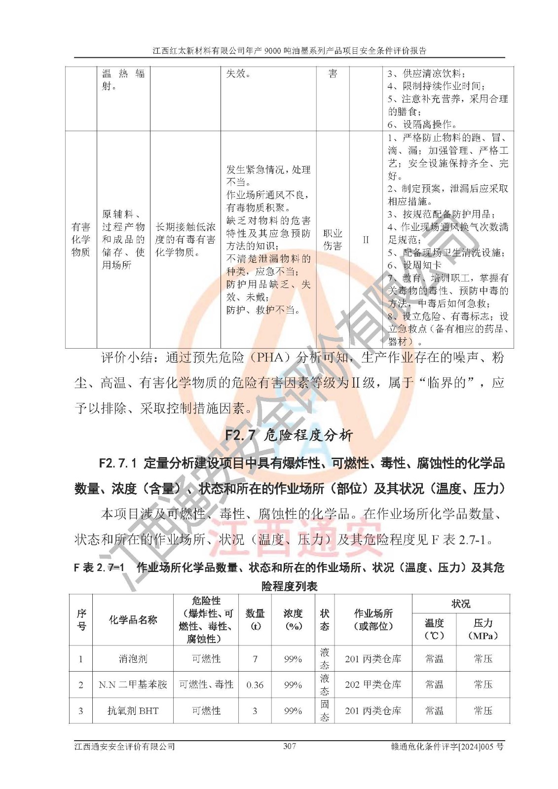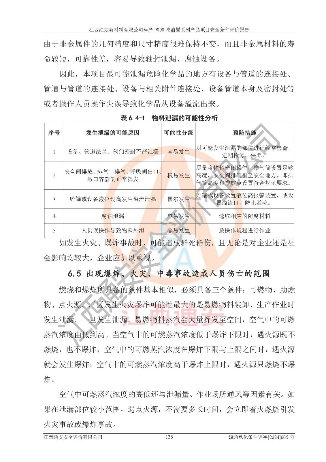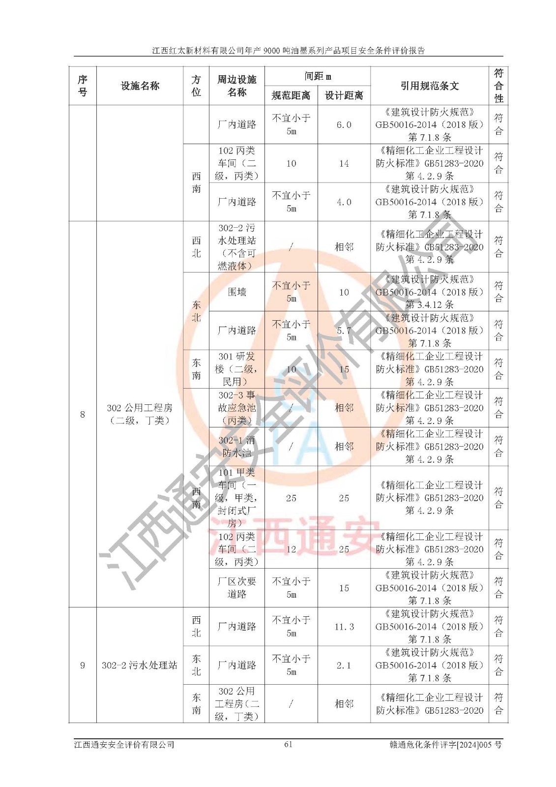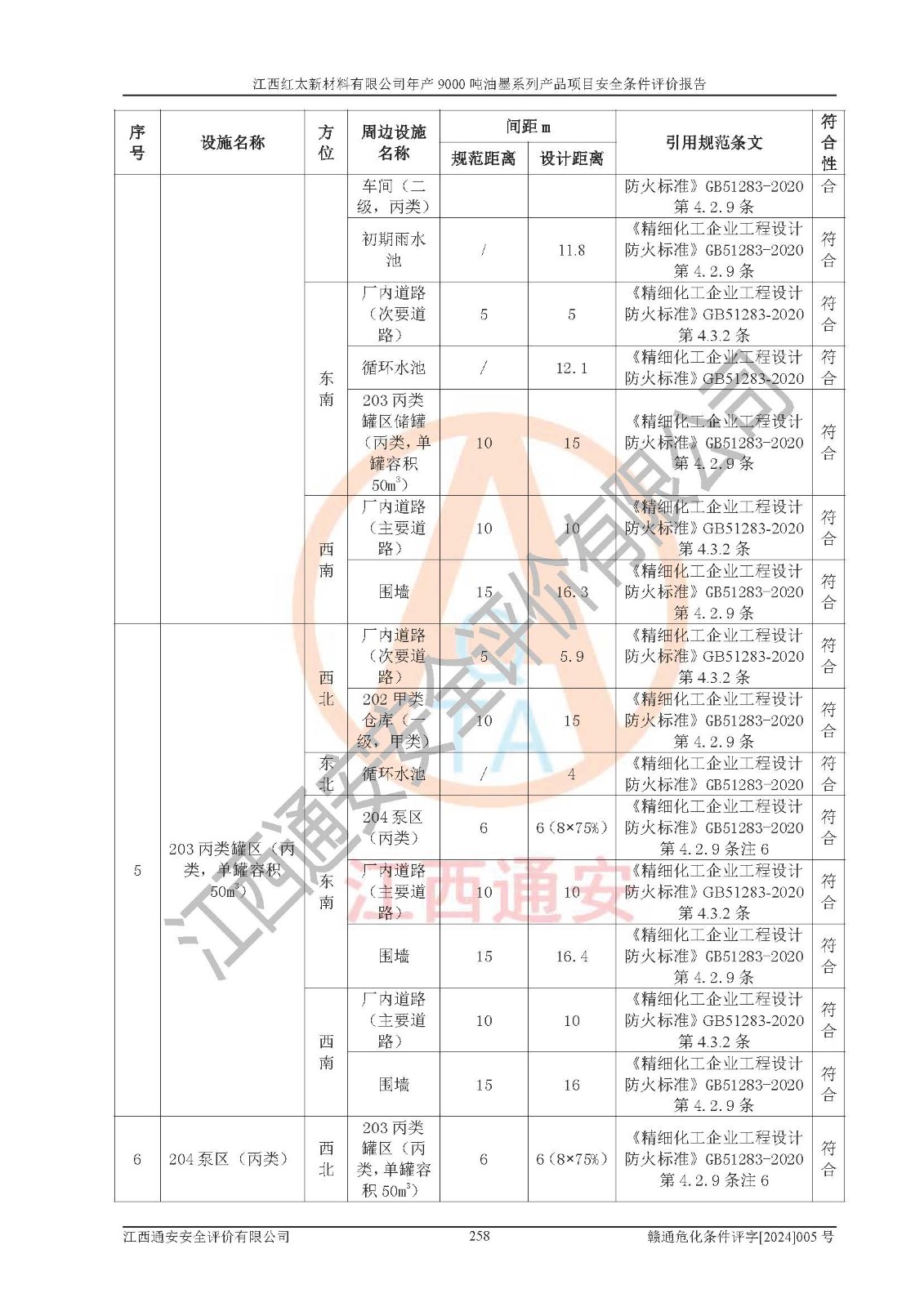 1)本項(xiàng)目依法取得了《江西省企業(yè)投資項(xiàng)目備案通知書》、《建設(shè)用地規(guī)劃許可證》,符合地方產(chǎn)業(yè)發(fā)展規(guī)劃的要求。 2)根據(jù)《**安全監(jiān)管總局關(guān)于公布首批重點(diǎn)監(jiān)管的危險(xiǎn)化工工藝目錄的通知》(安監(jiān)總管三[2009]116號(hào))和《**安全監(jiān)管總局關(guān)于公布第二批重點(diǎn)監(jiān)管危險(xiǎn)化工工藝目錄和調(diào)整首批重點(diǎn)監(jiān)管危險(xiǎn)化工工藝中部分典型工藝的通知》(安監(jiān)總管三[2013]3號(hào)),本項(xiàng)目聚合工藝為常壓條件生產(chǎn)工藝,故不列入危險(xiǎn)工藝。 3)根據(jù)《危險(xiǎn)化學(xué)品重大危險(xiǎn)源辨識(shí)》(GB18218-2018),該項(xiàng)目未構(gòu)成危險(xiǎn)化學(xué)品重大危險(xiǎn)源。 4)項(xiàng)目存在的主要危險(xiǎn)因素有:火災(zāi)爆炸、容器爆炸、中毒窒息、灼燙、觸電、**傷害、機(jī)械傷害、高處墜落、物體打擊、淹溺等,存在的主要危害因素有:噪聲與振動(dòng)、高溫、有害化學(xué)物質(zhì)等;引起事故的原因有人的不安全行為、物的不安全狀態(tài)、管理缺陷和環(huán)境不良。其中*主要的危險(xiǎn)有害因素是火災(zāi)爆炸。 5)采用預(yù)先危險(xiǎn)性分析法評(píng)價(jià),結(jié)果為: (1)通過預(yù)先危險(xiǎn)(PHA)分析可知,項(xiàng)目廠址及總體布局單元存在周邊環(huán)境相互影響,發(fā)生異常情況,可對(duì)周邊企業(yè)生產(chǎn)經(jīng)營(yíng)活動(dòng)、人員活動(dòng)產(chǎn)生影響;存在自然條件影響,可因雷擊、暴雨等引起事故;存在**傷害、建筑物危害,其固有的危險(xiǎn)性等級(jí)為Ⅱ級(jí),屬于“臨界的”,應(yīng)予以排除、采取控制措施因素。 (2)生產(chǎn)作業(yè)存在的危險(xiǎn)因素包括火災(zāi)爆炸、觸電、灼燙、中毒窒息固有的危險(xiǎn)等級(jí)為Ⅲ級(jí),屬于“危險(xiǎn)的”,可能導(dǎo)致人員傷亡和系統(tǒng)損壞的因素,需要采取防范和對(duì)策措施的因素;其它危險(xiǎn)因素固有的危險(xiǎn)等級(jí)為Ⅱ級(jí),屬于“臨界的”,應(yīng)予以排除、采取控制措施因素。 (3)生產(chǎn)作業(yè)存在的噪聲、粉塵、高溫、有害化學(xué)物質(zhì)的危險(xiǎn)有害因素等級(jí)為Ⅱ級(jí),屬于“臨界的”,應(yīng)予以排除、采取控制措施因素。 6)危險(xiǎn)度評(píng)價(jià)分析,結(jié)果為: 生產(chǎn)裝置危險(xiǎn)度評(píng)價(jià)分析:101甲類車間為**危險(xiǎn)(Ⅰ級(jí)),102丙類車間為中度危險(xiǎn)(Ⅱ級(jí))。 儲(chǔ)存單元危險(xiǎn)度評(píng)價(jià)分析:202甲類倉(cāng)庫(kù)為**危險(xiǎn)(Ⅰ級(jí)),201丙類倉(cāng)庫(kù)為低度危險(xiǎn)(Ⅲ級(jí)),203丙類罐區(qū)為中度危險(xiǎn)(Ⅱ級(jí))。 7)作業(yè)條件危險(xiǎn)性評(píng)價(jià)結(jié)果:在選定的評(píng)價(jià)單元中,其危險(xiǎn)分值均在70以下,危險(xiǎn)程度基本屬于“可能危險(xiǎn)”、“稍有危險(xiǎn)”范圍,作業(yè)條件相對(duì)安全。企業(yè)經(jīng)營(yíng)過程中首先應(yīng)重點(diǎn)加強(qiáng)對(duì)甲類生產(chǎn)車間、甲類倉(cāng)庫(kù)、儲(chǔ)罐區(qū)的危險(xiǎn)因素的嚴(yán)格控制,注重日常安全管理;其次要建立健全完善的安全生產(chǎn)責(zé)任制、安全管理制度、安全技術(shù)操作規(guī)程并**其貫徹落實(shí);第三要認(rèn)真抓好操作人員、管理人員的安全知識(shí)和操作技能的培訓(xùn),**人員具有與工程技術(shù)水平相適應(yīng)的技術(shù)素質(zhì)和安全素質(zhì),**安全作業(yè)。 8)項(xiàng)目建設(shè)場(chǎng)地符合當(dāng)?shù)匾?guī)劃要求,建設(shè)場(chǎng)地通過合理規(guī)劃,其選址、周邊環(huán)境、總平面布置、交通運(yùn)輸?shù)饶芊稀吨腥A人民共和國(guó)安全生產(chǎn)法》、《危險(xiǎn)化學(xué)品安全管理?xiàng)l例》、《建筑設(shè)計(jì)防火規(guī)范》、《精細(xì)化工企業(yè)工程設(shè)計(jì)防火標(biāo)準(zhǔn)》等法規(guī)、標(biāo)準(zhǔn)、規(guī)范要求。 廠址地區(qū)地震活動(dòng)相對(duì)較弱,災(zāi)害性天氣出現(xiàn)頻率稍高,自然災(zāi)害對(duì)項(xiàng)目建設(shè)具有**影響,通過采取相應(yīng)的防護(hù)措施,自然條件適宜建設(shè)。 9)建設(shè)項(xiàng)目符合**產(chǎn)業(yè)政策的要求;選擇工藝為現(xiàn)行成熟工藝,其安全可靠性可得到**。 10)本報(bào)告已根據(jù)有關(guān)安全生產(chǎn)法律、法規(guī)、規(guī)章和**標(biāo)準(zhǔn)、行業(yè)標(biāo)準(zhǔn),并嚴(yán)格執(zhí)行省委辦公廳省**辦公廳《關(guān)于全面加強(qiáng)危險(xiǎn)化學(xué)品安全生產(chǎn)工作的實(shí)施意見》(贛辦發(fā)[2020]32號(hào))及都陽(yáng)湖生態(tài)經(jīng)濟(jì)區(qū)、長(zhǎng)江經(jīng)濟(jì)帶、“五河一湖”相關(guān)政策規(guī)定,客觀、公正、科學(xué)地進(jìn)行安全評(píng)價(jià),項(xiàng)目符合《江西省應(yīng)急管理廳關(guān)于印發(fā)《江西省危險(xiǎn)化學(xué)品建設(shè)項(xiàng)目安全監(jiān)督管理實(shí)施細(xì)則》(試行)的通知》(贛應(yīng)急字[2021]100號(hào))的要求。 11)本報(bào)告結(jié)合工藝特征,提出應(yīng)采取的對(duì)應(yīng)的自動(dòng)化控制系統(tǒng)及自動(dòng)化實(shí)施方案,滿足《江西省應(yīng)急管理廳關(gu