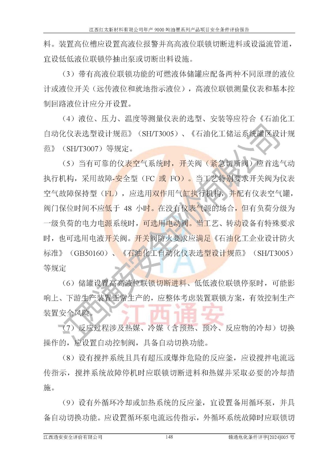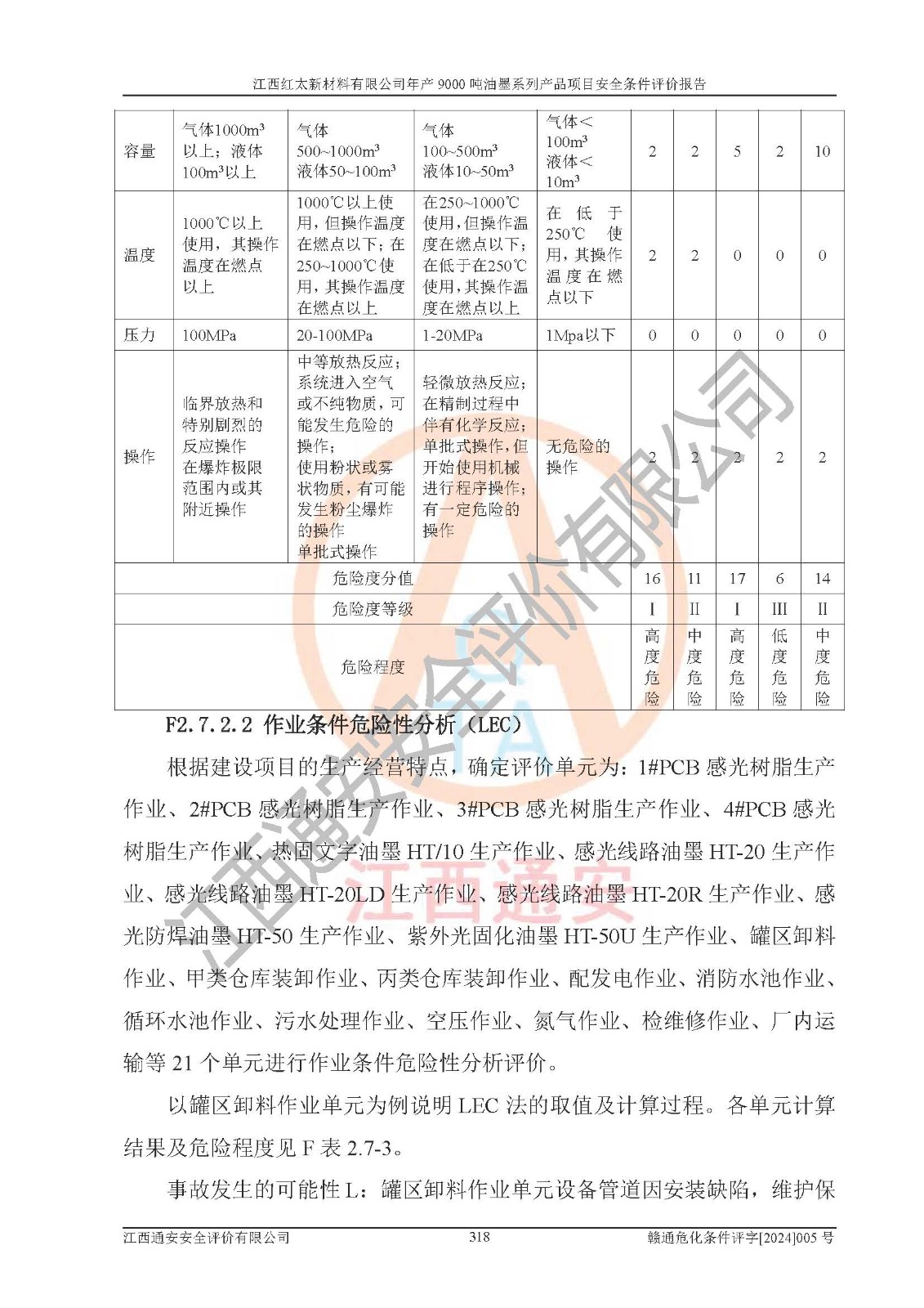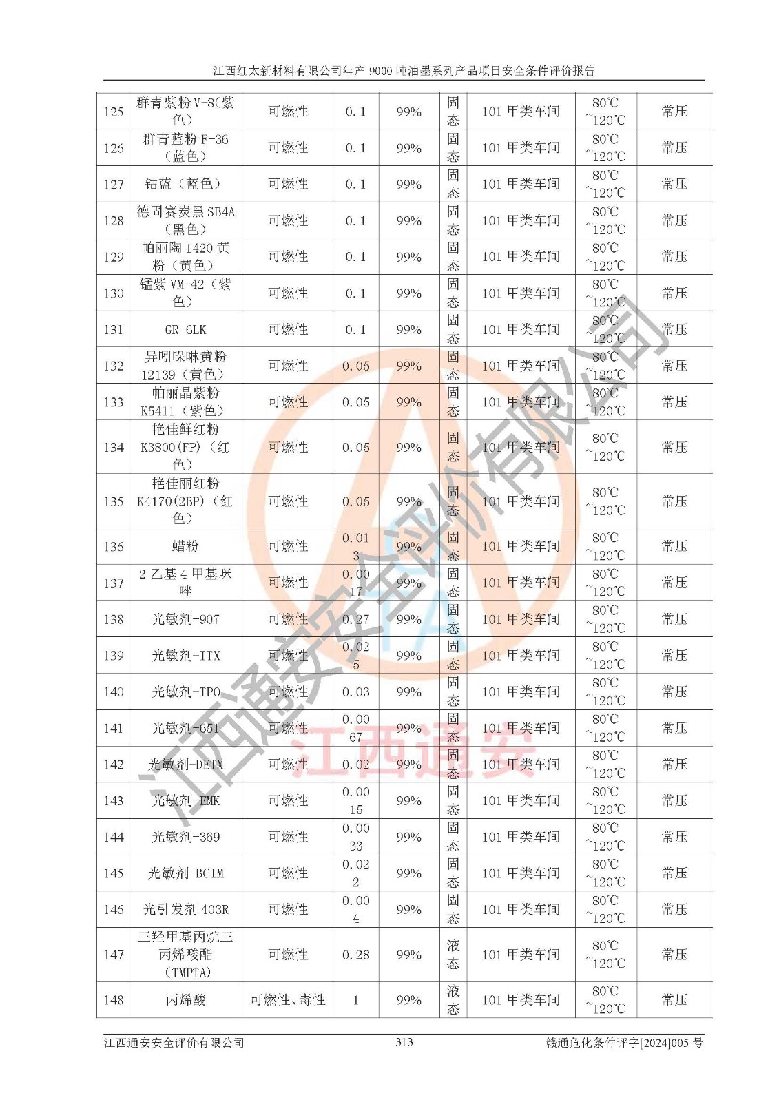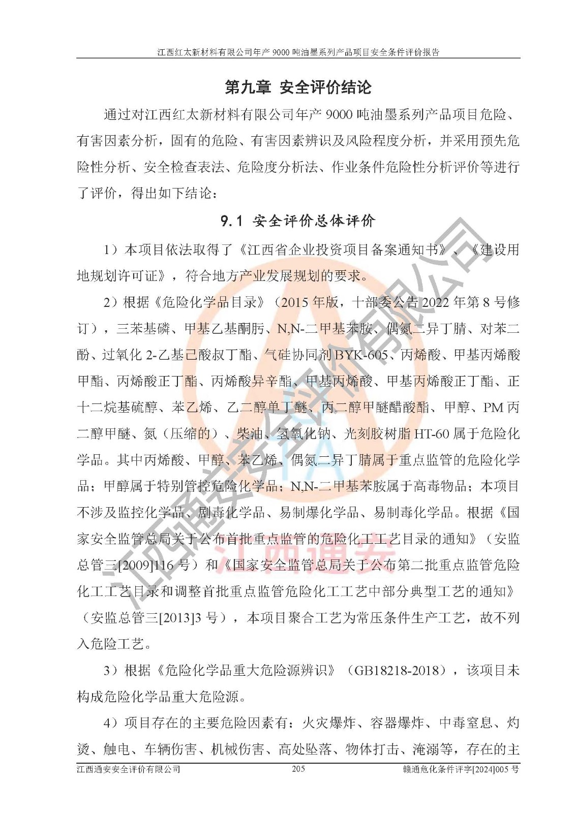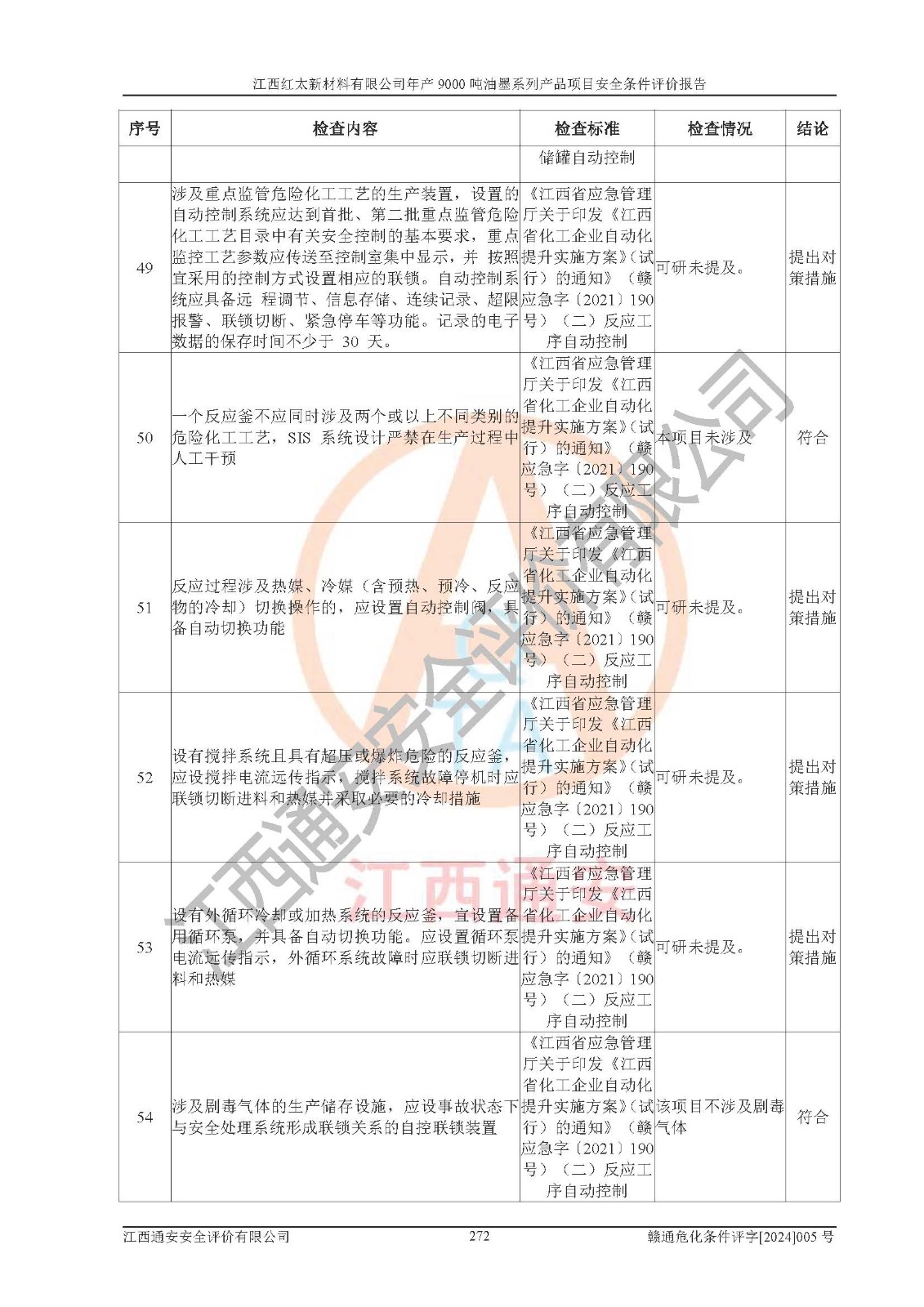 1)本項(xiàng)目依法取得了《江西省企業(yè)投資項(xiàng)目備案通知書》、《建設(shè)用地規(guī)劃許可證》,符合地方產(chǎn)業(yè)發(fā)展規(guī)劃的要求。 2)根據(jù)《**安全監(jiān)管總局關(guān)于公布首批重點(diǎn)監(jiān)管的危險(xiǎn)化工工藝目錄的通知》(安監(jiān)總管三[2009]116號(hào))和《**安全監(jiān)管總局關(guān)于公布第二批重點(diǎn)監(jiān)管危險(xiǎn)化工工藝目錄和調(diào)整首批重點(diǎn)監(jiān)管危險(xiǎn)化工工藝中部分典型工藝的通知》(安監(jiān)總管三[2013]3號(hào)),本項(xiàng)目聚合工藝為常壓條件生產(chǎn)工藝,故不列入危險(xiǎn)工藝。 3)根據(jù)《危險(xiǎn)化學(xué)品重大危險(xiǎn)源辨識(shí)》(GB18218-2018),該項(xiàng)目未構(gòu)成危險(xiǎn)化學(xué)品重大危險(xiǎn)源。 4)項(xiàng)目存在的主要危險(xiǎn)因素有:火災(zāi)爆炸、容器爆炸、中毒窒息、灼燙、觸電、**傷害、機(jī)械傷害、高處墜落、物體打擊、淹溺等,存在的主要危害因素有:噪聲與振動(dòng)、高溫、有害化學(xué)物質(zhì)等;引起事故的原因有人的不安全行為、物的不安全狀態(tài)、管理缺陷和環(huán)境不良。其中*主要的危險(xiǎn)有害因素是火災(zāi)爆炸。 5)采用預(yù)先危險(xiǎn)性分析法評(píng)價(jià),結(jié)果為: (1)通過預(yù)先危險(xiǎn)(PHA)分析可知,項(xiàng)目廠址及總體布局單元存在周邊環(huán)境相互影響,發(fā)生異常情況,可對(duì)周邊企業(yè)生產(chǎn)經(jīng)營(yíng)活動(dòng)、人員活動(dòng)產(chǎn)生影響;存在自然條件影響,可因雷擊、暴雨等引起事故;存在**傷害、建筑物危害,其固有的危險(xiǎn)性等級(jí)為Ⅱ級(jí),屬于“臨界的”,應(yīng)予以排除、采取控制措施因素。 (2)生產(chǎn)作業(yè)存在的危險(xiǎn)因素包括火災(zāi)爆炸、觸電、灼燙、中毒窒息固有的危險(xiǎn)等級(jí)為Ⅲ級(jí),屬于“危險(xiǎn)的”,可能導(dǎo)致人員傷亡和系統(tǒng)損壞的因素,需要采取防范和對(duì)策措施的因素;其它危險(xiǎn)因素固有的危險(xiǎn)等級(jí)為Ⅱ級(jí),屬于“臨界的”,應(yīng)予以排除、采取控制措施因素。 (3)生產(chǎn)作業(yè)存在的噪聲、粉塵、高溫、有害化學(xué)物質(zhì)的危險(xiǎn)有害因素等級(jí)為Ⅱ級(jí),屬于“臨界的”,應(yīng)予以排除、采取控制措施因素。 6)危險(xiǎn)度評(píng)價(jià)分析,結(jié)果為: 生產(chǎn)裝置危險(xiǎn)度評(píng)價(jià)分析:101甲類車間為**危險(xiǎn)(Ⅰ級(jí)),102丙類車間為中度危險(xiǎn)(Ⅱ級(jí))。 儲(chǔ)存單元危險(xiǎn)度評(píng)價(jià)分析:202甲類倉(cāng)庫(kù)為**危險(xiǎn)(Ⅰ級(jí)),201丙類倉(cāng)庫(kù)為低度危險(xiǎn)(Ⅲ級(jí)),203丙類罐區(qū)為中度危險(xiǎn)(Ⅱ級(jí))。 7)作業(yè)條件危險(xiǎn)性評(píng)價(jià)結(jié)果:在選定的評(píng)價(jià)單元中,其危險(xiǎn)分值均在70以下,危險(xiǎn)程度基本屬于“可能危險(xiǎn)”、“稍有危險(xiǎn)”范圍,作業(yè)條件相對(duì)安全。企業(yè)經(jīng)營(yíng)過程中首先應(yīng)重點(diǎn)加強(qiáng)對(duì)甲類生產(chǎn)車間、甲類倉(cāng)庫(kù)、儲(chǔ)罐區(qū)的危險(xiǎn)因素的嚴(yán)格控制,注重日常安全管理;其次要建立健全完善的安全生產(chǎn)責(zé)任制、安全管理制度、安全技術(shù)操作規(guī)程并**其貫徹落實(shí);第三要認(rèn)真抓好操作人員、管理人員的安全知識(shí)和操作技能的培訓(xùn),**人員具有與工程技術(shù)水平相適應(yīng)的技術(shù)素質(zhì)和安全素質(zhì),**安全作業(yè)。 8)項(xiàng)目建設(shè)場(chǎng)地符合當(dāng)?shù)匾?guī)劃要求,建設(shè)場(chǎng)地通過合理規(guī)劃,其選址、周邊環(huán)境、總平面布置、交通運(yùn)輸?shù)饶芊稀吨腥A人民共和國(guó)安全生產(chǎn)法》、《危險(xiǎn)化學(xué)品安全管理?xiàng)l例》、《建筑設(shè)計(jì)防火規(guī)范》、《精細(xì)化工企業(yè)工程設(shè)計(jì)防火標(biāo)準(zhǔn)》等法規(guī)、標(biāo)準(zhǔn)、規(guī)范要求。 廠址地區(qū)地震活動(dòng)相對(duì)較弱,災(zāi)害性天氣出現(xiàn)頻率稍高,自然災(zāi)害對(duì)項(xiàng)目建設(shè)具有**影響,通過采取相應(yīng)的防護(hù)措施,自然條件適宜建設(shè)。 9)建設(shè)項(xiàng)目符合**產(chǎn)業(yè)政策的要求;選擇工藝為現(xiàn)行成熟工藝,其安全可靠性可得到**。 10)本報(bào)告已根據(jù)有關(guān)安全生產(chǎn)法律、法規(guī)、規(guī)章和**標(biāo)準(zhǔn)、行業(yè)標(biāo)準(zhǔn),并嚴(yán)格執(zhí)行省委辦公廳省**辦公廳《關(guān)于全面加強(qiáng)危險(xiǎn)化學(xué)品安全生產(chǎn)工作的實(shí)施意見》(贛辦發(fā)[2020]32號(hào))及都陽(yáng)湖生態(tài)經(jīng)濟(jì)區(qū)、長(zhǎng)江經(jīng)濟(jì)帶、“五河一湖”相關(guān)政策規(guī)定,客觀、公正、科學(xué)地進(jìn)行安全評(píng)價(jià),項(xiàng)目符合《江西省應(yīng)急管理廳關(guān)于印發(fā)《江西省危險(xiǎn)化學(xué)品建設(shè)項(xiàng)目安全監(jiān)督管理實(shí)施細(xì)則》(試行)的通知》(贛應(yīng)急字[2021]100號(hào))的要求。 11)本報(bào)告結(jié)合工藝特征,提出應(yīng)采取的對(duì)應(yīng)的自動(dòng)化控制系統(tǒng)及自動(dòng)化實(shí)施方案,滿足《江西省應(yīng)急管理廳關(gu