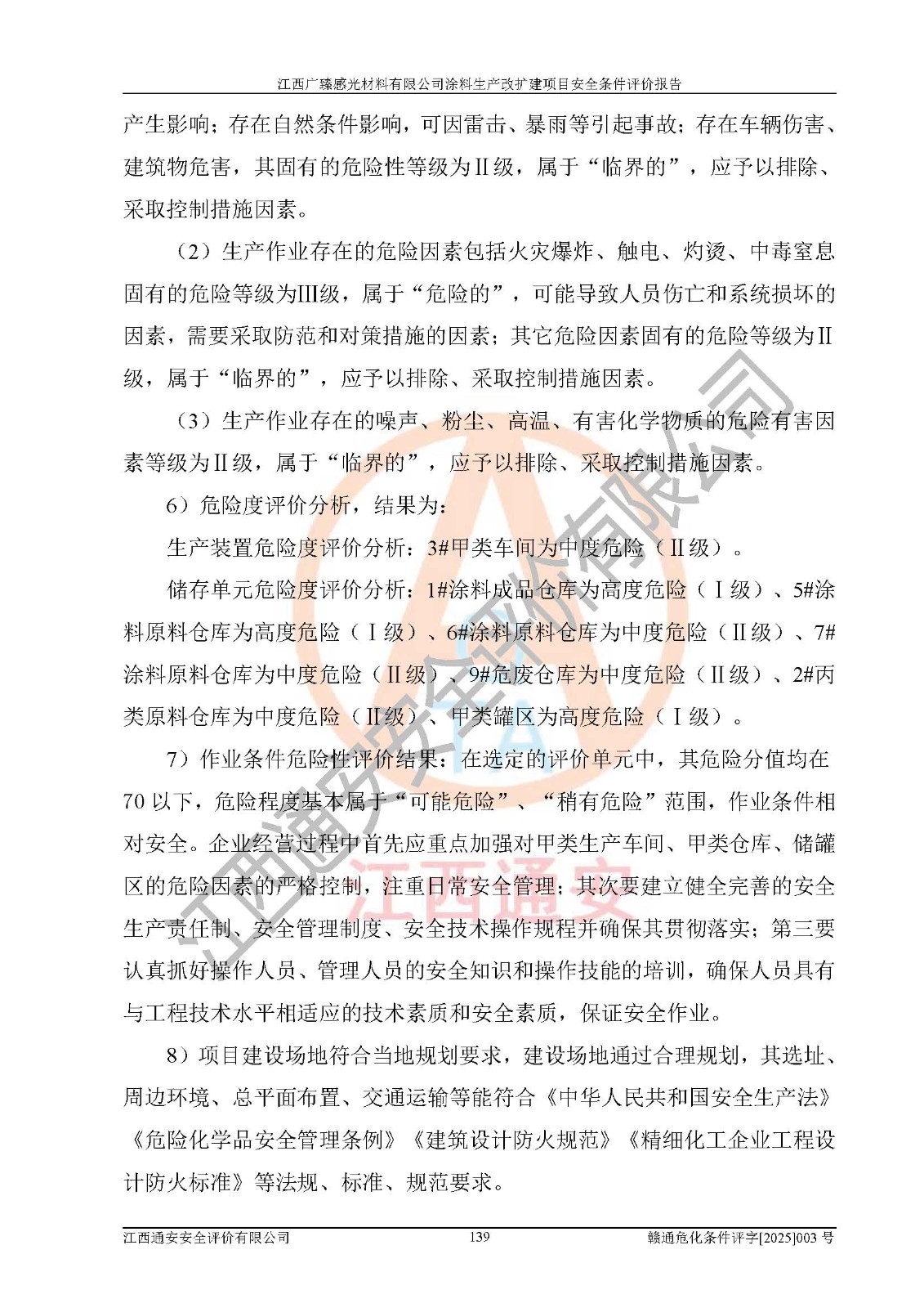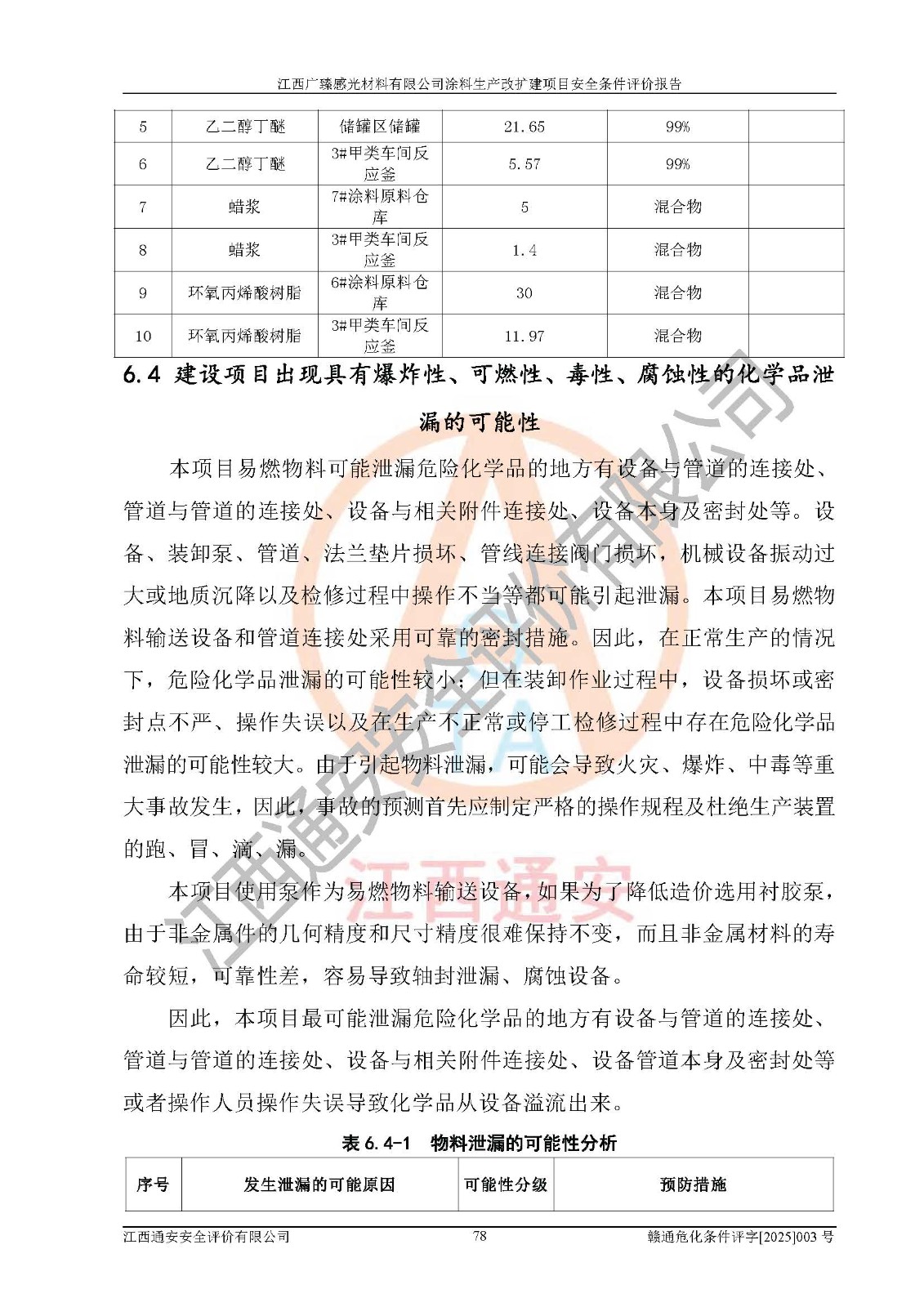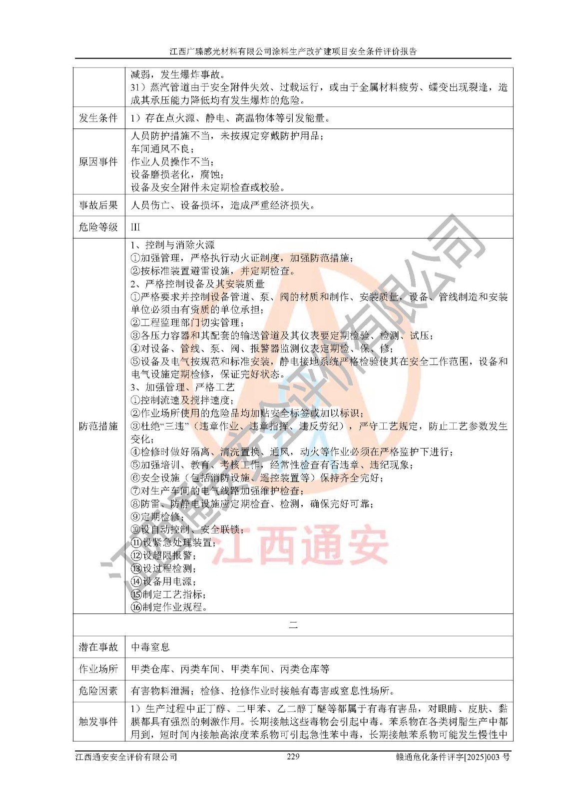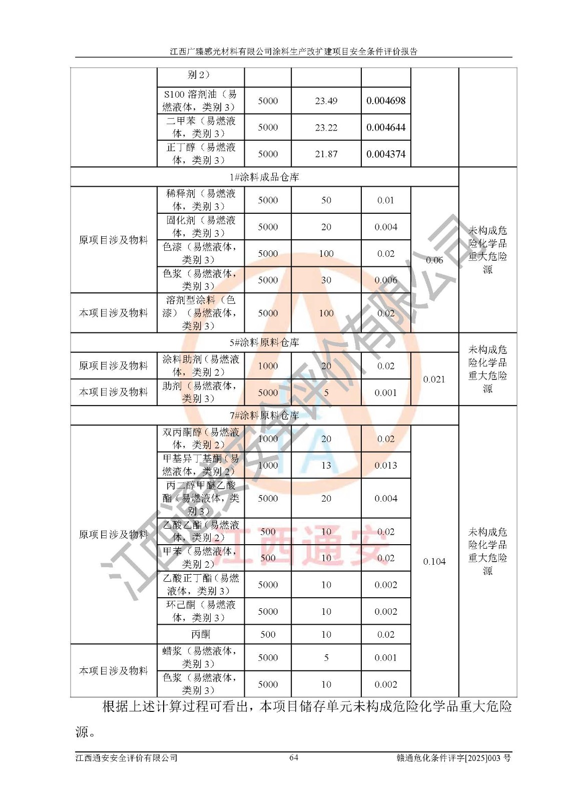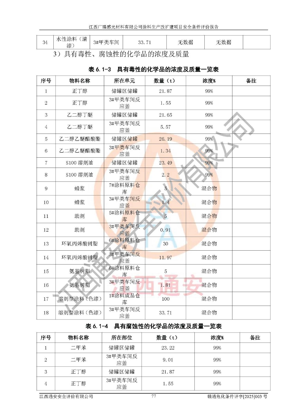 1)本項(xiàng)目取得了龍南市行政審批局下發(fā)的《江西省工業(yè)企業(yè)技術(shù)改造項(xiàng)目備案通知書》(項(xiàng)目統(tǒng)一代碼為:2408-360727-07-02-3253323)、《建設(shè)用地規(guī)劃許可證》、龍南市自然資源局出具對(duì)《關(guān)于為江西廣臻年產(chǎn)2萬噸涂料技改項(xiàng)目出具用地證明的函》的復(fù)函,符合地方產(chǎn)業(yè)發(fā)展規(guī)劃的要求。 2)根據(jù)《危險(xiǎn)化學(xué)品目錄》(2015年版,十部委公告2022年第8號(hào)修訂),本項(xiàng)目原輔料蠟漿、色漿、助劑、二甲苯、正丁醇、乙二醇丁醚、乙二醇乙醚醋酸酯、S100溶劑油、氮?dú)?/span>[壓縮的]及產(chǎn)品溶劑型涂料(色漆)屬于危險(xiǎn)化學(xué)品。本項(xiàng)目不涉及監(jiān)控化學(xué)品、劇毒化學(xué)品、易制爆化學(xué)品、易制毒化學(xué)品、重點(diǎn)監(jiān)管的危險(xiǎn)化學(xué)品、特別管控危險(xiǎn)化學(xué)品、高毒物品。本項(xiàng)目不涉及重點(diǎn)監(jiān)管的危險(xiǎn)化工工藝。 3)根據(jù)《危險(xiǎn)化學(xué)品重大危險(xiǎn)源辨識(shí)》(GB18218-2018),該項(xiàng)目未構(gòu)成危險(xiǎn)化學(xué)品重大危險(xiǎn)源。 4)項(xiàng)目存在的主要危險(xiǎn)因素有:火災(zāi)爆炸、容器爆炸、中毒窒息、灼燙、觸電、**傷害、機(jī)械傷害、高處墜落、物體打擊、淹溺等,存在的主要危害因素有:噪聲與振動(dòng)、高溫、有害化學(xué)物質(zhì)等;引起事故的原因有人的不安全行為、物的不安全狀態(tài)、管理缺陷和環(huán)境不良。其中*主要的危險(xiǎn)有害因素是火災(zāi)爆炸。 5)采用預(yù)先危險(xiǎn)性分析法評(píng)價(jià),結(jié)果為: (1)通過預(yù)先危險(xiǎn)(PHA)分析可知,項(xiàng)目廠址及總體布局單元存在周邊環(huán)境相互影響,發(fā)生異常情況,可對(duì)周邊企業(yè)生產(chǎn)經(jīng)營(yíng)活動(dòng)、人員活動(dòng)產(chǎn)生影響;存在自然條件影響,可因雷擊、暴雨等引起事故;存在**傷害、建筑物危害,其固有的危險(xiǎn)性等級(jí)為Ⅱ級(jí),屬于“臨界的”,應(yīng)予以排除、采取控制措施因素。 (2)生產(chǎn)作業(yè)存在的危險(xiǎn)因素包括火災(zāi)爆炸、觸電、灼燙、中毒窒息固有的危險(xiǎn)等級(jí)為Ⅲ級(jí),屬于“危險(xiǎn)的”,可能導(dǎo)致人員傷亡和系統(tǒng)損壞的因素,需要采取防范和對(duì)策措施的因素;其它危險(xiǎn)因素固有的危險(xiǎn)等級(jí)為Ⅱ級(jí),屬于“臨界的”,應(yīng)予以排除、采取控制措施因素。 (3)生產(chǎn)作業(yè)存在的噪聲、粉塵、高溫、有害化學(xué)物質(zhì)的危險(xiǎn)有害因素等級(jí)為Ⅱ級(jí),屬于“臨界的”,應(yīng)予以排除、采取控制措施因素。 6)危險(xiǎn)度評(píng)價(jià)分析,結(jié)果為: 生產(chǎn)裝置危險(xiǎn)度評(píng)價(jià)分析:3#甲類車間為中度危險(xiǎn)(Ⅱ級(jí))。 儲(chǔ)存單元危險(xiǎn)度評(píng)價(jià)分析:1#涂料成品倉庫為**危險(xiǎn)(Ⅰ級(jí))、5#涂料原料倉庫為**危險(xiǎn)(Ⅰ級(jí))、6#涂料原料倉庫為中度危險(xiǎn)(Ⅱ級(jí))、7#涂料原料倉庫為中度危險(xiǎn)(Ⅱ級(jí))、9#危廢倉庫為中度危險(xiǎn)(Ⅱ級(jí))、2#丙類原料倉庫為中度危險(xiǎn)(Ⅱ級(jí))、甲類罐區(qū)為**危險(xiǎn)(Ⅰ級(jí))。 7)作業(yè)條件危險(xiǎn)性評(píng)價(jià)結(jié)果:在選定的評(píng)價(jià)單元中,其危險(xiǎn)分值均在70以下,危險(xiǎn)程度基本屬于“可能危險(xiǎn)”、“稍有危險(xiǎn)”范圍,作業(yè)條件相對(duì)安全。企業(yè)經(jīng)營(yíng)過程中首先應(yīng)重點(diǎn)加強(qiáng)對(duì)甲類生產(chǎn)車間、甲類倉庫、儲(chǔ)罐區(qū)的危險(xiǎn)因素的嚴(yán)格控制,注重日常安全管理;其次要建立健全完善的安全生產(chǎn)責(zé)任制、安全管理制度、安全技術(shù)操作規(guī)程并**其貫徹落實(shí);第三要認(rèn)真抓好操作人員、管理人員的安全知識(shí)和操作技能的培訓(xùn),**人員具有與工程技術(shù)水平相適應(yīng)的技術(shù)素質(zhì)和安全素質(zhì),**安全作業(yè)。 8)項(xiàng)目建設(shè)場(chǎng)地符合當(dāng)?shù)匾?guī)劃要求,建設(shè)場(chǎng)地通過合理規(guī)劃,其選址、周邊環(huán)境、總平面布置、交通運(yùn)輸?shù)饶芊稀吨腥A人民共和國安全生產(chǎn)法》《危險(xiǎn)化學(xué)品安全管理?xiàng)l例》《建筑設(shè)計(jì)防火規(guī)范》《精細(xì)化工企業(yè)工程設(shè)計(jì)防火標(biāo)準(zhǔn)》等法規(guī)、標(biāo)準(zhǔn)、規(guī)范要求。 廠址地區(qū)地震活動(dòng)相對(duì)較弱,災(zāi)害性天氣出現(xiàn)頻率稍高,自然災(zāi)害對(duì)項(xiàng)目建設(shè)具有**影響,通過采取相應(yīng)的防護(hù)措施,自然條件適宜建設(shè)。 9)建設(shè)項(xiàng)目符合**產(chǎn)業(yè)政策的要求;選擇工藝為現(xiàn)行成熟工藝,其安全可靠性可得到**。 10)本報(bào)告已根據(jù)有關(guān)安全生產(chǎn)法律、法規(guī)、規(guī)章和**標(biāo)準(zhǔn)、行業(yè)標(biāo)準(zhǔn),并嚴(yán)格執(zhí)行省委辦公廳省**辦公廳《關(guān)于全面加強(qiáng)危險(xiǎn)化學(xué)品安全生產(chǎn)工作的實(shí)施意見》(贛辦發(fā)[2020]32號(hào))及鄱陽湖生態(tài)經(jīng)濟(jì)區(qū)、長(zhǎng)江經(jīng)濟(jì)帶、“五河一湖”相關(guān)政策規(guī)定,客觀