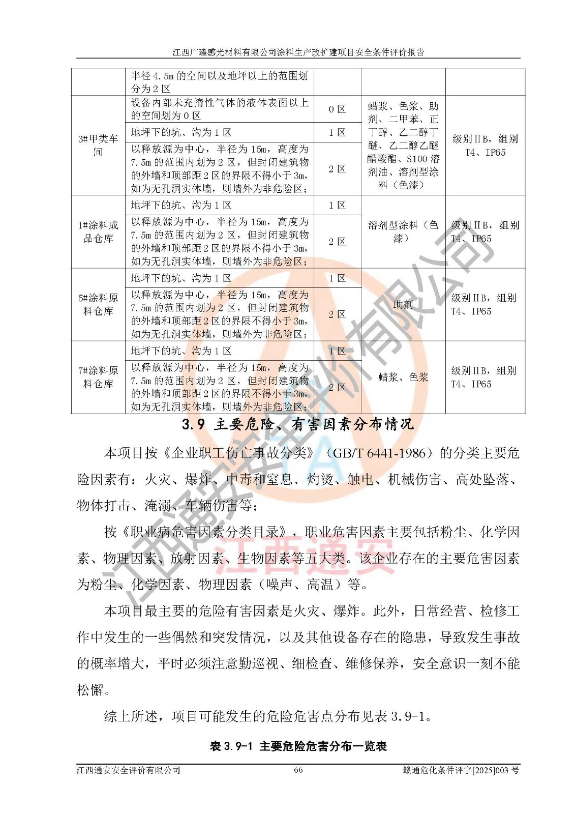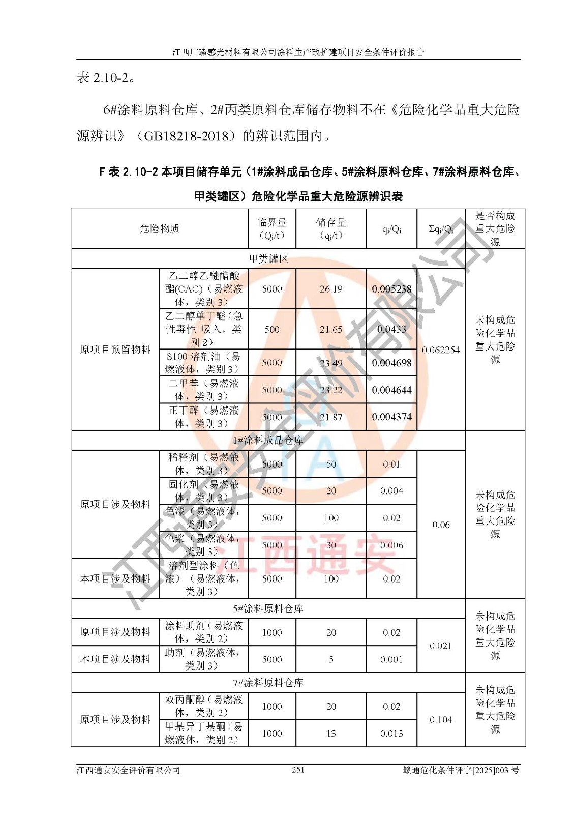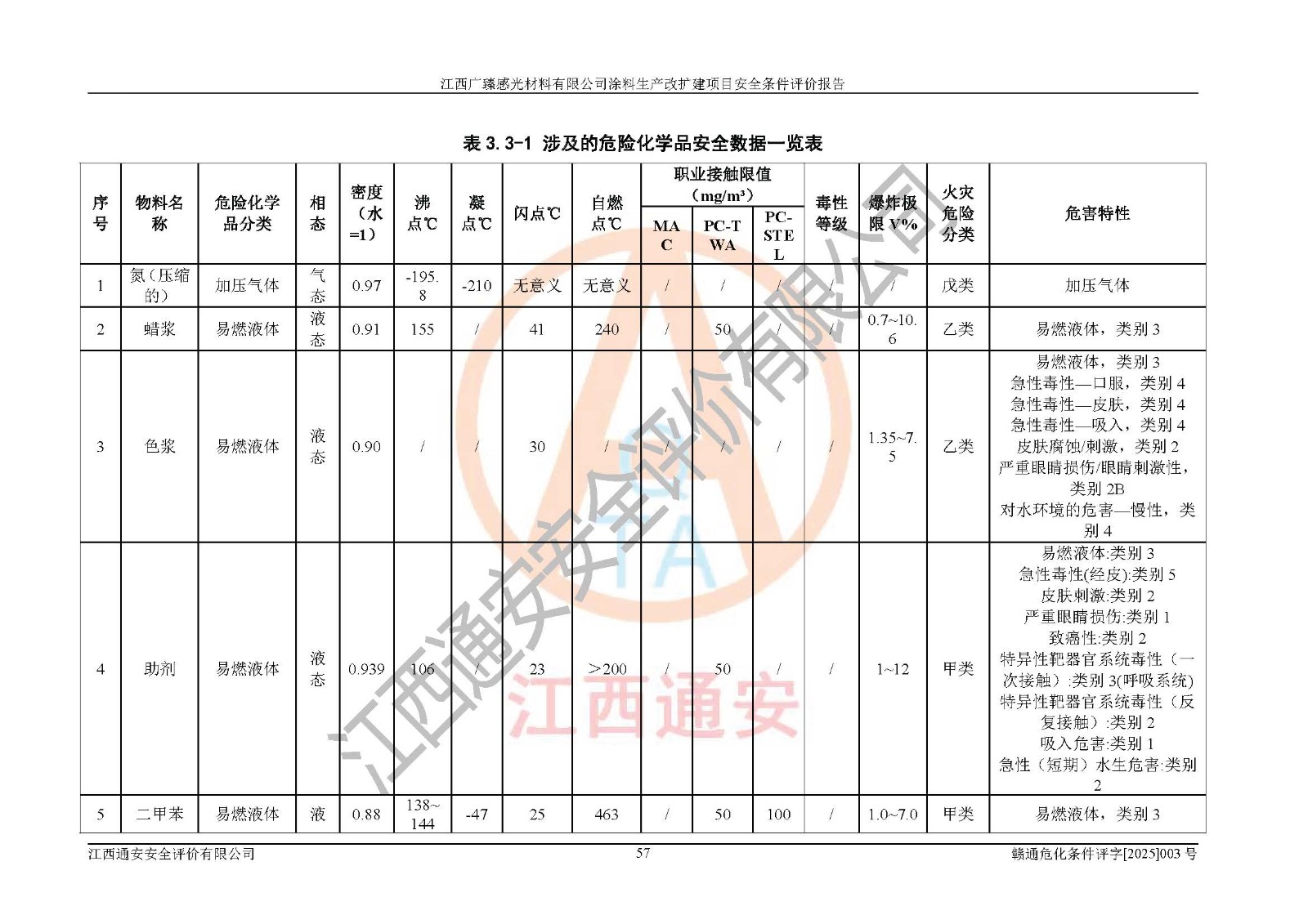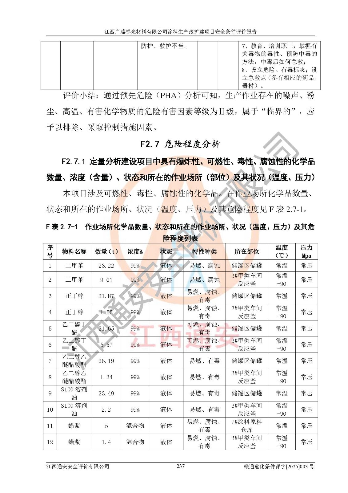 1)本項(xiàng)目取得了龍南市行政審批局下發(fā)的《江西省工業(yè)企業(yè)技術(shù)改造項(xiàng)目備案通知書》(項(xiàng)目統(tǒng)一代碼為:2408-360727-07-02-3253323)、《建設(shè)用地規(guī)劃許可證》、龍南市自然資源局出具對(duì)《關(guān)于為江西廣臻年產(chǎn)2萬噸涂料技改項(xiàng)目出具用地證明的函》的復(fù)函,符合地方產(chǎn)業(yè)發(fā)展規(guī)劃的要求。 2)根據(jù)《危險(xiǎn)化學(xué)品目錄》(2015年版,十部委公告2022年第8號(hào)修訂),本項(xiàng)目原輔料蠟漿、色漿、助劑、二甲苯、正丁醇、乙二醇丁醚、乙二醇乙醚醋酸酯、S100溶劑油、氮?dú)?/span>[壓縮的]及產(chǎn)品溶劑型涂料(色漆)屬于危險(xiǎn)化學(xué)品。本項(xiàng)目不涉及監(jiān)控化學(xué)品、劇毒化學(xué)品、易制爆化學(xué)品、易制毒化學(xué)品、重點(diǎn)監(jiān)管的危險(xiǎn)化學(xué)品、特別管控危險(xiǎn)化學(xué)品、高毒物品。本項(xiàng)目不涉及重點(diǎn)監(jiān)管的危險(xiǎn)化工工藝。 3)根據(jù)《危險(xiǎn)化學(xué)品重大危險(xiǎn)源辨識(shí)》(GB18218-2018),該項(xiàng)目未構(gòu)成危險(xiǎn)化學(xué)品重大危險(xiǎn)源。 4)項(xiàng)目存在的主要危險(xiǎn)因素有:火災(zāi)爆炸、容器爆炸、中毒窒息、灼燙、觸電、**傷害、機(jī)械傷害、高處墜落、物體打擊、淹溺等,存在的主要危害因素有:噪聲與振動(dòng)、高溫、有害化學(xué)物質(zhì)等;引起事故的原因有人的不安全行為、物的不安全狀態(tài)、管理缺陷和環(huán)境不良。其中*主要的危險(xiǎn)有害因素是火災(zāi)爆炸。 5)采用預(yù)先危險(xiǎn)性分析法評(píng)價(jià),結(jié)果為: (1)通過預(yù)先危險(xiǎn)(PHA)分析可知,項(xiàng)目廠址及總體布局單元存在周邊環(huán)境相互影響,發(fā)生異常情況,可對(duì)周邊企業(yè)生產(chǎn)經(jīng)營(yíng)活動(dòng)、人員活動(dòng)產(chǎn)生影響;存在自然條件影響,可因雷擊、暴雨等引起事故;存在**傷害、建筑物危害,其固有的危險(xiǎn)性等級(jí)為Ⅱ級(jí),屬于“臨界的”,應(yīng)予以排除、采取控制措施因素。 (2)生產(chǎn)作業(yè)存在的危險(xiǎn)因素包括火災(zāi)爆炸、觸電、灼燙、中毒窒息固有的危險(xiǎn)等級(jí)為Ⅲ級(jí),屬于“危險(xiǎn)的”,可能導(dǎo)致人員傷亡和系統(tǒng)損壞的因素,需要采取防范和對(duì)策措施的因素;其它危險(xiǎn)因素固有的危險(xiǎn)等級(jí)為Ⅱ級(jí),屬于“臨界的”,應(yīng)予以排除、采取控制措施因素。 (3)生產(chǎn)作業(yè)存在的噪聲、粉塵、高溫、有害化學(xué)物質(zhì)的危險(xiǎn)有害因素等級(jí)為Ⅱ級(jí),屬于“臨界的”,應(yīng)予以排除、采取控制措施因素。 6)危險(xiǎn)度評(píng)價(jià)分析,結(jié)果為: 生產(chǎn)裝置危險(xiǎn)度評(píng)價(jià)分析:3#甲類車間為中度危險(xiǎn)(Ⅱ級(jí))。 儲(chǔ)存單元危險(xiǎn)度評(píng)價(jià)分析:1#涂料成品倉庫為**危險(xiǎn)(Ⅰ級(jí))、5#涂料原料倉庫為**危險(xiǎn)(Ⅰ級(jí))、6#涂料原料倉庫為中度危險(xiǎn)(Ⅱ級(jí))、7#涂料原料倉庫為中度危險(xiǎn)(Ⅱ級(jí))、9#危廢倉庫為中度危險(xiǎn)(Ⅱ級(jí))、2#丙類原料倉庫為中度危險(xiǎn)(Ⅱ級(jí))、甲類罐區(qū)為**危險(xiǎn)(Ⅰ級(jí))。 7)作業(yè)條件危險(xiǎn)性評(píng)價(jià)結(jié)果:在選定的評(píng)價(jià)單元中,其危險(xiǎn)分值均在70以下,危險(xiǎn)程度基本屬于“可能危險(xiǎn)”、“稍有危險(xiǎn)”范圍,作業(yè)條件相對(duì)安全。企業(yè)經(jīng)營(yíng)過程中首先應(yīng)重點(diǎn)加強(qiáng)對(duì)甲類生產(chǎn)車間、甲類倉庫、儲(chǔ)罐區(qū)的危險(xiǎn)因素的嚴(yán)格控制,注重日常安全管理;其次要建立健全完善的安全生產(chǎn)責(zé)任制、安全管理制度、安全技術(shù)操作規(guī)程并**其貫徹落實(shí);第三要認(rèn)真抓好操作人員、管理人員的安全知識(shí)和操作技能的培訓(xùn),**人員具有與工程技術(shù)水平相適應(yīng)的技術(shù)素質(zhì)和安全素質(zhì),**安全作業(yè)。 8)項(xiàng)目建設(shè)場(chǎng)地符合當(dāng)?shù)匾?guī)劃要求,建設(shè)場(chǎng)地通過合理規(guī)劃,其選址、周邊環(huán)境、總平面布置、交通運(yùn)輸?shù)饶芊稀吨腥A人民共和國安全生產(chǎn)法》《危險(xiǎn)化學(xué)品安全管理?xiàng)l例》《建筑設(shè)計(jì)防火規(guī)范》《精細(xì)化工企業(yè)工程設(shè)計(jì)防火標(biāo)準(zhǔn)》等法規(guī)、標(biāo)準(zhǔn)、規(guī)范要求。 廠址地區(qū)地震活動(dòng)相對(duì)較弱,災(zāi)害性天氣出現(xiàn)頻率稍高,自然災(zāi)害對(duì)項(xiàng)目建設(shè)具有**影響,通過采取相應(yīng)的防護(hù)措施,自然條件適宜建設(shè)。 9)建設(shè)項(xiàng)目符合**產(chǎn)業(yè)政策的要求;選擇工藝為現(xiàn)行成熟工藝,其安全可靠性可得到**。 10)本報(bào)告已根據(jù)有關(guān)安全生產(chǎn)法律、法規(guī)、規(guī)章和**標(biāo)準(zhǔn)、行業(yè)標(biāo)準(zhǔn),并嚴(yán)格執(zhí)行省委辦公廳省**辦公廳《關(guān)于全面加強(qiáng)危險(xiǎn)化學(xué)品安全生產(chǎn)工作的實(shí)施意見》(贛辦發(fā)[2020]32號(hào))及鄱陽湖生態(tài)經(jīng)濟(jì)區(qū)、長(zhǎng)江經(jīng)濟(jì)帶、“五河一湖”相關(guān)政策規(guī)定,客觀