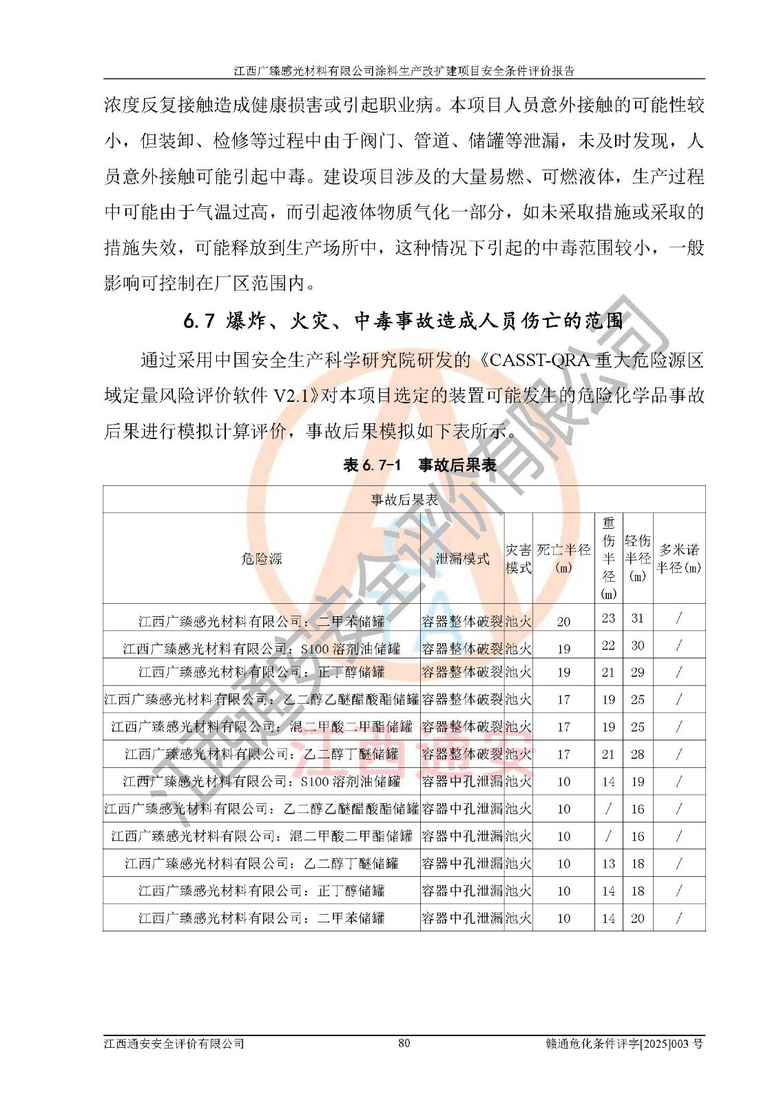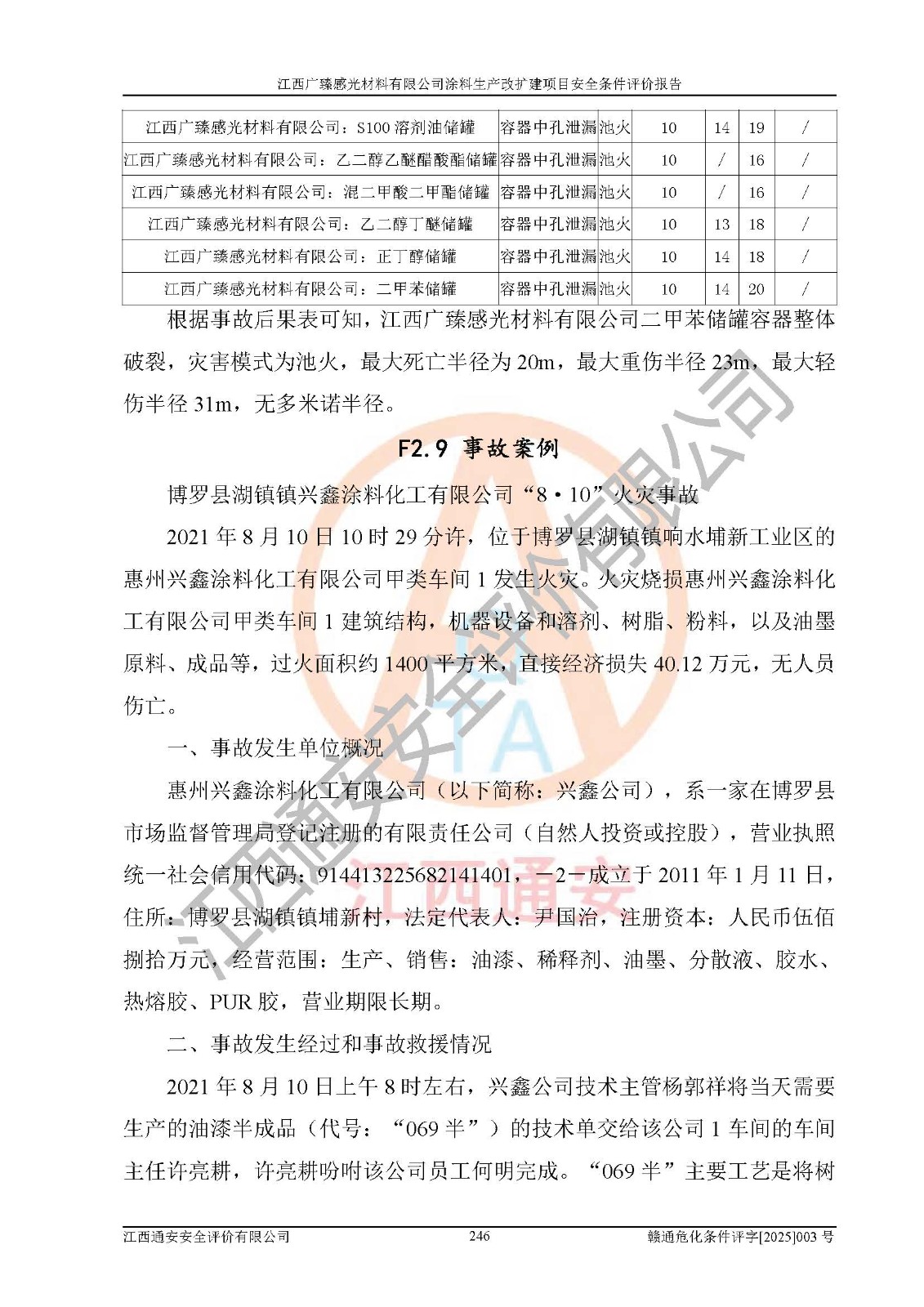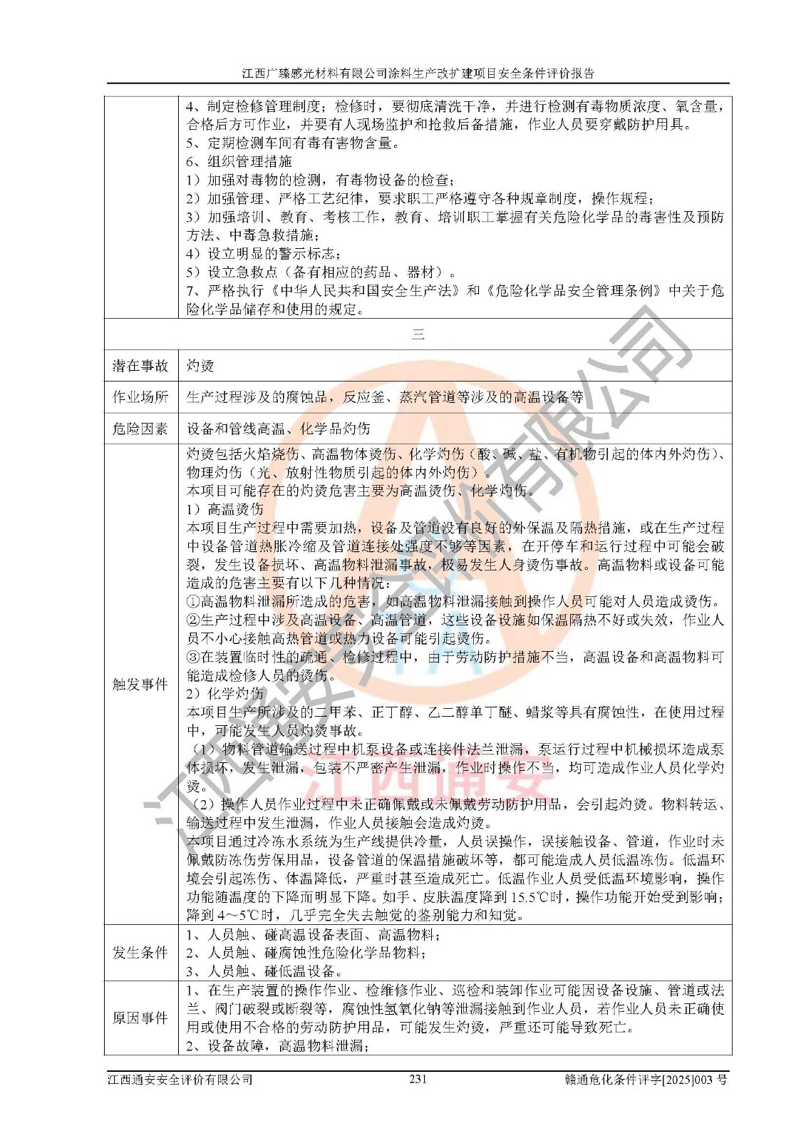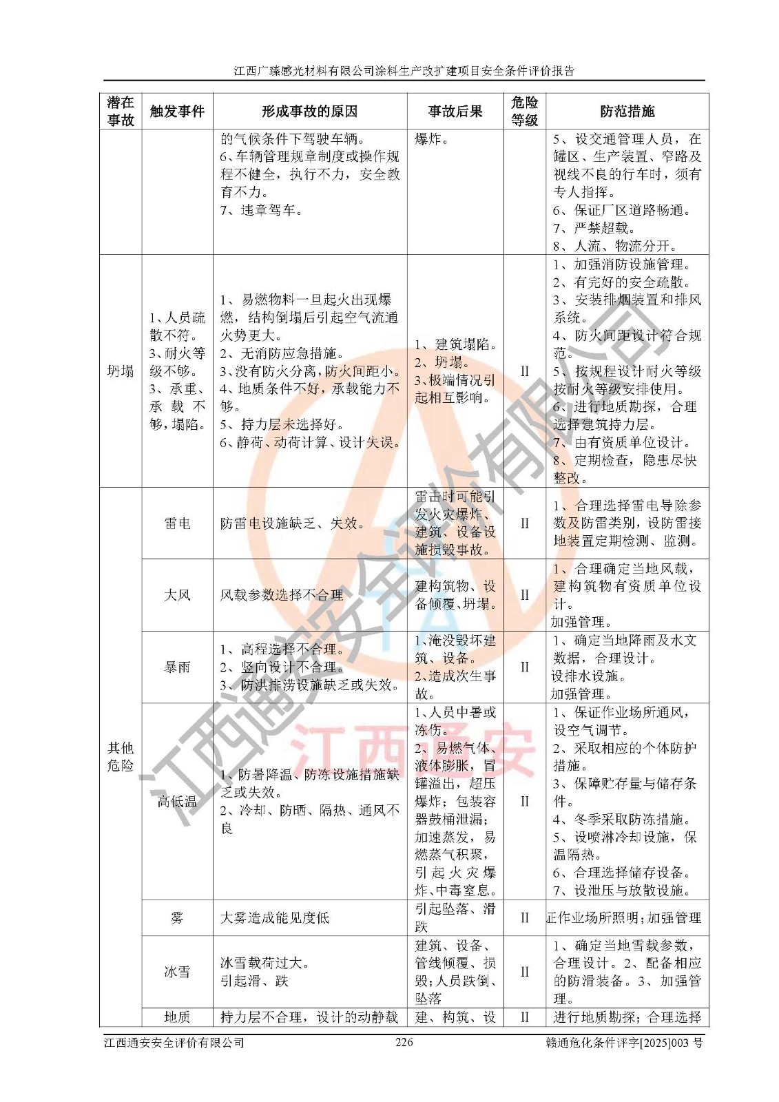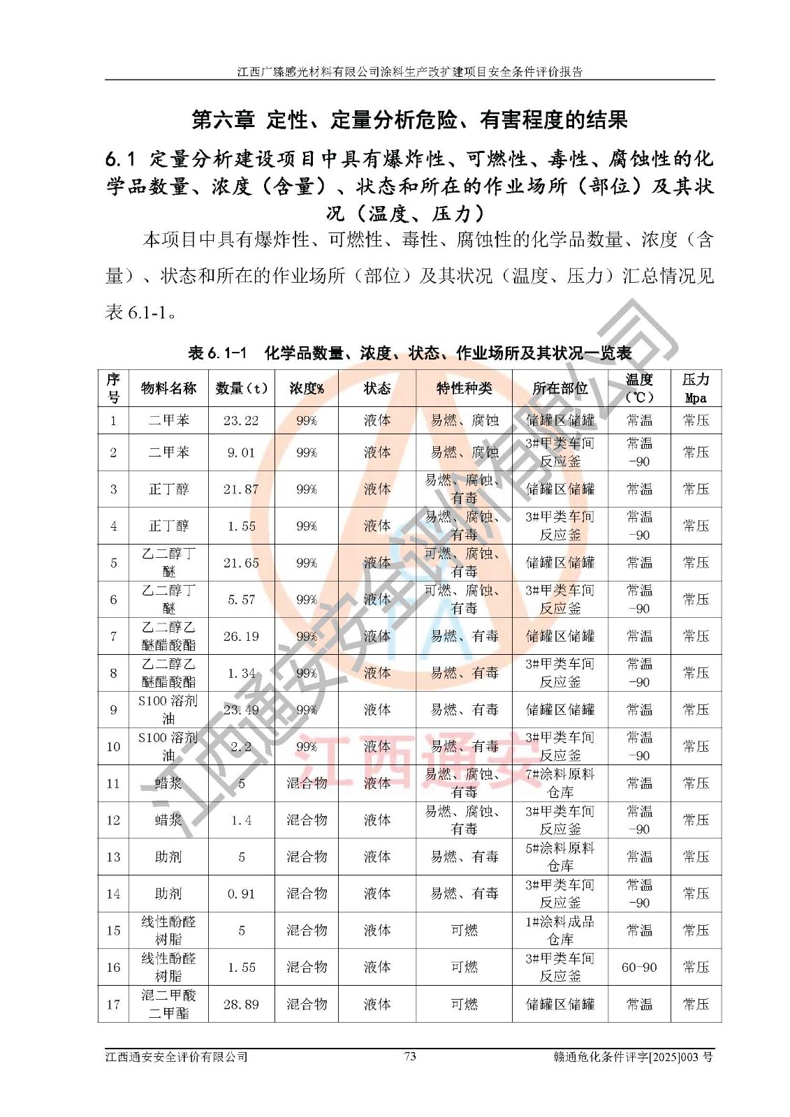 1)本項(xiàng)目取得了龍南市行政審批局下發(fā)的《江西省工業(yè)企業(yè)技術(shù)改造項(xiàng)目備案通知書》(項(xiàng)目統(tǒng)一代碼為:2408-360727-07-02-3253323)、《建設(shè)用地規(guī)劃許可證》、龍南市自然資源局出具對(duì)《關(guān)于為江西廣臻年產(chǎn)2萬噸涂料技改項(xiàng)目出具用地證明的函》的復(fù)函,符合地方產(chǎn)業(yè)發(fā)展規(guī)劃的要求。 2)根據(jù)《危險(xiǎn)化學(xué)品目錄》(2015年版,十部委公告2022年第8號(hào)修訂),本項(xiàng)目原輔料蠟漿、色漿、助劑、二甲苯、正丁醇、乙二醇丁醚、乙二醇乙醚醋酸酯、S100溶劑油、氮?dú)?/span>[壓縮的]及產(chǎn)品溶劑型涂料(色漆)屬于危險(xiǎn)化學(xué)品。本項(xiàng)目不涉及監(jiān)控化學(xué)品、劇毒化學(xué)品、易制爆化學(xué)品、易制毒化學(xué)品、重點(diǎn)監(jiān)管的危險(xiǎn)化學(xué)品、特別管控危險(xiǎn)化學(xué)品、高毒物品。本項(xiàng)目不涉及重點(diǎn)監(jiān)管的危險(xiǎn)化工工藝。 3)根據(jù)《危險(xiǎn)化學(xué)品重大危險(xiǎn)源辨識(shí)》(GB18218-2018),該項(xiàng)目未構(gòu)成危險(xiǎn)化學(xué)品重大危險(xiǎn)源。 4)項(xiàng)目存在的主要危險(xiǎn)因素有:火災(zāi)爆炸、容器爆炸、中毒窒息、灼燙、觸電、**傷害、機(jī)械傷害、高處墜落、物體打擊、淹溺等,存在的主要危害因素有:噪聲與振動(dòng)、高溫、有害化學(xué)物質(zhì)等;引起事故的原因有人的不安全行為、物的不安全狀態(tài)、管理缺陷和環(huán)境不良。其中*主要的危險(xiǎn)有害因素是火災(zāi)爆炸。 5)采用預(yù)先危險(xiǎn)性分析法評(píng)價(jià),結(jié)果為: (1)通過預(yù)先危險(xiǎn)(PHA)分析可知,項(xiàng)目廠址及總體布局單元存在周邊環(huán)境相互影響,發(fā)生異常情況,可對(duì)周邊企業(yè)生產(chǎn)經(jīng)營(yíng)活動(dòng)、人員活動(dòng)產(chǎn)生影響;存在自然條件影響,可因雷擊、暴雨等引起事故;存在**傷害、建筑物危害,其固有的危險(xiǎn)性等級(jí)為Ⅱ級(jí),屬于“臨界的”,應(yīng)予以排除、采取控制措施因素。 (2)生產(chǎn)作業(yè)存在的危險(xiǎn)因素包括火災(zāi)爆炸、觸電、灼燙、中毒窒息固有的危險(xiǎn)等級(jí)為Ⅲ級(jí),屬于“危險(xiǎn)的”,可能導(dǎo)致人員傷亡和系統(tǒng)損壞的因素,需要采取防范和對(duì)策措施的因素;其它危險(xiǎn)因素固有的危險(xiǎn)等級(jí)為Ⅱ級(jí),屬于“臨界的”,應(yīng)予以排除、采取控制措施因素。 (3)生產(chǎn)作業(yè)存在的噪聲、粉塵、高溫、有害化學(xué)物質(zhì)的危險(xiǎn)有害因素等級(jí)為Ⅱ級(jí),屬于“臨界的”,應(yīng)予以排除、采取控制措施因素。 6)危險(xiǎn)度評(píng)價(jià)分析,結(jié)果為: 生產(chǎn)裝置危險(xiǎn)度評(píng)價(jià)分析:3#甲類車間為中度危險(xiǎn)(Ⅱ級(jí))。 儲(chǔ)存單元危險(xiǎn)度評(píng)價(jià)分析:1#涂料成品倉庫為**危險(xiǎn)(Ⅰ級(jí))、5#涂料原料倉庫為**危險(xiǎn)(Ⅰ級(jí))、6#涂料原料倉庫為中度危險(xiǎn)(Ⅱ級(jí))、7#涂料原料倉庫為中度危險(xiǎn)(Ⅱ級(jí))、9#危廢倉庫為中度危險(xiǎn)(Ⅱ級(jí))、2#丙類原料倉庫為中度危險(xiǎn)(Ⅱ級(jí))、甲類罐區(qū)為**危險(xiǎn)(Ⅰ級(jí))。 7)作業(yè)條件危險(xiǎn)性評(píng)價(jià)結(jié)果:在選定的評(píng)價(jià)單元中,其危險(xiǎn)分值均在70以下,危險(xiǎn)程度基本屬于“可能危險(xiǎn)”、“稍有危險(xiǎn)”范圍,作業(yè)條件相對(duì)安全。企業(yè)經(jīng)營(yíng)過程中首先應(yīng)重點(diǎn)加強(qiáng)對(duì)甲類生產(chǎn)車間、甲類倉庫、儲(chǔ)罐區(qū)的危險(xiǎn)因素的嚴(yán)格控制,注重日常安全管理;其次要建立健全完善的安全生產(chǎn)責(zé)任制、安全管理制度、安全技術(shù)操作規(guī)程并**其貫徹落實(shí);第三要認(rèn)真抓好操作人員、管理人員的安全知識(shí)和操作技能的培訓(xùn),**人員具有與工程技術(shù)水平相適應(yīng)的技術(shù)素質(zhì)和安全素質(zhì),**安全作業(yè)。 8)項(xiàng)目建設(shè)場(chǎng)地符合當(dāng)?shù)匾?guī)劃要求,建設(shè)場(chǎng)地通過合理規(guī)劃,其選址、周邊環(huán)境、總平面布置、交通運(yùn)輸?shù)饶芊稀吨腥A人民共和國安全生產(chǎn)法》《危險(xiǎn)化學(xué)品安全管理?xiàng)l例》《建筑設(shè)計(jì)防火規(guī)范》《精細(xì)化工企業(yè)工程設(shè)計(jì)防火標(biāo)準(zhǔn)》等法規(guī)、標(biāo)準(zhǔn)、規(guī)范要求。 廠址地區(qū)地震活動(dòng)相對(duì)較弱,災(zāi)害性天氣出現(xiàn)頻率稍高,自然災(zāi)害對(duì)項(xiàng)目建設(shè)具有**影響,通過采取相應(yīng)的防護(hù)措施,自然條件適宜建設(shè)。 9)建設(shè)項(xiàng)目符合**產(chǎn)業(yè)政策的要求;選擇工藝為現(xiàn)行成熟工藝,其安全可靠性可得到**。 10)本報(bào)告已根據(jù)有關(guān)安全生產(chǎn)法律、法規(guī)、規(guī)章和**標(biāo)準(zhǔn)、行業(yè)標(biāo)準(zhǔn),并嚴(yán)格執(zhí)行省委辦公廳省**辦公廳《關(guān)于全面加強(qiáng)危險(xiǎn)化學(xué)品安全生產(chǎn)工作的實(shí)施意見》(贛辦發(fā)[2020]32號(hào))及鄱陽湖生態(tài)經(jīng)濟(jì)區(qū)、長(zhǎng)江經(jīng)濟(jì)帶、“五河一湖”相關(guān)政策規(guī)定,客觀